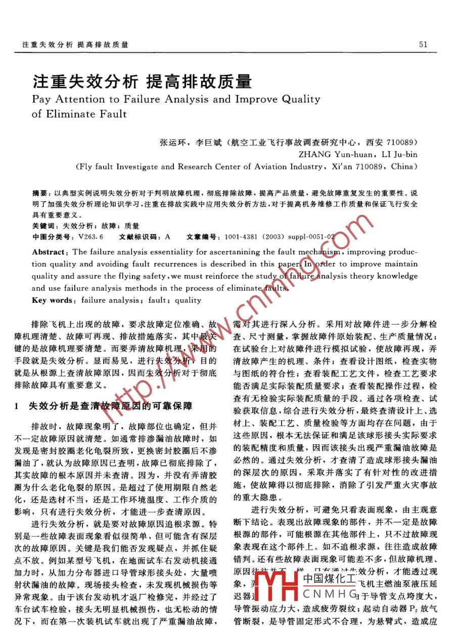 注重失效分析提高排故質(zhì)量51注重失效分析提高排故質(zhì)量Pay Attention to Failure Analysis and Improve Qualityof eliminate fault張運(yùn)環(huán),李巨斌(航空工業(yè)飛行事故調(diào)查研究中心,西安710089)ZHANG Yun-huan, Li Ju-bin(Fly fault Investigate and Research Center of Aviation Industry, Xi'an 710089, China)摘要:以典型實(shí)例說明失效分析對于判明故障機(jī)理,徹底排除故障,提高產(chǎn)品質(zhì)量,避免故障重復(fù)發(fā)生的重要性。說明了加強(qiáng)失效分析理論知識學(xué)習(xí),注重在排故實(shí)踐中應(yīng)用失效分析方法,對于提高機(jī)務(wù)維修工作質(zhì)量和保證飛行安全具有重要意義關(guān)鍵詞:失效分析;故障;質(zhì)量中圖分類號:V263.6文獻(xiàn)標(biāo)識碼:A文章編號:1001-4381(2003) suppl-0051-02Abstract: The failure analysis essentiality for ascertaining the fault mechanism, improving production quality and avoiding fault recurrences is described in this paper. In order to improve maintainquality and assure the flying safety, we must reinforce the study of failure analysis theory knowledgeand use failure analysis methods in the process of eliminate faultsKey words: failure analysis; fault; quality排除飛機(jī)上出現(xiàn)的故障,要求故障定位準(zhǔn)確、故需對其進(jìn)行深入分析。采用對故障件進(jìn)一步分解檢障機(jī)理清楚、故障可再現(xiàn)、排故措施落實(shí),其中最關(guān)査、尺寸測量,掌握故障件原始裝配、生產(chǎn)質(zhì)量情況;鍵的是故障機(jī)理要清楚。而要弄清故障機(jī)理,采用的在試驗臺上對故障件進(jìn)行模擬試驗,使故障再現(xiàn),弄手段就是失效分析。顯而易見,進(jìn)行失效分析,目的清故障產(chǎn)生的機(jī)理、條件;查看設(shè)計圖紙,檢查實(shí)物就是從根源上查清故障原因,因而失效分析對于徹底與圖紙的符合性;查看裝配工藝文件,檢查工藝要求排除故障具有重要意義。能否滿足實(shí)際裝配質(zhì)量要求;查看裝配操作過程,檢查有無檢驗實(shí)際裝配質(zhì)量的手段。通過各項檢查、試失效分析是查清故障原因的可靠保障驗獲取信息,綜合進(jìn)行失效分析,最終查清設(shè)計上、選排故時,故障現(xiàn)象明了,故障部位也確定,但并材上、裝配工藝、質(zhì)量檢驗等方面均存在問題,由于定故障原因就清楚。如通常排滲漏油故障時,如這些原因,根本無法保證和滿足該球形接頭實(shí)際要求發(fā)現(xiàn)是密封膠圈老化龜裂所致,更換密封膠圈后不滲的裝配精度和質(zhì)量,因而該接頭出現(xiàn)嚴(yán)重漏油故障是漏油了,就認(rèn)為故障原因已查明,故障已徹底排除了必然的。通過失效分析,才查清了造成球形接頭漏油其實(shí)故障的根本原因并未查清。因為,并沒有弄清膠的深層次的原因,采取并落實(shí)了有針對性的改進(jìn)措圈為什么老化龜裂的原因。是超過了使用期限自然老施,使故障得以徹底排除,消除了引發(fā)嚴(yán)重火災(zāi)事故化,還是選材不當(dāng),還是工作環(huán)境溫度、工作介質(zhì)的的重大隱患。影響,只有進(jìn)行失效分析,才能進(jìn)一步查清原因。進(jìn)行失效分析,可避免只看表面現(xiàn)象,由主觀意進(jìn)行失效分析,就是要對故障原因追根求源。特斷下結(jié)論。表現(xiàn)出故障現(xiàn)象的部件,并不一定是故障別是一些故障表面現(xiàn)象看似很簡單,但可能含有深層根源的部件,可能根源在其他部件上,只不過故障現(xiàn)次的故障原因。關(guān)鍵是我們能否發(fā)現(xiàn)疑點(diǎn),并抓住疑象表現(xiàn)在這個部件上。如不追根求源,往往造成故障點(diǎn)不放。例如某型號飛機(jī),在地面試車右發(fā)動機(jī)接通錯判。還有些故障表面現(xiàn)象可能差不多,但故障機(jī)理加力時,從加力分布器進(jìn)口導(dǎo)管球形接頭處,大量噴原因}效分析,才能透過現(xiàn)射狀漏油的故障?,F(xiàn)場接頭檢查,未發(fā)現(xiàn)機(jī)械損傷等象,中國煤化工飛機(jī)主燃油泵液壓延異常現(xiàn)象。由于該臺發(fā)動機(jī)才返廠檢修完,并經(jīng)過了遲器CNMHG日于導(dǎo)管支點(diǎn)垮度大,車臺試車檢驗,接頭無明顯機(jī)械損傷,也無松動的情導(dǎo)管振動應(yīng)力大,造成疲勞裂紋;起動自動器P2放氣況下,而在第一次裝機(jī)試車就出現(xiàn)了嚴(yán)重漏油故障,管斷裂,是導(dǎo)管固定形式不合理,為懸臂式,造成應(yīng)材料工程/2003年增刊力集中,疲勞斷裂;加力燃滑油散熱器進(jìn)口管嘴焊縫通常更換故障件的排故方法,只是暫時使飛機(jī)處處裂紋,是由于設(shè)計缺陷,管路系統(tǒng)沒有熱補(bǔ)償能力,于了良好狀態(tài),但并不一定就消除了產(chǎn)生故障的根使熱應(yīng)力與振動應(yīng)力疊加,接近焊縫處疲勞極限,造源,因此,同類故障可能重復(fù)多次發(fā)生;或因故障原成低周疲勞裂紋。某型號飛機(jī)加力泵出口導(dǎo)管焊縫處因未找準(zhǔn),排故措施不落實(shí)也可使故障反復(fù)出現(xiàn),稱裂紋,是焊縫處有明顯焊接缺陷,為不合格品,由于為多發(fā)性故障。多發(fā)性故障雖然并不一定直接危及飛漏檢裝機(jī)造成的。某型號飛機(jī)減速板電磁活門回油管行安全,但卻嚴(yán)重影響飛機(jī)的良好率和出勤率。對于在接頭處斷裂,是由于設(shè)計結(jié)構(gòu)缺陷和機(jī)務(wù)維修導(dǎo)管危及飛行安全的故障,不允許重復(fù)發(fā)生,一經(jīng)出現