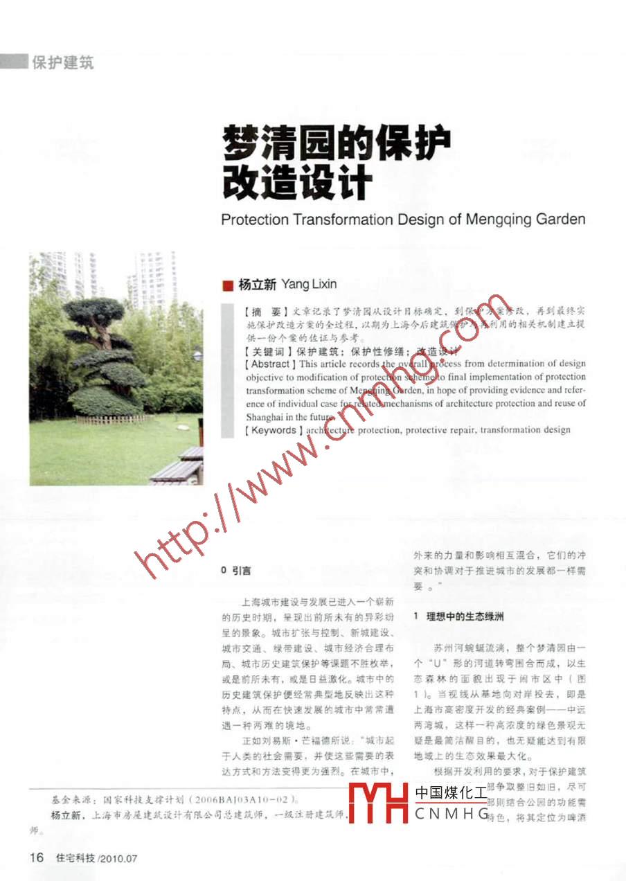 ■保護建筑夢清回的保護改造設計Protection Transformation Design of Mengqing Garden■楊立新 Yang Lixin【摘要】文章記錄了夢清園從設計目標確定,到保護方案修改,再到轂終實施保護改造方案的全過程,以期為上海今后建筑保護與再利用的相關機制建立提供一份個案的佐證與參考【關鍵詞】保護建筑;保護性修繕;改造設計Abstract This article records the overall process from determination of desigrobjective to modification of protection scheme to final implementation of protectiontransformation scheme of Mengqing Garden, in hope of providing evidence and reference of individual case for related mechanisms of architecture protection and reuse ofShanghai in the future.Keywords architecture protection, protective repair, transformation design外來的力量和影響相互混合,它們的沖0引言突和協調對于推進城市的發(fā)展都一樣需上海坡市建設與發(fā)展已進入一個嶄新的歷史時期,呈現出前所未有的異彩紛1理想中的生態(tài)綠洲呈的景象。城市擴張與控制、新城建設城市交通、綠帶建設、城市經濟合理布蘇州河蜿流,整個夢清園由局、城市歷史建筑保護等課題不勝枚舉,個“U”形的河道轉彎圍合而成,以生或是前所未有,或是日益激化。坡市中的態(tài)森林的面貌出現于闊市區(qū)中(圖歷史建筑保護便經常典型地反映出這種1)。當視線從基地向對岸投去,即是持點,從而在快速發(fā)展的坡市中常常通上海市高密度開發(fā)的經典案例一一中遠遇一種兩難的境地。兩海城,這樣一種高濃度的綠色景觀無正如劉易斯·芒福德所說:“城市起疑是最簡潔醒目的,也無疑能達到有限于人類的社會需要,并使這些需要的表地域上的生態(tài)效果最大化。達方式和方法變得更為強烈。在城市中,根據開發(fā)利用的要求,對于保護建筑基金來源:國家科技支撐計劃(2006BA103A10-02)。楊立新,上海市房屋建筑設計有限公司總建筑師,一級注冊建筑師「TYH中國煤化工部爭取整舊如舊,盡可則結合公園的功能需CNMHG色,將其定位為酒16住宅科技/2010.07保護建筑護及改造設計由上海房建筑設計院完成。設計前期已對兩哦建筑進行完整測繪,以保留第一手現狀資料,對兩幢建筑的主體結構進行調查評估。設計目標是對原啤酒廠釀造車間與灌裝車間進行保護性修和重新利用,我圖1夢清園全景鳥瞰們與總體規(guī)劃單位達成了一致的看法,即充分發(fā)揮原來的特點,做與啤酒有關廣場來對待,這無疑是既兼顧了公園消進行了局部改造設計。廠區(qū)內的辦公的設施,發(fā)揮新的效益,形成一種積極費需要,同時又是對這里歷史建筑持色樓、灌裝車間和酸造車間被列入了第三利用,而非消極的保護。的一種有趣的猶如故事性的延續(xù)。批上海市優(yōu)秀近代保護建筑名單,其總體設計思路是在保護原建筑的基礎中,灌裝樓和釀造樓為三類保護建筑上對建筑內部進行功能改造,主要作為2工程概況圖2~5)。娛樂、休閑、展示、辦公等功能使用。進一步配各種輔助功能空間,相應補上海啤酒公司是上世紀30年代遠東3總體設計目標與思路充所需的建筑設備。對殘留立面力求恢最大的啤酒制造商,生產著名的“友復原貌,對新顯露的立面進行設計。啤”(UBl廠區(qū)位于蘇州河西段,占夢清園的總體設計由上海市回林設計地8.6hm2:東眺江寧路、西依昌化路院主持,同濟大學負責對原上海酒廠改造方案確定橋,北靠宣昌路,隔岸相望則是高樓林建筑灌裝樓和釀造樓做保護性規(guī)劃,保立的中遠兩灣城。該建筑群由匈牙利著按照原有規(guī)劃,上海啤酒公司的建名建筑師鄔達克所開設的鄔達克事務所筑將被全部拆除,用于夢清園綠化建于1933年設計,1934年落成:1958設。當拆除工作正在展開時,上海市規(guī)年,華東工業(yè)建筑設計院結合生產需要劃局及時地知悉了這一情況,規(guī)劃局領導親自趕赴現場了解情況。北時釀造樓頂部已被拆除。拆除工作被及時中止。隨后,由上海市規(guī)劃局頭,組織了上海市有關方面的專家學者,工程各方為此事專門召開了研討會當時建筑群只剩下辦公樓、灌裝車圖4原酸酒室內部間和酸造車間,其余建筑已被拆除;釀造樓主體(當時遠東最高的工業(yè)建筑上部已拆除,主體結構開裂,可危:灌裝樓和釀造樓的全部鋼制門窗已被拆除變賣(圖6)。專家組提出采取圖2蘇州河一側廠房原有風貌了一條相對折衷的方法,重新修改方中國煤化工CNMHG圖3裝瓶間外景資料圖5酸酒室爐子間外票6拆除工地現場2010.07/住宅科技17保護建筑案:對啤酒公司的酸造樓局部與灌裝樓為后期根據生產要求加上的。于是根據常豐富。根據現場結構體系和結構的損進行保護性修緒和重新利用。其中,對原始照片,我們終于按原樣恢復了裝飾害程度,經仔細計算,灌裝樓完全保留灌裝樓整體保留,對其內外部進行修風格派的塔樓廠房原有結構,只在原交通部分增加電塘、改造,用作夢清館一一蘇州河展示52主體結構改造加固梯和樓梯。中心;拆除酸造樓的大部分體量,保留對兩幢建筑的主體結構進行調查評酸造樓原9層主體已拆除,只留下蘇州河一側的典型片段,辟為以啤酒為估,根據情況制定加固措施:并根據改變沿蘇州河的前幾道工藝的3層樓廠房主題的酒吧與景觀廣場后的建筑功能要求,在結構上進行一定最東例進料和鍋爐車間的大型料斗及巨4.1改造設計原則配合改造。兩幢建筑結構都是根據啤酒大的石砌加熱爐保存比較完整,