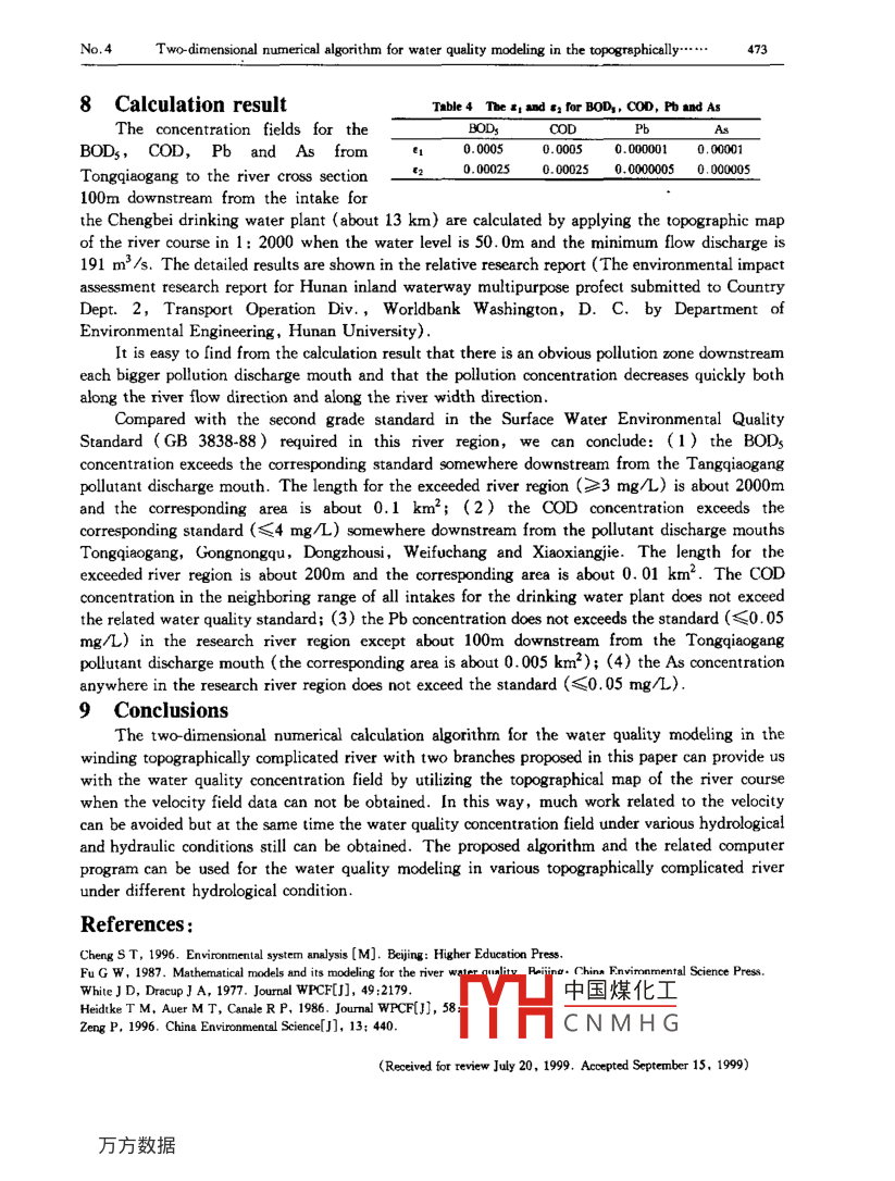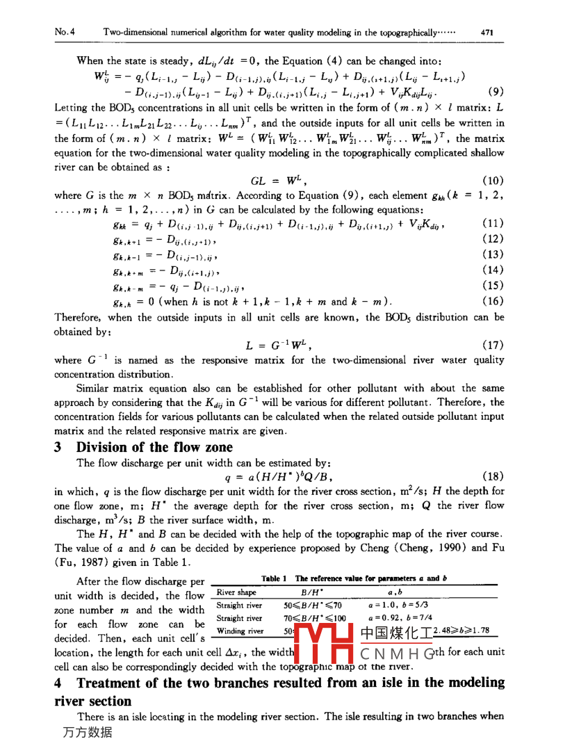 Joumnal of Environmental Sciences Vol. 12 , No.4,pp 469- -473,2000CN1-2629/XArticle ID: 1001-0742(2000)04-0469-05 CLC number; X131 Docment code; ATwo-dimensionalnumericalalgorithmforwater qualitymodeling in the topographically complicated riverZENG Guang ming' , JIANG Yi-min' , GUO Huai-cheng2 , Gordon Guo He Huang31. Environmental Protection Institute, Hunan University, Hunan 410082, China; 2. Environmental Science Center, PekingUniersity. Bejing 100871, China; 3. Environmental Systems Engineering. Universty of Regina, Sask S4S 0A2, Canada)Abstract:In this paper, a two-dimensional numerical calculation algorithm for the water quality rmodeling in the Hengyang Gity sectionof the Xiangjiang River is researched considering the efete of the Deyuandu navigational key project. The research river is windingof applying topographic map of the river course and the finite elenent method. The calculation result for the water quality modelingincludes the concentrtion felds for various pollutants. The numerical calculation algorithm for the water quality modeling stl up inthis paper can be applied to shallww river with similar topographically complicated river c∞urse.Key words: two dimensional river; water quality; numerical calculation algorithm1 IntroductionAccording to the Hunan component of the proposed inland waterways multipurpose project ,the Dayuandu navigational key project, located 62 km downstream from the Hengyang City, willbe built with the help of the world bank loan. After the project being constructed, the XiangjiangRiver section within the Hengyang City will be changed into a reservoir resulted from the projectand the water quality will be surely influenced as the river hydrological condition upstream from theproject will be changed. To make it clear how much negative influence the project will have on thewater quality in the Xiangjiang River section within the Hengyang City, the research river section(about 13 km) from the Tongqiaogang upstream from the Hengyang City to the Chengbei drinkingwater plant downstream from the Hengyang City was selected with the consideration of thepollutants' discharge distribution and the water quality management of the Hengyang City. Thelocation of the research river section is shown in Fig.1.The research river section is topographically complicated as it is winding, relatively shallowwith two branches resulted from an isle and its cross section changes irregularly along the river. Forthese reasons, the traditional one- dimensional water quality model and the traditional two-dimensional water quality model fit for straight river with uniform rectangle cross section can not beused for this research, and the two dimensional numerical calculation algorithm based on the finiteelement method is proposed. To finish the water quality modeling, totally about 2921 unit cellshave been divided in the researched 13 km river section and a lot of application problems have beenmet and solved. These problems include how to build the modeling algorithm, how to decide thewidth and length of the modeled unit cell, how to estimate the hydraulic and hydrologicalparameters required in the model and so on. As the water quality modeling problem based on thefinite element method for the topographically complected river is always difficult and not well solved(Cheng,1996; Heidtke, 1986; White, 1977 ),the two-dimensional numerical calculationalgorithm proposed in this paper and some details中國煤化工deling are quitepossible to be used as a reference for future waterMHC N MH Grparaphiallcomplicated river.Foundation item; The National Natural Science Foundation of China (No. 49201015) and the Science Foundation of EducationMinistry of Chine for Outstanding Young Teachers470ZENG Guang-ming et al.Vor. 122Water qualityFlow zoneRiver crOSS soctionFlow linemodelThe modelbuildingYapproech for the two-Deyuandu projoctxdimensionalnumerial氣十Xiangiang Rivercalculation algorithm mainlyincludes two steps. The firstZengshui Riverstep is to divide the river flowFig.2 The rectangular curved coordinateinto m flow zones followingsystem for the river weter qualitythe flow direction as well asmodelingintoriversections入-' Rexcceractonon perpendicularto the flow direction and then a series of(sce Fi23)Leishui Rivermathematical models for all the unit cells to model the waterquality based on the mass conservation law are established.To make the research easier, the flow discharge in each flowHengyang Ciyzone has to be kept constant. In this way there will be onlypollutant exchange resulting from the dispersion and not any flowFig.1 The loeation of the research riverdischarge exchange existing between the neighboring filow zones.Correspondingly, the width for each flow zone must change alongsectionthe river as the shape of the river cross section changes along theriver (Fig.2).Take one unit cell (given ij unit cell), assuming pollutant ( given BOC5) concentration isuniform in each unit cell, the pure added amount for each unit cell resulted from the river waterflow is:q;(L-1.s- Lq),(1)the pure added amount for BOD3 in each unit cell resulted from the longitudinal dispersion is:Di-.,.6(L-.- Ly) - D.i1.(Lj - Li+1.;),(2)the pure added amount for BODs in each unit cell resulted from the river cross dispersion is:Di,j-l).6(L;,s-1L:)- D,(i,+1)(Lj- L,j+1).As the decreased BODs amount in each ij unit cell is V;KawLj and the input BODs amountfrom the outside of each ij unit cell is Wj, therefore, the following equation can be obtainedacording to the mass conservation principle:VydL。/di =q(L-1;- Lg)+ Di-,(L1,- Lg)- Di,i+1.,)(L,- ..1,) .+ Di.1-n,(,.,1- L;) - Di,r.,+t)(L, - .,.1)- V;KuJLe+ W略,(4)in whichD(i-1,i),j = D(i-1,j).6i ●A(i1,i),g/5i-.j)j,(5)Dj.<(i+1,j) = Dij(i+1.J) ●Ang,(i+1,ji)/xi,(i+1,i),(6)D'(i,j-1). = Di,j-1),. A-//1i.(7)Di(5i,j+1) = Dij(i,+1中國煤化工(8)q,is the flow in the j flow zone, m'/s; L:CNMHGU unit ell, mg/;V; the volume for the ij unit cell, m3 ; Kai the'DuLs deoxyge