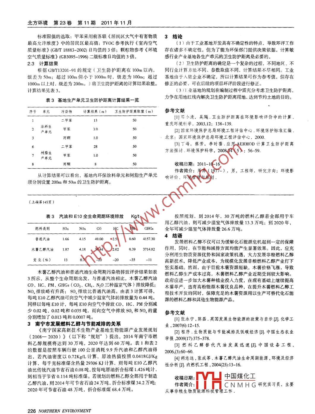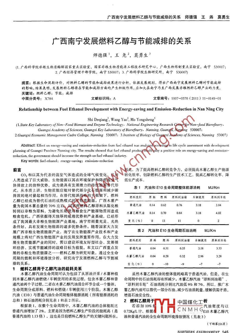 廣西南寧發(fā)展燃料乙醇與節(jié)能減排的關(guān)系師德強(qiáng)王堯莫勇生廣西南寧發(fā)展燃料乙醇與節(jié)能減排的關(guān)系師德強(qiáng)1,王堯2,莫勇生3(1.廣西科學(xué)院非糧生物質(zhì)酶解國家重點(diǎn)實驗寶,囯家非糧生物質(zhì)能源工程技術(shù)研究中心,廣西生物煉制重點(diǎn)實驗室,南寧530002.廣西經(jīng)濟(jì)管理干部學(xué)院,南寧530007;3.廣西科學(xué)院生物研究所,南寧53000摘要:根據(jù)生命周期評價,對燃料乙醇的節(jié)能和減排效釆進(jìn)行分析,依據(jù)發(fā)展規(guī)劃,得出廣西南寧發(fā)展燃料乙醇對節(jié)能減排的影響。結(jié)果表明,發(fā)晨燃料乙醇將在節(jié)能和減排方面均產(chǎn)生積極作用,應(yīng)加大在南寧乃至廣西發(fā)展非糧燃料乙醇產(chǎn)業(yè)的力度。關(guān)鍵詞:燃料乙醇;節(jié)能;減排中圖分類號:X784文獻(xiàn)標(biāo)識碼:A文章編號:1007-0370(2011)11-0145-01Relationship between Fuel Ethanol Development with Energy-saving and Emission-Reduction in Nan Ning CityShi Deqiang, Wang Yao, Mo Yongsheng(1. State Key Laboratory of Non-Food Biomass and Ename Technology, National Engineering Research Center for Non-food BiorefineGuangxi Academy of Sciences, Guangxi Key Laboratory of Biorefinery, Nanning, Guangxi, Nanning 5300072. Guangxi Economic Management Cadre College, Nanning 530007: 3. Institute of Biology of Guangxi Academy of Sciences, Nanning 53007)Abstract: Effect on energy-saving and emission-reduction from fuel ethanol was analyzed aceording to life cycle assessment with developmentining of Guangxi Province Nanning city. The results showed that fuel ethanol product would play a positive role on energy-saving and emission-reduction, the government should increase the strength on fuel ethanol industryKey words: fuel ethanol; energy-saving: emission-reduction前言因此,為了提高燃料乙醇的競爭力,必須提高木薯乙醇生產(chǎn)能源℃O2和以其為代表的溫室氣體造成的全球氣候變化,已對轉(zhuǎn)化效率,創(chuàng)新燃料乙醇的生產(chǎn)技術(shù)工藝,提高乙醇轉(zhuǎn)化率,降人類造成了巨大威脅:生物能源以其在環(huán)境保護(hù)和降低溫室氣低生產(chǎn)成本。體排放上的獨(dú)特優(yōu)勢,成為最具有發(fā)展?jié)摿Φ膫鹘y(tǒng)能源替代形式。從本質(zhì)上講,生物質(zhì)能應(yīng)能對替代部分化石能源和減少碳表1汽油和E10生命周期整體能源消耗MJKm排放的絕對量起相當(dāng)作用。在替代能源戰(zhàn)略的大框架下,燃料塔料類別原料燃料原料到油箱車輛使用原料到車輪乙醇已經(jīng)成為替代石油的成熟模式的生物質(zhì)能源。廣西木薯產(chǎn)量為我國木薯總量的70%左右,國家將燃料乙醇原料從陳化糧普通汽油.140.62轉(zhuǎn)到以非糧為原料,為避免長期使用糧食生產(chǎn)能源物質(zhì)而造成木薯乙醇汽油014070084糧食危機(jī)。廣西依據(jù)得天獨(dú)厚的地理優(yōu)勢和產(chǎn)業(yè)基礎(chǔ),已經(jīng)形成了我國最大非糧生物能源產(chǎn)業(yè)基地。南寧市雨量充足、光熱變化(%)0112條件好,具有發(fā)展生物能源的諸多優(yōu)勢條件。隨著國家大力發(fā)展廣西非糧生物質(zhì)能源產(chǎn)業(yè),南寧在生物能源產(chǎn)業(yè)技術(shù)和產(chǎn)業(yè)表2汽油和E10生命周期石油消耗MJKm規(guī)模上將對廣西生物能源產(chǎn)業(yè)的發(fā)展發(fā)揮重要作用。在大力發(fā)展生物質(zhì)能源產(chǎn)業(yè)的同時,需以建設(shè)環(huán)境友好型社會、發(fā)展循燃料類別原料燃料原料到油箱車輛使用原料到車輪環(huán)經(jīng)濟(jì)、實現(xiàn)節(jié)能減排的戰(zhàn)略目標(biāo)為前提。本文以廣西重點(diǎn)發(fā)普通汽油0.313.53展的非糧生物質(zhì)能源之一一燃料乙醇為研究對象,通過全生命周期的能耗和環(huán)境排放分析,研究南寧發(fā)展燃料乙醇與節(jié)能減木暮乙醇汽油0043.28的關(guān)系。變化(%)0101燃料乙醇用于乙醇汽油的能耗關(guān)系木薯乙醇汽油生命周期可認(rèn)為包括了從原油開采/木薯種植雖然木薯乙醇汽油的整體能耗略高于普通汽油,但是,在生到木薯乙醇汽油燃燒/車輛使用的系統(tǒng)過程,包含木薯乙醇和普命周期中的石油消耗卻有所減少。木薯乙醇汽油“原料到油箱”通汽油兩個子過程,二者在木薯乙醇汽油混合環(huán)節(jié)合成一個整體?!霸系杰囕啞笔拖姆謩e比汽油低%和7%,所以,推廣木生命周期分成原料、燃料和燃燒/車輛使用三個階段。木薯乙醇薯乙醇汽油可以替代一部分石油,減少石油消耗量,緩解供需矛盾汽油(E10)與普通汽油生命周期整體能源消耗(所有能源消耗的增強(qiáng)石油安全性總和)和石油消耗分別見表1和表2所示。2燃料乙醇用于YH中國煤化工析根據(jù)表1,在整個生命周期中,木薯乙醇汽油的總體能耗比若添加10%汽油密度均以普通汽油增加了2%,主要是因為燃料乙醇生產(chǎn)階段的能耗高(是0.72KgL計,根據(jù)CNMHGE1o木薯乙醇汽普通汽油的1.13倍),這也是目前燃料乙醇生產(chǎn)的關(guān)鍵問題所在。油和普通汽油的全生命周期環(huán)境排放情況(見表3)NORTHERN ENVIRONMENT 145北方環(huán)境第23卷第11期2011年11月標(biāo)準(zhǔn)限值的選取:甲苯采用前蘇聯(lián)《居民區(qū)大氣中有害物質(zhì)3結(jié)論最高允許濃度》中的居民區(qū)最高值;TVOC參考執(zhí)行《室內(nèi)空氣(1)由于工業(yè)基地開發(fā)具有不確定性的特點(diǎn),導(dǎo)致環(huán)評工