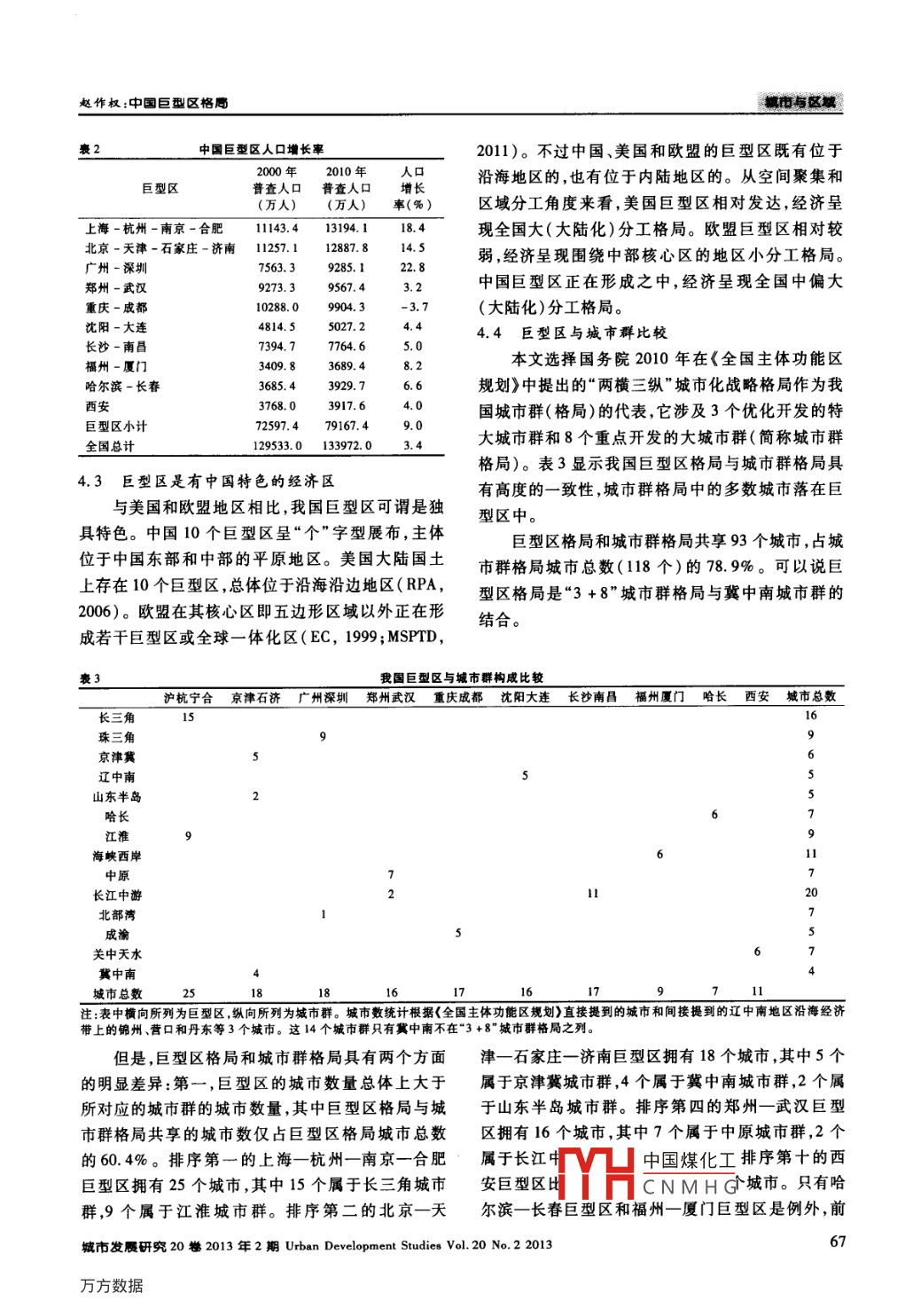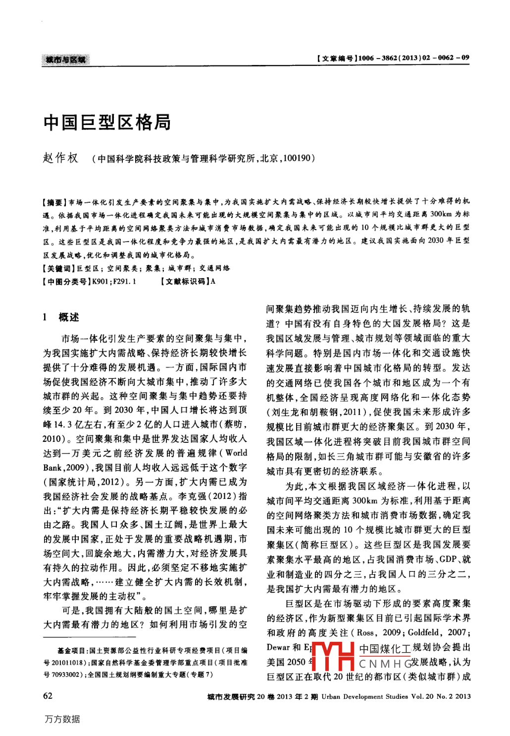 城擊氧【文章編號】1006-3862(2013)02-0062-09中國巨型區(qū)格局趙作權(quán)(中國科學(xué)院科技政策與管理科學(xué)研究所,北京,100190)【摘要】市場一體化引發(fā)生產(chǎn)要素的空間聚集與集中,為我國實(shí)施擴(kuò)大內(nèi)需戰(zhàn)略、保持經(jīng)濟(jì)長期較快增長提供了十分難得的機(jī)遇。依據(jù)我國市場一體化進(jìn)程確定我國未來可能出現(xiàn)的大規(guī)模空間聚集與集中的區(qū)域。以城市間平均交通距離300km為標(biāo)準(zhǔn),利用基于平均距離的空間網(wǎng)絡(luò)聚類方法和城市消費(fèi)市場數(shù)據(jù),確定我國未來可能出現(xiàn)的10個(gè)規(guī)模比城市群更大的巨型區(qū)。這些巨型區(qū)是我國一體化程度和競爭力最強(qiáng)的地區(qū),是我國擴(kuò)大內(nèi)需最有潛力的地區(qū)。建議我國實(shí)施面向2030年巨型區(qū)發(fā)展戰(zhàn)略,優(yōu)化和調(diào)整我國的城市化格局。【關(guān)鍵詞】巨型區(qū);空間聚類;聚集;城市群;交通網(wǎng)絡(luò)【中圖分類號】K901;F291.1文獻(xiàn)標(biāo)識碼】A間聚集趨勢推動我國邁向內(nèi)生增長、持續(xù)發(fā)展的軌1概述道?中國有沒有自身特色的大國發(fā)展格局?這是市場一體化引發(fā)生產(chǎn)要素的空間聚集與集中,我國區(qū)域發(fā)展與管理、城市規(guī)劃等領(lǐng)域面臨的重大為我國實(shí)施擴(kuò)大內(nèi)需戰(zhàn)略、保持經(jīng)濟(jì)長期較快增長科學(xué)問題。特別是國內(nèi)市場一體化和交通設(shè)施快提供了十分難得的發(fā)展機(jī)遇。一方面,國際國內(nèi)市速發(fā)展直接影響著中國城市化格局的轉(zhuǎn)型。發(fā)達(dá)場促使我國經(jīng)濟(jì)不斷向大城市集中,推動了許多大的交通網(wǎng)絡(luò)已使我國各個(gè)城市和地區(qū)成為一個(gè)有城市群的興起。這種空間聚集與集中趨勢還要持機(jī)整體,全國經(jīng)濟(jì)呈現(xiàn)高度網(wǎng)絡(luò)化和一體化態(tài)勢續(xù)至少20年。到2030年,中國人口增長將達(dá)到頂(劉生龍和胡鞍鋼,2011),促使我國未來形成許多峰14.3億左右,有至少2億的人口進(jìn)人城市(蔡昉,規(guī)模比目前城市群更大的經(jīng)濟(jì)聚集區(qū)。到2030年2010)。空間聚集和集中是世界發(fā)達(dá)國家人均收人我國區(qū)域一體化進(jìn)程將突破目前我國城市群空間達(dá)到一萬美元之前經(jīng)濟(jì)發(fā)展的普遍規(guī)律(Word格局的限制,如長三角城市群可能與安徽省的許多Bank,2009),我國目前人均收入遠(yuǎn)遠(yuǎn)低于這個(gè)數(shù)字城市具有更密切的經(jīng)濟(jì)聯(lián)系。(國家統(tǒng)計(jì)局,2012)。另一方面,擴(kuò)大內(nèi)需已成為為此,本文根據(jù)我國區(qū)域經(jīng)濟(jì)一體化進(jìn)程,以我國經(jīng)濟(jì)社會發(fā)展的戰(zhàn)略基點(diǎn)。李克強(qiáng)(2012)指城市間平均交通距離300km.為標(biāo)準(zhǔn),利用基于距離出:“擴(kuò)大內(nèi)需是保持經(jīng)濟(jì)長期平穩(wěn)較快發(fā)展的必的空間網(wǎng)絡(luò)聚類方法和城市消費(fèi)市場數(shù)據(jù),確定我由之路。我國人口眾多國土江闊,是世界上最大國未來可能出現(xiàn)的10個(gè)規(guī)模比城市群更大的巨型的發(fā)展中國家,正處于發(fā)展的重要戰(zhàn)略機(jī)遇期,市聚集區(qū)(簡稱巨型區(qū))。這些巨型區(qū)是我國發(fā)展要場空間大,回旋余地大,內(nèi)需潛力大,對經(jīng)濟(jì)發(fā)展具素聚集水平最高的地區(qū),占我國消費(fèi)市場、GDP、就有持久的拉動作用。因此,必須堅(jiān)定不移地實(shí)施擴(kuò)大內(nèi)需戰(zhàn)略,……建立健全擴(kuò)大內(nèi)需的長效機(jī)制業(yè)和制造業(yè)的四分之三,占我國人口的三分之二牢牢掌握發(fā)展的主動權(quán)”。是我國擴(kuò)大內(nèi)需最有潛力的地區(qū)。可是,我國擁有大陸般的國土空間,哪里是擴(kuò)巨型區(qū)是在市場驅(qū)動下形成的要素高度聚集大內(nèi)需最有潛力的地區(qū)?如何利用市場引發(fā)的空的經(jīng)濟(jì)區(qū),作為新型聚集區(qū)目前已引起國際學(xué)術(shù)界和政府的高度關(guān)注(Ro,2009; Goldfeld,2007基金項(xiàng)目:國土資源部公益性行業(yè)科研專項(xiàng)經(jīng)費(fèi)項(xiàng)目(項(xiàng)目編V凵中國煤化工規(guī)劃協(xié)會提出號210101國家自然科學(xué)基金委管理學(xué)部重點(diǎn)項(xiàng)目(項(xiàng)目批準(zhǔn)美國2050CNMHG發(fā)展戰(zhàn)略,認(rèn)為號70933002);全國國土規(guī)劃綱要編制重大專題(專題7)巨型區(qū)正在取代20世紀(jì)的都市區(qū)(類似城市群)成城市發(fā)展研究20卷2013年2期 Urban Development Studies Vol.20No.22013趙作權(quán):中國巨型區(qū)格局城與區(qū)為美國參與21世紀(jì)全球經(jīng)濟(jì)競爭的新單元(RPA,尺度,這里250~300km基本與廣闊的成渝經(jīng)濟(jì)區(qū)2006)。歐盟早就認(rèn)識到巨型區(qū)的重要性,試圖在相當(dāng)。歐洲中部核心區(qū)之外建成若干個(gè)極具競爭力的巨型區(qū)(EC,1999; MSPTD,2011)。不過,我國政府和2文獻(xiàn)綜述學(xué)術(shù)界對巨型聚集區(qū)的關(guān)注比較有限。我國政府巨型區(qū)是國際國內(nèi)兩個(gè)市場共同驅(qū)動下要素正在推進(jìn)以城市群為主體的全國城市化戰(zhàn)略格局高度聚集的經(jīng)濟(jì)區(qū),由至少兩個(gè)都市區(qū)或城市群