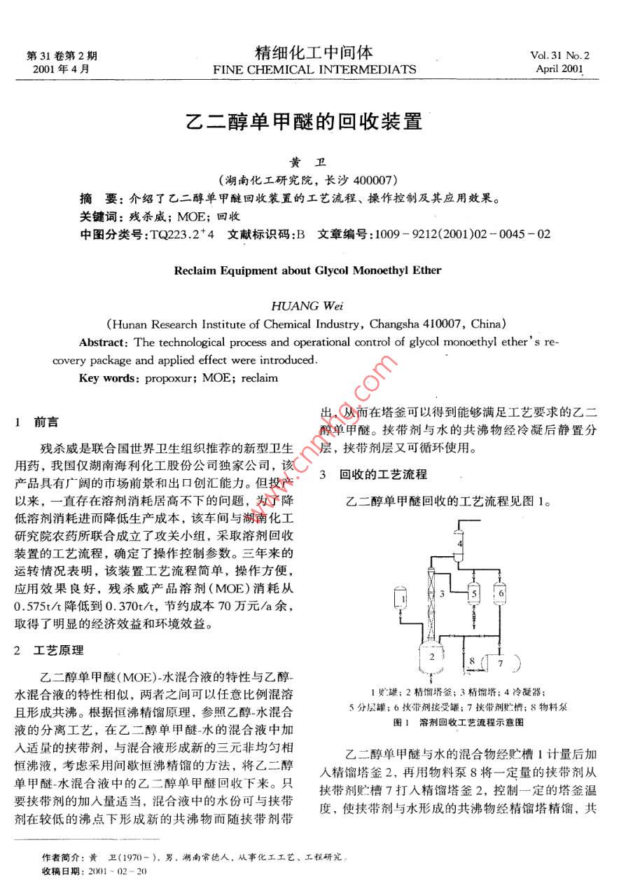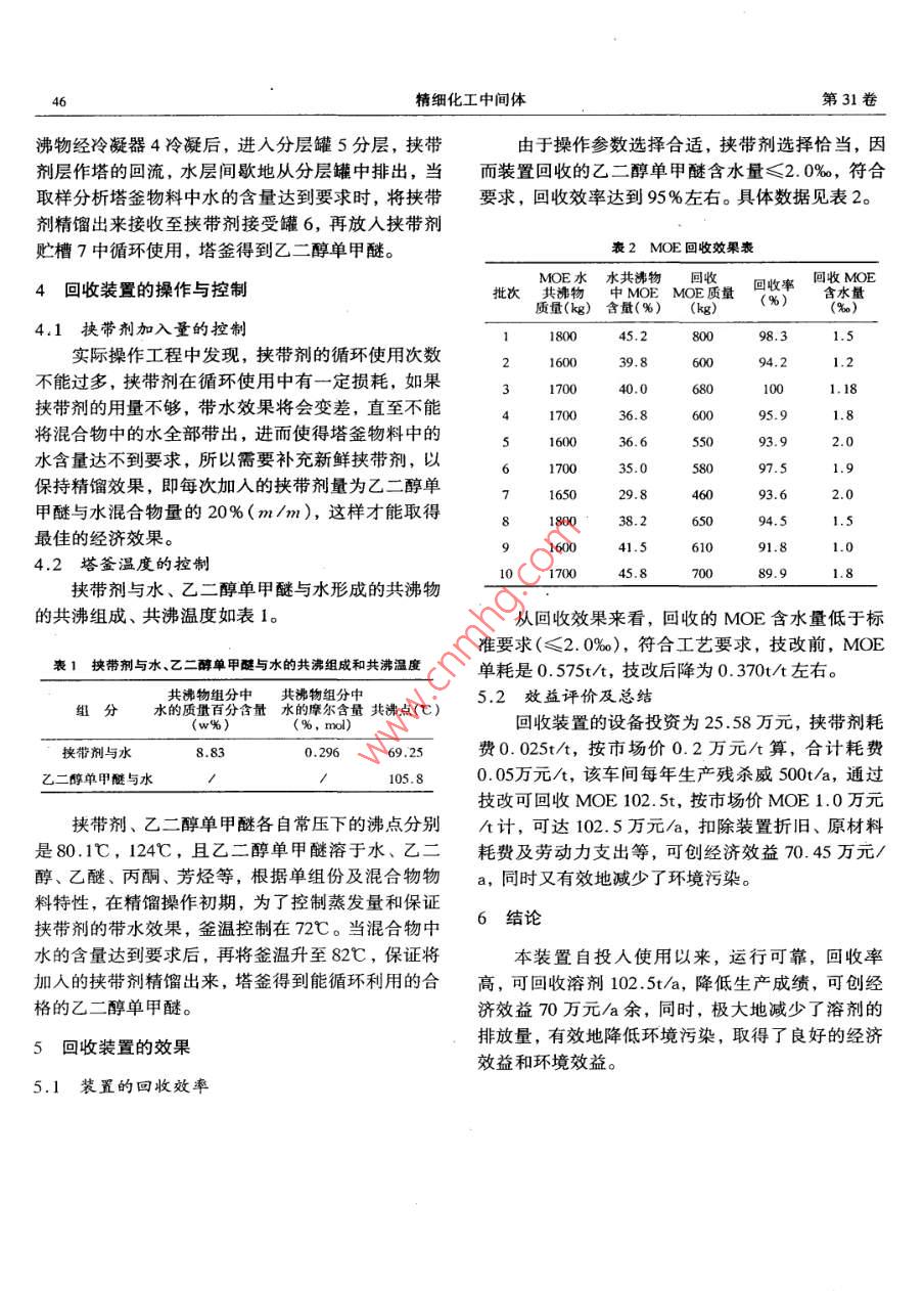 第31卷第2期精細化工中間體Vol 31 No. 22001年4月FINE CHEMICAL INTERMEDIATSApril 2001乙二醇單甲醚的回收裝置黃衛(wèi)湖南化工研究院,長沙400007)摘要:介紹了乙二醇單甲醚回收裝置的工藝流程、操作控制及其應用效果。關鍵詞:殘殺威;MOE;回收中圖分類號:TQ223.2+4文獻標識碼:B文章編號:1009-9212(2001)02-0045-02Reclaim Equipment about Glycol Monoethyl EtherHUANG WeiHunan Research Institute of Chemical Industry, Changsha 410007, China)Abstract: The technological process and operational control of glycol monoethyl ethers re-covery package and applied effect were introducedKey words: propoxur; MOE; reclaim1前言出,從而在塔釜可以得到能夠滿足工藝要求的乙二醇單甲醚。挾帶劑與水的共沸物經(jīng)冷凝后靜置分殘殺威是聯(lián)合國世界衛(wèi)生組織推薦的新型衛(wèi)生層,挾帶劑層又可循環(huán)使用。用藥,我國僅湖南海利化工股份公司獨家公司,該產(chǎn)品具有廣闊的市場前景和出口創(chuàng)匯能力。但投產(chǎn)3回收的工藝流程以來,一直存在溶劑消耗居高不下的問題,為了降乙二醇單甲醚回收的工藝流程見圖1。低溶劑消耗進而降低生產(chǎn)成本,該車間與湖南化工研究院農(nóng)藥所聯(lián)合成立了攻關小組,采取溶劑回收裝置的工藝流程,確定了操作控制參數(shù)。三年來的運轉(zhuǎn)情況表明,該裝置工藝流程簡單,操作方便應用效果良好,殘殺威產(chǎn)品溶劑(MOE)消耗從0.575t/降低到0.370t/t,節(jié)約成本70萬元a余取得了明顯的經(jīng)濟效益和環(huán)境效益。2工藝原理乙二醇單甲醚(MOE)-水混合液的特性與乙醇水混合液的特性相似,兩者之間可以任意比例混溶罐;2精餾塔釜;3精餾塔;4冷凝器;且形成共沸。根據(jù)恒沸精餾原理,參照乙醇水混合5分層罐;6挾帶劑接受罐;7挾帶劑貯槽;8物料泵液的分離工藝,在乙二醇單甲醚水的混合液中加圖!溶劑回收工藝流程示意圖入適量的挾帶劑,與混合液形成新的三元非均勻相乙二醇單甲醚與水的混合物經(jīng)貯槽1計量后加恒沸液,考慮釆用間歇恒沸精餾的方法,將乙二醇單甲醚水混合液中的乙二醇單甲醚回收下來。只入精餾塔釜2,再用物料泵8將一定量的挾帶劑從挾帶劑貯槽7打入精餾塔釜2,控制一定的塔釜溫要挾帶劑的加入量適當,混合液中的水份可與挾帶劑在較低的沸點下形成新的共沸物而隨挾帶劑帶度,使挾帶劑與水形成的共沸物經(jīng)精餾塔精餾,共作者簡介:黃衛(wèi)(1970-).男,湖南常德人,從事化工工藝、工程研究稿日期:2001-02-20精細化工中間體第31卷沸物經(jīng)冷凝器4冷凝后,進入分層罐5分層,挾帶由于操作參數(shù)選擇合適,挾帶劑選擇恰當,因劑層作塔的回流,水層間歇地從分層罐中排出,當而裝置回收的乙二醇單甲醚含水量≤2.0‰,符合取樣分析塔釜物料中水的含量達到要求時,將挾帶要求,回收效率達到95%左右。具體數(shù)據(jù)見表2劑精餾出來接收至挾帶劑接受罐6,再放入挾帶劑貯槽7中循環(huán)使用,塔釜得到乙二醇單甲醚。2MOE回收效果表水共沸物回收4回收裝置的操作與控制批次中 MOE MOE2質(zhì)量回收率回收MOE含水量)含量(%)(kg)4.1挾帶劑加入量的控制45.2實際操作工程中發(fā)現(xiàn),挾帶劑的循環(huán)使用次數(shù)94.2不能過多,挾帶劑在循環(huán)使用中有一定損耗,如果23400040.0挾帶劑的用量不夠,帶水效果將會變差,直至不能將混合物中的水全部帶出,進而使得塔釜物料中的36.65502.0水含量達不到要求,所以需要補充新鮮挾帶劑,以保持精餾效果,即每次加入的挾帶劑量為乙二醇單93.6甲醚與水混合物量的20%(m/m),這樣才能取得894.51.5最佳的經(jīng)濟效果。4.2塔釜溫度的控制10170045.8挾帶劑與水、乙二醇單甲醚與水形成的共沸物的共沸組成、共沸溫度如表1。從回收效果來看,回收的MOE含水量低于標準要求(≤2.0‰),符合工藝要求,技改前,MOE表1挾帶劑與水、乙二醇單甲醚與水的共沸組成和共沸溫度單耗是0.575t/t,技改后降為0.370t/t左右。水的質(zhì)量百分含量水的摩爾含量共沸點(℃)5.2效益評價及總結(jié)共沸物組分中共沸物組分中(w%)(% mol)回收裝置的設備投資為25.58萬元,挾帶劑耗挾帶劑與水費0.025t/,按市場價0.2萬元/算,合計耗費醇單甲醚與水105.80.05萬元/t,該車間每年生產(chǎn)殘殺威500t/a,通過技改可回收MOE102.5t,按市場價MOE1.0萬元挾帶劑、乙二醇單甲醚各自常壓下的沸點分別計,可達102.5萬元/a,扣除裝置折舊、原材料是80.1℃,124℃,且乙二醇單甲醚溶于水、乙二耗費及勞動力支出等,可創(chuàng)經(jīng)濟效益70.45萬元/醇、乙醚、丙酮、芳烴等,根據(jù)單組份及混合物物a,同時又有效地減少了環(huán)境污染。料特性,在精餾操作初期,為了控制蒸發(fā)量和保證挾帶劑的帶水效果,釜溫控制在72℃。當混合物中6結(jié)論水的含量達到要求后,再將釜溫升至82℃,保證將本裝置自投人使用以來,運行可靠,回收率加入的挾帶劑精餾出來,塔釜得到能循環(huán)利用的合高,可回收溶劑102.5ta,降低生產(chǎn)成績,可創(chuàng)經(jīng)格的乙二醇單甲醚。濟效益70萬元/a余,同時,極大地減少了溶劑的5回收裝置的效果排放量,有效地降低環(huán)境污染,取得了良好的經(jīng)濟效益和環(huán)境效益。裝置的回收效率