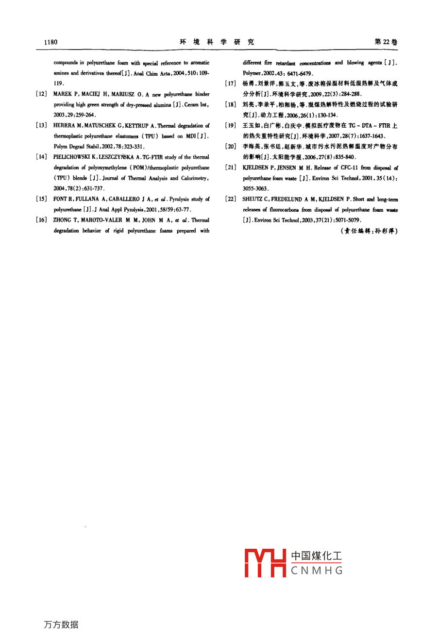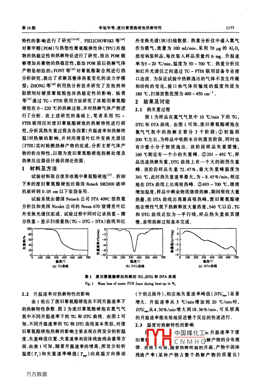 第22卷第10期環(huán)境科學(xué)研究vol. 22, No 102009年10月Research of Environmental Sciences廢舊聚氨酯硬泡熱解特性李旭華12,段寧12,林學(xué)鈺2,劉景洋2,郭玉文1中國環(huán)境科學(xué)研究院,北京1000122北京師范大學(xué)水科學(xué)研究院,北京100875摘要:采用熱重分析儀對廢舊聚氨酯硬泡在氮氣中的熱失重行為進行了研究,并對升溫速率熱解終溫對熱解的影響進行了分析,結(jié)果表明:在氮氣氣氛條件下,廢舊聚氨酯硬泡熱解主要發(fā)生在200-492℃;隨著升溫速率的提高廢舊聚氨酯硬泡熱失重時揮發(fā)分初析溫度向高溫方向偏移失重速率峰值(DTG-)顯著增大.利用熱重-紅外(TG-FTIR)聯(lián)用方法對氮氣氣氛中10℃/min升溫速率下的樣品熱解氣體產(chǎn)物進行了檢測.結(jié)果表明:廢舊聚氨酯硬泡熱解產(chǎn)物有H2O,CO2,CO,CFC-11,以及含氯化合物、烯烴類、烷烴類和帶有苯環(huán)等官能團的化合物,且主要氣體產(chǎn)物有相似的析出規(guī)律關(guān)鍵詞:廢舊聚氨酯硬泡;熱重-紅外聯(lián)用;熱解特性;揮發(fā)分中圖分類號:X78文獻標(biāo)志碼:A文章編號:1001-6929(2009)10-1176Pyrolysis Characteristics of Waste Rigid Polyurethance FoamLI Xu-hua, DUAN Ning", LIN Xue-yu, LIU Jing-yang", GUO Yu-wen1. Chinese Research Academy of Environmental Sciences, Beijing 100012,ChinB2. College of Water Sciences, Beijing Normal University, Beijing 100875, ChinaAbstract: The pyrolysis properties of waste rigid polyurethance(RPU)foam were studied by thermo-gravimetric analysis in a nitrogenatmosphere, and the influence of heating rate and final temperature on pyrolysis was also discussed. The results indicate that the pyrolysis ofwaste RPU foam mainly occurs at about 200-492C. With increasing heating rate, the initial separating temperature of the volatile organicmatter(T, )increases toward the higher range, and the peak value of the weight loss velocity( DTG. )shows a remarkable increase. At thsame time, qualitative analysis of the evolved gases during heat-up(10 C/min)in nitrogen was analyzed by using Thermo-Gravimetric andFourier Transform Infrared(TG-FTIR). Experimental results show that pyrolysis products of waste RPU foam have H,O, Co2, CO,CFC-11organic-chlorine compounds, alkenes, alkanes, alcohols and aromatic compounds, and the precipitation characteristics of the gas products areKey words: rigid polyurethane foam( RPU foam); TG- FTIR; Pyrolysis property; volatile matter聚氨酯是指在高分子結(jié)構(gòu)主鏈上含有許多產(chǎn)生了大量廢物(如下腳料和報廢產(chǎn)品等),對環(huán)境NHCOO-一基團的聚合物.聚氨酯硬泡因其具有良造成很大威脅.熱處理技術(shù)已成為目前我國固好的絕熱性能、質(zhì)量輕、機械強度高和黏合力強等優(yōu)體廢物處理的主要方法,利用其處理廢舊聚氨酯硬點,作為絕熱保溫材料被廣泛用于制冷設(shè)備、運輸泡具有處理速度快及減容減量顯著等優(yōu)點.因此,業(yè)、家具、家用電器等行業(yè).200年我國聚氨酯產(chǎn)量對廢舊聚氨酯硬泡的熱解特性的研究有著重要將達到4x10t",而聚氨酯硬泡約占聚氨酯泡沫體意義40%~50%(2).聚氨酯硬泡在廣泛使用的同時也熱重-微分熱重(TG-DTG)分析能夠?qū)崿F(xiàn)程序控溫下自動連續(xù)跟蹤物質(zhì)的物理性質(zhì)與溫度間的變化關(guān)系.熱重-紅外(TG-FTR)聯(lián)用技術(shù)不僅能準(zhǔn)收稿日期:200-01-16修訂日期:20002-16確地測量物質(zhì)質(zhì)量與溫度的變化關(guān)系,而且能實時基金項目:國家“十一五科技支撐計劃項目(2006BAC02A19);環(huán)保公益性行業(yè)科研專項(HBGY00709022)快速分析物質(zhì)受熱過程中分解產(chǎn)物的化學(xué)成分1作者簡介:李旭華(1980-),女,河南商丘人,lih@emes,og,c中國煤化工生物質(zhì)、城市生貴任作者段寧(1949-),男,四川成都人,研究員,博士,博導(dǎo),主活要從事清潔生產(chǎn)、循環(huán)經(jīng)濟、生態(tài)工業(yè)理論技術(shù)研究,有CNMHG熱解燃燒特性的火角度對聚氨酯產(chǎn)ningduan@ craes. org.en品的熱穩(wěn)定性及助劑(如發(fā)泡劑、阻燃劑)對其熱解10期李旭華等:廢舊聚氨酯硬泡熱解特性1177特性的影響進行了研究, PIELICHOWSKI等外變換光譜(R)掃描數(shù)據(jù).熱重分析儀中通入氮氣對聚甲醛(PoM)與熱塑性聚氨酯彈性體(TPU)共混作為載氣,流量為100mL/min,.用70g的A2O3物的熱穩(wěn)定性和熱解特征進行了研究指出POM能質(zhì)坩堝裝樣品每次裝入樣品質(zhì)量約6m.升溫速夠增加共聚物的熱穩(wěn)定性添加POM前后熱解氣體率為5~20℃/min,溫度為50~700℃.熱重分析儀產(chǎn)物是相似的;FONT等對聚氨酯黏合劑進行熱和紅外光譜儀之間通過TC-FTR聯(lián)用設(shè)備專業(yè)接分析研究提出了求解其整體熱重變化的動力學(xué)模口連接.為保證試驗中熱解逸出的氣體不發(fā)生冷凝型; ZHONG等利用熱分析技術(shù)研究了發(fā)泡劑和和結(jié)構(gòu)的變化,接口和氣體傳輸線的溫度均設(shè)為阻燃劑對硬質(zhì)聚氨酯泡沫熱穩(wěn)定性的影響.楊勇180℃,掃描波數(shù)范圍為400~450cm1.等通過TG-FTHR聯(lián)用方法研究了冰箱用聚氨酯2結(jié)果及討論硬泡在0-220℃的熱解過程并對熱解氣體產(chǎn)物進2.1熱失重過程行了分析.在上述研究的基礎(chǔ)上,筆者采用TG圖1為樣品在氮氣氣氛中10℃/mn下的TG,FTIR聯(lián)用儀對廢舊聚氨酯硬泡的熱解特性進行研DG和DA曲線.由圖1可知廢舊聚氨酯硬泡在究分析其熱失重過程及各因素(升溫速率和熱解終氮氣氣氛中的熱解主要分3個階段:①初溫到溫)對熱解