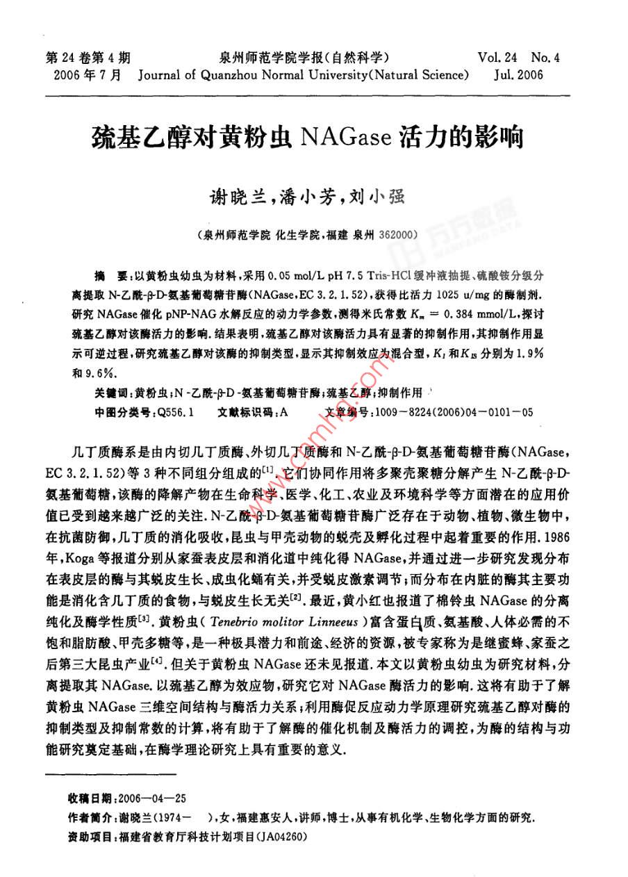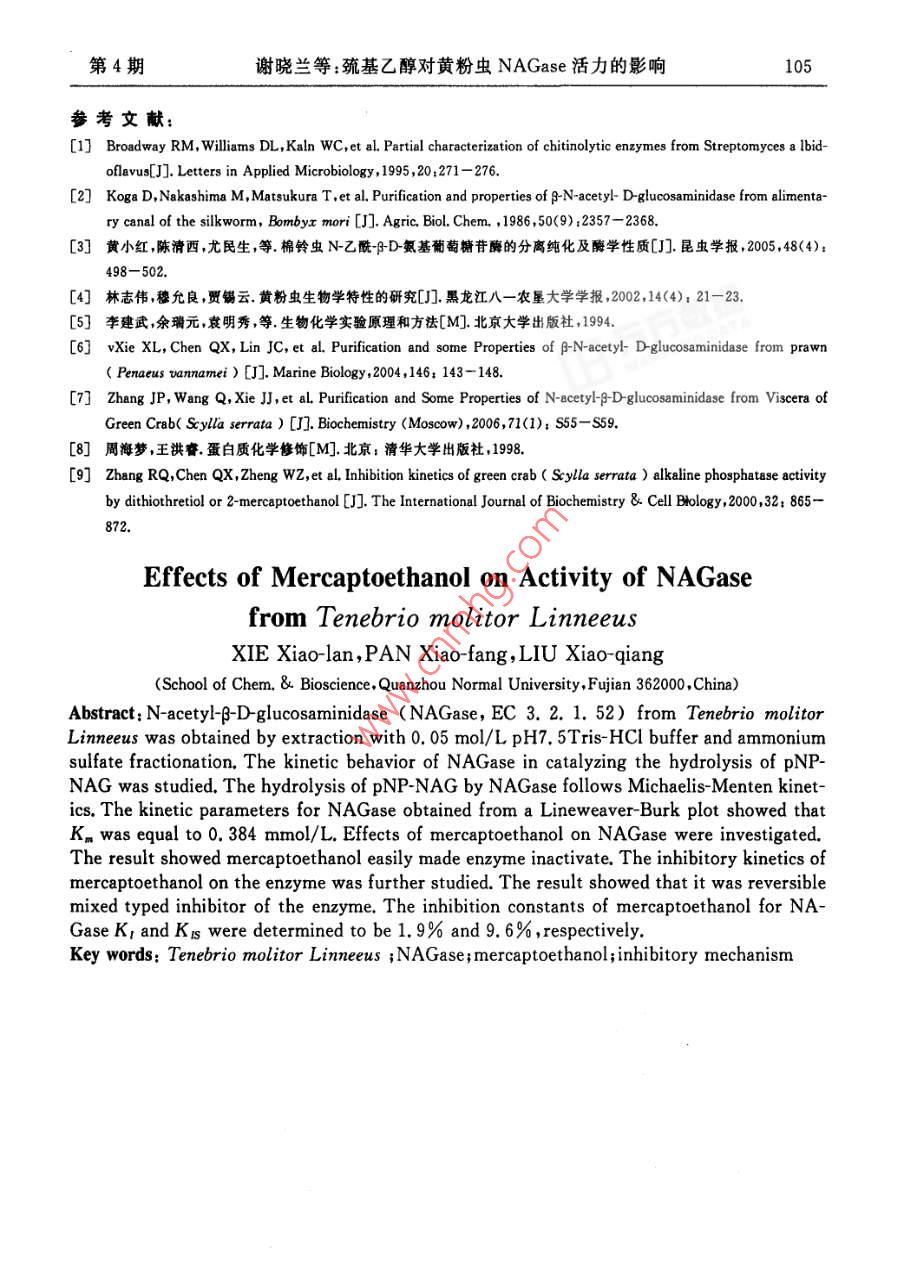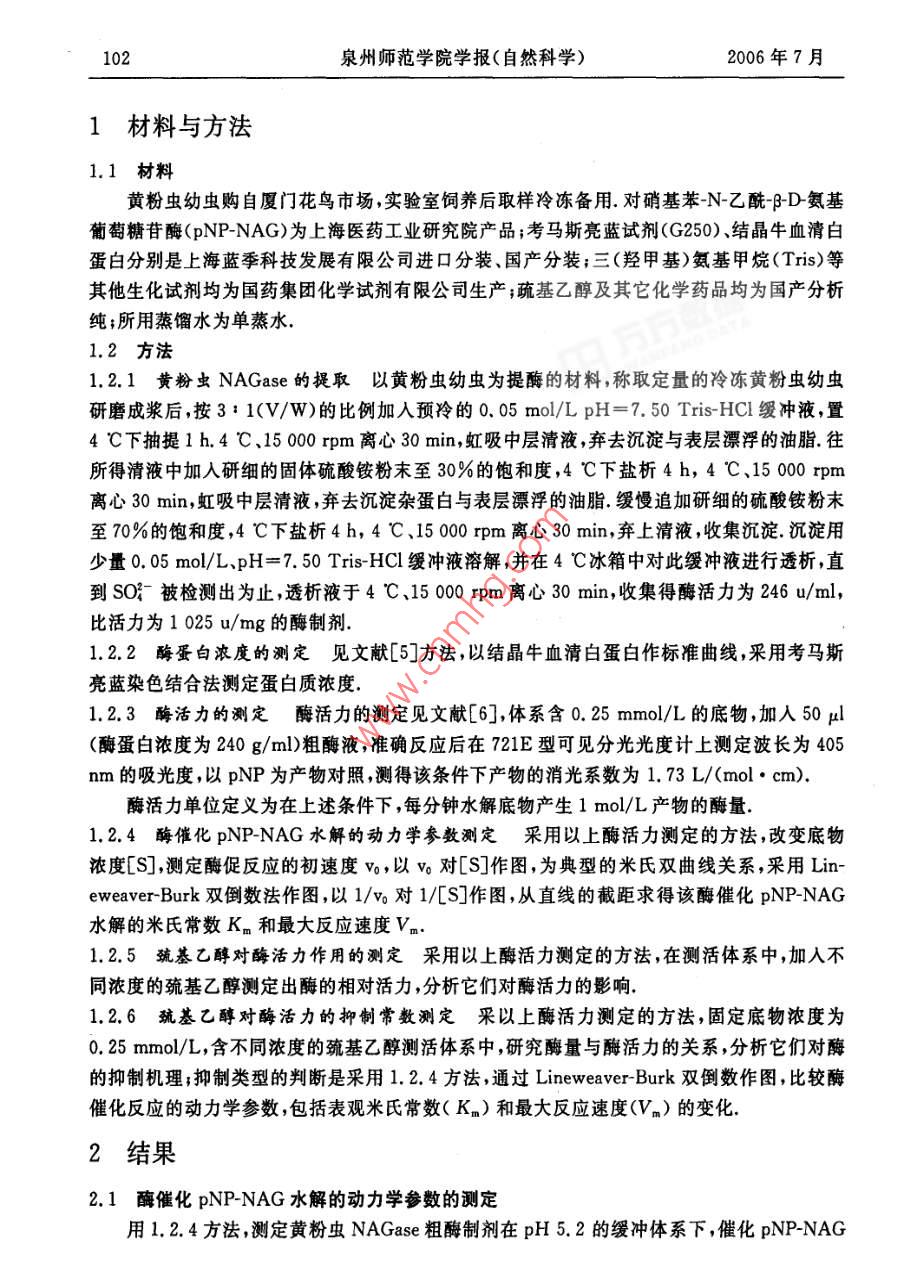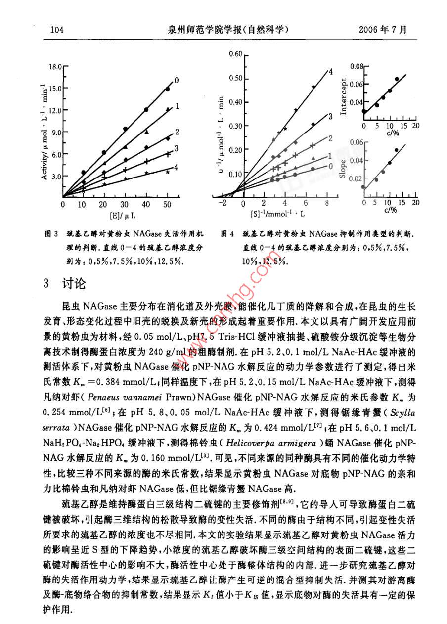 第24卷第4期泉州師范學(xué)院學(xué)報(自然科學(xué))VoL 24 No 42006 F 7 a Journal of Quanzhou Normal University(Natural Science) Jul 2006巰基乙醇對黃粉蟲 NAGase活力的影響謝曉蘭,潘小芳,劉小強(泉州師范學(xué)院化生學(xué)院,福建泉州362000摘要:以黃粉蟲幼蟲為材料,采用0.05mol/LpH7.5 Tris-HCl緩沖液抽提、硫酸銨分級分離提取N乙酰D氨基葡萄糖苷酶( NAGase, EC3.2.1.52),獲得比活力1025u/mg的酶制劑,研究 NAGase催化 PNP-NAG水解反應(yīng)的動力學(xué)參數(shù)測得米氏常數(shù)K=0.384mmo/L,探討巰基乙醇對該酶活力的影響.結(jié)果表明巰基乙醇對該酶活力具有顯著的抑制作用,其抑制作用顯示可逆過程研究巰基乙醇對該酶的抑制類型顯示其抑制效應(yīng)為混合型,K1和KB分別為1.9%和9.6%關(guān)鍵詞:黃粉蟲;N-乙酰PD·氨基葡萄糖苷酶;巰基乙醇;抑制作用中圖分類號:Q556.1文獻標(biāo)識碼:A文章編號:1009-8224(2006)04-0101-05幾丁質(zhì)酶系是由內(nèi)切幾丁質(zhì)酶外切幾丁質(zhì)酶和N乙酰BD氨基葡萄糖苷酶( NAGaseEC321.52)等3種不同組分組成的(,它們協(xié)同作用將多聚殼聚糖分解產(chǎn)生N乙酰BD氨基葡萄糖,該酶的降解產(chǎn)物在生命科學(xué)醫(yī)學(xué)、化工、農(nóng)業(yè)及環(huán)境科學(xué)等方面潛在的應(yīng)用價值已受到越來越廣泛的關(guān)注N乙酰BD氨基葡萄糖苷酶廣泛存在于動物、植物、微生物中,在抗菌防御,幾丁質(zhì)的消化吸收,昆蟲與甲殼動物的蛻殼及孵化過程中起著重要的作用.1986年,Koga等報道分別從家蠶表皮層和消化道中純化得 NAGase,并通過進一步研究發(fā)現(xiàn)分布在表皮層的酶與其蛻皮生長成蟲化蛹有關(guān),并受蛻皮激素調(diào)節(jié);而分布在內(nèi)臟的酶其主要功能是消化含幾丁質(zhì)的食物,與蛻皮生長無關(guān)2.最近,黃小紅也報道了棉鈴蟲 NAGase的分離純化及酶學(xué)性質(zhì)黃粉蟲( Tenebrio molitor linneeus)富含蛋白質(zhì)氨基酸、人體必需的不飽和脂肪酸、甲殼多糖等,是一種極具潛力和前途、經(jīng)濟的資源,被專家稱為是繼蜜蜂、家蠶之后第三大昆蟲產(chǎn)業(yè),但關(guān)于黃粉蟲 NAGase還未見報道本文以黃粉蟲幼蟲為研究材料,分離提取其 NAGase.以巰基乙醇為效應(yīng)物,研究它對 NAGase酶活力的影響.這將有助于了解黃粉蟲 NAGase三維空間結(jié)構(gòu)與酶活力關(guān)系;利用酶促反應(yīng)動力學(xué)原理研究巰基乙醇對酶的抑制類型及抑制常數(shù)的計算將有助于了解酶的催化機制及酶活力的調(diào)控,為酶的結(jié)構(gòu)與功能研究奠定基礎(chǔ),在酶學(xué)理論研究上具有重要的意義.收稿日期:2006-04-25作者簡介:謝曉蘭(1974—),女,福建惠安人,講師,博士,從事有機化學(xué)、生物化學(xué)方面的研究資助項目:福建省教育廳科技計劃項目(JA04260)102泉州師范學(xué)院學(xué)報(自然科學(xué))2006年7月1材料與方法1.1材料黃粉蟲幼蟲購自廈門花鳥市場實驗室飼養(yǎng)后取樣冷凍備用對硝基苯N乙酰D氨基葡萄糖苷酶( PNP-NAG)為上海醫(yī)藥工業(yè)研究院產(chǎn)品;考馬斯亮藍(lán)試劑(G250)結(jié)晶牛血清白蛋白分別是上海藍(lán)季科技發(fā)展有限公司進口分裝、國產(chǎn)分裝;三(羥甲基)氨基甲烷(Tris)等其他生化試劑均為國藥集團化學(xué)試劑有限公司生產(chǎn);疏基乙醇及其它化學(xué)藥品均為國產(chǎn)分析純;所用蒸餾水為單蒸水1.2方法1.2.1黃粉蟲 NAGase的提取以黃粉蟲幼蟲為提酶的材料,稱取定量的冷凍黃粉蟲幼蟲研磨成漿后,按3:1(V/W)的比例加入預(yù)冷的0.05mo/LpH=7.50 Tris-HCl緩沖液,置4C下抽提1h.4C、15000rpm離心30mn,虹吸中層清液,棄去沉淀與表層漂浮的油脂.往所得清液中加入研細(xì)的固體硫酸銨粉末至30%的飽和度,4℃下鹽析4h,4℃、15000rpm離心30min,虹吸中層清液,棄去沉淀雜蛋白與表層漂浮的油脂緩慢追加研細(xì)的硫酸銨粉末至70%的飽和度,4℃下鹽析4h,4℃、15000rpm離心30min,棄上清液,收集沉淀,沉淀用少量0.05mol/L、pH=7.50 Tris-HCl緩沖液溶解,并在4℃冰箱中對此緩沖液進行透析,直到SO3被檢測出為止,透析液于4C、15000rpm離心30min,收集得酶活力為246u/ml,比活力為1025u/mg的酶制劑1.2.2酶蛋白濃度的測定見文獻[5]方法,以結(jié)晶牛血清白蛋白作標(biāo)準(zhǔn)曲線,采用考馬斯亮藍(lán)染色結(jié)合法測定蛋白質(zhì)濃度1.2.3酶活力的測定酶活力的測定見文獻[6]體系含0.25mmol/L的底物,加入50l(酶蛋白濃度為240g/ml)粗酶液,準(zhǔn)確反應(yīng)后在721E型可見分光光度計上測定波長為405nm的吸光度,以pNP為產(chǎn)物對照測得該條件下產(chǎn)物的消光系數(shù)為1.73L/( mol cm)酶活力單位定義為在上述條件下,每分鐘水解底物產(chǎn)生1mol/L產(chǎn)物的酶量1.2.4酶催化 PNP-NAG水解的動力學(xué)參數(shù)測定采用以上酶活力測定的方法,改變底物濃度[S],測定酶促反應(yīng)的初速度v,以v對[S]作圖,為典型的米氏雙曲線關(guān)系,采用Lineweaver-Burk雙倒數(shù)法作圖,以1/v對1/[S]作圖,從直線的截距求得該酶催化 PNP-NAG水解的米氏常數(shù)Kn和最大反應(yīng)速度Vn1.2.5巰基乙醇對酶活力作用的測定采用以上酶活力測定的方法,在測活體系中,加入不同濃度的巰基乙醇測定出酶的相對活力,分析它們對酶活力的影響1.2.6巰基乙醇對酶活力的抑制常數(shù)測定采以上酶活力測定的方法,固定底物濃度為0.25mmol/L,含不同濃度的巰基乙醇測活體系中,研究酶量與酶