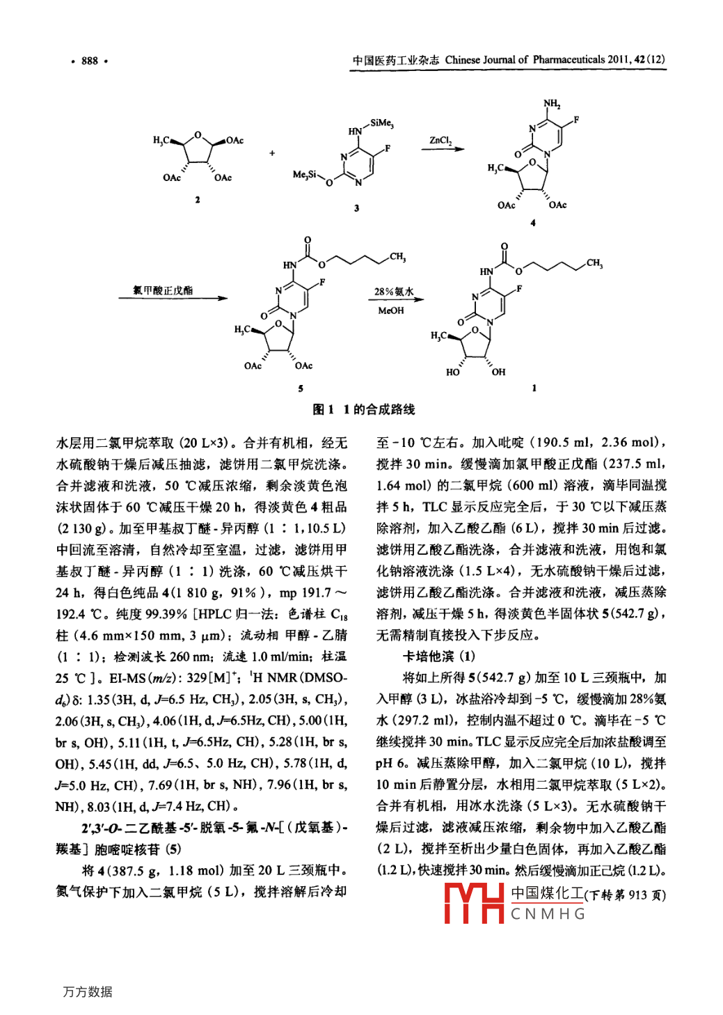 中國(guó)醫(yī)藥工業(yè)雜志Chinese Joumal of Pharmaceuticals 2011, 42(12)●887●卡培他濱的合成柴洪偉',尚驚鴻’,王維',翟寶霜',尚慕宏'*(1.上??铝炙贡めt(yī)藥科技有限公司,上海201203; 2. 安斯泰來(lái)中國(guó)制藥有限公司,遼寧沈陽(yáng)10000摘要: 1,2,3- 三乙?;?5-脫氧-.D-核糖和硅烷化的5-氟胞嘧啶在無(wú)水氯化鋅催化下糖基化得到2',3'-0-二乙?;?5'-脫氧-5-氟胞嘧啶核苷,再與氯甲酸正戊酯反應(yīng)得到2',3'-0-二乙酰基-5'-脫氧-5-氟-N- [(戊氧基)羰基]胞嘧啶核苷,最后經(jīng)脫保護(hù)得到抗腫瘤藥卡培他濱,總收率約74%。關(guān)鍵詞:卡培他濱;抗腫瘤藥;合成中圖分類號(hào): R979.12文獻(xiàn)標(biāo)志碼: A文章編號(hào): 1001-8255 (2011) 12-0887-02Synthesis of CapecitabineCHAI Hongwei', SHANG Jinghong', WANG Wei', ZHAI Baoshuang' , SHANG Muhong'*(1. Shanghai Collins & Paulson Pharmaceutical Co., Ltd, 201203; 2. Astellas Pharma China Inc.,. Shenyang 1000000ABSTRACT: The glycosylation of 1,2,3-tri-O-acetyl-5-deoxy-D-ribose and silylated 5-fluorocytosine was catalyzedby anhydrous zinc chloride to form 2',3'-di-O acetyl-5'-deoxy-S-fluorocytidine, which was acylated with n pentylchloroformate, followed by deprotection to give the antitumor agent capecitabine. The total yield was about 74%.Key Words: capecitabine; antitumor agent; synthesis卡培他濱(capecitabine, 1), 化學(xué)名為5'-脫便,成本降低,收率91% (文獻(xiàn)4.s]: 76%)。制氧-5-氟-N- [(戊氧基)羰基]胞嘧啶核苷,是瑞備1時(shí),文獻(xiàn)(23)用氫氧化鈉脫保護(hù),后處理繁瑣。士羅氏公司研發(fā)的5-氟尿嘧啶(5-FU)前體藥物,本研究改用氨水-甲醇溶液脫保護(hù),后處理簡(jiǎn)化。1998年首次在美國(guó)上市,臨床用于治療轉(zhuǎn)移性乳腺改進(jìn)后的工藝總收率為74.3% (文獻(xiàn)[3]: 57% )。癌、結(jié)腸癌、胃癌及直腸癌等惡性腫瘤"。1的合成路線見(jiàn)圖1.文獻(xiàn)“1綜述了1的合成路線,其中可由1,2,3-實(shí)驗(yàn)部分三乙?;?5-脫氧-D-核糖(2)和硅烷化的5-氟胞2',3'-0-二乙酰基-5'-脫氧-5-氟胞嘧啶核苷(4)嘧啶3在路易斯酸催化下糖基化得到2',3'-0-二乙5-氟胞嘧啶(936 g, 7.25 mol)加至反應(yīng)瓶中,?;?5'-脫氧-5-氟胞嘧啶核苷(4),再與氯甲酸正通入氮?dú)?,加六甲基二硅胺?HMDS, 1 276 g, .戊酯反應(yīng)得到2',3'~O-二乙?;?5'-脫氧-5-氟-N-7.90 mol)、甲磺酸(20 ml, 0.308 mol)及無(wú)水甲苯[(戊氧基)羰基]胞嘧啶核苷(5),再經(jīng)脫保護(hù)制(4 L),加熱回流至反應(yīng)液澄清。繼續(xù)回流5 h制得得125]。制備4時(shí)需以無(wú)水氯化錫、四氯化鈦或三3,冷卻至室溫待用。另在氮?dú)獗Wo(hù)下將無(wú)水氯化甲基碘硅烷作催化劑,后處理困難,環(huán)境污染嚴(yán)重鋅(906g, 6.65 mol)加至反應(yīng)瓶中,加入無(wú)水乙且生產(chǎn)成本較高。本研究改用無(wú)水氯化鋅,操作簡(jiǎn)腈(10 L),加熱回流至大部分固體溶解,冰水浴冷卻到5 C以下。加入2(1 572 g, 6.04 mol)的無(wú)水收稿日期: 2011-08-14乙腈(12 L)溶液和如上所得3,滴加過(guò)程中控制在作者簡(jiǎn)介:柴洪偉(1981-), 男,工程師,從事藥物化學(xué)研究。E-mail: hwchai@collinspaulson.com.cn10 C以下,約5h滴畢。同溫?cái)嚢?5h, TLC顯通信聯(lián)系人:尚整宏(1963-), 男,博土,從事藥物化學(xué)研究.示反應(yīng)完全中國(guó)煤化工g),冰水浴冷Tel: 021-50792381E-mail; alexmshang@hotmail.com卻下攪拌滴YHC N M H G慮液減壓濃縮,.●888.中國(guó)醫(yī)藥工業(yè)雜志Chinese Joumal of Pharmaceuticals 2011, 42 (12)NHH,-SiMe,H,Cm 0o OAZnCl 、jPH,CoOAc OAcMeSin。OAcCH,HN氯甲酸正戊酯28%氨水、MeOHo、H,CmHOOH圖1 1 的合成路線水層用二氯甲烷萃取(20 Lx3)。合并有機(jī)相,經(jīng)無(wú)至-10 C左右。加入吡啶(190.5 ml, 2.36 mol),水硫酸鈉干燥后減壓抽濾,濾餅用二氯甲烷洗滌。攪拌30 min。緩慢滴加氯甲酸正戊酯(237.5 ml,合并濾液和洗液,50 C減壓濃縮,剩余淡黃色泡1.64 mol)的二氯甲烷(600 ml)溶液,滴畢同溫?cái)嚹瓲罟腆w于60 C減壓干燥20h,得淡黃色4粗品拌5h, TLC顯示反應(yīng)完全后,于30 C以下減壓蒸(2 130g)。加至甲基叔丁醚-異丙醇(1 : 1,10.5L)除溶劑,加入乙酸乙酯(6 L),攪拌30 min后過(guò)濾。中回流至溶清,自然冷卻至室溫,過(guò)濾,濾餅用甲濾餅用乙酸乙酯洗滌,合并濾液和洗液,用飽和氯基叔丁醚-異丙醇(1 : 1) 洗滌,60 C減壓烘干化鈉溶液洗滌(1.5 Lx4),無(wú)水硫酸鈉干燥后過(guò)濾,24 h,得白色純品4(1 810g, 91%), mp 191.7~濾餅用乙酸乙酯洗滌。合并濾液和洗液,減壓蒸除192.4 C。純度99.39% [HPLC 歸-法:色譜柱C1s溶劑,減壓干燥5h,得淡黃色半固體狀5(542.7g) ,柱(4.6 mmx150 mm, 3 μm);流動(dòng)相甲醇-乙腈無(wú)需精制直接投入下步反應(yīng)。(1 : 1);檢測(cè)波長(zhǎng)260 nm; 流速1.0 m/min; 柱溫卡培他濱(1) .25 C ]。EI-MS (m/z): 329[M]*; 'H NMR (DMSO-將如上所得5(542.7 g)加至10L三頸瓶中,加d)8: 1.35(3H, d, J-6.5 Hz, CH3), 2.05(3H, s, CH3),入甲醇(3 L),冰鹽浴冷卻到-5 C,緩慢滴加28%氨2.06 (3H, s, CH), 4.06(1H, d,JF=6.5Hz, CH) , 5.00(1H,水(297.2 ml),控制內(nèi)溫不超過(guò)0 C。滴畢在-5 Cbr s, OH), 5.11(1H, t, J=6.5Hz, CH), 5.28(1H, br s,繼續(xù)攪拌30 min. TLC顯示反應(yīng)完全后加濃鹽酸調(diào)至OH), 5.45(1H, dd, J=6.5、5.0 Hz, CH), 5.78(1H, d,pH 6。減壓蒸除甲醇,加入二氯甲烷(10L),攪拌J=5.0 Hz, CH), 7.69(1H, br s, NH), 7.96(IH, br s,10 min后靜置分層,水相用二氯甲烷萃取(5 Lx2)。NH), 8.03(1H, d,J=7.4 Hz, CH)。合并有機(jī)相,用冰水洗滌(5 Lx3)。無(wú)水硫酸鈉干2',3'-0-二乙?;?5'-脫氧-5-氟-N-[ (戊氧基)-燥后過(guò)