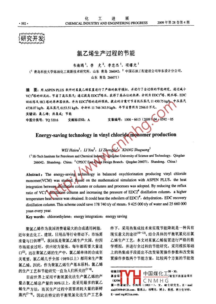 I進(jìn)●592●CHEMICAL INDUSTRY AND ENGINEERING PROGRESS2009年第28卷第4期研究開發(fā)氯乙烯生產(chǎn)過程的節(jié)能韋海鷗',李尤”, 李忠杰',項(xiàng)曙光'('青島科技大學(xué)煉油化工高新技術(shù)研究所,山東青島266042; 2中國石油工程建設(shè)公司華東設(shè)計(jì)分公司,山東青島266071)摘要:用ASPENPLUS軟件對某氯乙烯裝置進(jìn)行了嚴(yán)格的數(shù)學(xué)模擬,并進(jìn)行了全過程的節(jié)能研究。通過減小vcl"塔的回流比,節(jié)省了高壓蒸汽;通過提高EDC2"塔壓,獲得了高品位的熱源,分別為EDC1"塔.脫水塔. EDC回收塔及HCI塔的再沸器供熱,并為EDC2*塔的進(jìn)料預(yù)熱。提出的方案可節(jié)省低壓蒸汽11 450.75 kgh,中壓蒸汽4738.07 kgh,高壓蒸汽6153.51 kgh,冷卻水11 746 343.9kgh,年節(jié)省費(fèi)用為2566.0萬元.關(guān)鍵詞:氯乙烯;熱集成;節(jié)能中圖分類號: TQ 320.6文獻(xiàn)標(biāo)識碼: A文章編號: 1000- 6613 (2009) 04 - 0592 - 05Energy-saving technology in vinyl chloride monomer productionWEI Haiou', U You2, L Zhongjie', XIANG Shuguang'(4 Hi-Tech lnstitute for Petroleum and Chemical Industry, Qingdao University of Science and Technology, Qingdao266042, Shandong, China; 2CPECC East-China Design Branch, Qingdao 266071, Shandong, China)Abstract: The energy-saving technology in balanced oxychlorination producing vinyl chloridemonomer(VCM) was studied. Based on the mahemaical simulation with ASPEN PLUS, the heatintegration between disillation columns or columns and processes was adopted. By reducing the refluxratio of VC1* disillation column and increasing the pressure of EDC2" disillation column,a highertemperature heat source was obtained. It could heat the reboilers of EDCI"', dehydration, EDC recoveryditillation column. This scheme could save 178 740 tly of steam, 9 425 000 tly of water and 25 660000yuan every year.Key words: chloroethylene; energy integration; energy saving聚氯乙烯作為我國消費(fèi)量最大的合成通用樹脂,件下,采用熱集成技術(shù)來實(shí)現(xiàn)節(jié)能降耗是一-種具有近年來在化工、建筑、日用品等行業(yè)帶動下,市場需現(xiàn)實(shí)意 義的途徑!0 131。結(jié)合具體的平衡氧氯化法氯求量與日俱增"。我國雖是聚氯乙烯生產(chǎn)大國,但因乙烯生產(chǎn)工藝,本文對某氯乙烯裝置進(jìn)行嚴(yán)格的數(shù)市場需求過旺,供應(yīng)較為緊張,每年都需要大量進(jìn)學(xué)模擬,并進(jìn)行全過程的節(jié)能研究。采用模擬基礎(chǔ)口2。而在聚氯乙烯的生產(chǎn)中,氯乙烯單體的合成至上的熱集成手段提出不改變裝置操作參數(shù)和改變裝關(guān)重要,氯乙烯幾乎全部(98%以上)都用來生產(chǎn)聚置操作參數(shù)兩個節(jié)能方案,比較兩個方案的節(jié)能效氯乙烯。因此,作為聚氯乙烯生產(chǎn)基本原料,氯乙烯的生產(chǎn)工藝和節(jié)能研究一直為人們所關(guān)注1-61。收稿日-08 -30.目前世界上采用平衡氧氯化法生產(chǎn)氯乙烯的產(chǎn)基金項(xiàng)中國煤化工登開放基金項(xiàng)目量占氯乙烯總產(chǎn)量的90%以上,是采用最多的氯乙MHCNMHG第一作者簡介。書海網(wǎng)(1983-),女,領(lǐng)士研究生。E - mail烯生產(chǎn)方法,而其生產(chǎn)過程中需要消耗大量的新鮮xiali9369b@ 126.com.聯(lián)系人:項(xiàng)曙光,博士,教授。博土生導(dǎo)師。蒸汽[-9。因此在特定的平衡氧氯化法生產(chǎn)工藝條E mail xs21@1a.cmo.第4期韋海鴻等:氯乙烯生產(chǎn)過程的節(jié)能●593●益,進(jìn)而提出最終的節(jié)能方案,以達(dá)到大幅度降低衡。但在氯乙烯裝置中,氧氯化單元涉及大量的氯乙烯裝置能耗的目的。水、氯化氫以及堿液(包括氫氧化鈉等),單純的狀態(tài)方程不能滿足計(jì)算的需要。結(jié)合實(shí)際情況,1氯乙烯裝置的全流程模擬本文選用P-R方法用于裝置全流程的模擬,但在氯乙烯生產(chǎn)裝置主要由真接氯化單元、氧氯化氧氯化單元的部分裝置中采用ELECNRTL方法來單元、二氯乙烷精制單元、二氯乙烷裂解單元和氯預(yù)測液液平衡。.乙烯凈化單元5個工段組成[4。利用流程模擬軟件1.2 模擬值與設(shè)計(jì)數(shù)據(jù)的比較ASPEN PLUS對氯乙烯全裝置的5個工段進(jìn)行嚴(yán)格為了驗(yàn)證模型的正確性,選擇了各單元主要操的數(shù)學(xué)模擬。作參數(shù)的模擬值與設(shè)計(jì)數(shù)據(jù)進(jìn)行比較。這些操作參1.1 物性方法的選擇數(shù)對后續(xù)過程影響較大,結(jié)果見表1~表3。氯乙烯裝置所涉及的組分有乙烷、乙烯、氯從表1~表3中可以看出,模擬的結(jié)果與設(shè)計(jì)氣、氯化氫、二氯乙烷、氯乙烯、水及少量氯丁數(shù)據(jù)基本相符,能夠作為節(jié)能模擬的依據(jù),模擬計(jì)二烯等。根據(jù)對烴類體系的模擬經(jīng)驗(yàn)可知,選用算中所選擇的汽液平衡模型和物性計(jì)算方法能夠基狀態(tài)方程類物性方法能比較準(zhǔn)確的預(yù)測汽液平本準(zhǔn)確的反映氯乙烯裝置的實(shí)際操作情況。表1直接氯化和氧氯化單 元主要操作參數(shù)模擬值與設(shè)計(jì)值比較DC反應(yīng)器反應(yīng)物oc反應(yīng)器反應(yīng)物oC忽冷塔頂oC洗滌塔項(xiàng)組分模擬值設(shè)計(jì)值溫度/C95.0210.03.175.064.665.0壓力(表壓) MPa0.0500.050 .0.0200.1800.160流最tkg.h~'121 729.6121 726.538 729.338 730.037 346.137 350.343 937.1表2二氯乙烷精制單元主要操作參數(shù)模擬值與設(shè)計(jì)值比較脫水塔釜液EDCI'塔釜液EDC2"塔釜液EDC回收塔頂95.595.4101.2100.099.9