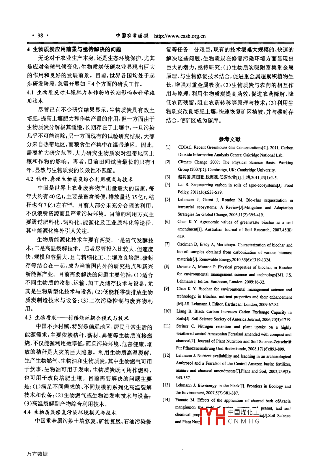 中國學(xué)通搌2013,29(26):93-99Chinese agricultural Science Bulletin生物質(zhì)炭之低碳農(nóng)業(yè)羅煜2,陳敏3,盂海波',趙立欣,李貴桐冫,林啟美2(農(nóng)業(yè)部規(guī)劃設(shè)計(jì)研究院,農(nóng)業(yè)部農(nóng)業(yè)廢棄物能源化利用重點(diǎn)實(shí)驗(yàn)室,北京100122中國農(nóng)業(yè)大學(xué)資源與環(huán)境學(xué)院北京100193:中國農(nóng)業(yè)大學(xué)農(nóng)學(xué)與生物技術(shù)學(xué)院,北京100193)摘要:農(nóng)業(yè)生產(chǎn)過程與全球氣候變化息息相關(guān),如何減少農(nóng)業(yè)溫室氣體排放,并探尋土壤固炭方法已經(jīng)成為當(dāng)前農(nóng)業(yè)與環(huán)境研究中的熱點(diǎn)。旨在摸索一條由生物質(zhì)炭化技術(shù)為基礎(chǔ)的低碳農(nóng)業(yè)發(fā)展的可能途徑。從低碳這一熱點(diǎn)問題出發(fā),對低碳農(nóng)業(yè)的定義、特征、途徑進(jìn)行了基本闡述,同時論述了生物質(zhì)炭的基本特征,及生物質(zhì)炭在應(yīng)用上的農(nóng)學(xué)和環(huán)境學(xué)價(jià)值,并重點(diǎn)討論了如何利用生物質(zhì)炭發(fā)展以低能耗、低排放、低污染為特征的低碳農(nóng)業(yè)的可能模式,最后指出了當(dāng)前生物質(zhì)炭在低碳農(nóng)業(yè)研究和利用方面所面臨的問題和挑戰(zhàn)。關(guān)鍵詞:生物質(zhì)炭;熱裂解;低碳農(nóng)業(yè);土壤固碳;模式中圖分類號:S15文獻(xiàn)標(biāo)志碼:A論文編號:2012-0654The Model of Low C agriculture Based Upon BiocharLuo Yu 2, Chen Min Meng Haibo, Zhao Lixin, Li Guitong, Lin QimeiChinese Academy of Agricultural Engineering, Key Laboratory of energy resource utilization from agriculture residue,Ministry of Agriculture, Beijing 100125'college of Resources and Environmental Sciences, China Agricultural University, Beijing 100093;College of Agriculture and Biotechnology, China Agricultural Uniuersity, Beijing 100193)Abstract: Nowdays, agricultural is closely linked to the global climate changes exploring the way to reduceagricultural greenhouse gas emissions, and sequester soil carbon has become a hot issue in the currentagricultural and environmental research. This paper aims at exploring the possible ways to develop low-carbonagriculture, which is characterized by low energy, low emissions and low pollution, by using biomass pyrolysistechnique. Firstly, the definition, characteristics of low-carbon agriculture is described, and the ways to realizet are also discussed. Secondly, the basic characteristics of biochar, and its value in terms of agriculture andenvironment are discussed. Mostly, the possible modes of biochar integrated system are emphatically discussedin the context of low-carbon agriculture. Finally, the challenges exited nowadays are pointed out.Key words: biochar; pyrolysis; low carbon agriculture; carbon sequestration; mode0引言溫室氣體CO2、CH和N2O濃度,從19世紀(jì)初的自從工業(yè)革命以來由于大量消耗化石燃料、毀林280ppmv、715ppbv和270ppbv提高到目前390pmv開荒和改變土地利用方式等人類活動溫室氣體排放1797ppbv和321.8ppbv。大量的數(shù)據(jù)顯示,近50年量大幅度增加,導(dǎo)致大氣溫室氣體濃度持續(xù)增高,主要來的氣候變化,主要是人為活動排放的CO2、CHNO基金項(xiàng)目:國家自然基金“生物質(zhì)焦改良北京城區(qū)土壤的效果及機(jī)理”41071206)第一作者簡介:羅煜男,1983年出生,湖南岳陽人博士研究方向:生物炭應(yīng)用。通信地址:10025北京朝陽區(qū)麥子店街41號農(nóng)業(yè)部規(guī)劃設(shè)計(jì)研究,Tel:010-65929549,E-mail:luoyu21@163.com.通訊作者:林啟美男,1962年出生湖北武穴人,教授博士生導(dǎo)師博士研究方向:土壤微生物10103北京市海淀區(qū)圓明園西路2號中國農(nóng)業(yè)大學(xué)資源與環(huán)境學(xué)院Tel:010-62732502,E-mail:linq@Dcau.edu.cn中國煤化工收稿日期:20120301,修回日期:2013-0722CNMHG中國農(nóng)學(xué)逼報(bào)hp:/w:casb. org. cn等溫室氣體造成的,到2100年全球平均氣溫將升高全球農(nóng)業(yè)土壤碳庫擴(kuò)充潛力為12~3 I Pg C/a,耕層土1.0-35℃。一旦氣溫升高3℃,大規(guī)模反饋機(jī)制將開始壤有機(jī)碳含量提高1tC·a/hm2,發(fā)展中國家糧食產(chǎn)量年發(fā)揮作用,造成不可逆的氣候變化。因此,節(jié)能減排,增加2400-3200萬t根莖產(chǎn)量年增加600-1000萬t,農(nóng)發(fā)展低碳經(jīng)濟(jì),是實(shí)現(xiàn)全球社會與經(jīng)濟(jì)可持續(xù)發(fā)展的業(yè)的固碳增匯潛力巨大。據(jù)估測全球通過植物生物根本出路量每年固定約120Pg碳,但是,自然條件下,幾乎全部農(nóng)業(yè)是國民經(jīng)濟(jì)的基礎(chǔ)既是重要的溫室氣體來經(jīng)過礦化作用轉(zhuǎn)化為CO2,沒有任何凈固碳作用,這也源之一,也是巨大的碳匯。從原始農(nóng)業(yè)傳統(tǒng)農(nóng)業(yè)到現(xiàn)是現(xiàn)有農(nóng)業(yè)耕作栽培技術(shù)包括秸稈還田施用有機(jī)肥代農(nóng)業(yè),農(nóng)業(yè)的“正碳性”或碳排放量逐漸增強(qiáng)。根據(jù)政料、保護(hù)性耕作等技術(shù)措施,固碳增匯效果比較低且不府間氣候變化專業(yè)委員會(IPC)第4次評估報(bào)告農(nóng)業(yè)穩(wěn)定的根本原因是溫室氣體的第二大重要來源。中國糧食生產(chǎn)年排放近幾年,生物質(zhì)炭農(nóng)業(yè)與環(huán)境應(yīng)用倍受關(guān)注,是國約14億t的CO2C當(dāng)量碳足跡(0780.08)tCa/hm3或內(nèi)外研究熱點(diǎn),不少研究者認(rèn)為是生物質(zhì)炭不僅是廉(0.1001)Ct糧食。除了作物