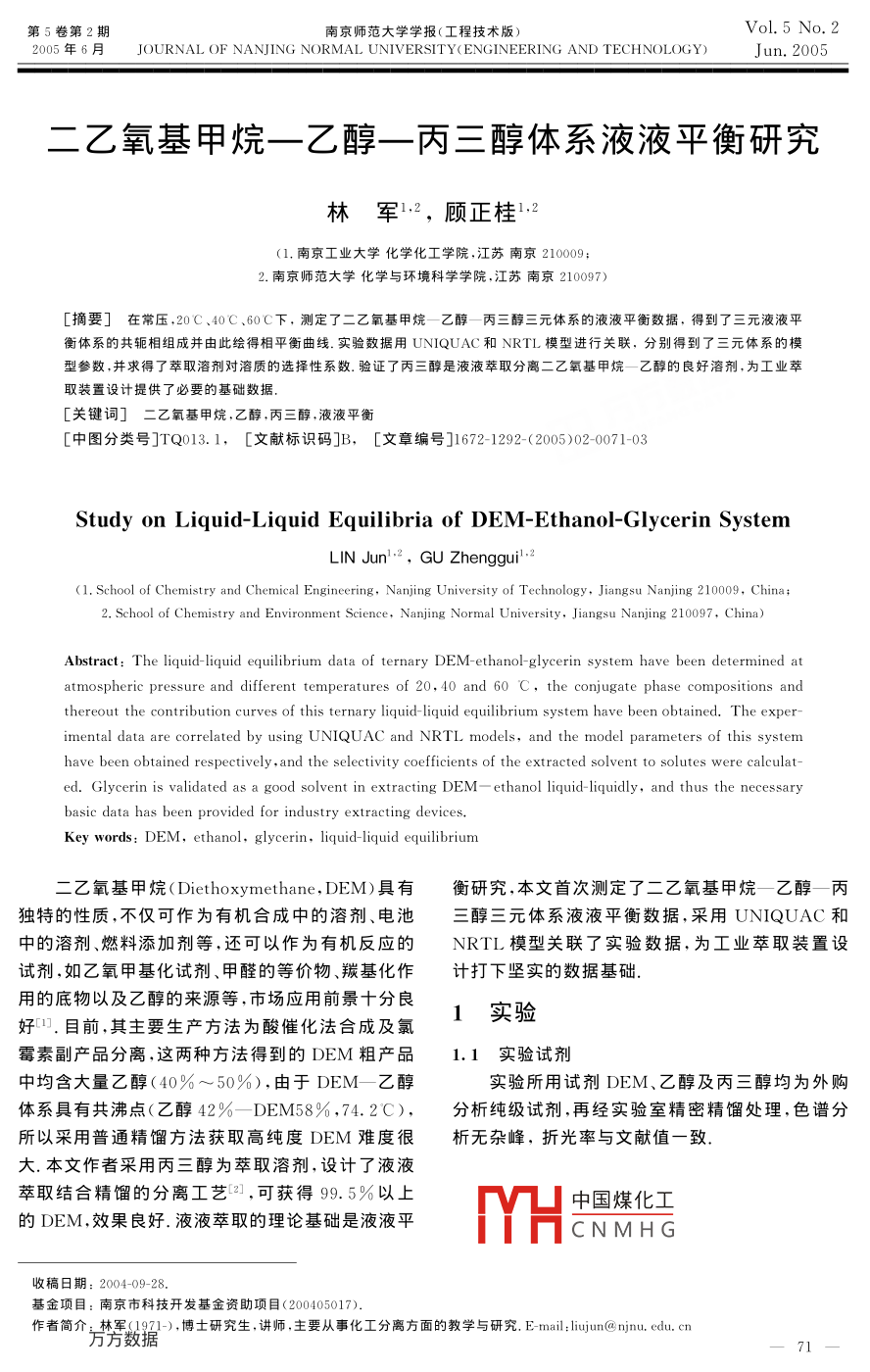 第5卷第2期南京師范大學(xué)學(xué)報(工程技術(shù)版)2005 4F6F JOURNAL OF NANJING NORMAL UNIVERSITY(ENGINEERING AND TECHNOLOGY)Jun.2005二乙氧基甲烷—乙醇一丙三醇體系液液平衡研究林軍1:2,顧正桂12(1,南京工業(yè)大學(xué)化學(xué)化工學(xué)院,江蘇南京210009;2.南京師范大學(xué)化學(xué)與環(huán)境科學(xué)學(xué)院,江蘇南京210097)[摘要]在常壓,20℃、0℃、60℃下,測定了二乙氧基甲烷—乙醇丙三醇三元體系的液液平衡數(shù)據(jù),得到了三元液液平衡體系的共軛相組成并由此繪得相平衡曲線.實驗數(shù)據(jù)用U、IαUAC和NRTL模型進行關(guān)聯(lián),分別得到了三元體系的模型參數(shù),并求得了萃取溶劑對溶質(zhì)旳選擇性系數(shù).驗證了丙三醇是液液萃取分離二乙氧基甲烷—乙醇的良好溶劑,為工業(yè)萃取裝置設(shè)計提供了必要的基礎(chǔ)數(shù)據(jù)關(guān)鍵詞]二乙氧基甲烷,乙醇,丙三醇液液平衡[中圖分類號]TQ013.1,[文獻標識碼]B,[文章編號]1672-1292-(2005)02-0071-03Study on Liquid-Liquid Equilibria of DEM-Ethanol-Glycerin SystemLIN Jun, GU Zhenggui(l School of Chemistry and Chemical Engineering, Nanjing University of Technology, Jiangsu Nanjing 210009, China2. School of Chemistry and Environment Science, Nanjing Normal University, Jiangsu Nanjing 210097, ChiAbstract: The liquid-liquid equilibrium data of ternary DEM-ethanol-glyeerin system have been determined atatmospheric pressure and different temperatures of 20, 40 and 60 C, the conjugate phase compositions andthereout the contribution curves of this ternary liquid-liquid equilibrium system have been obtained. The exper-imental data are correlated by using UNIQUAC and NRTL models, and the model parameters of this systemhave been obtained respectively, and the selectiefficients of the extracted solvent to solutes were calculated. Glycerin is validated as a good solvent in extracting DEM-ethanol liquid-liquidly, and thus the necessarybasic data has been provided for industry extracting devicesKey words DEM, ethanol, glycerin, liquid-liquid equilibriun二乙氧基甲烷( Diethoxymethane,DEM)具有衡研究,本文首次測定了二乙氧基甲烷一乙醇一丙獨特的性質(zhì),不僅可作為有機合成中的溶劑、電池三醇三元體系液液平衡數(shù)據(jù),采用 UNIQUAC和中旳溶劑、燃料添加劑等,還可以作為有機反應(yīng)的NRTL模型關(guān)聯(lián)了實驗數(shù)據(jù),為工業(yè)萃取裝置設(shè)試劑如乙氧甲基化試劑、甲醛的等價物、羰基化作計打下堅實的數(shù)據(jù)基礎(chǔ)用的底物以及乙醇的來源等,市場應(yīng)用前景十分良好.目前其主要生產(chǎn)方法為酸催化法合成及氯1實驗霉素副產(chǎn)品分離,這兩種方法得到的DEM粗產(chǎn)品1.1實驗試劑中均含大量乙醇(40%~50%),由于DEM乙醇實驗所用試劑DEM、乙醇及丙三醇均為外購體系具有共沸點(乙醇42%—DEM58%,74.2℃),分析純級試劑,再經(jīng)實驗室精密精餾處理,色譜分所以采用普通精餾方法獲取高純度DEM難度很析無雜峰,折光率與文獻值一致.大.本文作者采用丙三醇為萃取溶劑,設(shè)計了液液萃取結(jié)合精餾的分離工藝,可獲得99.5%以上中國煤化工的DEM,效果良好.液液萃取的理論基礎(chǔ)是液液平CNMHG收稿日期:2004-09-基金項目:南京市科技開發(fā)基金資助項目(200405017)作者簡介:林軍(1971-),博士研究生,講師,主要從事化工分離方面的教學(xué)與研究,E-mail:iuun@ninu.,edu.cn南京師范大學(xué)學(xué)報(工程技術(shù)版)第5卷第2期(2005年)表1實驗試劑圖2、圖3、圖4中橫坐標xs為丙三醇(萃取溶試劑沸點/℃20℃時密度(g/cm3)劑)物質(zhì)的量分數(shù),縱坐標x,為被萃取物乙醇的物DEM質(zhì)的量分數(shù).由圖2、圖3、圖4可知,隨著溫度的上乙醇78,30.78021.2619升,兩相區(qū)略有縮小,故低溫有利于萃取操作,但考268.4慮到溫度下降,丙三醇黏度增加,不利于實際生產(chǎn),1.2實驗儀器及裝置因此,適宜的萃取操作溫度為40C左右實驗所用的儀器見表表2萃取試驗所用儀器儀器名稱用途生產(chǎn)廠家液液平衡釜萃取試驗?zāi)暇┐髮W(xué)玻璃儀器廠CS501型超級恒溫水浴南通實驗儀器廠sP-6800型氣相色譜儀數(shù)據(jù)測定山東魯南化工儀器廠SSC—992型色譜數(shù)據(jù)處理器數(shù)據(jù)處理山東魯南化工儀器廠K-SF分析儀數(shù)據(jù)測定江蘇省化工研究所060.8本實驗使用圖1所示液液平衡釜3對DEM圖220CDEM-乙醇丙三醇體系液液平衡曲線乙醇_丙三醇體系進行液液平衡數(shù)據(jù)測定,使用S501型超級恒溫水浴控溫.冷凝管04平衡裝置0.2040.8磁力圖340℃DEM-乙醇丙三醇體系液液平衡曲線攪拌裝置恒溫水浴0.4圖1實驗裝置1.3分析方法本實驗分析儀器采用SP6800型氣相色譜儀(熱導(dǎo))數(shù)據(jù)由SC-962型色譜數(shù)據(jù)處理機處理,氣相色譜儀中使用6201型擔(dān)體,固定液為丙三醇.2SP6800型氣相色譜儀參數(shù)如下:熱導(dǎo)INJ圖460DEM乙醇一兩三醇體系液液平衡曲線(C)130; OVen(C)80; CURR(A) 120; RUXI(C)1102.2液液平衡數(shù)據(jù)的關(guān)聯(lián)本文作者選用適宜于兩液相體系、并由局部物2實驗結(jié)果及討論質(zhì)的量分數(shù)概念導(dǎo)出的 UNIQUAC和NRTL模2.1液液平衡數(shù)據(jù)的測定型對40℃液液平衡數(shù)據(jù)進行了關(guān)聯(lián).前者用單在液液平衡釜中加入不同量的DEM、乙醇及純形替換法,后者用雙因素輪換法目標函數(shù)F由丙三醇控制水浴溫度,攪拌1h靜置1h,分取上下式計算下層進行色譜分析.上層為DEM相(萃余相);下F=∑∑|xy-x"y”|/( NPXN