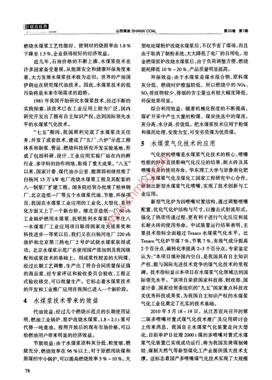 30卷第7期Vol 30 NO. 72010年7月山西煤炭 SHANXI COALJu.2010文章編號(hào):1672-5050(2010)07-0077-03水煤漿氣化技術(shù)將掀起新能源發(fā)展浪潮李煥宇,梁霏飛,史曉軍(中國(guó)礦業(yè)大學(xué)江蘇徐州221008)摘要:水煤漿是近年來(lái)發(fā)展迅速的一種以煤代油的新型燃料,它不僅有煤的燃燒特性,而且類(lèi)似重油的液態(tài)燃燒屬于新型煤基流體潔凈環(huán)保燃料。本文簡(jiǎn)單介紹了水煤漿技術(shù)及其突岀優(yōu)點(diǎn),闡迷了國(guó)內(nèi)外水煤漿氣化技術(shù)的研發(fā)狀況與水煤漿技術(shù)帶來(lái)的效益,提出了應(yīng)用水煤漿技術(shù)的意見(jiàn),對(duì)發(fā)展我國(guó)經(jīng)濟(jì)和保障國(guó)家能源安全具有重要意義關(guān)鍵詞:水煤漿;氣化;發(fā)展中圖分類(lèi)號(hào):TD8239文獻(xiàn)標(biāo)識(shí)碼:A1引言3國(guó)內(nèi)外水煤漿氣化技術(shù)的發(fā)展我國(guó)是以煤炭為主要能源的國(guó)家,煤炭資源量石油危機(jī)之后,世界發(fā)達(dá)國(guó)家投人了大量的人占我國(guó)化石能源95%以上。在新能源沒(méi)有大量發(fā)力物力、財(cái)力來(lái)尋找替代油的原料,他們對(duì)水煤漿現(xiàn)和使用前,為了保障煤炭長(zhǎng)期有效的供應(yīng),堅(jiān)持科進(jìn)行了研究開(kāi)發(fā)利用。現(xiàn)在,許多國(guó)家都建成了學(xué)發(fā)展觀(guān),大力發(fā)展?jié)崈裘杭夹g(shù),高效清潔的利用煤大批水煤漿廠(chǎng),主要用于發(fā)電。目前,世界主要發(fā)達(dá)炭資源這不僅促進(jìn)能源與環(huán)境的協(xié)調(diào)發(fā)展,也是保國(guó)家已經(jīng)商業(yè)化的IGCC大型電站,均采用氣流床障國(guó)家能源安全和有效供給、滿(mǎn)足國(guó)民經(jīng)濟(jì)發(fā)展的技術(shù),最具有代表性的是以干煤粉為原料的 Shell客觀(guān)要求。改變了煤的傳統(tǒng)燃燒方式,顯示出了巨大氣化技術(shù)和以水煤漿為原料的 Texaco氣化技術(shù)。的環(huán)保節(jié)能優(yōu)勢(shì)。近幾年來(lái),采用廢物資源化的技術(shù)She'氣化技術(shù)的主要優(yōu)勢(shì)是碳轉(zhuǎn)化率高,冷煤氣效路線(xiàn)后,研制成功的環(huán)保水煤漿,可以在不增加費(fèi)用率高。在我國(guó),Shel氣化技術(shù)已投入生產(chǎn)運(yùn)行并取的前提下,大大提高了水煤漿的環(huán)保效益。在我國(guó)豐得了良好的經(jīng)濟(jì)效益和社會(huì)效益。富煤炭資源的保障下,水煤漿也已成為替代油、氣等美國(guó)1979年起開(kāi)始對(duì)水煤漿燃料進(jìn)行開(kāi)發(fā)利能源的最基礎(chǔ)、最經(jīng)濟(jì)的潔凈能源。用,匹茨堡能源研究中心附近的電廠(chǎng)鍋爐用的就是水煤漿技術(shù)概況水煤漿燃料。世界上最大的水煤漿制備一管輸一發(fā)電工程于1988年在俄羅斯建成。日本在小名濱建水煤漿技術(shù)是20世紀(jì)η0年代世界石油能源危成500k如a水煤漿廠(chǎng),通過(guò)9km管道供給應(yīng)用規(guī)模機(jī)中發(fā)展起來(lái)的一項(xiàng)高新技術(shù),它實(shí)際上是一個(gè)由大的東京勿來(lái)電站4號(hào)機(jī)組鍋爐和8號(hào)機(jī)組鍋爐煤炭洗選-磨礦成漿-裝貯運(yùn)鍋爐燃燒到爐后環(huán)燃用水煤漿。我國(guó)桂林鋼廠(chǎng)用水煤漿代煤粉燃燒,保除塵的大型系統(tǒng)工程。由于其原料豐富、加工簡(jiǎn)折合標(biāo)準(zhǔn)煤約為90kgt,節(jié)煤3%,煙塵排放由732單、成本低,污染低、效率高、運(yùn)輸方便、可替代石油降至240mg/m致癌的NOx含量由2808降至44等綜合優(yōu)勢(shì),引起世界各國(guó)工業(yè)界的普遍關(guān)注。mg/m3,使環(huán)境和勞動(dòng)條件得到明顯改善。此外,由于收稿日期:2010-05-10基金項(xiàng)目:江蘇普通高校研究生科研創(chuàng)新計(jì)劃資助項(xiàng)目(CX08B121Z)作者簡(jiǎn)介:李煥字(1988—),女,山西忻州人,本科在讀化學(xué)工程與工藝專(zhuān)業(yè)。Ⅲ綜合應(yīng)用.caton山西煤炭 SHANXI COAL第30卷第7期燃燒水煤漿工藝性能好,使鋼材的燒損率由1.8%型電站煤粉爐改燒水煤漿后,不僅節(jié)省了煤場(chǎng),而且下降至15%,企業(yè)獲得較好的經(jīng)濟(jì)效益。由于取消了制粉系統(tǒng),大大降低了電廠(chǎng)的自用電。冶近幾年,石油價(jià)格的不斷上漲,水煤漿技術(shù)在金燃煤窯爐改燒水煤漿后,由于負(fù)荷調(diào)整方便燃燒許多國(guó)家備受重視,從能源安全和健康環(huán)保角度來(lái)能耗降低10%~20%,產(chǎn)品質(zhì)量明顯提高。看,大力發(fā)展水煤漿技術(shù)極為迫切。世界的產(chǎn)油國(guó)環(huán)保效益:由于水煤漿是煤水混合物,原料煤伊朗也在研究煤代油技術(shù)。因此,水煤漿技術(shù)的低灰分低,燃燒時(shí)爐膛溫較低,所以燃燒中的NOx污染將是未來(lái)市場(chǎng)需求的趨勢(shì)。SO2排放物較少,排煙的含塵量也有較大幅度降低,1981年我國(guó)開(kāi)始研究水煤漿技術(shù),經(jīng)過(guò)不斷的環(huán)保效果明顯。實(shí)踐探索,該技術(shù)已在工業(yè)應(yīng)用上較為廣泛,國(guó)內(nèi)綜合利用效益:隨著機(jī)械化程度的不斷提高,研究開(kāi)發(fā)出了擁有自主知識(shí)產(chǎn)權(quán),達(dá)到國(guó)際領(lǐng)先水煤礦開(kāi)釆中產(chǎn)生大量的粉煤,煤炭洗選中的煤泥,平的水煤漿氣化技術(shù)。灰分高、水分高、價(jià)值低。把水煤漿技術(shù)應(yīng)用于粉煤“七五”