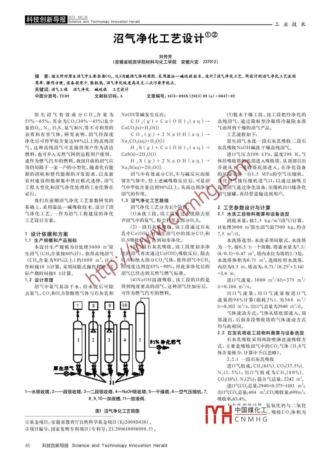 科技創(chuàng)新導(dǎo)報(bào)3No.25Science and Technology Innov工業(yè)技術(shù)沼氣凈化工藝設(shè)計(jì)0②劉傳芳安徽省皖西學(xué)院材料與化工學(xué)院安徽六安237012摘要:該文針對原生沼氣中主要雜質(zhì)CO2、且S為酸性氣體的原因,采用濕法一堿囁收技術(shù),設(shè)計(jì)了沼氣凈化工藝。所設(shè)計(jì)的沼氣凈化工藝流程簡單、操作方便、設(shè)備投資少、能耗低、沼氣凈化鈍度高及無二次污染等優(yōu)點(diǎn)關(guān)鍵詞:沼氣工程沼氣凈化堿吸收工藝設(shè)計(jì)中圖分類號(hào):TE09文獻(xiàn)標(biāo)識(shí)碼:A文章編號(hào):1674-098X(2013)09(a)-0047-02原生沼氣有效成分CH4含量為NaOH等堿發(fā)生反應(yīng)5)脫水干燥工段。該工段把經(jīng)凈化的55%-65%,其余為CO2(30%-45%及少CO2(g)+Ca(OH):(aq)→高純沼氣,通過篩板型冷凝塔冷凝除水蒸量的O2、N2、H2S、氨氣和N2等不可利用的CaCO3(s)+H2O(1)氣而得到干燥的沼氣產(chǎn)品雜質(zhì)和有害氣體。研究表明,沼氣經(jīng)深度CO2(g)+2NaOH(aq)→工藝流程如下:凈化后可得甲烷含量達(dá)90%以上的高純沼Na2CO3(aq)+H2O()原生沼氣水洗一段石灰乳吸收二段石氣。這種高純沼氣可直接供用戶作為清潔H2S(g)+Ca(OH)2(aq)→灰乳吸收NaOH堿洗干燥高純沼氣燃料,也可并入天然氣網(wǎng)供遠(yuǎn)程用戶使用,CaS(s)+2H2O()進(jìn)口氣壓力100kPa,溫度298K。氣或作為燃?xì)馄嚨娜剂?。我國目前的沼氣?yīng)H2S(g)+2NaoH(aq)→體經(jīng)吸收塔的底部進(jìn)入吸收塔,從頂部引出用仍局限于一家一戶的小型化。隨著化石能Na2S(aq)+2H2O(1)并就從下一吸收塔底部進(jìn)入。在凈化設(shè)備源的消耗和替代能源的開發(fā)需求,以及新沼氣中有效成分CH4不與堿反應(yīng)而保的尾端安裝一臺(tái)1.5MPa的空氣壓縮機(jī)農(nóng)村建設(shè)的能源集中供應(yīng)模式選擇,沼氣留在氣體中。經(jīng)上述堿吸收反應(yīng)后,可是沼凈化沼氣接壓縮機(jī)進(jìn)氣口,以通過抽吸力工程大型化和沼氣凈化處理的工業(yè)化勢在氣中甲烷含量達(dá)到90%以上,從而達(dá)到凈化促使沼氣通過凈化設(shè)備,壓縮機(jī)出口接凈化必行。沼氣的作用沼氣儲(chǔ)罐,再經(jīng)管道輸送到用戶。我們在前期沼氣凈化工藝參數(shù)研究的1.3沼氣凈化工藝路線基礎(chǔ)上,采用濕法一堿吸收技術(shù),設(shè)計(jì)了沼沼氣凈化工藝分為五個(gè)2工藝參數(shù)設(shè)計(jì)與計(jì)算氣凈化工藝。一作為沼氣工程建設(shè)的凈化(1)水洗工段。該工段通過水洗除去原2.1水洗工段物料衡算和設(shè)備選型工藝設(shè)計(jì)方案。聲沼氣中的氨氣、粉塵科里及部分H2S。消耗水量:按2.5kg/m(沼氣)計(jì)算(2)一段石灰乳吸收。該工段通過石灰日處理3000m原生沼氣需7500kg,約合1設(shè)計(jì)依據(jù)和方案乳中Ca(OH)2對原生沼氣中的部分CO2和7.5m3/d1.1生產(chǎn)規(guī)模和產(chǎn)品指標(biāo)H2S吸收反應(yīng),達(dá)到初步凈化水洗塔選型:水洗采用間歇式,水洗塔本設(shè)計(jì)生產(chǎn)規(guī)模為日處理3000m原(3)二段石灰乳吸收。該工段使初步凈為一個(gè)。按0.5h一個(gè)周期,塔盛水量為7.5/生沼氣(CH4含量按60%計(jì)),獲得高純沼氣化的沼氣再次通過Ca(OH)2吸收反應(yīng),除去(8/0.5)=0.47m3。塔內(nèi)水位為塔的2(CH含量為90%以上)約1800m3,日工H2S和絕大部分℃O2氣體,使得沼氣中CH4水洗塔體積為0.71m3。選圓柱形水洗塔,作時(shí)按10h計(jì)算,采用間歇式操作程序,實(shí)的純度達(dá)到近85%-90%。經(jīng)此步凈化后的內(nèi)徑為0.5m,塔高為:0.71/(0.252×3.14際產(chǎn)期時(shí)間按8h計(jì)算氣已經(jīng)達(dá)到天然氣燃?xì)鈽?biāo)準(zhǔn)3.6m。2設(shè)計(jì)原理(4)NaOH溶液吸收。該工段的目的是進(jìn)口氣流量:3000m3/8h=375m3/沼氣中氨氣易溶于水,經(jīng)水洗后可除得到純度更高的沼氣,這種沼氣經(jīng)加壓后,h=0.104m3/s去氨氣。CO2和H2S等酸性氣體與石灰乳和可作為燃?xì)馄嚨娜剂?。出口氣流?出口氣流量按進(jìn)口氣流量的98%計(jì)算(損耗2%),為368m3/h=0.102m3/s,出口氣總量為2940m3/d氣體流動(dòng)方式:氣體從塔底部流入,頂部流出,后面各段吸收塔的氣體流動(dòng)方式均與此相同。2.2石灰乳吸收工段物料衡算與設(shè)備選型595%化霜?dú)馐胰槲詹捎脙啥螄娏苣媪魑辗绞?主要是吸收沼氣中的CO2氣體(H2S氣體含量極少,計(jì)算中予以忽略)段石灰乳吸收生氣口氣組成:CH4(61%)、CO2(37.5N2(1.5%);出口氣組成為CH4(80%)CO2(18%)、N2(2%);混合氣總量:2242m3進(jìn)口氣CO2總量:2940×0.375=11031—水吸收塔;2—-段吸收塔;3一二段吸收塔:4-NaOH吸收塔;5—干燥塔;6一空氣壓縮機(jī);7、出口氣CO2總量:404m3,CO2吸收量:699π8、9、10—加液槽;11一放液閥.吸收率:63.4%氫氧化鈣與二氧化圖1沼氣凈化工藝簡圖中國煤化工,吸收CO,體積為①基金項(xiàng)目:安徽省教育廳自然科學(xué)基金項(xiàng)目(K2009B038)。CNMHG②項(xiàng)目編號(hào):國家發(fā)明專利項(xiàng)目(專利號(hào):ZL200610096998.5)46科技創(chuàng)新導(dǎo)報(bào) Science and Technology Innovation herald工業(yè)技術(shù)Science and T3a科技創(chuàng)新導(dǎo)報(bào)699m3,n(CO2)≈28213mol,根據(jù)反應(yīng)2收塔總體積為4.93×3/2/16=斜塔板冷凝器技術(shù)。原理為:將凈化后的高式Ca(OH)2+CO2=CaCO3+H2O,需消耗0.46m3,取內(nèi)徑為0.4m,塔高為0.46/純沼氣從干燥塔底部通入塔內(nèi),高純沼氣與CaO的摩爾數(shù)為n(CaO)=28213/0.8=(0.22×3.14)=3.66m
