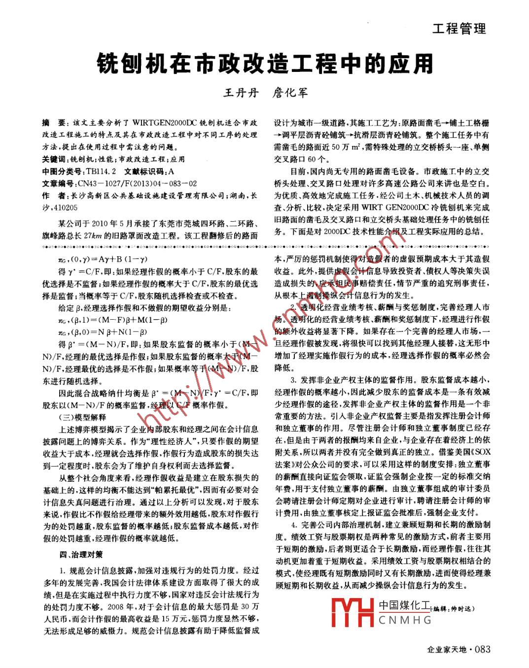 工程管理銑刨機在市政改造工程中的應(yīng)用王丹丹詹化軍摘要:該文主要分析了 WIRTGEN2000DC銑刨機適合市政設(shè)計為城市一級道路,其施工工藝為:原路面鑿毛→鋪土工格柵改造工程施工的特點及其在市政改造工程中對不同工序的處理→調(diào)平層瀝青砼鋪筑→抗滑層瀝青砼鋪筑。整個施工任務(wù)中有方法,提出在使用過程中需注意的問題。需鑿毛的路面近50萬m2,需特殊處理的立交橋橋頭一座、單側(cè)關(guān)鍵詞:銑刨機;性能;市政改造工程;應(yīng)用交叉路口60個中圖分類號:TB114.2文獻標(biāo)識碼:A目前,國內(nèi)尚無專用的路面鑿毛設(shè)備。市政施工中的立交文章編號:CN43-1027/F(2013)04-083-02橋頭處理、交叉路口處理對許多高速公路公司來講也是空白作者:長沙高新區(qū)公共基礎(chǔ)設(shè)施建設(shè)管理有限公司;湖南,長為優(yōu)質(zhì)、高效地完成施工任務(wù),經(jīng)公司土木、機械技術(shù)人員的調(diào)少,410205查、分析、比較決定采用 WIRT GEN2000C冷銑刨機來完成某公司于2010年5月承接了東莞市莞城四環(huán)路、二環(huán)路、舊路面的鑿毛及交叉路口和立交橋頭基礎(chǔ)處理任務(wù)中的銑刨任旗峰路總長27km的舊路罩面改造工程。該工程翻修后的路面務(wù)。下面是對200C技術(shù)性能介紹及工程實際應(yīng)用的總結(jié)?!?。3心·。◆心·:2◆⊙魯⊙:魯日魯0命·D公魯⊙C心●CD心◆口寺口⊙心0口⊙◆心心日⊙魯⊙仿專心⊙口心心心命⊙⊙0心◆0。)2心章0◆0)魯0心●?口?●0rG,(0,Y)=Ay+B(1-y)本,嚴厲的懲罰機制使得對造假者的虛假預(yù)期成本大于其造假得Y=C/F即:如果經(jīng)理作假的概率小于C/F,股東的最收益。此外,提供虛假會計信息導(dǎo)致投資者債權(quán)人等決策失誤優(yōu)選擇是不監(jiān)督;如果經(jīng)理作假的概率大于C/F股東的最優(yōu)選造成損失的,應(yīng)承擔(dān)民事賠償責(zé)任情節(jié)嚴重的追究刑事責(zé)任,擇是監(jiān)督;當(dāng)概率等于C/F,股東隨機選擇檢查或不檢查從根本上遏制操縱會計信息行為的發(fā)生。給定經(jīng)理選擇作假和不做假的期望收益分別是:透明化經(jīng)營業(yè)績考核、薪酬與獎懲制度,完善經(jīng)理人市π,(B,1)=(M一F)+M(1-)場。透明化的經(jīng)營業(yè)績考核、薪酬和獎懲制度下,經(jīng)理進行作假(B,0)=NB+N(1-B)的額外收益將顯著下降。如果存在一個完善的經(jīng)理人市場得B=(M-N)/F,即:如果股東監(jiān)督的概率小于(M-旦經(jīng)理作假被發(fā)現(xiàn)將很快可以找到其他經(jīng)理人接替,這無形中N)/F,經(jīng)理的最優(yōu)選擇是作假;如果股東監(jiān)督的概率大于(M-增加了經(jīng)理實施作假行為的成本經(jīng)理選擇作假的概率必然會N)/F,經(jīng)理最優(yōu)的選擇是不作假;如果概率等于(M-N)/F,股降低。東進行隨機選擇3.發(fā)揮非企業(yè)產(chǎn)權(quán)主體的監(jiān)督作用。股東監(jiān)督成本越小,因此混合戰(zhàn)略納什均衡是p=(M-N)/F,y=C/F,即經(jīng)理作假的概率越小,因此減少股東的監(jiān)督成本是一條有效減股東以(MN)/F的概率監(jiān)督,經(jīng)理以C/F概率作假。少經(jīng)理作假的途徑,發(fā)揮非企業(yè)產(chǎn)權(quán)主體的監(jiān)督作用是一個非(三)模型解釋常重要的方法。引入非企業(yè)產(chǎn)權(quán)監(jiān)督主要是指發(fā)揮注冊會計師上述博弈模型揭示了企業(yè)內(nèi)部股東和經(jīng)理之間在會計信息和獨立董事的作用。盡管注冊會計師和獨立董事制度已經(jīng)存披露問題上的博弈關(guān)系。作為“理性經(jīng)濟人”,只要作假的期望在,但是由于兩者的報酬均來自企業(yè),與企業(yè)存在著經(jīng)濟上的依收益大于成本,經(jīng)理就會選擇作假作假行為造成股東的損失達附關(guān)系,所以兩者并沒有完全做到真正的獨立。借鑒美國《SO到一定程度時,股東會為了維護自身權(quán)利而去選擇監(jiān)督法案》對公眾公司的要求,可以采用這樣的制度安排:獨立董事從整個社會角度來看,經(jīng)理作假收益是建立在股東損失的的薪酬直接向證監(jiān)會領(lǐng)取,證監(jiān)會強制企業(yè)按一定的標(biāo)準(zhǔn)交納基礎(chǔ)上的這樣的均衡不能達到“帕累托最優(yōu)”,因而有必要對會年費,用于支付獨立董事的薪酬。由獨立董事組成的審計委員計信息失真問題進行治理。通過以上分析可以發(fā)現(xiàn)對于股東會聘請注冊會計師定期對企業(yè)進行審計,聘請注冊會計師的審來說作假比不作假給經(jīng)理帶來的額外效用越低股東對作假行計費用,由獨立董事核定上報證監(jiān)會批準(zhǔn)后強制企業(yè)支付為的處罰越重股東監(jiān)督的概率越低;股東監(jiān)督成本越低,對作4.完善公司內(nèi)部治理機制建立兼顧短期和長期的激勵制假的處罰越重,經(jīng)理作假的概率就越低。度。績效工資與股票期權(quán)是兩種常見的激勵方式,前者主要用四、治理對策于短期的激勵,后者則更適合于長期激勵,而經(jīng)理作假,往往其動機更加著重于短期收益。采用績效工資與股票期權(quán)相結(jié)合的1.規(guī)范會計信息披露加強對違規(guī)行為的處罰力度。經(jīng)過模式使經(jīng)理既有短期激勵同時又有長期激勵進而使得經(jīng)理兼多年的發(fā)展完善我國會計法律體系建設(shè)方面取得了很大的成顧短期和長期收益,從而減少操縱會計信