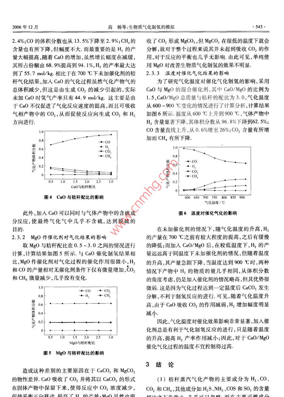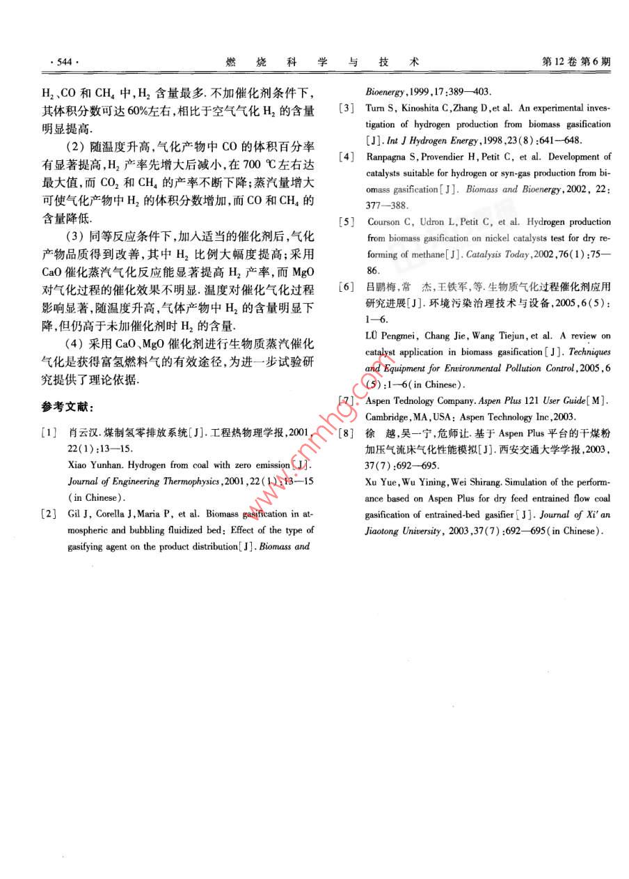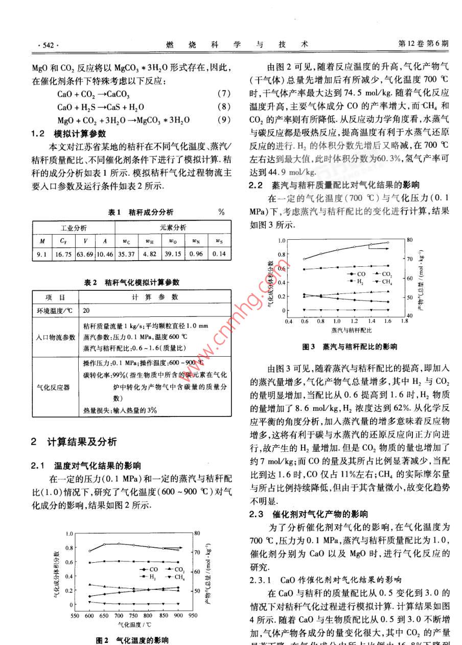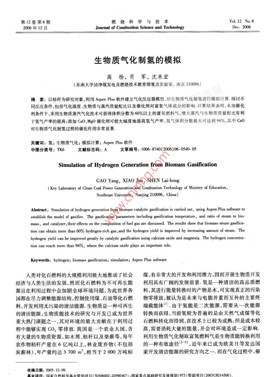 第12卷第6期燃燒科學與技術Vol.12 No.62006年12月Jourmal of Combustion Science and TechnologyDec. 2006生物質氣化制氫的模擬高楊,肖軍,沈來宏(東南大學潔凈煤發(fā)電及燃燒技術教育部重點實驗室,南京210096)摘要:以秸稈為研究對象,利用Aspen Plus軟件建立氣化反應器模型,對生物質氣化制氫進行模擬計算.探討不同反應條件,包括氣化溫度、生物質與蒸汽質量配比以及催化劑對富氫氣體成分的影響.計算結果表明,未加催化劑條件下,采用生物質蒸汽氣化技術可獲得體積分數為60%以上的富氫燃料氣,增大蒸汽與生物質質量配比有利于氫氣產率的提高;添加CaO、MgO催化劑可較大幅度地提高氫氣產率,氫氣體積分數最大可達到94%,其中CaO對生物質氣化制氫過程的催化作用非常顯著.關鍵詞:氫;生物質氣化;模擬計算; Aspen Plus軟件中圖分類號: TK6文獻標志碼: A文章編號: 1006- 8740(2006 )06- 0540- 05Simulation of Hydrogen Generation from Biomass GasificationGAO Yang, XIAO Jun, SHEN Iai-hong( Key laboratory of Clean Coal Power Generation and Combustion Technology of Ministry of Education,Southeast University, Nanjing 210096, China)Abstract : Simulation of hydrogen generation from biomass catalytic gasification is carried out, using Aspen Plus software toestablish the model of gasifier. The gasifcation parameters including gasification temperature, and ratio of steam to bio-mass, and catalyzer ,their efects on the composition of fuel gas are discussed. The results show that biomass steam gasifica-tion can obtain more than 60% hydrogen -rich gas , and the bhydrogen yield is improved by increasing amount of steam. Thehydrogen yield can be improved greatly by catalytic gasification using calcium oxide and magnesia. The hydrogen concentra-tion can reach more than 94%, where the calcium oxide plays an important role.Keywords: hydrogen; biomass gasification; simulation; Aspen Plus software人類對化石燃料的大規(guī)模利用極大地推動了社會煤,有非常大的開發(fā)和利用潛力,因而開展生物質開發(fā)經濟與人類生活的發(fā)展,然而化石燃料為不可再生能利用具有廣闊的發(fā)展前景.氫是--種清潔的高品質燃源且在利用過程中會加劇全球環(huán)境問題,為此世界各料,其進行能量轉換時的產物是水,可實現真正的污染國都在盡力調整能源結構,控制使用煤、石油等化石燃物零排放,被認為是未來與電能并重而互補的主要終料,開發(fā)利用無污染的清潔能源.生物質是- -種可再生端載能體.由于氫能是二次能源,需要從一次能源的清潔能源,生物質能技術的研究與開發(fā)已成為世界轉換而獲得,當前氫較為普遍的是由天然氣或煤等化重大熱門課題之- -,其對環(huán)境的最大貢獻在于利用過石燃料轉化而得到,在技術上已較為成熟,但是成本較程中能夠實現CO2零排放.我國是一一個農業(yè)大國,含高,需要消耗大量的能量,并會對環(huán)境造成一定影響.有大量的生物質資源,如木屑、秸稈以及柴薪等,每年利用生物質氣化制取富氫燃料氣是生物質能轉換利用農作物秸稈產量在6億噸以上,林業(yè)廢棄物(不包括的一-種有效途徑[2-5],近年來已成為歐美日等發(fā)達國炭薪林),年產量約達3700m3,相當于2000萬噸標家開發(fā)清潔能源的研究方向之一.而在氣化過程中,催收稿日期: 2005- 12-09.發(fā)展規(guī)劃(973)資助項目( 2003CB214500).2006年12月高楊等:生物質氣化制氫的模擬化劑的使用對提升燃氣質量的作用也引起了研究者們H、O、N和S,包含的組分有:C0、H2、CO2、CH4、H20、的廣泛關注(6].生物質熱解氣化制氫過程中,催化劑N2、H2S、NH,、COS. SO2、C(固體)、S,共12個,反應器主要有3個作用:①降低熱解催化反應溫度;②減少氣內達到化學反應平衡時,體系的Gibbs自由能達到極化介質(如水蒸氣)的消耗;③可以進行定向催化裂小值.解,促進反應的進行,得到更多的H2.-ODECOMP°o [QAsS]9》常規(guī)生物質氣化通常采用空氣為氣化劑.氣化產物熱值低,氫含量少,為了提高氫氣產率,本文以蒸汽GASIFIER為氣化劑,秸稈作為生物質原料,并選用適當的催化劑-BIOMASS ]-DECOMP|OMI-BIOMASS2-RGIBBS-OUTPU-→進行氣化模擬研究.利用Aspen Plus工具軟件建立氣L RYIELD J化爐模型并進行模擬計算,探討了不同反應條件(包STEAM括氣化溫度、蒸汽與秸稈質量配比以及催化劑等)對QLOsS氣化成分的影響,為今后開展生物質催化氣化制氫試圖1氣化過程模擬驗提供了理論依據.模擬過程4個物流流股為進人系統的生物質原料1生物 質蒸汽氣化模型BIOMASS ,經過熱分解后的產物BIOMASS2,進入系統的過熱蒸汽STEAM和最終氣化產物OUTPUT;其中1.1 Aspen Plus氣化模型的建立基于AspenPlus12.1軟件平臺,對生物質蒸汽氣BIOMASS物流定義為BIOMASS(生物質)、ASH(灰化制氫過程以及催化劑對生物質氣化制氫的影響開展渣)和UBC(未燃盡碳)3種非常規(guī)組分,物流BIO-了詳細的研究[”引。根據AspenPlus模擬處理過程的MASS2則包括純元素C.純元素S、H2 N, ,02、ASH和UBC,輸出的OUTPUT物流定義為氣化產物氣、ASH應用特點,對本模型的建立作了以下假設:(1)氣化反應器穩(wěn)定運行且其中發(fā)生的反應都能和UBC,其中氣化產物氣包括CO、H2、CO2、CH,、H20、N2、H2S、NH,、COS、SO2等氣體成分.3個熱流流股則達到化學平衡;分別表示為裂解熱QDECOMP、氣化模塊所需熱量(2)氣化反應器內不考慮壓力損失;(3)生物質中的灰分為惰性組分,不參與氣化過QGASI和氣化過程的熱損失QLOSS.CASIFIER反應器中考慮的主要氣化反應過程程的反應;(4)氣化產物中氣體成分考慮C0、H2、CO2、CH