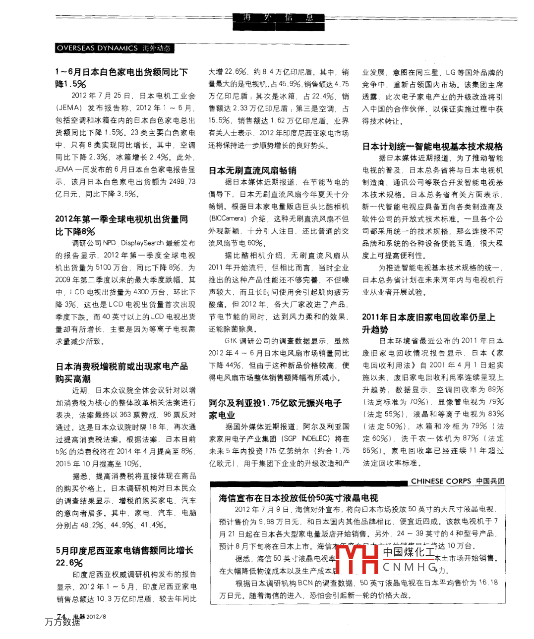 OVERSEAS DYNAMICS海外動(dòng)1-6月日本白色家電出貨額同比下大增22.6%,約84萬(wàn)億印尼盾.其中,銷(xiāo)業(yè)發(fā)展.意圖在同三星,LG等國(guó)外品牌的降1.5%量最大的是電視機(jī)占459%銷(xiāo)售額達(dá)4.75競(jìng)爭(zhēng)中.重新占領(lǐng)國(guó)內(nèi)市場(chǎng)。該集團(tuán)主席2012年7月25日,日本電機(jī)工業(yè)會(huì)萬(wàn)億印尼盾:其次是冰箱.占224%6,銷(xiāo)透露,此次電子家電產(chǎn)業(yè)的升級(jí)改造將引EMA)發(fā)布報(bào)告稱(chēng),2012年1~6月,售額達(dá)2.33萬(wàn)億印尼盾;第三是空調(diào),占入中國(guó)的合作伙伴,以保證實(shí)施過(guò)程中獲包括空調(diào)和冰箱在內(nèi)的日本白色家電總出15.5%,銷(xiāo)售額達(dá)1.62萬(wàn)億印尼盾,業(yè)界得技術(shù)轉(zhuǎn)讓貨額同比下降1.5%.23類(lèi)主要白色家電有關(guān)人士表示.2012年印度尼西亞家電市場(chǎng)中,只有8類(lèi)實(shí)現(xiàn)同比增長(zhǎng)。其中,空調(diào)還將保持進(jìn)一步順勢(shì)增長(zhǎng)的良好勢(shì)頭日本計(jì)劃統(tǒng)一智能電視基本技術(shù)規(guī)格同比下降2.3%.冰箱增長(zhǎng)2.4%。此外據(jù)日本媒體近期報(bào)道,為了推動(dòng)智能JEMA一同發(fā)布的6月日本白色家電報(bào)告顯日本無(wú)刷直流風(fēng)扇暢銷(xiāo)電視的普及.日本總務(wù)省將與日本電視機(jī)示,該月日本白色家電出貨額為2498.73據(jù)日本媒體近期報(bào)道,在節(jié)能節(jié)電的制造商.通訊公司等聯(lián)合開(kāi)發(fā)智能電視基億日元,同比下降3.5%倡導(dǎo)下,日本無(wú)刷直流風(fēng)扇今年夏天十分本技術(shù)規(guī)格,日本總務(wù)省有關(guān)方面表示暢銷(xiāo)。根據(jù)日本家電量販店巨頭比酷相機(jī)新一代智能電祝應(yīng)具備面向各類(lèi)制造商及2012年第一季全球電視機(jī)出貨量同 CAMera)介紹,這種無(wú)刷直流風(fēng)扇不但軟件公司的開(kāi)放式技術(shù)標(biāo)準(zhǔn)。一旦各個(gè)公比下降8%外觀新穎,十分引人注目,還比普通的交司都采用統(tǒng)一的技術(shù)規(guī)格.那么連接不同調(diào)研公司 NPD Display Search最新發(fā)布流風(fēng)扇節(jié)電60%品牌和系統(tǒng)的各種設(shè)備便能互通,很大程的報(bào)告顯示年第一季度全球電視據(jù)比酤相機(jī)介紹.無(wú)刷直流風(fēng)扇從度上可提高便利性貨量為5100萬(wàn)臺(tái),同比下降8%.為2011年開(kāi)始流行,但相比而言,當(dāng)時(shí)企業(yè)為推為推進(jìn)智能電視基本技術(shù)規(guī)格的統(tǒng)2009年第二季度以來(lái)的最大季度跌幅,其推出的這種產(chǎn)品性能還不夠完善不但噪日本總務(wù)省計(jì)劃在未來(lái)兩年內(nèi)與電視機(jī)行中,LCD電視出貨量為4300萬(wàn)臺(tái),環(huán)比下聲較大,而且長(zhǎng)時(shí)間使用會(huì)引起肌肉疲勞業(yè)從業(yè)者開(kāi)展試驗(yàn)降3%.這也是LCD電視出貨量首次出現(xiàn)酸痛。但2012年,各大廠家改進(jìn)了產(chǎn)品季度下跌,而40英寸以上的LCD電視出貨節(jié)電節(jié)能的同時(shí),達(dá)到風(fēng)力柔和的效果.2011年日本廢舊家電回收率仍呈上量卻有所增長(zhǎng),主要是因?yàn)榈入x子電視需還能除菌除臭升趨勢(shì)求量減少所致GfK調(diào)研公司的調(diào)查數(shù)據(jù)顯示.雖然日本環(huán)境省最近公布的2011年日本2012年4~6月日本電風(fēng)扇市場(chǎng)銷(xiāo)量同比廢舊家電回收情況報(bào)告顯示,日本(家日本消費(fèi)稅增稅前或出現(xiàn)家電產(chǎn)品下降44%6,但由于這種新品價(jià)格較高,使電回收利用法〉自2001年4月1日起實(shí)購(gòu)買(mǎi)高潮得電風(fēng)扇市場(chǎng)整體銷(xiāo)售額降幅有所減小施以來(lái),廢舊家電回收利用率連續(xù)呈現(xiàn)上近期,日本眾議院全體會(huì)議針對(duì)以增升趨勢(shì)。數(shù)據(jù)顯示,空調(diào)回收率為89%加消費(fèi)稅為核心的整體改革相關(guān)法案進(jìn)行阿爾及利亞投1.75億歐元振興電子(法定標(biāo)準(zhǔn)為70%).顯像管電視為79%表決,法案最終以363票贊成、96票反對(duì)家電業(yè)法定55%),液晶和等離子電視為83%通過(guò)。這是日本眾議院時(shí)隔18年,再次通據(jù)國(guó)外媒體近期報(bào)道:阿爾及利亞國(guó)法定50%).冰箱和冷柜為79%(法過(guò)提高消費(fèi)稅法案,根據(jù)法案.日本目前家家用電子產(chǎn)業(yè)集團(tuán)( SGP INDELEC)將在定60%).洗干衣一體機(jī)為87%(法定5%的消費(fèi)稅將在2014年4月提高至8%.未來(lái)5年內(nèi)投資175億第納爾(約合1.7565‰).家電回收率已經(jīng)連續(xù)11年超過(guò)2015年10月提高至10%歐元),用于集團(tuán)下企業(yè)的升級(jí)改造和產(chǎn)法定回收率標(biāo)準(zhǔn)據(jù)悉,提高消費(fèi)稅將直接體現(xiàn)在商品CH| NESE CORPS中國(guó)兵團(tuán)的購(gòu)買(mǎi)價(jià)格上。日本調(diào)研機(jī)構(gòu)對(duì)日本民眾的調(diào)查結(jié)果顯示,增稅前購(gòu)買(mǎi)家電。汽車(chē)海信宣布在日本投放低價(jià)5英寸液晶電視的意向者居多,其中,家電、汽車(chē)、電腦2012年7月9日,海信對(duì)外宣布,將向日本市場(chǎng)投放50英寸的大尺寸液晶電視分別占48.2%.44,9%41.4%預(yù)計(jì)售價(jià)為9.98萬(wàn)日元,和日本國(guó)內(nèi)其他品牌相比.便宜近四成。該款電祝機(jī)于7月21日起在日本各大型家電量販店開(kāi)始銷(xiāo)售.另外.24-39英寸的4