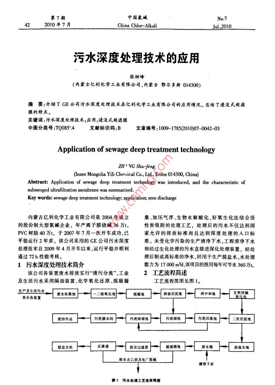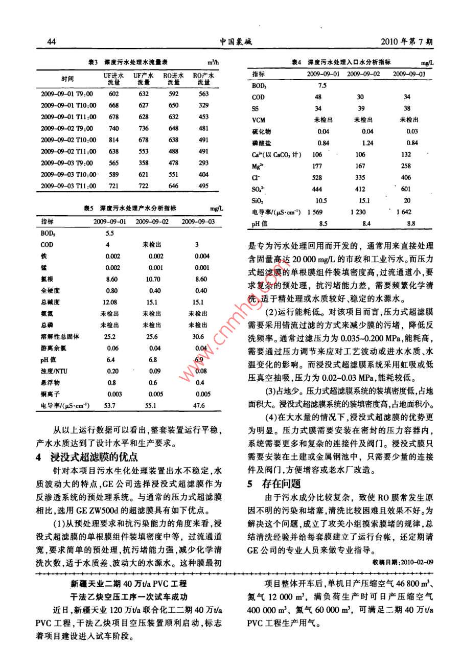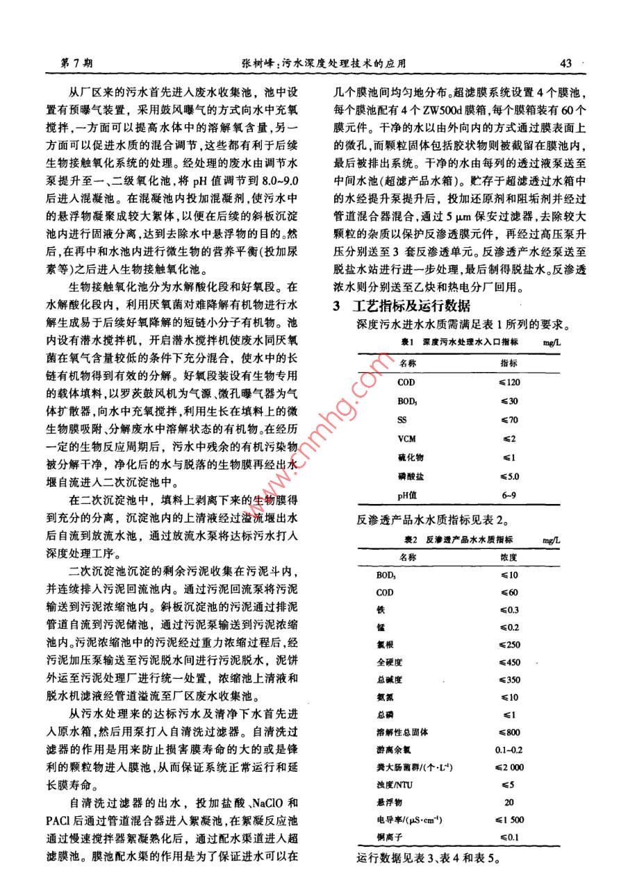 第7期中國氯堿422010年7月China Chlor-AlkaliJul,2010污水深度處理技術(shù)的應(yīng)用張樹峰(內(nèi)蒙古億利化學(xué)工業(yè)有限公司,內(nèi)蒙古鄂爾多斯014300)摘要:介紹了GE公司污水深度處理技術(shù)在億利化學(xué)工業(yè)有服公司的應(yīng)用情況??偨Y(jié)了浸沒式超濾膜的特點(diǎn)關(guān)鍵詞:污水深度處理技術(shù);應(yīng)用;浸沒式超濾膜中圖分類號(hào):TQ0854文獻(xiàn)標(biāo)識(shí)碼:B文章編號(hào):1009-17852010)07-004203Application of sewage deep treatment technologyInner Mongolia Yili Chenical Co, Ltd, Erdos 014300, China)Abstract: Application of sewage deep treatment technology was introduced, and the characteristic ofsubmerged ultrafiltration membrane was summarizedKey words: sewage deep treatment technology; application; zero discharge內(nèi)蒙古億利化學(xué)工業(yè)有限公司是2004年成立集、加壓氣浮、生物水解酸化、好氧生化法結(jié)合活的股份制大型氯堿企業(yè),年產(chǎn)離子膜燒堿36萬t,性炭吸附的處理工藝,處理后的污水不僅達(dá)到國PVC樹脂40萬t,于2007年7月一次開車成功,已家允許的排放標(biāo)準(zhǔn)而且達(dá)到深度處理的入口標(biāo)平穩(wěn)運(yùn)行2年多。該公司采用的GE公司污水深度準(zhǔn)。未受化學(xué)污染的生產(chǎn)清凈下水,工程清凈下水處理技術(shù)自2009年4月開車以來運(yùn)行平穩(wěn)并順利和經(jīng)過生化處理的污水直接進(jìn)深化處理裝置,經(jīng)處通過72h性能考核。理后制成高標(biāo)準(zhǔn)的凈水,回用于生產(chǎn)脫鹽水。水處理1污水深度處理技術(shù)簡介能力為17000m該項(xiàng)目的投用每年可節(jié)水360萬t該公司各裝置廢水排放實(shí)行“清污分流”,工業(yè)2工藝流程簡述及生活污水采用隔油裝置、化學(xué)氧化還原、混凝凝工藝流程簡圖見圖1。生產(chǎn)及生活污水二級(jí)氧化池混凝池斜板沉淀池來自各裝置]-[再中][裝泥餅外污泥膜水間污泥濃縮池污泥儲(chǔ)池污泥回流池二次沉淀池脫鹽水站反滲透保安過濾器超濾膜池放流水池濃水去乙炔及電廠脫硫清凈下水圖1污水處理工藝流程簡圖第7期張樹峰:污水深度處理技術(shù)的應(yīng)用從廠區(qū)來的污水首先進(jìn)入廢水收集池,池中設(shè)幾個(gè)膜池間均勻地分布。超濾膜系統(tǒng)設(shè)置4個(gè)膜池置有預(yù)曝氣裝置,采用鼓風(fēng)曝氣的方式向水中充氧每個(gè)膜池配有4個(gè)ZW500d膜箱,每個(gè)膜箱裝有60個(gè)攪拌,一方面可以提高水體中的溶解氧含量,另膜元件。干凈的水以由外向內(nèi)的方式通過膜表面上方面可以促進(jìn)水質(zhì)的混合調(diào)節(jié),這些都有利于后續(xù)的微孔,而顆粒固體包括膠狀物則被截留在膜池內(nèi)生物接觸氧化系統(tǒng)的處理。經(jīng)處理的廢水由調(diào)節(jié)水最后被排出系統(tǒng)。干凈的水由每列的透過液泵送至泵提升至一、二級(jí)氧化池,將pH值調(diào)節(jié)到8.0~9.0中間水池(超濾產(chǎn)品水箱)。貯存于超濾透過水箱中后進(jìn)入混凝池。在混凝池內(nèi)投加混凝劑,使污水中的水經(jīng)提升泵提升后,投加還原劑和阻垢劑并經(jīng)過的懸浮物凝聚成較大絮體,以便在后續(xù)的斜板沉淀管道混合器混合,通過5um保安過濾器,去除較大池內(nèi)進(jìn)行固液分離,達(dá)到去除水中懸浮物的目的。然顆粒的雜質(zhì)以保護(hù)反滲透膜元件,再經(jīng)過高壓泵升后,在再中和水池內(nèi)進(jìn)行微生物的營養(yǎng)平衡(投加尿壓分別送至3套反滲透單元。反滲透產(chǎn)水經(jīng)泵送至素等)之后進(jìn)入生物接觸氧化池脫鹽水站進(jìn)行進(jìn)一步處理,最后制得脫鹽水反滲透生物接觸氧化池分為水解酸化段和好氧段。在濃水則分別送至乙炔和熱電分廠回用。水解酸化段內(nèi),利用厭氧菌對(duì)難降解有機(jī)物進(jìn)行水3工藝指標(biāo)及運(yùn)行數(shù)據(jù)解生成易于后續(xù)好氧降解的短鏈小分子有機(jī)物。池深度污水進(jìn)水水質(zhì)需滿足表1所列的要求。內(nèi)設(shè)有潛水?dāng)嚢铏C(jī),開啟潛水?dāng)嚢铏C(jī)使廢水同厭氧1深度污水處理水入口指標(biāo)菌在氧氣含量較低的條件下充分混合,使水中的長名稱指標(biāo)鏈有機(jī)物得到有效的分解。好氧段裝設(shè)有生物專用≤120的載體填料,以羅茨鼓風(fēng)機(jī)為氣源、微孔曝氣器為氣體擴(kuò)散器,向水中充氧攪拌,利用生長在填料上的微生物膜吸附、分解廢水中溶解狀態(tài)的有機(jī)物。在經(jīng)歷定的生物反應(yīng)周期后,污水中殘余的有機(jī)污染物被分解干凈,凈化后的水與脫落的生物膜再經(jīng)出水硫化物堰自流進(jìn)入二次沉淀池中。磷酸鹽在二次沉淀池中,填料上剝離下來的生物膜得到充分的分離,沉淀池內(nèi)的上清液經(jīng)過溢流堰出水反滲透產(chǎn)品水水質(zhì)指標(biāo)見表2。后自流到放流水池,通過放流水泵將達(dá)標(biāo)污水打入衰2反滲透產(chǎn)品水水質(zhì)指標(biāo)mEL深度處理工序。名稱濃度二次沉淀池沉淀的剩余污泥收集在污泥斗內(nèi),并連續(xù)排入污泥回流池內(nèi)。通過污泥回流泵將污泥輸送到污泥濃縮池內(nèi)。斜板沉淀池的污泥通過排泥鐵管道自流到污泥儲(chǔ)池,通過污泥泵輸送到污泥濃縮錳≤0.2池內(nèi)。污泥濃縮池中的污泥經(jīng)過重力濃縮過程后,經(jīng)氯根污泥加壓泵輸送至污泥脫水間