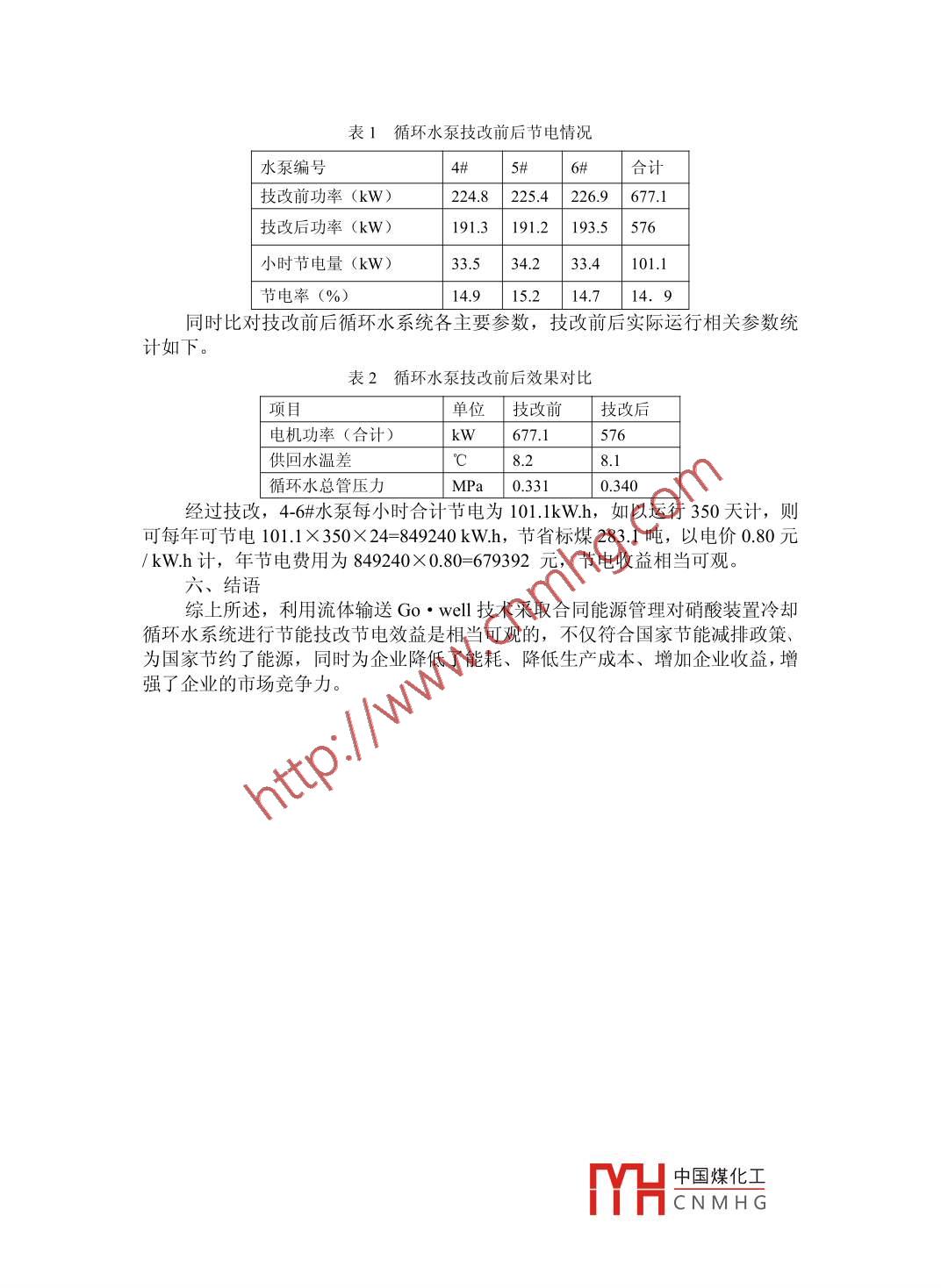 流體輸送Gowell技術(shù)在冷卻循環(huán)水系統(tǒng)節(jié)能技改中的應(yīng)用馬松浙江科維節(jié)能技術(shù)股份有限公司杭州市 310012摘要:本文結(jié)合山東華陽迪爾化工有限公司硝酸裝置工藝?yán)鋮s循環(huán)水系統(tǒng)節(jié)能技改實(shí)際,對(duì)工藝?yán)鋮s循環(huán)水系統(tǒng)存在的問題進(jìn)行闡述,對(duì)采取流體輸送Gowell技術(shù)進(jìn)行循環(huán)水系統(tǒng)節(jié)能技改的可行性進(jìn)行簡(jiǎn)要分析,對(duì)流體輸送Gowell技術(shù)的特點(diǎn)、手段進(jìn)行闡述,并介紹了節(jié)能技改項(xiàng)目取得的實(shí)際效果。關(guān)鍵詞:冷卻循環(huán)水系統(tǒng);流體輸送Gorwell技術(shù);節(jié)能技改中圖分類號(hào): TE08 .文獻(xiàn)標(biāo)識(shí)碼: A山東華陽迪爾化工有限公司(下稱“華陽迪爾公司”)是專業(yè)生產(chǎn)經(jīng)營(yíng)濃、稀硝酸的股份制企業(yè),華陽迪爾公司稀硝酸裝置從愛爾蘭IFI公司全套引進(jìn),生產(chǎn)工藝先進(jìn)。華陽迪爾公司生產(chǎn)管理水平處于國(guó)內(nèi)同行業(yè)前列,公司領(lǐng)導(dǎo)高度重視節(jié)能減排工作,基于技術(shù)和投資成本考慮,華陽迪爾公司選擇了和循環(huán)水系統(tǒng)節(jié)能專業(yè)公司一-浙江科維 節(jié)能技術(shù)股份有限公司(下稱“科維公司”)采取合同能源管理模式,在不負(fù)擔(dān)任何節(jié)能技改費(fèi)用的前提下對(duì)硝酸裝置冷卻循環(huán)水系統(tǒng)進(jìn)行技改。一.方面華陽迪爾公司存在循環(huán)水系統(tǒng)能耗過高的實(shí)際,另一方面科維公司在資金、技術(shù)上具有相當(dāng)?shù)膬?yōu)勢(shì)。工藝?yán)鋮s循環(huán)水系統(tǒng)在硝酸裝置生產(chǎn)能耗中占較大比重,而循環(huán)水泵是冷卻循環(huán)水系統(tǒng)中能耗較大的設(shè)備之-一,在循環(huán)水系統(tǒng)實(shí)際運(yùn)行過程中,往往出現(xiàn)循環(huán)水系統(tǒng)運(yùn)行效率不高、電機(jī)運(yùn)行功率偏大等現(xiàn)象,不僅縮短電機(jī)的使用壽命,更重要的是造成電能的浪費(fèi)。科維公司采用流體輸送Go'well技術(shù)對(duì)華陽迪爾公司硝酸裝置工藝?yán)鋮s循環(huán)水系統(tǒng)實(shí)施節(jié)能技改,取得了顯著的節(jié)電效果。一、硝酸裝置冷卻循環(huán)水系統(tǒng)運(yùn)行情況及存在問題華陽迪爾公司稀硝酸裝置分為稀硝酸和濃硝酸2個(gè)生產(chǎn)區(qū)域,冷卻循環(huán)水.通過泵房總管輸送至裝置區(qū),然后分別由各裝置支管供應(yīng)給各換熱器使用,換熱后回冷卻塔冷卻。該循環(huán)水系統(tǒng)配備水泵規(guī)格如下:德國(guó)KSB水泵(3臺(tái)):MBS300-400 (P= 220kW);.上海東方水泵(3 臺(tái)): DFSS300-435B (P=220kW);山東博山水泵(1臺(tái)): 12SH-9B (P=132kW)。實(shí)際運(yùn)行中出現(xiàn)以下問題: 3臺(tái)DFSS300-435B泵在不同運(yùn)行模式下均出現(xiàn)超電流、超功率現(xiàn)象,偏離水泵實(shí)際工況,水泵運(yùn)行效率較低、循環(huán)水系統(tǒng)輸送效率低下,造成較大的能量損耗,有較大的節(jié)電空間。二、流體輸送Gowell技術(shù)簡(jiǎn)介1、流體輸送Gowell技術(shù)組成及技術(shù)思路科維公司流體輸送Gowell技術(shù)由數(shù)據(jù)采集(檢測(cè))技術(shù)、系統(tǒng)診斷分析技術(shù)、系統(tǒng)優(yōu)化改造技術(shù)、ECOWELL高效節(jié)能泵及變頻節(jié)能控制系統(tǒng)等四部分組成,也稱“3+1 ”節(jié)能技術(shù)。以合理的水送能耗指標(biāo)做指導(dǎo),以系統(tǒng)優(yōu)化、最佳工況運(yùn)行為目的,從調(diào)整合理流量、降低系統(tǒng)阻抗、提高水泵運(yùn)行效率三方面入手做起按晶住T況運(yùn).行原則,建立專業(yè)水力計(jì)算數(shù)學(xué)模型,通過檢測(cè)復(fù)核中國(guó)煤化工數(shù)和YHCNMHG設(shè)備參數(shù),即可準(zhǔn)確判斷引起“高功耗”的各種原因,準(zhǔn)確找到最佳工況點(diǎn);通過調(diào)整系統(tǒng)不利工況因素,并按最佳運(yùn)行工況參數(shù)定做“Go.well高效節(jié)能泵”替換目前處于不利工況、低效率運(yùn)行的水泵,徹底根治引起功耗增加的不利工況,提.高水泵效率,降低“無效功能”,達(dá)到真正的節(jié)能。2、工藝?yán)鋮s循環(huán)水系統(tǒng)節(jié)能技改設(shè)計(jì)過程2.1、通過分析系統(tǒng)裝置熱負(fù)荷以及工藝特點(diǎn),按經(jīng)濟(jì)供回水溫差原則,判斷流量的合理性,并確定合理流量,做到“裝置側(cè)合理用水、泵站側(cè)合理供水”。2.2、對(duì)換熱器及冷卻塔的熱工性能進(jìn)行評(píng)估,以確保經(jīng)濟(jì)供回水溫差實(shí)現(xiàn)的可行性。2.3、運(yùn)用計(jì)算機(jī)模擬技術(shù)分析管網(wǎng)水力節(jié)點(diǎn)平衡,尋找水力失衡原因,并通過閥門調(diào)節(jié)或增加提升動(dòng)力等手段優(yōu)化管網(wǎng)結(jié)構(gòu),得到可實(shí)現(xiàn)的最優(yōu)管網(wǎng)性能曲線,降低系統(tǒng)管網(wǎng)阻抗,提高管網(wǎng)運(yùn)行效率。2.4、通過對(duì)泵站原有運(yùn)行模式的工況分析,判斷電機(jī)及水泵的實(shí)際運(yùn)行效率是否高效,并結(jié)合裝置側(cè)所需的技術(shù)參數(shù)要求,確定高效節(jié)能泵參數(shù)設(shè)計(jì)值,做好泵站優(yōu)化設(shè)計(jì)。2.5、借助三元流理論,采用國(guó)外最先進(jìn)的“CFD"仿真模擬技術(s