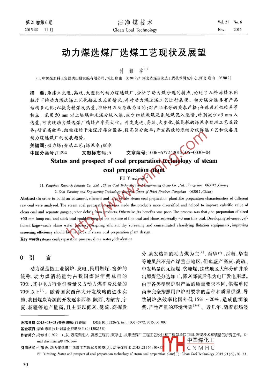 第2l卷第6期潔凈煤技術(shù)Vol.21 No. 62015年11 月Clean Coal Technology動力煤選煤廠選煤工藝現(xiàn)狀及展望付銀香',2(1.中國煤炭科工集團唐山研究院有限公司,河北唐山063012 ;2.河北省煤炭洗選工程技術(shù)研究中心,河北唐山063012)摘要:為建立先進、高效、大型化的動 力煤選煤廠,分析了動力煤分選的特點,論述了入料原煤不同粒度下的動力煤選煤工藝優(yōu)缺點及應(yīng)用情況,并對動力煤選煤工藝進行展望。動力煤分選具有產(chǎn)品結(jié)構(gòu)多元化;以提高精煤發(fā)熱量,排除矸石及雜物為目的;對產(chǎn)品水分的要求嚴格;分選盈利性較差等特點。采用50 mm以上塊煤和末煤分級入選,減少細粒原煤及系統(tǒng)煤泥入選量,特別減少<3 mm入選量,可實現(xiàn)動力煤選煤廠精煤產(chǎn)率最大化。開發(fā)先進、高效、大型化、低能耗的煤泥水處理工藝及設(shè)備;研究高效率、細粒徑的干法深度篩分設(shè)備,提高篩分效率;開發(fā)高效的濃縮分級浮選工藝和設(shè)備是動力煤選煤廠的發(fā)展趨勢。關(guān)鍵詞:動力煤;分選工藝;煤泥水;脫水中圖分類號:TD94文獻標志碼:A文章編號: 1006-6772(2015)06-0030-04Status and prospect of coal preparation technology of steamcoal preparation plantFU Yinxiang'.2(1. Tangshan Research Insitule Co. ,Ud. ,Chinn Coal Technology and Engineering Group Co. ,ud. , Tangshan 063012 . China;2. Coal Washing and Engineering Technology Reseurch Center of Hebei Prorince , Tangshan 063012 ,China)Abstract:In order to build an advanced, eficient and large -scale steam coal preparation plant ,the preparation characterstics of diferentraw coal were analyzed. The steam coal preparation process made the products more diversified and helped to improve calorific value ofclean coal and separale gangue , other debris from products. Othervise . its benefits was poor. The process was that , the preparation of sized+50 mm lump coal and slack coal could decreased the mixture of fine coal and slime , especially -3 mm fine coal. Developing advanced , ef-ficient large - scale slime water process , designing fficient dry screening and concentrated classifying flotation equipments , improvingscreening efficiency should be the focus of steam coal preparation plant design.Key words :steam coal ;separation process ;slime water ;dehydration分、高發(fā)熱量的動力煤為主2),而華中、西南、華南0引言等地雖然不是產(chǎn)煤重點地區(qū),但也盛產(chǎn)高灰高硫、動力煤是指工業(yè)鍋爐、發(fā)電、民用燃煤、窯爐的中發(fā)熱量的無煙煤、貧瘦煤,這些地區(qū)大部分礦井采統(tǒng)稱,動力煤消耗量約占我國煤炭消費總量的出原煤經(jīng)分選加工,降灰降硫后作為電廠發(fā)電用煤。70%,其中電力行業(yè)消費量又占動力煤消費總量的由于各類型鍋爐對產(chǎn)品的質(zhì)量要求不同,供煤單位70%以上川。隨著國家西部大開發(fā)戰(zhàn)略的逐步實尚未完全按照用戶爐型要求的品種和質(zhì)量供煤,導施,我國煤炭資源的開發(fā)逐步西移,陜西、內(nèi)蒙古、寧致鍋爐熱效率比國外低15%~20%,造成能源浪夏、新疆等地產(chǎn)量高,且主要以低灰、低硫、高揮發(fā)費,產(chǎn)生嚴重的環(huán)境污染(3-4)。近幾年,隨著市場經(jīng)收稿日期:2015-03-03;責任編輯:白]婭娜DOI:10. 13226/j. isn. 100 6772.2015. 06. 007基金項目:唐山市科技計劃基金資助項目( 14130253B)作者簡介:付銀香( 1979- -),女,湖南瀏陽人,高級工程師,雙學士,從事選煤廠工程工藝設(shè)計和工程總承包項目洗煤技術(shù)和裝備的研究工作。E-mail:fuyinxiang@ 126. com中國煤化工引用格式:付銀香.動力煤迭煤廠選煤I藝現(xiàn)狀及展望[J].潔凈煤技術(shù),2015 ,21(6) :30-3YHCNMHGFU Yinxiang. Status and prospect of coeal preparation technology of steam coal preparation plant[ J]. Clean Coal Tehnology ,2015 ,21(6) :30-33.30.付銀香:動力煤選煤廠選煤工藝現(xiàn)狀及展望2015年第6期濟的發(fā)展和環(huán)保要求的提高,原煤人選量逐漸加大,原煤對發(fā)電用煤的硫分要求也越來越嚴格,因此加大動原煤分級篩力煤入選量,降低硫分,提高發(fā)熱量已成為必然趨φ200 mm勢。建瑞革'5:通過分析寧東選煤廠梅花井分廠的檢查性手選選煤工藝狀況,提出了動力煤選煤廠塊煤淺槽+末。 破碎機煤重介工藝適應(yīng)市場多元化要求,靈活性較強。錢愛軍(21分析了目前國內(nèi)外動力煤選煤工藝,提出規(guī)塊煤分級篩模大型化、生產(chǎn)高效化、設(shè)計通用化和模塊化是動力φ25 mm(中50 mm)煤分選的發(fā)展趨勢。曹建波'6! 研究表明,生產(chǎn)和消淺槽分選機(動篩跳汰機)_費決定了我國煤炭運輸“西煤東調(diào),北煤南運”的格中200-25 mm局,大量低熱值動力煤的遠距離運輸造成動力資源塊研石(中200- 50 mm)塊精煤末煤雜物的浪費,建議通過高效分選降低運輸成本。選煤工藝直接決定了選煤廠的產(chǎn)品結(jié)構(gòu)、生產(chǎn)方式運營成圖1塊煤排矸工藝流程本、經(jīng)濟效益,因此動力煤選煤廠選煤工藝的研究、1)淺槽排矸工藝。重介質(zhì)淺槽分選機是依據(jù)工藝流程的制定既要符合原煤特點,滿足用戶要求,懸浮物下沉原理,以磁鐵礦粉為重介質(zhì),在水平流與又要最大化提高產(chǎn)品回收率。筆者在分析動力煤分上升流的共同作用下,比重介質(zhì)輕的煤上浮,比重介選特點的基礎(chǔ)上,論述了國內(nèi)外主要動力煤分選工質(zhì)重的矸石下沉實現(xiàn)分選。重介淺槽分選機分選粒藝,并對其進行展望,以期為新