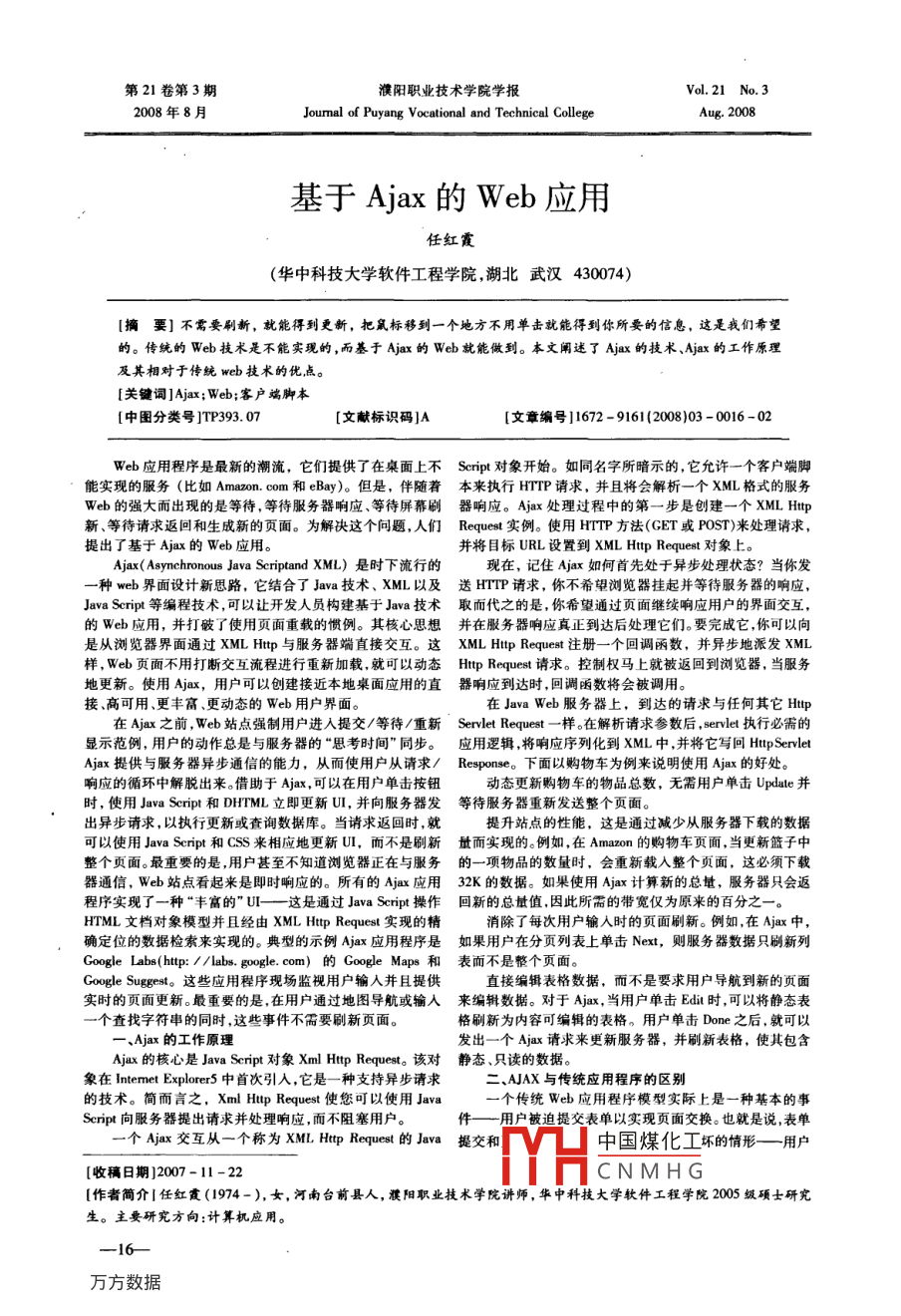 第21卷第3期濮陽(yáng)職業(yè)技術(shù)學(xué)院學(xué)報(bào)Vol 21 No. 32008年8月Jourmal of Puyang Vocational and Technical CollegeAug.2008基于Ajax的Web應(yīng)用任紅霞(華中科技大學(xué)軟件工程學(xué)院湖北武漢430074)摘要]不需要刷新,就能得到更新,把鼠標(biāo)移到一個(gè)地方不用單擊就能得到你所要的信息,這是我們希望的。傳統(tǒng)的Web技術(shù)是不能實(shí)現(xiàn)的,而基于Ajαx的Web就能做到。本文闡逑了Ajax的技術(shù)、Ajax的工作原理及其相對(duì)于傳統(tǒng)wb技術(shù)的優(yōu)點(diǎn)。[關(guān)鍵詞]Ajax;Web;客戶端腳本[中圖分類號(hào)]TP393.07[文獻(xiàn)標(biāo)識(shí)碼]A[文章編號(hào)]1672-9161(2008)03-0016Web應(yīng)用程序是最新的潮流,它們提供了在桌面上不 Script對(duì)象開始。如同名字所暗示的,它允許一個(gè)客戶端腳能實(shí)現(xiàn)的服務(wù)(比如Amazon.com和eBay)。但是,伴隨著本來執(zhí)行HTTP請(qǐng)求,井且將會(huì)解析一個(gè)XML格式的服務(wù)web的強(qiáng)大而出現(xiàn)的是等待,等待服務(wù)器響應(yīng)、等待屏幕刷器響應(yīng)。Ajax處理過程中的第一步是創(chuàng)建一個(gè) Xml Http新、等待請(qǐng)求返回和生成新的頁(yè)面。為解決這個(gè)問題,人們 Request實(shí)例。使用HTP方法(GET或POST)來處理請(qǐng)求提出了基于Ajax的Web應(yīng)用并將目標(biāo)URL設(shè)置到 Xml Http Request對(duì)象上。Ajax( Asynchronous Java Scriptand XML)是時(shí)下流行的現(xiàn)在,記住Ajax如何首先處于異步處理狀態(tài)?當(dāng)你發(fā)一種web界面設(shè)計(jì)新思路,它結(jié)合了Java技術(shù)、XML以及送 Http請(qǐng)求,你不希望瀏覽器掛起并等待服務(wù)器的響應(yīng)Java Script等編程技術(shù),可以讓開發(fā)人員構(gòu)建基于Java技術(shù)取而代之的是,你希望通過頁(yè)面繼續(xù)響應(yīng)用戶的界面交互,的Web應(yīng)用,并打破了使用頁(yè)面重載的慣例。其核心思想并在服務(wù)器響應(yīng)真正到達(dá)后處理它們。要完成它,你可以向是從瀏覽器界面通過XMLH與服務(wù)器端直接交互。這 Xml Http Request注冊(cè)一個(gè)回調(diào)函數(shù),并異步地派發(fā)XML樣,Wb頁(yè)面不用打斷交互流程進(jìn)行重新加載,就可以動(dòng)態(tài) Http Request請(qǐng)求??刂茩?quán)馬上就被返回到瀏覽器,當(dāng)服務(wù)地更新。使用Ajax,用戶可以創(chuàng)建接近本地桌面應(yīng)用的直器響應(yīng)到達(dá)時(shí),回調(diào)函數(shù)將會(huì)被調(diào)用接高可用、更豐富、更動(dòng)態(tài)的Wb用戶界面。在 Java Web服務(wù)器上,到達(dá)的請(qǐng)求與任何其它Htp在Ajax之前,Web站點(diǎn)強(qiáng)制用戶進(jìn)入提交/等待/重新 Servlet Request一樣。在解析請(qǐng)求參數(shù)后, servlet執(zhí)行必需的顯示范例,用戶的動(dòng)作總是與服務(wù)器的“思考時(shí)間”同步。應(yīng)用邏輯將響應(yīng)序列化到XML中,并將它寫回 Http ServletAjax提供與服務(wù)器異步通信的能力,從而使用戶從請(qǐng)求/ Response。下面以購(gòu)物車為例來說明使用Ajax的好處。響應(yīng)的循環(huán)中解脫出來。借助于Ajax,可以在用戶單擊按鈕動(dòng)態(tài)更新購(gòu)物車的物品總數(shù),無需用戶單擊 Update并時(shí),使用 Java Script和 DHTML立即更新UI,并向服務(wù)器發(fā)等待服務(wù)器重新發(fā)送整個(gè)頁(yè)面出異步請(qǐng)求,以執(zhí)行更新或查詢數(shù)據(jù)庫(kù)。當(dāng)請(qǐng)求返回時(shí),就提升站點(diǎn)的性能,這是通過減少?gòu)姆?wù)器下載的數(shù)據(jù)可以使用 Java Script和CSs來相應(yīng)地更新Ul,而不是刷新量而實(shí)現(xiàn)的。例如,在 Amazon的購(gòu)物車頁(yè)面,當(dāng)更新籃子中整個(gè)頁(yè)面。最重要的是,用戶甚至不知道瀏覽器正在與服務(wù)的一項(xiàng)物品的數(shù)量時(shí),會(huì)重新載入整個(gè)頁(yè)面,這必須下載器通信,Web站點(diǎn)看起來是即時(shí)響應(yīng)的。所有的Ajax應(yīng)用32K的數(shù)據(jù)。如果使用Ajax計(jì)箅新的總量,服務(wù)器只會(huì)返程序?qū)崿F(xiàn)了一種“豐富的”U——這是通過 Java Script操作回新的總量值因此所需的帶寬僅為原來的百分之一。HTML文檔對(duì)象模型并且經(jīng)由 Xml Http Request實(shí)現(xiàn)的精消除了每次用戶輸入時(shí)的頁(yè)面刷新。例如,在Ajax中,確定位的數(shù)據(jù)檢索來實(shí)現(xiàn)的。典型的示例Ajax應(yīng)用程序是如果用戶在分頁(yè)列表上單擊Next,則服務(wù)器數(shù)據(jù)只刷新列GoogleLabs(htp://labs,google.com)的GoogleMaps和表而不是整個(gè)頁(yè)面。Google Suggest。這些應(yīng)用程序現(xiàn)場(chǎng)監(jiān)視用戶輸人井且提供直接編輯表格數(shù)據(jù),而不是要求用戶導(dǎo)航到新的頁(yè)面實(shí)時(shí)的頁(yè)面更新。最重要的是,在用戶通過地圖導(dǎo)航或輸入來編輯數(shù)據(jù)。對(duì)于Ajax,當(dāng)用戶單擊Edt時(shí),可以將靜態(tài)表一個(gè)查找字符串的同時(shí),這些事件不需要刷新頁(yè)面。格刷新為內(nèi)容可編輯的表格。用戶單擊Done之后,就可以一、Ajax的工作原理發(fā)出一個(gè)Ajax請(qǐng)求來更新服務(wù)器,并刷新表格,使其包含Ajux的核心是 Java Script對(duì)象 Xml Http Request。該對(duì)靜態(tài)、只讀的數(shù)據(jù)。象在 Intemet Explorer5中首次引入,它是一種支持異步請(qǐng)