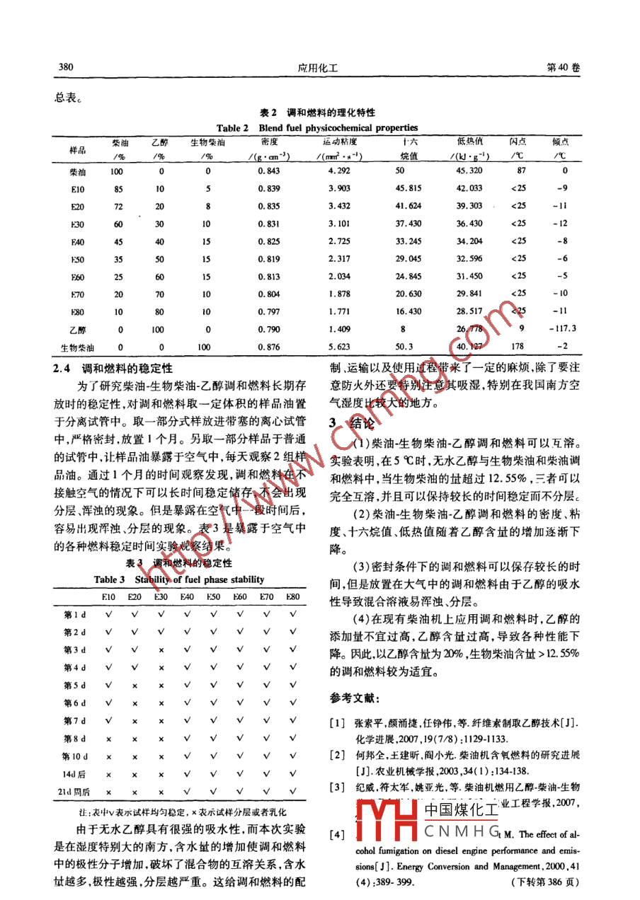 第40卷第3期應(yīng)用化工Vol 40 No. 3201l年3月Applied Chemical IndustryMar 2011柴油-生物柴油-乙醇溶解性及其調(diào)和燃料特性的研究李潯,謝丹,王艷宜,張躍飛(長沙理工大學(xué)化學(xué)與生物工程學(xué)院湖南省電力與交通材料保護重點實驗室湖南長沙410114)摘要:以白制的生物柴油為助溶劑,研究了生物柴油對乙醇和柴油調(diào)和燃料的助溶作用;研究了不同比例的柴油生物柴油-乙醇調(diào)和燃料的理化特性及穩(wěn)定性。結(jié)果表明,當生物柴油含量為12.55%時,柴油和燃料L醇可以以任意比例互溶;乙醇含過高會導(dǎo)致燃料的各種理化性能下降;乙醇含量為10%,生物柴油含量>12.5%為混合燃料較為適宜的調(diào)和比列。關(guān)鍵詞:生物柴油;乙醇;溶解性;理化特性中圖分類號:T5174;TK6文獻標識碼:A文章編號:1671-3206(2011)03-0376-05Solubility and fuel properties of a diesel-biodiesel-ethanol blend fuelLI Xun, XIE Dan, WANG Yan-yi, ZHANG Yue-feiCollege of Chemical and Biological Engineering, Changsha University of Science andhnology, Hunan Provincial Key Laboratory of Materials Protectionfor Electric Power and Transportation, Changsha 410114, ChinaAbstract: The hydrotropy of ethanol and diesel blended fuel was studied using biodiesel as cosolvent. Theproperties and stability of diesel-biodiesel-ethanol blended fuel with different ratios were researched. The results showed that when concentration of biodiesel was 12. 55%, the diesel and ethanol can be dissolved eachother. The properties of blended fuel decreased if the content of ethanol was too high. The optimal ratio ofblended fuel was ethanol 10%, biodiesel over 12. 55%Key words: biodiesel; ethanol; solubility; characteristics能源和環(huán)境的雙重問題大大推動了可再生能源增加柴油和乙醇的互溶度。本文旨在研究生物柴油的硏究進程。生物柴油和燃料乙醇作為可再生的生對燃料乙醇和柴油調(diào)和燃料的助溶作用,以及柴油·物質(zhì)液體燃料得到了各國的極大重視和快速的發(fā)展。生物柴油乙醉調(diào)和燃料的理化特性生物柴油在歐美發(fā)達國家已經(jīng)進入商業(yè)化生產(chǎn)階段,1實驗部分但在我國由于特殊的國情生物柴油成本較高尚未11試劑與儀器大規(guī)模生產(chǎn)應(yīng)用;我國燃料乙醇已經(jīng)得到一定規(guī)模的甲醇、無水乙醇、氫氧化鈉、檸檬酸、氯化鈉均為應(yīng)用已在黑龍江、吉林和河南三省建設(shè)陳化糧為燃分析純;精制大豆油(金龍魚牌)、0柴油市售。料乙醇生產(chǎn)工程,并已在全國10余個城市開展了摻DF-101S型集熱式恒溫加熱磁力攪拌器;S93和10%乙醇的汽油醇燃料應(yīng)用示范工作。型自動雙重純水蒸餾器;SHBⅢ型循環(huán)水式多用真空近年來國內(nèi)外研究人員對柴油機燃用乙醇也進泵RZ0C型旋轉(zhuǎn)蒸發(fā)器;SYD261型閉口閃點試驗行了研究,主要包括以下幾個方面:①完全燃用乙器;SYD103-IA型石油產(chǎn)品運動粘度測定器醇2,其技術(shù)難點是由于乙醇的十六烷值小氣化潛 SDACM0型熱值測定儀;SYD50F1型多功能低熱大,在缸內(nèi)著火非常閑難;②乙醇和柴油雙燃料系溫試驗器。統(tǒng),主要問題是在柴油機上需要另外增加一套乙12生物柴油的制備醇噴射裝置;③乙醇柴油調(diào)和燃料,其問題是必以精煉大豆油與甲醇為原料,甲醇和大豆油的摩須使用價格昂貴的助溶劑才能形成比較穩(wěn)定的乙醇爾比為6:1,反應(yīng)溫度60℃,氫氧化鈉催化劑濃度為柴油調(diào)和燃料。由于柴油和乙醇的互溶性較差,因此0.8%間的0mn靜置分層取上層溶液,依可考慮用生物柴油作為柴油和燃料乙醇的助溶劑來次用中國煤化工水洗滌,在真空收稿日期:2010-1209修改稿日期:201012-24CNMHG基金項目國家高技術(shù)研究發(fā)展(863)計劃項目(2008AAO57405);長沙市科技計劃重點項目(k10050121)作者簡介:李潯(1972-),男,江西九江人,長沙理工大學(xué)副教授,博士,主要從事生物質(zhì)液體燃料研究。電話0731-82618608,E-mail.lixunl26@126.com第3期潯等:柴油-生物柴油乙醇溶解性及其調(diào)和燃料特性的研究度為0.IMPa下減壓蒸餾,蒸出甲醇和水,得到精制和燃料的性能。生物柴油。2.2柴油-生物柴油-乙醇調(diào)和燃料的互溶性1.3柴油-生物柴油乙醇的溶解性由于乙醇是極性分子,使得乙醇柴油調(diào)和燃料柴油生物柴油-乙醇調(diào)和燃料溶解性的實驗步的穩(wěn)定性受柴油中碳氫化合物的構(gòu)成、含水址、密驟:①在-定溫度下,用移液管取柴油20m放入干度、溫度和添加劑t等的影響。生物柴油可以很好燥的100mL試管中,用滴定管添加乙醇并充分振蕩地解決溫度引起的分層問題故乙醇含水址將對混至混合溶液出現(xiàn)渾濁為止,記錄乙醇添加體積數(shù),確合溶液起關(guān)鍵性重要作用,但由于95%的乙醇含水定在不加生物柴油的情況下柴油中可以溶解的乙醇較大,與柴油很難形成穩(wěn)定的相,故本實驗采最大址;2在混合液中緩慢滴加生物柴油同時充分用無水乙醇。通過實驗得到了乙醇、柴油生物柴振蕩,至溶液恰由濁變清時停止,記下所加生物柴油油在常壓、不同溫度下的互溶三相圖(見圖1~圖4)的體積;③繼續(xù)逐次加人2m乙醇,若混合液變混0.00A100濁則滴加生物柴油,并不斷振蕩直至混合溶液完全互溶,直至所加乙醇的量與柴油相同時停止,記錄所加乙醇和生物柴油的體積數(shù);④在同樣溫度下在干燥試管中加入20m乙醇,用滴定管添加柴油并同時振蕩至混合溶液出現(xiàn)渾濁為止,記錄柴油添