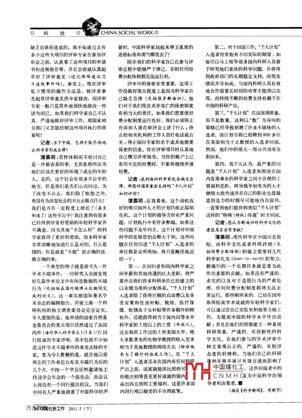 ◎科技CH| NA SOCIAL WORK◎中華人作Ceremony=tInterntion美籍華商神經(jīng)生物學(xué)家蒲慕明(左)1999年起出任中科院上海神經(jīng)科學(xué)研究所的首任所長。他是美國國家科學(xué)院院士、臺灣“中央研究院”院士,同時也是中科院60年歷史上第一位外籍所長。圖為2006年3月24日,國務(wù)委員陳至立向他頒發(fā)中國國際科學(xué)技術(shù)合作獎中國科學(xué)“病”在何處徐治國中國科學(xué)的核心病癥態(tài)度和創(chuàng)新精神是中國目前科學(xué)文化水平的沒有什么產(chǎn)出的實驗室。另的核心問題,這需要科學(xué)家努力改變方面,我從未聽說過任何一個有產(chǎn)出“中國學(xué)術(shù)界缺乏嚴(yán)謹(jǐn)?shù)膽B(tài)度和創(chuàng)自己的科研態(tài)度和學(xué)術(shù)界的“傳統(tǒng)”。的科學(xué)家(根據(jù)國際標(biāo)準(zhǔn)而定義)在中新精神是中國目前科學(xué)文化的核心問題,只是簡單地把所有問題都怪罪到經(jīng)費國沒有得到很好的資助。與此相反,這需要科學(xué)家努力改變自己的科研態(tài)度的申請體制和通過“拉關(guān)系”來主導(dǎo)我知道很多水平相當(dāng)?shù)目茖W(xué)家在美國和學(xué)術(shù)界的‘傳統(tǒng)’?!狈峙涞默F(xiàn)象,這是一種短視而且有偏卻沒有得到資助。讓我們一起環(huán)顧見的看法。下目前在中國所有的科研單位里成功記者:關(guān)于中國科研休制,特別是記者:目前中國經(jīng)費申請體制是否的年輕科學(xué)家(特別是那些新當(dāng)選的經(jīng)費分配的現(xiàn)狀,您持怎樣的觀點?存在不公正?“拉關(guān)系”對中國科學(xué)家中科院院士),不管是國內(nèi)成長的還蒲慕明:基于我過去十多年在中的生存是否是必需的?是從海外回來的,他們的成功難道都國科研機構(gòu)工作的經(jīng)驗,他們把中國蒲慕明:首先,圈內(nèi)的每個人都是靠他們與一些重要科學(xué)家或官員目前的科研體制文化歸結(jié)為“浪費資同意:雖然近幾年有關(guān)經(jīng)費分配的改“拉關(guān)系”嗎?答案顯然是否定的源、腐蝕精神、阻礙創(chuàng)新”3句話,進工作一直在進行,但是速度緩慢,在中國,現(xiàn)在經(jīng)費分配最大的問這是以偏賅全的失實說法。在當(dāng)前科需進一步完善。題是那些所謂精英實驗室得到的經(jīng)技界的許多領(lǐng)域,中國正在進行很多我們確實存在大量的資源被I L1中國煤化工科研機構(gòu)或知名高質(zhì)量的、有創(chuàng)新性的科研工作。雖的情況:太多的資源投給少數(shù)幾到的經(jīng)費之間的CNM然有很多地方需要改進,但是我們應(yīng)英實驗室,太多的昂貴的高端儀器個問題,應(yīng)把對該注意的是,中國學(xué)術(shù)界缺乏嚴(yán)謹(jǐn)?shù)挠斜缓芎玫厥褂?太多的資源注入低些大項目的資助轉(zhuǎn)變?yōu)橐再Y助許多乃會工作2011.5(下)CHINA SOCIAL WORK O◎和技◎科學(xué)家自由探索為主的基礎(chǔ)研究的小項目(類似國家自然科學(xué)基金委的項目)。經(jīng)費資助中最常見的浪費現(xiàn)我注意到有很多已經(jīng)得到非常好資助的年輕科象是有些成功的科學(xué)家對資源的貪得無厭,對這些少數(shù)精英實驗室大學(xué)家并不滿意,因為其他不怎么樣’的科學(xué)家獲幅度地增強支持力度,其邊際效應(yīng)肯得了更好的資助。很多科學(xué)家非常清晰地知道什么定是不明顯的,而這些資源更應(yīng)該分是對的,什么是錯的,但是就是‘不能’說正確的話、配給那些有潛力(雖然還沒有出成果)的實驗室。做正確的事。大”與“小”的權(quán)衝與西方發(fā)達國家不同,中國的主想要在那些具體目標(biāo)尚不清晰、研究要問題是,各領(lǐng)域高水平的實瞼室數(shù)范式和實驗方法仍需要發(fā)展、發(fā)現(xiàn)仍科學(xué)家當(dāng)自律量非常有限。大量資源只能是被傾注到不可預(yù)測的科學(xué)前沿問題上取得真正“除非科學(xué)家自己在參與制訂項目非常少的高水平的實驗室,結(jié)果顯而易的進展,最好的辦法就是在許多小型指南及項目評審過程中能夠嚴(yán)于律己,見,投入與產(chǎn)出完全不成比例。”實驗室,由導(dǎo)師與少數(shù)學(xué)生和工作人否則任何經(jīng)費分配體制都無法運行好”員共同嘗試不同的、可能有些冒險性記者:那您認(rèn)為,“973”、“863”的方法去解決問題?!?73”和“863記者:您認(rèn)為應(yīng)如何更好地制訂大及其他“專項”等大項目是浪費資源嗎?還有很多問題需要解決,如需要更好項目指南以及組織和管理大項目?蒲慕明:自上而下地組織以國家地控制項目的參與者,以確保研究隊蒲慕明:對于制訂組織大項目的重大需求為目標(biāo)的研究項目,不僅是伍的質(zhì)量;項目的審查、延續(xù)應(yīng)該有指南,目前國家科技部、基金委等相中國,也是當(dāng)今世界的趨勢。與西方更嚴(yán)格的監(jiān)管;項目中各課題之間的關(guān)機構(gòu)主要是依靠相關(guān)領(lǐng)域的領(lǐng)軍科發(fā)達國家不同,中國的主要問題是交流、合作亟待增強學(xué)家,通常是院士及其他資深的科學(xué)各領(lǐng)域高水平的實驗室數(shù)量非常有記者:大項目運行成功的關(guān)鍵是什家。鑒于各個研究領(lǐng)域中有經(jīng)驗、有限。大量資源只能是被傾注到非常少成就的科學(xué)家的匱乏,現(xiàn)在的做法是的高水平的實驗室,結(jié)果顯而