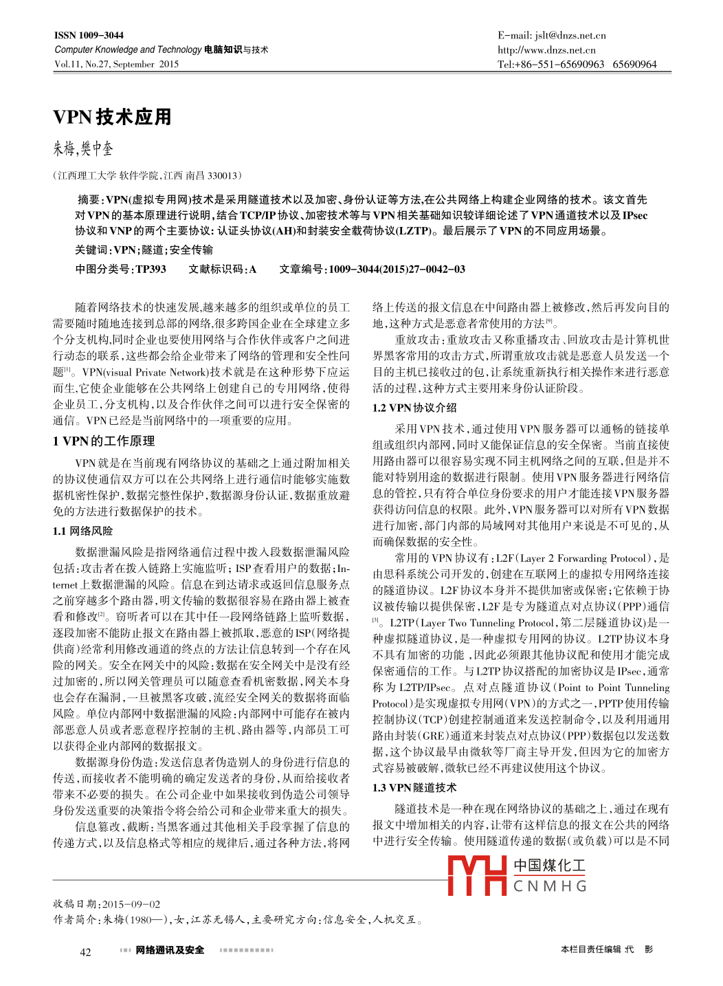 ISSN1009-3044E-mail: jslt@dnzs net cnComputer Knowledge and Technology電腦知識(shí)與技術(shù)Vol 11. No 27 September 2015Tel:+86-551-6569096365690964VPN技術(shù)應(yīng)用朱梅,樊中奎(江西理工大學(xué)軟件學(xué)院,江西南昌330013)摘要:PN(虛擬專用網(wǎng))技術(shù)是采用隧道技術(shù)以及加密、身份認(rèn)證等方法在公共網(wǎng)絡(luò)上構(gòu)建企業(yè)網(wǎng)絡(luò)的技術(shù)。該文首先對(duì)VPN的基本原理進(jìn)行說明,結(jié)合TCPP協(xié)議、加密技術(shù)等與ⅴPN相關(guān)基礎(chǔ)知識(shí)較詳細(xì)論述了ⅴPN通道技術(shù)以及Isec協(xié)議和VNP的兩個(gè)主要協(xié)議:認(rèn)證頭協(xié)議(AH)和封裝安全載荷協(xié)議ZTP)。最后展示了ⅤPN的不同應(yīng)用場景。關(guān)鍵詞:PN;隧道;安全傳輸中圖分類號(hào):TP393文獻(xiàn)標(biāo)識(shí)碼:A文章編號(hào):1009-3044(2015)27-0042-03隨著網(wǎng)絡(luò)技術(shù)的快速發(fā)展,越來越多的組織或單位的員工絡(luò)上傳送的報(bào)文信息在中間路由器上被修改,然后再發(fā)向目的需要隨時(shí)隨地連接到總部的網(wǎng)絡(luò),很多跨國企業(yè)在全球建立多地,這種方式是惡意者常使用的方法門。個(gè)分支機(jī)構(gòu),同時(shí)企業(yè)也要使用網(wǎng)絡(luò)與合作伙伴或客戶之間進(jìn)重放攻擊:重放攻擊又稱重播攻擊、回放攻擊是計(jì)算機(jī)世行動(dòng)態(tài)的聯(lián)系,這些都會(huì)給企業(yè)帶來了網(wǎng)絡(luò)的管理和安全性問界黑客常用的攻擊方式,所謂重放攻擊就是惡意人員發(fā)送一個(gè)題。 VPN(visual Private Network)技術(shù)就是在這種形勢下應(yīng)運(yùn)目的主機(jī)已接收過的包,讓系統(tǒng)重新執(zhí)行相關(guān)操作來進(jìn)行惡意而生它使企業(yè)能夠在公共網(wǎng)絡(luò)上創(chuàng)建自己的專用網(wǎng)絡(luò),使得活的過程,這種方式主要用來身份認(rèn)證階段企業(yè)員工,分支機(jī)構(gòu),以及合作伙伴之間可以進(jìn)行安全保密的12vPN協(xié)議介紹通信。VPN已經(jīng)是當(dāng)前網(wǎng)絡(luò)中的一項(xiàng)重要的應(yīng)用。采用VPN技術(shù),通過使用VPN服務(wù)器可以通暢的鏈接單lVPN的工作原理組或組織內(nèi)部網(wǎng),同時(shí)又能保證信息的安全保密。當(dāng)前直接使VPN就是在當(dāng)前現(xiàn)有網(wǎng)絡(luò)協(xié)議的基礎(chǔ)之上通過附加相關(guān)用路由器可以很容易實(shí)現(xiàn)不同主機(jī)網(wǎng)絡(luò)之間的互聯(lián),但是并不的協(xié)議使通信雙方可以在公共網(wǎng)絡(luò)上進(jìn)行通信時(shí)能夠?qū)嵤?shù)能對(duì)特別用途的數(shù)據(jù)進(jìn)行限制。使用VPN服務(wù)器進(jìn)行網(wǎng)絡(luò)信據(jù)機(jī)密性保護(hù),數(shù)據(jù)完整性保護(hù),數(shù)據(jù)源身份認(rèn)證,數(shù)據(jù)重放避息的管控,只有符合單位身份要求的用戶才能連接VPN服務(wù)器免的方法進(jìn)行數(shù)據(jù)保護(hù)的技術(shù)獲得訪問信息的權(quán)限。此外,VPN服務(wù)器可以對(duì)所有ⅤPN數(shù)據(jù)11網(wǎng)絡(luò)風(fēng)險(xiǎn)進(jìn)行加密,部門內(nèi)部的局域網(wǎng)對(duì)其他用戶來說是不可見的,從而確保數(shù)據(jù)的安全性。數(shù)據(jù)泄漏風(fēng)險(xiǎn)是指網(wǎng)絡(luò)通信過程中撥入段數(shù)據(jù)泄漏風(fēng)險(xiǎn)常用的PN協(xié)議有:L2F( Layer2 Forwarding protocol),是包括:攻擊者在撥入鏈路上實(shí)施監(jiān)聽;IsP查看用戶的數(shù)據(jù);In-由思科系統(tǒng)公司開發(fā)的,創(chuàng)建在互聯(lián)網(wǎng)上的虛擬專用網(wǎng)絡(luò)連接ternet數(shù)據(jù)泄漏的風(fēng)險(xiǎn)。信息在到達(dá)請(qǐng)求或返回信息服務(wù)點(diǎn)的隧道協(xié)議。L2F協(xié)議本身并不提供加密或保密;它依賴于協(xié)之前穿越多個(gè)路由器,明文傳輸?shù)臄?shù)據(jù)很容易在路由器上被查議被傳輸以提供保密,L2F是專為隧道點(diǎn)對(duì)點(diǎn)協(xié)議(P)通信看和修改。竊聽者可以在其中任一段網(wǎng)絡(luò)鏈路上監(jiān)聽數(shù)據(jù),叫。12P( Laver two Tunneling protocol,第二層隧道協(xié)議是一段加密不能防止報(bào)文在路由器上被抓取,惡意的IsP(網(wǎng)絡(luò)提種虛擬隧道協(xié)議,是一種虛擬專用網(wǎng)的協(xié)議。L2TP協(xié)議本身商)經(jīng)常利用修改通道的終點(diǎn)的方法讓信息轉(zhuǎn)到一個(gè)存在風(fēng)不具有加密的功能,因此必須跟其他協(xié)議配和使用才能完成險(xiǎn)的網(wǎng)關(guān)。安全在網(wǎng)關(guān)中的風(fēng)險(xiǎn):數(shù)據(jù)在安全網(wǎng)關(guān)中是沒有經(jīng)保密通信的工作。與L2TP協(xié)議搭配的加密協(xié)議是 IPsec,通常過加密的,所以網(wǎng)關(guān)管理員可以隨意查看機(jī)密數(shù)據(jù),網(wǎng)關(guān)本身稱為L2 TP/IPsec。點(diǎn)對(duì)點(diǎn)隧道協(xié)議( Point to Point Tunneling也會(huì)存在漏洞,一旦被黑客攻破,流經(jīng)安全網(wǎng)關(guān)的數(shù)據(jù)將面臨 Protocol)是實(shí)現(xiàn)虛擬專用網(wǎng)(VPN)的方式之一,PPTP使用傳輸風(fēng)險(xiǎn)。單位內(nèi)部網(wǎng)中數(shù)據(jù)泄漏的風(fēng)險(xiǎn):內(nèi)部網(wǎng)中可能存在被內(nèi)控制協(xié)議(TCP)創(chuàng)建控制通道來發(fā)送控制命令,以及利用通用部惡意人員或者惡意程序控制的主機(jī)、路由器等,內(nè