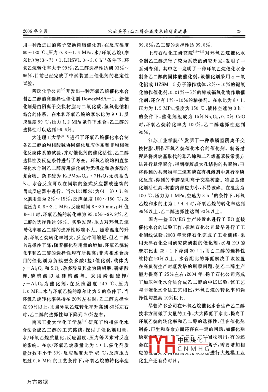 第29卷第9期化工科技市場2006年9月CHEMICAL TECHNOLOGY MARKET23乙二醇合成技術(shù)的研究進展宋云英,李明(北京燕山石化興業(yè)技術(shù)開發(fā)公司,北京102500)摘要:介紹了環(huán)氧乙烷法合成乙二醇的研究開發(fā)進展,重點介紹了環(huán)氧乙烷催化水合法和碳酸乙烯酯法制乙二醇的研究進展,提出了我國今后的發(fā)展建議關(guān)鍵詞:環(huán)氧乙烷;碳酸乙烯酯;乙二醇;合成;催化法中圖分類號:TQ223.162文獻標識碼:A文章編號:1009-4725(2006)09-0023-06Research progress on the synthesis technologies of ethylene glycol(Beijing Yanshan Petrochemical Xingye Technology Development Corp., Beijing 102500, China)Abstract: The research development of ethylene glycol synthesis by ethylene oxide are introduced. The progressin preparation ethylene glycol with catalytic hydration route and ethylene carbonate route of ethylene oxide arecussed in detail. Suggestion for the development of ethylene glycol in China are put forwarEthylene oxide; ethylene glycol; synthesis; catalytic method乙二醇又名甘醇、乙撐二醇,是一種重要的石油二醇、二乙二醇和三乙二醇的摩爾比約為化工基礎(chǔ)有機原料,主要用于生產(chǎn)聚酯纖維、防凍100:10:1,產(chǎn)品總收率為88%。不足之處是生產(chǎn)劑、不飽和聚酯樹脂、潤滑劑、增塑劑、非離子表面活工藝流程長、設(shè)備多、能耗高,直接影響乙二醇的生性劑以及炸藥等。目前,國內(nèi)外乙二醇的工業(yè)生產(chǎn)產(chǎn)成本。方法主要是環(huán)氧乙烷直接水合法,雖然它工藝成熟,目前,環(huán)氧乙烷直接水合法的生產(chǎn)技術(shù)基本上但水比大能耗高,生產(chǎn)成本較高,為此人們又相繼由英荷殼牌、美國 Halcon-SD以及美國聯(lián)碳三家開發(fā)出環(huán)氧乙烷催化水合法和碳酸乙烯酯法以及由公司所壟斷。它們的工藝技術(shù)和工藝流程基本上相合成氣合成乙二醇等各種新的生產(chǎn)方法,其中環(huán)氧似,即采用乙烯、氧氣為原料,在銀催化劑、甲烷或氮乙烷催化水合法和碳酸乙烯酯法被認為是今后乙二氣致穩(wěn)劑、氯化物抑制劑存在下,乙烯直接氧化生成醇最有發(fā)展前景的工業(yè)化生產(chǎn)方法,是目前國內(nèi)外環(huán)氧乙烷,環(huán)氧乙烷進一步與水以一定物質(zhì)的量比研究開發(fā)的熱點。在管式反應(yīng)器內(nèi)進行水合反應(yīng)生成乙二醇,乙二醇1環(huán)氧乙烷直接水合法溶液經(jīng)蒸發(fā)提濃、脫水、分餾得到乙二醇及其他副產(chǎn)品。此外,整個工藝還設(shè)置了與其生產(chǎn)能力配套的環(huán)氧乙烷直接水合法是目前國內(nèi)外工業(yè)化生產(chǎn)空分裝置、碳酸鹽的處理以及廢氣廢液處理等系統(tǒng)。乙二醇的主要方法,該工藝是將環(huán)氧乙烷(FO)和水3家公司的專利技術(shù)主要區(qū)別體現(xiàn)在催化劑、反應(yīng)按1:(20-22)(摩爾比)配成混合水溶液,在管式和吸收工藝以及一些技術(shù)細節(jié)上。反應(yīng)器中于190~220℃,1.0~2.5MPa下反應(yīng),環(huán)Shell工藝的主要技術(shù)特點為:1)使用Ag-氧乙烷全部轉(zhuǎn)化為混合醇,生成的乙二醇水溶液含中國煤化工管使用管徑為量大約在10%(質(zhì)量分數(shù))左右,然后經(jīng)過多效蒸發(fā)CNMH鋼管;3)反應(yīng)生器脫水提濃和減壓精餾分離得到乙二醇及副產(chǎn)物二成氣中我院吸收塔急冷段大乙二醇(DEG)和三乙二醇(TEG)等。混合醇中乙部分被吸收掉,保證了產(chǎn)品中較低的醛含量以及乙24化工科技市場第29卷第9期二醇產(chǎn)品的UV值;(4)從貧吸收水中抽出開發(fā)出類似二氧化硅骨架的聚有機硅烷銨鹽負載型20-30t/h送到解吸塔提濃段,將解吸過程中環(huán)氧催化劑及其催化下的環(huán)氧化物水合工藝。在水/環(huán)乙烷水解生成的醇濃縮(約含醇30%),以1.2t/h氧化物摩爾比為(1~15):1,反應(yīng)溫度80~200℃量排至醇閃蒸回收塔,避免了吸收水中醇的積累。反應(yīng)壓力0.2~2MPa條件下,環(huán)氧乙烷的轉(zhuǎn)化率D工藝的主要技術(shù)特點為:1)采用C9以上新為72%,乙二醇選擇性為95%。2001年殼牌公酸銀鹽制備的含銫銀催化劑;2)反應(yīng)管使用管徑為司又開發(fā)出負載于離子交換樹脂上的多羧酸衍生中38.1mm×3.4mm的無縫碳鋼管;3)設(shè)置環(huán)氧乙物催化劑。在水/環(huán)氧化物摩爾比為(1~6):1,反烷再吸收系統(tǒng),調(diào)節(jié)循環(huán)工藝水量恰好維持再吸收應(yīng)溫度90~150℃,反應(yīng)壓力0.2~2MPa條件下塔釜液中的環(huán)氧乙烷濃度(質(zhì)量分數(shù)約為10%),然環(huán)氧乙烷的轉(zhuǎn)化率大于97%,乙二醇選擇性高于后直接送入環(huán)氧乙烷精餾塔或乙二醇水合系統(tǒng),減94%。采用該工藝既可進行間歇操作,也可進行連少了系統(tǒng)中處理高濃度環(huán)氧乙烷的部位,裝置的安續(xù)生產(chǎn)。與現(xiàn)行環(huán)氧乙烷高溫高壓水解工藝相比,全性較好;4)裝置的整個水系統(tǒng)基本上采用閉環(huán)控該技術(shù)可節(jié)省環(huán)氧乙烷/乙二醇裝置總投資費用的制,各凝液量充分利用,使裝置水耗量較低,但因水15%左右。最近該公司又成功地開發(fā)出第一代水合系統(tǒng)置換量小,整個水系統(tǒng)雜質(zhì)積累較多,影響了產(chǎn)催化劑S100,并完成了催化劑篩選和40.0萬t/a環(huán)品UV值的控制。氧乙烷水合裝置的工藝設(shè)計,催化劑水合已經(jīng)完成UCC工藝的主要技術(shù)特點:1)使用含鋰、鈉、了單管和中試,試驗經(j