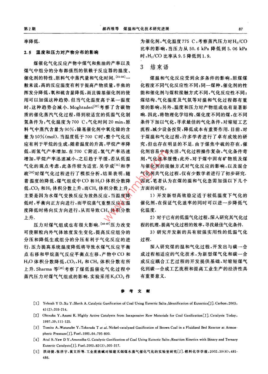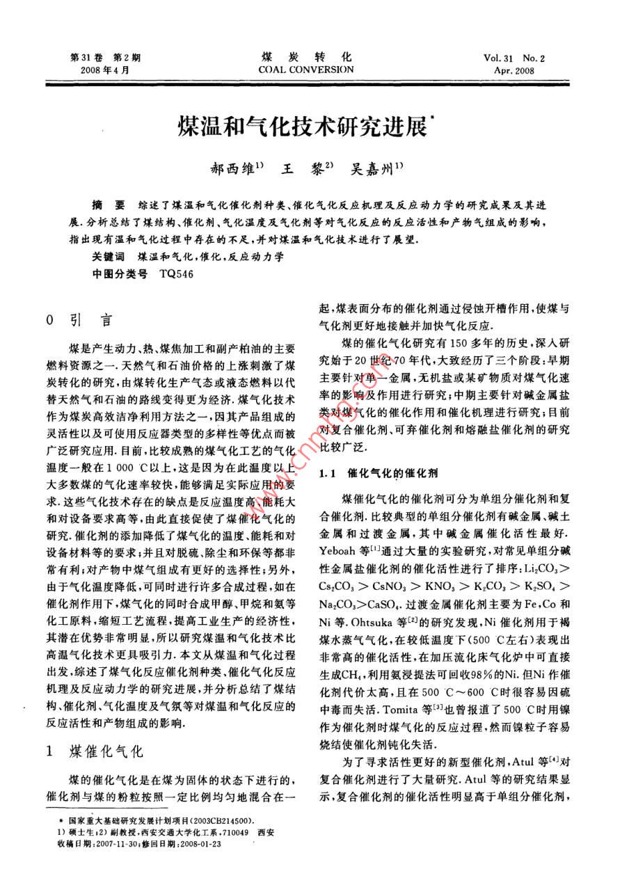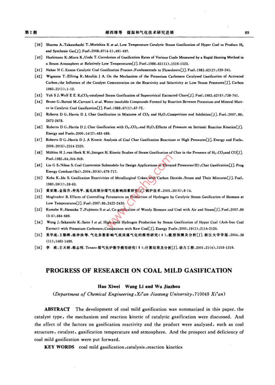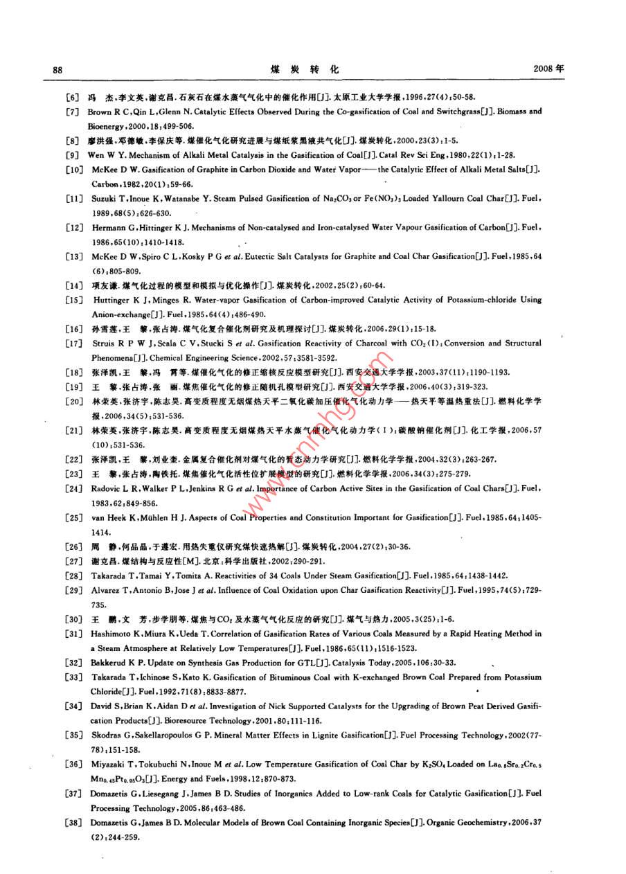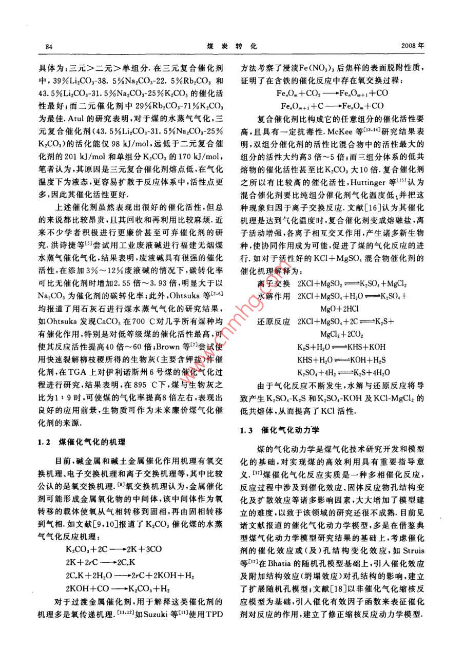 第31卷第2期煤炭轉(zhuǎn)化Vol.31 No.2008年4月COAL CONVERSIONApr. 2008煤溫和氣化技術(shù)研究進(jìn)展郝西維)王黎2) 吳嘉州”摘要綜述了煤溫和氣化催化劑種類、催化氣化反應(yīng)機(jī)理及反應(yīng)動(dòng)力學(xué)的研究成果及其進(jìn)展.分析總結(jié)了煤結(jié)構(gòu)、催化劑、氣化溫度及氣化劑等對(duì)氣化反應(yīng)的反應(yīng)活性和產(chǎn)物氣組成的影響,指出現(xiàn)有溫和氣化過程中存在的不足,并對(duì)煤溫和氣化技術(shù)進(jìn)行了展望.關(guān)鍵詞煤溫和氣化,催化,反 應(yīng)動(dòng)力學(xué)中圖分類號(hào)TQ546起,煤表面分布的催化劑通過侵蝕開槽作用,使煤與)引言氣化劑更好地接觸并加快氣化反應(yīng).煤是產(chǎn)生動(dòng)力、熱、煤焦加工和副產(chǎn)柏油的主要煤的催化氣化研究有150多年的歷史,深人研燃料資源之一.天然氣和石油價(jià)格的上漲刺激了煤究始于20世紀(jì)70年代,大致經(jīng)歷了三個(gè)階段:早期炭轉(zhuǎn)化的研究,由煤轉(zhuǎn)化生產(chǎn)氣態(tài)或液態(tài)燃料以代主要針對(duì)單- -金屬,無機(jī)鹽或某礦物質(zhì)對(duì)煤氣化速替天然氣和石油的路線變得更為經(jīng)濟(jì).煤氣化技術(shù)率的影響及作用進(jìn)行研究;中期主要針對(duì)堿金屬鹽作為煤炭高效潔凈利用方法之一,因其產(chǎn)品組成的類對(duì)煤氣化的催化作用和催化機(jī)理進(jìn)行研究;目前靈活性以及可使用反應(yīng)器類型的多樣性等優(yōu)點(diǎn)而被對(duì)復(fù)合催化劑、可棄催化劑和熔融鹽催化劑的研究廣泛研究應(yīng)用.目前,比較成熟的煤氣化工藝的氣化比較廣泛溫度一般在1 000 C以上,這是因?yàn)樵诖藴囟纫陨?.1催化氣化的催 化劑大多數(shù)煤的氣化速率較快,能夠滿足實(shí)際應(yīng)用的要求.這些氣化技術(shù)存在的缺點(diǎn)是反應(yīng)溫度高、能耗大煤催化氣化的催化劑可分為單組分催化劑和復(fù)和對(duì)設(shè)備要求高等,由此直接促使了煤催化氣化的合催化劑,比較典型的單組分催化劑有堿金屬、堿土研究.催化劑的添加降低了煤氣化的溫度.能耗和對(duì)金屬和過渡金屬,其中堿金屬催化活性最好.設(shè)備材料等的要求;并且對(duì)脫硫、除塵和環(huán)保等都非Yeboah等°通過大量的實(shí)驗(yàn)研究,對(duì)常見單組分堿常有利;對(duì)產(chǎn)物中煤氣組成有更好的選擇性;另外,性金屬鹽催化劑的催化活性進(jìn)行了排序:Li2CO32>由于氣化溫度降低,可同時(shí)進(jìn)行許多合成過程,如在Cs2CO:> CsNO3> KNO,> KLCO;> K:SO, >催化劑作用下,煤氣化的同時(shí)合成甲醇、甲烷和氨等Na2CO,>CaSO,.過渡金屬催化劑主要為Fe,Co和化工原料,縮短工藝流程,提高工業(yè)生產(chǎn)的經(jīng)濟(jì)性,Ni等. Ohtsuka等[2]的研究發(fā)現(xiàn),Ni催化劑用于褐其潛在優(yōu)勢(shì)非常明顯,所以研究煤溫和氣化技術(shù)比煤水蒸氣氣化,在較低溫度下(500C左右)表現(xiàn)出高溫氣化技術(shù)更具吸引力.本文從煤溫和氣化過程非常高的催化活性,在加壓流化床氣化爐中可直接出發(fā),綜述了煤氣化反應(yīng)催化劑種類.催化氣化反應(yīng)生成CH,利用氨浸提法可回收98%的Ni.但Ni作催機(jī)理及反應(yīng)動(dòng)力學(xué)的研究進(jìn)展,并分析總結(jié)了煤結(jié)化劑代價(jià)太高,且在500 C~600 C時(shí)很容易因硫構(gòu)、催化劑、氣化溫度及氣氛等對(duì)煤溫和氣化反應(yīng)的中毒而失活.Tomita等[]也曾報(bào)道了500C時(shí)用鎳反應(yīng)活性和產(chǎn)物組成的影響.作為催化劑時(shí)煤氣化的反應(yīng)過程,然而鎳粒子容易1煤催化氣化燒結(jié)使催化劑鈍化失活.為了尋求活性更好的新型催化劑,Atul等[]對(duì)煤的催化氣化是在煤為固體的狀態(tài)下進(jìn)行的,.復(fù)合催化劑進(jìn)行了大量研究.Atul等的研究結(jié)果顯催化劑與煤的粉粒按照- -定比例均勻地混合在一示 ,復(fù)合催化劑的催化活性明顯高于單組分催化劑,+國(guó)家重大基礎(chǔ)研究發(fā)展i計(jì)劃項(xiàng)月(2003CB214500).1)碩士生12)副教授,西安交通大學(xué)化工系,710049西安收稿日期:2007-11-30;修回8期:2008-01-2384煤炭轉(zhuǎn)化2008年具體為:三元>二元>單組分.在三元復(fù)合催化劑方法考察了浸漬Fe(NO3)3后焦樣的表面脫附性質(zhì),中,39%Li2CO3-38. 5%Na2CO3-22. 5%Rb2CO,和證明了在含鐵的催化反應(yīng)中存在氧交換過程:43. 5%Li2CO3-31. 5%Na2COs-25%K2COs的催化活Fe,Om +CO2一+Fe,Om+1+CO性最好;而二元催化劑中29%Rb2CO3-71%K2CO,Fe20m+1+C- +Fe,O. +CO為最佳. Atul的研究表明,對(duì)于煤的水蒸氣氣化,三復(fù)合催化劑比構(gòu)成它的任意組分的催化活性要元復(fù)合催化劑(43.5%Li2CO3-31. 5%Na2CO3-25%高,且具有一定抗毒性. McKee等13.14]研究結(jié)果表K2CO3)的活化能僅98 kJ/mol,遠(yuǎn)低于二元復(fù)合催明,雙組分催化劑的活性比混合物中的活性最大的化劑的201 kJ/mol和單組分K2CO3的170 kJ/mol,組分的活性大約高3倍~5倍;而三組分體系的低共筆者認(rèn)為,其原因是三元復(fù)合催化劑熔點(diǎn)低,在氣化熔物的催化活性甚至比K2CO3大10倍.復(fù)合催化劑溫度下為液態(tài),更容易擴(kuò)散于反應(yīng)體系中,活性點(diǎn)更之所以有比較高的催化活性,Huttinger等15認(rèn)為多,因此其催化活性更好.混合催化劑要比純組分催化劑氣化溫度低:并把這上述催化劑雖然表現(xiàn)出很好的催化活性,但總種現(xià