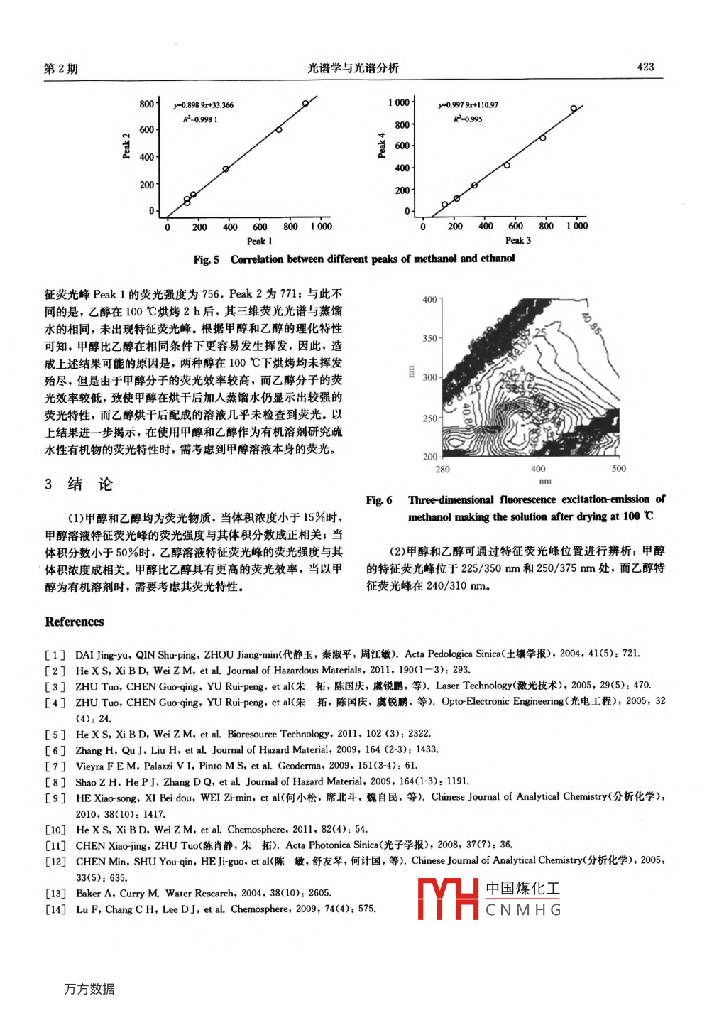 第32卷,第2期光譜學與光譜分析Vol.32,No.2,pp420-4242012年2月Spectroscopy and Spectral AnalysisFebruary, 2012甲醇和乙醇的三維熒光光譜特性研究卜貴軍1,2,何小松3,鄭小江12,艾訓儒12,石友香4湖北民族學院生物資源保護與利用湖北省重點實驗室,湖北恩施4450002.湖北民族學院生物科學與技術學院,湖北恩施450003.北京師范大學環(huán)境學院,北京1008754.成都理工大學環(huán)境與土木工程學院,四川成都610059摘要為闡明甲醇和乙醇的光譜學特性,建立兩者快速的辨析方法。采用三維熒光光譜,對甲醇和乙醇的熒光特性進行了研究。分析結果顯示,甲醇的三維熒光光譜中出現了兩個特征熒光峰,其熒光強度在甲醇體積濃度小于15%時與其濃度成正相關,乙醇的三維熒光光譜中出現了一個完整的特征熒光峰,其熒光強度在乙醇體積分數小于50%時與乙醇濃度成相關,甲醇比乙醇具有更高的熒光效率,以甲醇為有機溶劑研究化合物的熒光特性時,需要考慮甲醇的本底熒光。甲醇和乙醇的特征熒光峰位置差別較大,前者特征熒光峰出現在225/350m和250/375m處,而后者特征熒光峰位于240/310mm,據此可以有效辨析兩種醇。關鍵詞甲醇;乙醇;三維熒光光譜;辨析中圖分類號:Q632文獻標識碼:ADO:10.3964/.isn.10000593(2012)02042005有報道,有待進一步闡明?;诖?本研究采用三維熒光光引言譜,對甲醇和乙醇的結構特征進行表征,以其為二者的正確使用和快速檢測提供新的方法和技術手段甲醇和乙醇在特定波長激發(fā)光下均能產生熒光。作為有機溶劑,兩種醇常用于疏水性有機物結構表征和環(huán)境行為分1實驗部分析前的提取、分離和溶解過程:。當通過熒光分析手段研究這些疏水性有機物的理化特性時,需要首先闡明甲醇、乙L.1儀器與試劑醇二者本身熒光特性,以揭示其作為有機溶劑是否對體系分所用儀器為 PerkinElmer公司生產的 Luminescence析結果產生影響。此外,甲醇是一種劇毒物質,而乙醇是一 Spectrometer Ls55型熒光分光光度計。分析測試時熒光分種重要的食品和醫(yī)藥原料,但二者在色澤、氣味等諸多理化光光度計的激發(fā)光源為150W氙燈,PTM電壓700V,激發(fā)性質上卻又相似,致使將甲醇當成乙醇誤食而中毒的事件時(Ex)和發(fā)射(Em)光譜狹縫寬度均設定為10mm,掃描波長有發(fā)生。因此,通過現代光譜學技術,建立甲醇、乙醇高效范圍Ex=200~400mm,Em=280~500nm,掃描速度1200的辨析方法,對于正確使用甲醇和乙醇作為有機溶劑,提高mm·min1。飲食安全,都具有重要的意義所用甲醇和乙醇均為色譜純,蒸餾水為MliQ超純水朱拓等4先后采用紫外吸收光譜和熒光發(fā)射光譜對甲( Millipore,18.2Mn·cm)。醇和乙醇的光譜學特性進行了研究,建立了最長吸收波長和1.2方法熒光發(fā)射光譜中峰中心位置來區(qū)別甲醇和乙醇的方法。近年根據預實驗結果,將甲醇以0.1%,0.5%1%5%來,三維熒光光譜被廣泛應用于有機物結構組成的表征,相10%及15%的體積比溶于超純水,配置成不同體積分數的甲對于常規(guī)的熒光發(fā)射光譜,它能同時給出激發(fā)光譜發(fā)射光醇溶液;將乙醇以5%,10%,20%,30%,40%及50%的體譜熒光強度三者信息,更能全面反映出待檢有機物結構特積分數溶于超純水,配置不同濃度比的乙醇溶液,進行熒光征η,但采用三維熒光光譜研究甲醇和乙醇結構,目前鮮分析。此外,分別將50mL甲醇和乙醇盛在燒杯中,100℃收稿日期:2011-0513,修訂日期:20110820基金項目:國家自然科學基金項目(51078340)和北京師范大學優(yōu)秀博土學位論文培作者簡介:卜貴軍,1981年生,湖北民族學院生物科學與技術學院助教 e-mail:中國煤化工兼通訊聯系人 e-mail;hexs82@126.cmCNMHG第2期光譜學與光譜分析下烘干,然后在烘干的燒杯中各加入20mL超純水,測試溶在260mm附近。本研究對甲醇溶液的三維熒光光譜分析顯液的熒光特性。示,甲醇分子在275m處也能產生一個特征熒光峰,顯示1.3數據分析在該波長下甲醇分子也有較強吸收,進一步精確了甲醇溶液所有實驗數據分析均在 Microsoft excel2003和SPSS的最大吸收波長。相對于熒光發(fā)射光譜,三維熒光光譜能給16.0上進行出激發(fā)光譜發(fā)射光譜熒光強度的三維信息,因此更能精確地給出有機分子的光譜特征參數。2結果與討論甲醇分子的兩個特征熒光峰中,Peak1的熒光強度強于Peak2,這可能與Peak1處于低激發(fā)波長下,吸收能量較高2.1甲醇的三維熒光光譜特性有關。圖1顯示,當溶液中甲醇體積分數為0.1%,甲醇溶液已有對有機物三維熒光光譜的分析,主要從有機物特征的三維熒光光譜中Peak1的熒光強度已達到122.7,顯示甲熒光峰位置和峰強度進行的10。圖1為不同濃度條件下甲醇分子熒光效率較高,在較低濃度就能產生較強的熒光強醇溶液的三維熒光光譜圖,該圖顯示,不同濃度的甲醇溶液度,因此在利用甲醇作為溶劑分析有機物的熒光特性時,要在其三維熒光光譜中出現了兩個特征熒光峰:Peak1和特別考慮到甲醇分子本身的熒光特性。圖2顯示,在較低體Peak2,對應的熒光峰位置依次為225/350mm和250/375積分數下(<15%),甲醇分子兩個特征熒光峰熒光強度與溶nm。甲醇的分子結構中包含一個甲基和羥基,甲基的吸收波液體積分數成線性相關,并且Peak2與溶液中甲醇的體積濃長小于200mm,而羥基能吸收波長大于200m的紫外光,度相關性更好些(R2=0.9955),因此,可通過該峰熒光強度產生nx躍遷,致使分子處于不穩(wěn)定的激發(fā)態(tài),當分子從分析甲醇含量。但溶液中