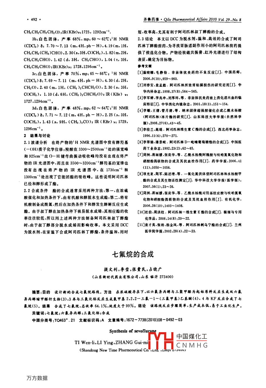 ●492●齊魯藥事●Qilu Pharmaceutical Affairs 2010 Vol. 29.No. 8CH,CH2CH2CH2(O) ;IR(KBr)v:1725, 1292cm-'.短.收率高,尤其有利于阿司匹林叔丁酵酯的合成。3b:白色固體,產(chǎn)率68%, mp: 60~ 62C;'H NMR2.3結論本文以DCC為脫水劑,溫和、高效的合成了阿司(CDCIL) 8; 7.70~7. 13 (m,4H, ph- H),4. 19(m, 1H. .匹林丁醇酯前藥,為尋找胃腸逍副作用小的阿司匹林前藥提CH,CH2(CH)CHO) , 2.30(s,3H,COCH).1.82(m,2H,供了侯選化合物.產(chǎn)物經(jīng)核磁共振普、紅外光譜進行了結構CH,CH2CHO), 1. 42 (d, 3H, CH.CH0), 1.04 (t, 3H,表征,確定為目標物。CH,CH2CH()) ;IR(KBr)v; 1728,1296cm-'.參考文獻3c:白色固體,產(chǎn)率70%。mp: 65~66C; 'H NMR[1]溫曉娜,毛靜怕。非甾體抗炎藥的不良反應[J].中國藥師,(CDCl)8:7.69~7.11 (m,4H, ph- H),4. 30(d, 2H,2006.9(10)r959~960.CH2(0), 2. 40 (m, 1H, (CH, ):CHCH20), 2. 30 (s, 3H,[2]劉春安,袁盂彪。阿司匹林所致胃粘膜損傷的研究近&[J].中華內(nèi)科雜志,1998,37(8) :564~565.COCH), 1. 10(d, 6H, (CH, )xCHCH20); IR(KBr) v:[3]李軍婷,李兆申,劉厚環(huán),等.非甾體抗費藥致上消化道出血的臨1727 ,1294cm^'.床特征[J].中華消化內(nèi)鏡雜志, 200118(3);151~ 154.3d;白色固體,產(chǎn)率48%, mp: 62 ~ 64C;'H NMR[4]李敏,王倩,管月清,等.納米固體超強酸催化合成乙酰水楊酸(CDCl)8:7.71~7. 12 (m,4H,ph - H),2. 25 (s, 3H,(阿司匹林)冰片酯的研究[J].山東科技大學學報(自然科學COCH), 1.43 (s, 9H, (CH, ),CO); IR (KBr) v; 1729,版),008.27(6),43~45.1296cm~'.[5]李桂蘭,高琨,阿司匹林維生素C脂的合成[J].西北藥學雜志,2結果與討論.1996.11(6):270~271.2.1波譜分析在終產(chǎn)物的'HNMR光譜圖中沒有醇羥基[6]李翠娟.潘景岐.阿司匹林D-吡晡葡萄糖階的合成[J].中國醫(yī)(-(H)質(zhì)子化學位移;羧酸在3300~2500cmI處的強寬峰藥T業(yè)雜志1992.23(2) :62~65.和925cm~出()-H鍵彎曲振動吸收峰均沒有出現(xiàn)在終產(chǎn)[7]周洲,蔣爾媛.張奕華,等。乙酰水楊酰阿魏酸與呋咱氳氧化鈞和物的IR光譜圖中.而且在3500~3200cm '醇羥基的寬鋒也硝酸酯偶聯(lián)物的合成及其抗血栓作用[J].藥學學報,2006,41(11);1050~ 1056.沒有出現(xiàn)在終產(chǎn)物的IR光譜圖中,在1730cm-' 和[8]項光亞,周軍,陳述增,等.一氧化氮供體型阿司匹林和水楊酸甲1300cm-1處出現(xiàn)了官能團酯的吸收峰。這些說明阿司匹林酶的合成及其生物話性測定[J].華中科技大學學報(醫(yī)學版),已經(jīng)和醇形成了酯。2007,36(1):23~26.2.2合成條件酯的合 成通常采用兩種方法:第一,在濃碗[9]周洲,蔣雨媛,張奕華,等。乙酰水楊酰對羥基桂皮酸與呋咱氮氧酸催化和加熱條件下,由有機酸和醇脫水生成酯;第二,將有化物和硝酸酯偶聯(lián)物的合成及其抗血栓作用[J].有機化學,機酸制備成酰氯,然后在加熱條件下和醇發(fā)生醇解反應生成2006,26( 10);1403~1408.酯。由于叔丁醇在加熱條件下極易脫水成烯,其相應酯的收[10]杜伯,周洪柱。阿司匹林-維生素E酶的合成[J].精細與專用率往往較低所以用上述兩種方法制備阿司匹林叔丁醇酯化學品,2006 ,4(8)20~22.時,由于叔丁醇部分脫水成烯而影響收率。本文采用DCC[11]袁才英,張濤,楊金風,等.阿司匹林刺烏寧酯的合成[J].蘭州為脫水劑在室溫下合成阿司匹林丁醉酯,條件溫和,用時醫(yī)學院學報,2002,28<4);22~23.七氟烷的合成提文利,李瑩,張貴民,占曉廣(山東斷時代藥業(yè)有限公司,山東臨沂273400)摘要:目的設計新的合成七氟烷路線。 方法在濃破酸存在下 ,以六氟異丙醇與三聚甲醛為起始原料反應生成雙六氟異丙醇縮甲醛衍生物(3),3再與三氯化鋁反應生成氯甲基2,2,2-三氟-1-(三氟甲基)乙基醚(4), 4與KF反應合成了七氟坑(5)。結果合成了七氟坑,總收率 64.1%,純度大于99%.結論該路線反應步驟簡單,生產(chǎn) 咸本低,易于工業(yè)化生產(chǎn).關鍵詞:七氟垸;六氟異丙醇;三氯化鋁;合咸中國分類號:T0463*.21文獻標識碼:A 文章編號:1672 - 7738(2010)08- 0492- -03Synthesis of sevoflurane中國煤化工T1 Wen-li,Ll Ying,ZHANG Gui-miCNMHG(Shandong New Time Pharmceutical Co. ,td ,Llnyi 2104U01●493●齊魯藥事. i Pemocrenial Aflain 2010 Yol 29.Ne8ASTRAC:OUECTvE To dein。oeo symheie route of solur METHODS Heloriopoal)formaldehyde deivatives (3)were sythenized from hexafluoriso propnol and metnformaldehyde in the presence of conentared oid of virioil .3 was cobined with Aluminun rchbride to produce clorometby- 2.2.2 uiuo 1- (iroetrethyl eher(),4was combined with ponsium luoride to produce svolurne(5).). RESULrS Seolurane were syhesired Theoeal yeid wa 64.1% and in puity w nore ha 9% CONCLUSION This sytheie route of srolurue hned tbe letures of simple poess,lower cost and idnriatioa marufecureKEY WORDS:Sevoflurane; Hexafluoroisopropanol;Aluminum素進行了考察。研究表明該方法成本低、反應條件溫和,并由于七氟烷具有快速失去知覺性與快速的恢復性這一e大規(guī)模工業(yè)化生產(chǎn)。當代吸入麻醉劑的理想特性,使它成為一種特別有效的吸入2實驗部分麻醉劑。目前已報道的七氟烷的合成方法主要有:美國專利2.1七氟烷的合成路線6100434報道了使用六氟異丙醇為原料,在無水三氧化鋁及三聚甲醛存在下生成氧甲基2.2.2-三氟-1-(三氟甲基)g.[ ryaaggo乙基醚,后者與金胸復化物以氟取代氟甲基的反應制備七氟paarare烷的方法I0.但該法存在下列技術難題:(1)反應過程為三F相反應,反應過程中固化,級難攪拌,從而造成后處理時易發(fā)生沖料現(xiàn)象,存在安全隱患(2)反應產(chǎn)物氟甲基2.2.2-三氟-1-(三氟甲基)乙基醚純度不高,雜質(zhì)較多。W(2008037039描述了以六氟異丙醇