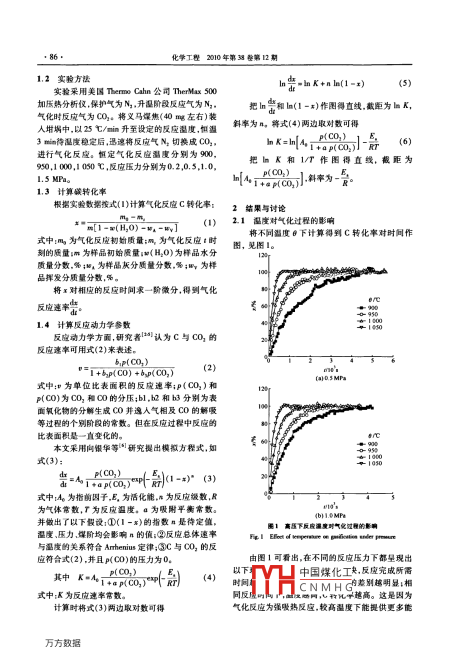 第38卷第12期化學(xué)工Vol 38 No 122010年12月CHEMICAL ENGINEERING( CHINA)Dec.2010煤焦加壓氣化反應(yīng)性研究曹敏2,王敏2,谷小虎3,樊崇,張愛民,諶倫建2(1.義馬煤業(yè)集團(tuán)股份有限公司,河南義馬472300;2.河南理工大學(xué)材料科學(xué)與工程學(xué)院,河南焦作4540003.中平能化集團(tuán),河南平頂山467000摘要:利用加壓熱分析儀測(cè)定了義馬煤焦的CO2氣化反應(yīng)性。結(jié)果表明:隨溫度的提高,義馬煤焦的反應(yīng)性和反應(yīng)速度呈增加趨勢(shì),與前期研究常壓下的情況一致;壓力對(duì)氣化反應(yīng)的促進(jìn)作用不明顯,且溫度對(duì)氣化過程的影響大于壓力;反應(yīng)速率在初始階段最大隨后逐漸減小。經(jīng)過動(dòng)力學(xué)計(jì)算表明:反應(yīng)速率與溫度的關(guān)系符合 arrhenius定律;反應(yīng)級(jí)數(shù)隨溫度增加而減小,近似于線性關(guān)系;煤焦活化能大約為60.02k/mol關(guān)鍵詞:煤焦;加壓氣化;反應(yīng)性;動(dòng)力學(xué)中圖分類號(hào):TQ533.5文獻(xiàn)標(biāo)識(shí)碼:A文章編號(hào):1005-9954(2010)12008504CO, gasification reactivity of coal char at elevated pressureCAO Min", WANG Min, GU Xiao-hu, FAN Chong, ZHANG Ai-min, CHEN Lun-jian1. Yima Coal Industry Group, Yima 472300, Henan Province, China; 2. School of MaterialsScience and Engineering, Henan Polytechnic University, Jiaozuo 454000, Henan Province, China3. Zhong Ping Energy Chemical Group, Pingdingshan 467000, Henan Province, China)Abstract: The CO, gasification reactivity of Yima coal chars was investigated by pressurized thermo gravimetricanalyzer. The results show that the gasification reactivity and rate increase with elevating temperature, whiaccords with the preliminary studies under atmospheric condition. Elevated pressure is beneficial to gasificaticreactivity, and the influence of temperature is stronger than that of pressure. The reaction rate is fast at initial stageand then declined. Kinetic parameters were discussed. The relationship between reaction rate and temperature isconsistent with Arrhenius law. Reaction order decreases when temperature increases, and the relationship is closeto linear. The activation energy of coal char is about 60. 02 kJ/ molKey words: coal char; pressurized gasification; reactivity; kinetics目前煤氣化技術(shù)成為現(xiàn)在煤化工產(chǎn)業(yè)的核心技1實(shí)驗(yàn)部分術(shù),這其中加壓煤氣化技術(shù)具有單臺(tái)處理能力大原料1.1樣品制備適應(yīng)性強(qiáng)氣化效率高,對(duì)環(huán)境友好等優(yōu)勢(shì),因此越來(lái)所選樣品煤為義馬躍進(jìn)礦煤,研磨至100目以越受到人們的關(guān)注l。研究煤種的加壓氣化反應(yīng)性對(duì)下,在馬弗爐內(nèi)制焦,以15-20℃/mn的速度升溫于氣化工藝的選擇和設(shè)計(jì)有著重要意義,本文利用加到900℃,恒溫1h。煤質(zhì)分析見表1。壓熱分析儀,研究了溫度和壓力對(duì)煤焦氣化過程的影響。表1躍進(jìn)煤煤質(zhì)分析Table 1 Proximate and ultimate analysis and coal ash fusibility of yuejin coal sample質(zhì)量分?jǐn)?shù)/%灰熔融點(diǎn)2℃工業(yè)分析①元素分析8.0528.9026.3936.6649.673.299.160.680.62127013201370下標(biāo)M為空氣燥基M為水分A為灰分y為揮發(fā)分為定V山中國(guó)煤化工度基金項(xiàng)目:義馬煤業(yè)集團(tuán)股份有限公司2008年重點(diǎn)科研項(xiàng)目(2008018)CNMHG作者簡(jiǎn)介:曹敏(1967—),男博士后副教授,研究方向?yàn)槊禾繗饣懊夯坎牧想娫?(0398)5898903,E-mul:dt,mcao@gu.com;王敏(1983-),女,碩士研究生,從事煤化工的研究,E-mail:hnjzwangmin@126.com。86化學(xué)工程2010年第38卷第12期1.2實(shí)驗(yàn)方法In =In K+n In(1-x)實(shí)驗(yàn)采用美國(guó) Thermo Cahn公司 TherMax500加壓熱分析儀,保護(hù)氣為N2,升溫階段反應(yīng)氣為N2,把ln和ln(1-x)作圖得直線截距為nK氣化時(shí)反應(yīng)氣為CO2。將義馬煤焦(40mg左右)裝入坩堝中,以25℃/min升至設(shè)定的反應(yīng)溫度,恒溫斜率為n。將式(4)兩邊取對(duì)數(shù)可得3min待溫度穩(wěn)定后,迅速將反應(yīng)氣N2切換成CO2InK=In p(CO,)E進(jìn)行氣化反應(yīng)。恒定氣化反應(yīng)溫度分別為900,1+ap(C02)」Rr把lnK和1/T作圖得直線,截距為950,1000,1050℃,反應(yīng)壓力分別為0.2,0.5,1.0,1.5 MPa4,EC01.3計(jì)算碳轉(zhuǎn)化率+ap(Cn)/,斜率為根據(jù)實(shí)驗(yàn)數(shù)據(jù)按式(1)計(jì)算氣化反應(yīng)C轉(zhuǎn)化率:2結(jié)果與討論xm[1-w(H2O)(1)2.1溫度對(duì)氣化過程的影響將不同溫度θ下計(jì)算得到C轉(zhuǎn)化率對(duì)時(shí)間作式中:m為氣化反應(yīng)初始質(zhì)量;m1為氣化反應(yīng)t時(shí)圖,見圖1??痰馁|(zhì)量;m為樣品初始質(zhì)量;(H2O)為樣品水分質(zhì)量分?jǐn)?shù),%;A為樣品灰分質(zhì)量分?jǐn)?shù)%;y為樣品揮發(fā)分質(zhì)量分?jǐn)?shù),%。將x對(duì)相應(yīng)的反應(yīng)時(shí)間求一階微分,得到氣化反應(yīng)速率1.4計(jì)算反應(yīng)動(dòng)力學(xué)參數(shù)平1050反應(yīng)動(dòng)力學(xué)方面研究者2認(rèn)為C與CO2的反應(yīng)速率可用式(2)來(lái)表述n=,,6(C2)1+b,P( CO)+63P(Co(2)/10s(a)0.5 MPa式中;為單位比表面積的反應(yīng)速率;p(CO2)和p(CO)為CO2和CO的分壓;b1,b和b3分別為表面氧化物的分解生成CO并逸入氣相及CO的解吸等過程的個(gè)別階段的常數(shù)。但在反應(yīng)過程中反應(yīng)的比表面積是一直變化的。8/t本文采用向銀華等6研究提出模擬方程式,如一900式(3):dxP(CO,)dt 1 +a(CO,(1-x)”(3)式中:A為指前因子,E為活化能n為反應(