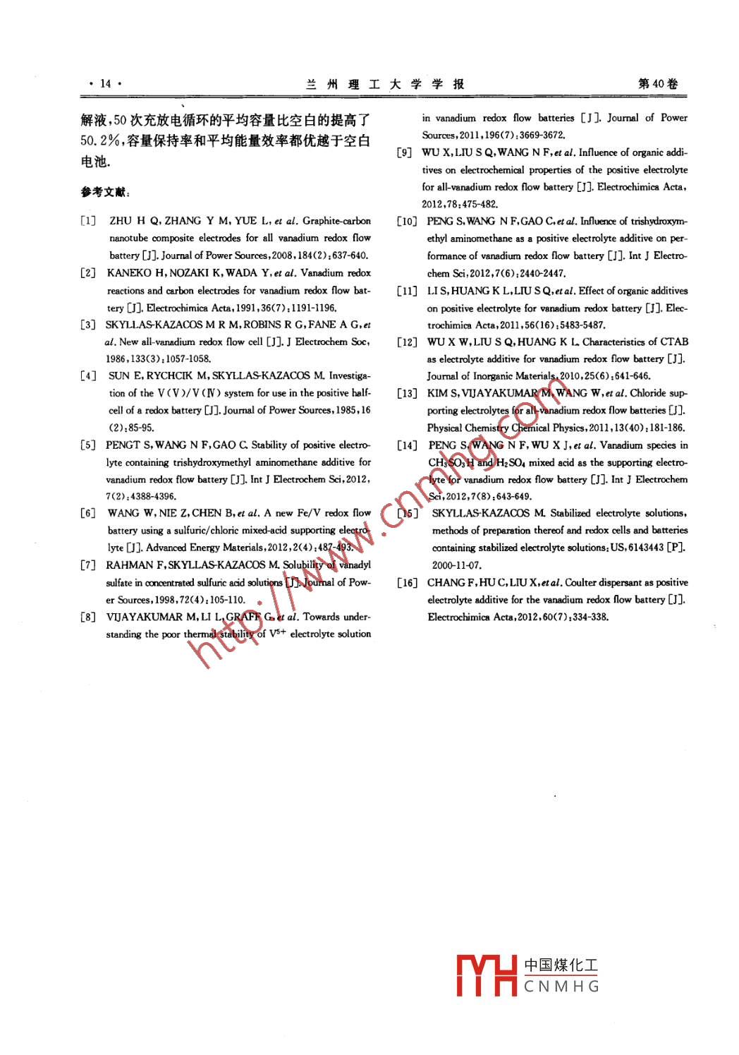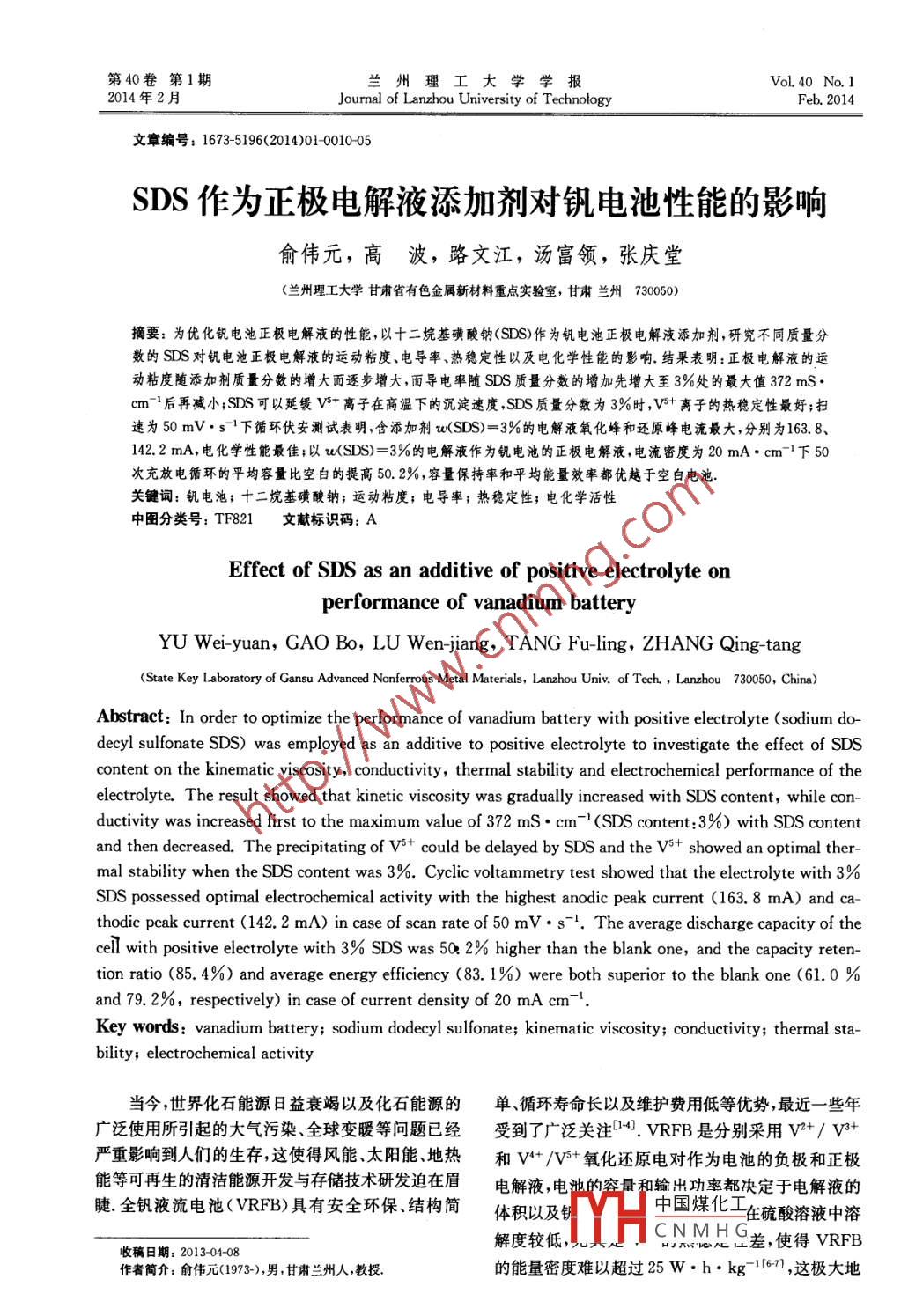 第40卷第1期蘭州理工大學學報Vol. 40 No. 12014年2月.Journal of Lanzhou University of TechnologyFeb. 2014文章編號: 1673-5196(2014)01 0010-05SDS作為正極電解液添加劑對釩電池性能的影響俞偉元,高波,路文江,湯富領(lǐng),張慶堂(蘭州理工大學甘肅省有色金屬新材料重點實驗室,甘肅蘭州730050)摘要:為優(yōu)化釩電池正極電解液的性能,以十二烷基磺酸鈉(SDS)作為釩電池正極電解液添加劑,研究不同質(zhì)量分數(shù)的SDS對釩電池正極電解液的運動粘度、電導(dǎo)率、熱穩(wěn)定性以及電化學性能的影響.結(jié)果表明:正極電解液的運動粘度隨添加劑質(zhì)量分數(shù)的增大而逐步增大,而導(dǎo)電率隨SDS質(zhì)量分數(shù)的增加先增大至3%處的最大值372 mS●cm- 1 后再減小;SDS可以延緩Vs+離子在高溫下的沉淀速度,SDS質(zhì)量分數(shù)為3%時,Vs+離子的熱穩(wěn)定性最好;掃速為50 mV.s 1下循環(huán)伏安測試表明,含添加劑w(SDS)=3%的電解液氧化峰和還原峰電流最大,分別為163. 8、142. 2 mA,電化學性能最佳;以w(SDS)=3%的電解液作為釩電池的正板電解液,電流密度為20 mA. cm-1下50次充放電循環(huán)的平均容量比空白的提高50. 2%,容量保持率和平均能量效率都優(yōu)越于空白電池.關(guān)鍵詞:釩電池;十二垸基磺酸鈉;運動粘度;電導(dǎo)率;熱穩(wěn)定性;電化學活性中圖分類號: TF821文獻標識碼: AEffect of SDS as an additive of positive electrolyte onperformance of vanadium batteryYU Wei yuan, GAO Bo, LU Wen: jiang, TANG Fu-ling, ZHANG Qing -tang(State Key Laboratory of Gansu Advanced Nonferrous Metal Materials, Lanzhou Univ. of Tech,,Lanzhou 730050, China)Abstract: In order to optimize the performance of vanadium battery with positive electrolyte (sodium do-decyl sulfonate SDS) was employed as an additive to positive electrolyte to investigate the effect of SDScontent on the kinematic viscosity, conductivity, thermal stability and electrochemical performance of theelectrolyte. The result showed that kinetic viscosity was gradully increased with SDS content, while con-ductivity was increased first to the maximum value of 372 mS●cm -1 (SDS content:3%) with SDS contentand then decreased. The precipitating of Vs+ could be delayed by SDS and the Vs+ showed an optimal ther-mal stability when the SDS content was 3%. Cyclic voltammetry test showed that the electrolyte with 3%SDS possessed optimal electrochemical activity with the highest anodic peak current (163. 8 mA) and ca-thodic peak current (142.2 mA) in case of scan rate of 50 mV●s '. The average discharge capacity of thecell with positive electrolyte with 3% SDS was 50. 2% higher than the blank one, and the capacity reten-tion ratio (85. 4%) and average energy efficiency (83. 1%) were both superior to the blank one (61.0 %and 79. 2%, respectively) in case of current density of 20 mA cm-'.Key words: vanadium battery; sodium dodecyl sulfonate; kinematic viscosity; conductivity; thermal sta-bility; electrochemical activity當今,世界化石能源日益衰竭以及化石能源的單、循環(huán)壽命長以及維護費用低等優(yōu)勢,最近一些年廣泛使用所引起的大氣污染、全球變暖等問題已經(jīng)受到了廣泛關(guān)注14. VRFB是分別采用V2+/ V+嚴重影響到人們的生存,這使得風能、太陽能地熱和V+/Vs+氧化還原電對作為電池的負極和正極能等可再生的清潔能源開發(fā)與存儲技術(shù)研發(fā)迫在眉電解液,電池的容量和輸出功率都決定于電解液的睫.全釩液流電池(VRFB)具有安全環(huán)保、結(jié)構(gòu)簡體積以及中國煤化工在硫酸溶液中溶解度較低HcNMH差,使得VRFBHM心心出差收稿日期: 2013-04-08作者簡介:俞偉元(1973-),男,甘肅蘭州人,教授.的能量密度難以超過25 W●h. kg-1[67],這極大地第1期俞偉元等:SDS作為正極電解液添加劑對釩電池性能的影響限制了VRFB更廣泛的應(yīng)用.充放電測試在CT2001A-10V/10A型電池測試儀在硫酸溶液中,Vs+是以水合離子[VOz(H2(LAND).上進行,采用靜態(tài)單電池.電極為石墨氈,O)3]+存在的,這種結(jié)構(gòu)在溫度高于40 C時會先質(zhì)隔膜為Nafion117陽離子交換膜.充放電電壓為0.7子化然后脫水縮合形成V2O,沉淀8.針對如何提~1.7 V,充放電電流密度為20 mA●cm-'.高V5+的熱穩(wěn)定性,近年來已經(jīng)有了很多報道.提高2結(jié)果與討論硫酸的濃度可以很好地抑制VOt二聚縮合成V2O+和V2O3+ ,從而抑制沉淀的生成,然而V2+,2.1 SDS對V4+/ V5+電解液UV-Vis的光譜影響V+和V*+在高酸度下的溶解度卻大大降低、容易圖1為加了質(zhì)量分數(shù)3%的SDS的V4+和V5+析晶”、十六烷基三甲基溴化銨[2]等最近,美國西電解液的UV-Vis圖譜,所有測試的電解液的V+北太平洋國家實驗室提出了鹽酸/硫酸混酸同作為和V5+濃度均為0. 01 mol/L,硫酸濃度為3 mol/L.支持電解液,中南大學劉素琴課題組也提出用硫酸/由圖可知,無論是V*+還是Vs+電解液,SDS的加人甲磺酸混酸作為支持電解液[4] ,這對提高釩離子的既沒有產(chǎn)生 新的紫外可見吸收峰,而且最大吸收峰溶解度以及Vs+的熱穩(wěn)定性都取得了不錯的效果.的位置也沒有偏移,這表明,少量SDS的加人并沒本研究中,選用了陰離子表面活性劑十二烷基有與釩離子發(fā)生反應(yīng)產(chǎn)生新的物質(zhì)[9],可以與V4+磺酸鈉( sodium dodecyl sulfonate, SDS)作為釩電和Vs+離子穩(wěn)定存在.池正極電解液的添加劑,研究不同含量的SDS對正2.4極電解液的電導(dǎo)率、粘度、熱穩(wěn)定性的影響,通過循2.0 [VO*電解液環(huán)伏安測試(CV)和充放電測試,分析SDS對電解.6一空 ,液電化學性能的影響.--- w(SDS)=3%1實驗).8 L以V2Os
