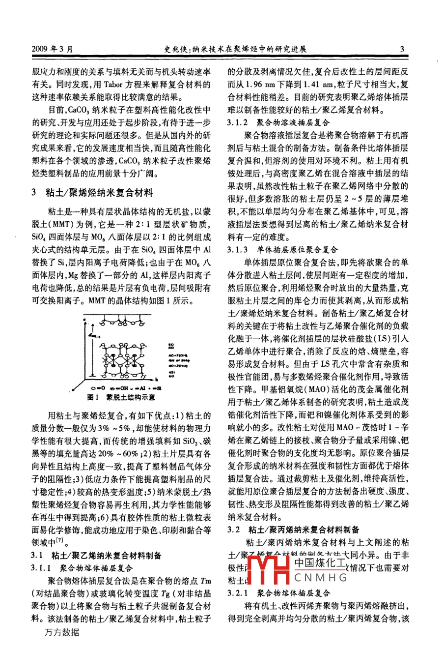 第32卷第3期化工科技市場(chǎng)2009年3月CHEMICAL TECHNOLOGY MARKET發(fā)展論壇納米技術(shù)在聚烯烴中的研究進(jìn)展史兆俠(中國(guó)石化股份有限公司北京燕山分公司塑料分公司,北京102500)摘要:綜述了聚烯烴納米復(fù)合材料的優(yōu)點(diǎn)、使用價(jià)值和近年來國(guó)內(nèi)外聚烯烴納米復(fù)合材料的研究進(jìn)展,并介紹了無機(jī)粒子/聚烯烴復(fù)合材料和粘土/聚烯烴復(fù)合材料,重點(diǎn)闡述了粘土與聚乙烯、聚丙烯納米復(fù)合材料的制備方法及粘土/聚烯烴納米復(fù)合材料插層熱力學(xué)分析,對(duì)目前聚烯烴納米復(fù)合材料存在問題及發(fā)展前景進(jìn)行了探討。關(guān)鍵詞:粘土;聚烯烴;納米復(fù)合材料中圖分類號(hào):TB33文獻(xiàn)標(biāo)識(shí)碼:A文章編號(hào):1009 -4725(2009)03 -0001 -05Advance in nano technology in polyolefinShi Zhaoxia(Plastic Company. ,Bejing Yanhua Petrochemical Co. ,Ld. ,SINOPEC ,Bejing 102500 ,China)were reviewed. Inorganic particle/ polyolefin nanocomposites and clay/ polyolefin nanocomposites were introduced. Prepara-tion of clay/PE ,clay/PP nanocomposites , and intercalation thermodynamic analysis were elaborated. Existed problems anddeveloping prospect were discussed.Key words:clay;polyolefin;nanocomposite增加塑料的密度,提高塑料的透光性、防水性、阻隔1聚合物納米 復(fù)合材料概述性耐熱性及抗老化性等功能特性,納米塑料在食品納米復(fù)合材料指復(fù)合物的分散相至少有一一相的特別是啤酒灌裝、肉類和奶酪制品的包裝材料市場(chǎng)一維尺寸達(dá)到納米級(jí)(1 ~ 100 nm)的材料,它被稱上潛力巨大。為21世紀(jì)最有前途的材料之一一。聚合物納米復(fù)合目前報(bào)道的聚合物納米復(fù)合材料分為兩大類,材料的研究起步較晚,但近年來發(fā)展迅速,引起高分一是與聚合物復(fù)合前粒子本身就是納米粒子,通過子科學(xué)領(lǐng)域的廣泛關(guān)注。對(duì)其改性,減少其團(tuán)聚的機(jī)會(huì),使粒子能夠在聚合物聚合物納米復(fù)合材料是以聚合物為基體(連續(xù)連續(xù)相中以納米級(jí)尺寸分散,最終得到納米復(fù)合材相)、無機(jī)粒子以納米尺度( < 100 nm)分散于基體料;二是與聚合物復(fù)合的材料是天然結(jié)構(gòu)為層狀的中的新型高分子復(fù)合材料。由于納米粒子的顆粒尺無機(jī)物,如蒙脫土、高嶺土等,在復(fù)合前粘土尺寸為寸很小、比表面積很大,約為100 m/g左右,具有表微米級(jí),通過對(duì)其有機(jī)化處理,使它的層狀結(jié)構(gòu)間距面效應(yīng)、體積效應(yīng)、量子尺寸效應(yīng)及宏觀量子隧道效變大,層狀穩(wěn)定性變差,與聚合物復(fù)合時(shí),聚合物或應(yīng),且聚合物具有密度低、強(qiáng)度高、耐腐蝕易加工等其單體能夠進(jìn)人到粘土的片層之間,通過聚合或剪諸多優(yōu)良特性,以及納米粒子帶來的納米效應(yīng)和納切破壞粘土的層狀結(jié)構(gòu),將其剝離成納米級(jí)的片層,米粒子與基體間的界面相互作用,使聚合物納米復(fù)無規(guī)” 中國(guó)煤化生連續(xù)相,最終得到合材料具有優(yōu)于相同組分常規(guī)聚合物復(fù)合材料的力納米學(xué)熱學(xué)性能,為制備高性能、多功能的新一代復(fù)合CHC NMH G方法歸納起來可分材料提供了可能,其在汽車及機(jī)械零部件、電子和電為以下5大類:①插層復(fù)合法,包括單體插人后聚合器部件、高性能管材、薄膜等領(lǐng)域中具有廣闊的應(yīng)用法(含插層縮聚和插層加聚)和聚合物插人法(含聚前景。同時(shí),由于納米粒子尺寸小透光率好,可以合物溶液插層和聚合物熔融插層) ;②原位復(fù)合法,2化工科技市場(chǎng)第32卷第3期包括就地形成填充物法(溶膠一凝膠法)和原位聚產(chǎn)生很多的銀紋,吸收沖擊能。納米粒子與基體脫合法;③超微粒子直接分散法,包括溶液共混、乳液黏前,在受到外界拉伸應(yīng)力時(shí),基體對(duì)納米粒子的作共混、熔融共混和機(jī)械共混;④分子復(fù)合形成法;用力在兩極為拉應(yīng)力,在赤道位置則為壓應(yīng)力。同⑤其他方法。目前除插層復(fù)合法外,其他幾種方法時(shí)由于力的相互作用,球粒附近位置的基體樹脂也尚沒有工業(yè)化。受到來自納米級(jí)CaCO3粒子的反作用力,3個(gè)軸向隨著現(xiàn)代聚烯烴工業(yè)的飛速發(fā)展,聚乙烯應(yīng)力的協(xié)同作用有利于基體的屈服。此外,界面脫(PE)、聚丙烯(PP)以及其他乙烯基聚合物已發(fā)展黏后,粒子周圍形成空穴,由應(yīng)力分析可知,空穴應(yīng)成為當(dāng)今世界上份額最大的合成樹脂產(chǎn)品,在各行力為拉應(yīng)力,其大小為原基體應(yīng)力的3倍,因此,當(dāng)各業(yè)中發(fā)揮著日益重要的作用。然而通用聚烯烴樹基體樹脂應(yīng)力尚未達(dá)到其屈服應(yīng)力時(shí),局部就已經(jīng)脂普遍存在強(qiáng)度低、耐熱性差和阻隔性能不夠好等開始產(chǎn)生屈服。上述應(yīng)力集中和界面脫黏產(chǎn)生的基缺點(diǎn),將無機(jī)納米粒子或粘土(主要為層狀硅酸鹽)體屈服均需消耗更多的能量,從而使得納米級(jí)以納米尺度分散于聚烯烴基體中,可以充分發(fā)揮無CaCO,對(duì)聚烯烴有顯著的增韌作用。機(jī)納米粒子與聚烯烴樹脂各自的特性,制備性能優(yōu)但由于無機(jī)納米顆粒具有極高的表面能,有很.異的粘土/聚烯烴納米復(fù)合材料。國(guó