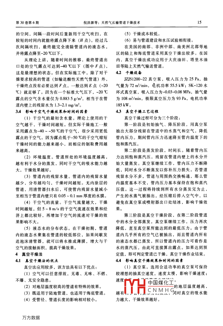 第30卷第6期石油工程建設(shè)★沖(()(《*《科單*的)白《)神))沖*片料增片料天然氣長輸管道干燥技術(shù)項(xiàng)目來源:西氣東輸管道分公司科學(xué)研究與技術(shù)開發(fā)項(xiàng)目,編號(hào):XQDs012示*小*小*小*小**小水小*沙*小*示*小*小**小*小**習(xí)小公*小水習(xí)**小分*小小**)*小*分*小*習(xí)**小*小小*)倪洪賑,孫樹山(遼河石油勘探局油建一公司,遼寧盤錦124120)摘要:簡(jiǎn)要介紹了天然氣長輸管道干燥技術(shù)概況,列舉了國內(nèi)天然氣長輸管道干燥處理的實(shí)例,對(duì)管道的幾種干燥方法進(jìn)行了比較,著重介紹了目前應(yīng)用較多的干空氣干燥法和真空干燥法,就這兩種方法的優(yōu)點(diǎn)、工藝原理、工藝流程、所用設(shè)備以及影響干燥效果和時(shí)間的因素進(jìn)行了論述。關(guān)鍵詞:天然氣長輸管道;干空氣干燥;真空干燥;技術(shù)中圖分類號(hào):TE973.8文獻(xiàn)標(biāo)識(shí)碼:A文章編號(hào):1001-2206(2004)06-0013-041天然氣長輸管道干燥技術(shù)概況氣體,當(dāng)壓力降低到環(huán)境溫度對(duì)應(yīng)的飽和水蒸氣為了排除新建天然氣長輸管道的隱患和缺陷,壓時(shí),液態(tài)水會(huì)在常溫下沸騰蒸發(fā),水蒸氣被真投產(chǎn)前必須進(jìn)行試壓,用水作介質(zhì)進(jìn)行管道試壓空泵抽出,達(dá)到管內(nèi)除水干燥的目的時(shí),試壓清管后管道內(nèi)仍有少量水。在投產(chǎn)前如國外天然氣長輸管道干燥技術(shù)起步很早,發(fā)果不進(jìn)行干燥,則易造成管道冰堵,影響輸氣質(zhì)展也較為迅速,但在我國應(yīng)用相對(duì)較晚,因?yàn)橐粤?。因?天然氣長輸管道在投產(chǎn)前必須進(jìn)行干前對(duì)天然氣長輸管道內(nèi)液態(tài)水和水蒸氣的危害燥處理。目前,干燥的方法主要有干燥劑法、流直沒有足夠的認(rèn)識(shí),上世紀(jì)90年代以前建成的天動(dòng)氣體蒸發(fā)法和真空法等。然氣長輸管道在投產(chǎn)前是不進(jìn)行干燥的。90年代干燥劑法一般是釆用甲醇、乙二醇或三甘醇以后,隨著長輸管道建設(shè)水平的提高,以及大口作為干燥劑,這些干燥劑和水可以任意比例互溶,徑、高壓、大排量天然氣長輸管道的建設(shè),逐漸所形成的溶液中水的蒸氣壓大大降低,從而達(dá)到認(rèn)識(shí)到管道干燥的必要性,并對(duì)后來建成的幾條干燥的目的。殘留在管道內(nèi)的干燥劑同時(shí)又是水重要管道進(jìn)行了干燥處理。如:1992年建成的上合物抑制劑,能抑制水合物的形成。在實(shí)際應(yīng)用海平湖海底輸氣管道,內(nèi)直徑334mm,長388過程中,采用天然氣或氮?dú)庾鳛橥苿?dòng)力,在兩個(gè)km,全線采用了凝膠清管器夾帶三甘醇的干燥方清管器間夾帶一定體積的干燥劑,從而達(dá)到徹底法進(jìn)行干燥;1993年建成的海南崖城13-1天然氣脫水干燥的目的,這種方法就是國外常用的“兩輸送管道,管直徑711mm,長778km,全線采用球法”。在“兩球法”的基礎(chǔ)上,國外又發(fā)展了了真空法進(jìn)行干燥;1997年建成的陜一京輸氣管“三球法”,與“兩球法”相比,“三球法”能使道,采用甲醇干燥法進(jìn)行干燥,干燥不徹底,效殘留在管內(nèi)壁上的液膜中干燥劑的濃度更高,且果不太理想,導(dǎo)致后來發(fā)生水合物冰堵;2000年干燥劑損耗量更小。京一石輸氣管道,管直徑526mm,長300km,全流動(dòng)氣體蒸發(fā)法的原理是:流動(dòng)的干燥氣體線采用干空氣干燥;2001年建成的澀一寧一蘭輸在管道內(nèi)與殘留在管內(nèi)壁及低洼處的水接觸后使氣管道,其中9.5km試驗(yàn)段采用了干空氣法進(jìn)行水蒸發(fā),達(dá)到干燥的目的。這種氣體可以是干燥干燥;2002年建成的滄一淄輸氣管道,全線采用的空氣、氮?dú)饣蛱烊粴?所以流動(dòng)氣體蒸發(fā)法又了干空氣法進(jìn)行干燥;2003年,西氣東輸管道工可以分為干空氣干燥法、氮?dú)飧稍锓ê吞烊粴飧沙痰闹袊夯?016mm,長燥法。1573CNMHG,最終露點(diǎn)為-20真空干燥法是利用真空泵抽吸密閉容器內(nèi)的℃,干燥效果很好;2004年6月,西氣東輸管道石油工程建設(shè)2004年12月工程西段(輪南一靖邊),長2363km,全線采用km;二是2002年建成的俄羅斯一土耳其的藍(lán)色氣干空氣干燥,最終露點(diǎn)為-22℃,干燥效果更好。流工程( Blue Stream Project Pipeline);它是兩條直2幾種干燥方法的比較徑610mm、深1000m的海底管道,每條長350天然氣長輸管道干燥方法多種多樣,且每種km,全線采用了干空氣干燥。干燥方法又有其優(yōu)缺點(diǎn),表1是各種干燥方法的在國內(nèi),干空氣干燥法成功應(yīng)用于京一石、比較。通過對(duì)幾種方法的干燥成本、干燥時(shí)間、澀一寧一蘭、滄一淄、西氣東輸?shù)忍烊粴廨斔凸芨稍镄Ч?、適應(yīng)情況的比較,可以看出,干空氣道。干燥法和真空干燥法具有較多的優(yōu)點(diǎn),且應(yīng)用較32干燥設(shè)備多。因此,下面對(duì)這兩種方法進(jìn)行介紹。高中壓一體機(jī):排量4200~4500m3/h,最表1幾種干燥方法的比較大壓力l5MPa;大排量空壓機(jī):排量7600m3/h流動(dòng)氣體蒸發(fā)法最大壓力15MPa,附帶配套增壓機(jī),最大壓力可干燥方法干燥劑法干空氣氮?dú)馓烊粴?真空達(dá)8MPa;無熱再生空氣干燥器和微熱再生空氣干干燥法干燥法干燥法干燥法燥器:排量均為100-180m3/min,最低露點(diǎn)均干燥成本比較高|最低昂貴較低為-45℃;大排量真空