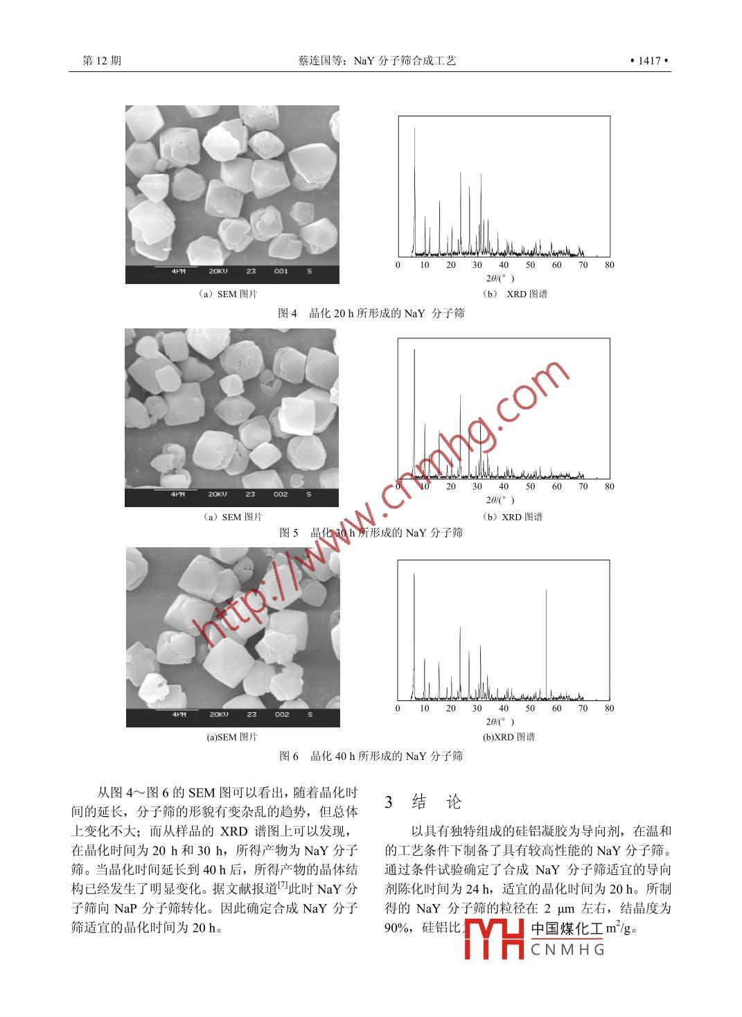 化工進(jìn)展2006年第25卷第12期CHEMICAL INDUSTRY AND ENGINEERING PROGRESS·1415r Coe研究開(kāi)發(fā)NaY分子篩合成工藝蔡連國(guó),許永權(quán),陳建峰,邵磊(北京化工大學(xué)納米材料先進(jìn)制備技術(shù)與應(yīng)用科學(xué)教育部重點(diǎn)實(shí)驗(yàn)室,北京1029)摘要:報(bào)道了以具有獨(dú)特組成的硅鋁凝膠為導(dǎo)向劑制備N(xiāo)aY分子篩的方法。所合成的NaY分子篩用SEM、XRD和BET等進(jìn)行了表征,結(jié)果表明,該NaY分子篩粒徑2μm左右,硅鋁比n(SiO2)m(Al2O3)為328,結(jié)晶度90%,比表面積703m3g。除晶化過(guò)程外,該合成NaY分子篩的工藝過(guò)程均在室溫下進(jìn)行,具有反應(yīng)條件溫和,易于調(diào)控的特點(diǎn)關(guān)鍵詞:NaY分子篩;晶化;合成中圖分類(lèi)號(hào):TQ424.2文獻(xiàn)標(biāo)識(shí)碼:A文章編號(hào):1000-6613(2006)12-1415-04Synthesis of NaY molecular sieveCAl Lianguo, XU Yongquan, CHEN Jianfeng, SHAO Lei(Key Lab for Nanomaterials, Ministry of Education, Beijing University of Chemical Technology, Beijing 100029, China)Abstract: A novel method for the preparation of NaY molecular sieve by using a Si-Al gel with specialcomposition as the directing agent was presented. The as-synthesized Nay molecular sieve wascharacterized with SEM, XRD and BET. The NaY molecular sieve had a particle size of approximately2um, n(SiO2 )/n(Al2O3)of 3.28, crystallinity of 90% and specific surface area of 703 m/g. Except thecrystallization process, the synthesis of the NaY molecular sieve was conducted at room temperatureunder mild and controllable reaction conditionsKey words: NaY molecular sieve; crystallization; synthesisY分子篩作為一種重要的催化劑和吸附分離12表征手段劑,廣泛應(yīng)用于石油的加氫裂化、流化催化裂化、用XRD-6000(日本理學(xué))表征晶體結(jié)構(gòu),CuK苯的烷基化等反應(yīng)。NaY分子篩的合成技術(shù)不輻射,管電壓40kV,管電流100mA,掃描范圍50斷發(fā)展。程志林等凹報(bào)道了微波誘導(dǎo)快速合成納米70°ⅹRD淶算NaY分子篩硅鋁比NaY分子篩,有文獻(xiàn)報(bào)道用感應(yīng)加熱法制備N(xiāo)aY[n(SO2)/n(AlO3)和結(jié)晶度。硅鋁比測(cè)定方法為:分子篩等。在眾多報(bào)道的合成方法中,有實(shí)用價(jià)按照中華人民共和國(guó)石油化工行業(yè)標(biāo)準(zhǔn)SHT0339值的是使用硅膠或水玻璃為硅源的水熱合成法?!?2計(jì)算NaY分子篩的晶胞常數(shù),然后把晶胞常本工作以具有獨(dú)特組成的硅鋁凝膠為導(dǎo)向劑,在數(shù)代入經(jīng)驗(yàn)公式計(jì)算NaY分子篩硅鋁比。NaY分溫和的工藝條件下制備了NaY分子篩子篩結(jié)晶度測(cè)定法參照中華人民共和國(guó)石油化工行1試驗(yàn)部分業(yè)標(biāo)準(zhǔn)SHT0340925用氮?dú)忪o態(tài)吸附法測(cè)定分子篩比表面積,儀器型號(hào)為ASAP2010。用掃描電11原料鏡觀察NaY分子篩的形貌與粒徑,所用儀器為工業(yè)NaY分子篩,蘭州石化煉油廠生產(chǎn);偏硅酸鈉,分析純,國(guó)藥集團(tuán)化學(xué)試劑有限公司的產(chǎn)品;收稿日期206-07-19:修改稿日期2006-10-18。鋁酸鈉,化學(xué)純,北京化學(xué)試劑公司的產(chǎn)品;氫氧基金項(xiàng)目國(guó)家973計(jì)劃(204c294)和中國(guó)石油天然氣股份有限公司科技開(kāi)發(fā)項(xiàng)化鈉,分析純,北京世紀(jì)紅星化工有限責(zé)任公司的第一作者簡(jiǎn)介蔡連國(guó)(978-),男,碩土研究生。聯(lián)系人邵磊,產(chǎn)品“TH中國(guó)煤化工ueouCNMHG1416·化工進(jìn)2006年第25卷Cambridge Instruments E5431構(gòu)導(dǎo)向作用都會(huì)減弱。因此可以確定合成NaY分1.3實(shí)驗(yàn)步驟子篩的適宜陳化時(shí)間為24hNaY分子篩按照?qǐng)D1所示的工藝進(jìn)行制備。向劑配制混合晶化NaY分子篩母液配制圖1NaY分子篩制備工藝流程圖1.3.1導(dǎo)向劑的配制將偏硅酸鈉配制成質(zhì)量濃度為20%的溶液,然0.2后與預(yù)先配制好的鋁酸鈉和氫氧化鈉的混合溶液強(qiáng)圖2不同陳化時(shí)間所得產(chǎn)物的XRD譜圖烈混合10min,混合完畢,在室溫下陳化一定時(shí)間得到硅鋁凝膠導(dǎo)向劑。導(dǎo)向劑的典型組成為:22晶化時(shí)間對(duì)NaY分子篩結(jié)晶度的影響95Na2O·Al2O3·10SiO2·720H2O在導(dǎo)向劑組成為95Na2O·A2O3·10SiO2·7201.3.2母液的配制H2O、母液組成為25Na2O·Al2O34SiO2·240H2O、將偏硅酸鈉配制成質(zhì)量濃度為30%的溶液,與陳化時(shí)間為24h的條件下,考察了晶化時(shí)間對(duì)NaY預(yù)先配制好的鋁酸鈉和氫氧化鈉的溶液在燒杯中混分子篩結(jié)晶度的影響,結(jié)果如圖3所示。合10min,得到反應(yīng)液母液。母液的典型組成為2.5Na2O·Al2O3·4SiO2·240H2O。1.3.3導(dǎo)向劑和母液的混合與晶化將母液與陳化后的導(dǎo)向劑置于塑料容器中,混合液典型組成:6Na2O·Al2O3·7SO2·480H2O。趙唱識(shí)要將混合液強(qiáng)烈混合20min,然后在室溫下陳化24h,48%陳化完畢在100℃下晶化若干小時(shí)得產(chǎn)品混合液1.3.4晶化產(chǎn)物的洗滌與焙燒將得到的產(chǎn)品混合液迅速用去離子水洗滌至晶化時(shí)間hpH<9,然后放入烘箱在100℃烘干,烘干后的產(chǎn)圖3NaY分子篩結(jié)晶度隨晶化時(shí)間的變化物置于馬弗爐中在350℃焙燒3h,得NaY分子篩產(chǎn)品。從圖3可見(jiàn),隨著晶化時(shí)間延長(zhǎng),NaY分子篩2結(jié)果與討論的結(jié)晶度逐漸增加,晶化時(shí)間為20h,結(jié)晶度為90%,用BET法測(cè)得其比表面積為703m2/g,用2.1導(dǎo)向劑陳化時(shí)間對(duì)分子篩質(