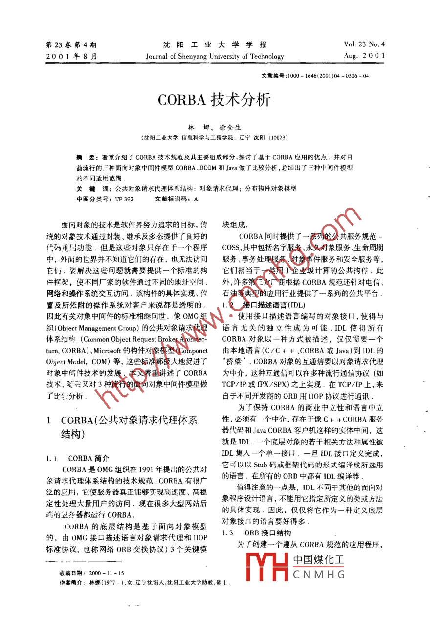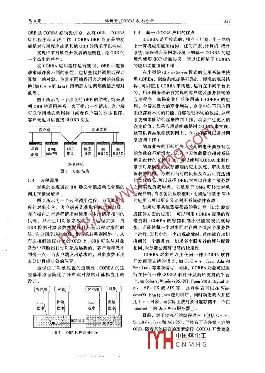 第23卷第4期沈陽(yáng)工業(yè)大學(xué)學(xué)報(bào)Vol. 23 No. 42001年8月Journal of Shenyang University of TechnologyAug.200 1文章編號(hào):1000 - 1646<2001 )04 -0326 -04.CORBA技術(shù)分析林娜,徐全生(沈陽(yáng)工業(yè)大學(xué)信息科學(xué)與工程學(xué)院,遼中沈陽(yáng)10023)摘要:著重介紹了CORBA技術(shù)規(guī)范及其主要組成部分.探討了基于CORBA應(yīng)用的優(yōu)點(diǎn)。并對(duì)目前流行的三種面向?qū)ο笾虚g件模型CORBA.DCOM和Java做了比較分析,總結(jié)出了三種中間件模型的不同適用范圍關(guān)鍵詞:公共對(duì)象請(qǐng)求代理體 系結(jié)構(gòu);對(duì)象請(qǐng)求代理;分布構(gòu)件對(duì)象模型中圍分類號(hào): TP 393文獻(xiàn)標(biāo)識(shí)碼: A面問對(duì)象的技術(shù)是軟件界努力追求的目標(biāo),傳塊組成.統(tǒng)的對(duì)象技術(shù)通過封裝.繼承及多態(tài)提供了良好的CORBA同時(shí)提供了一系列的公共服務(wù)規(guī)范-代碼重用功能,但是這些對(duì)象只存在于一個(gè)程序CosS,其中包括名字服務(wù)、永久對(duì)象服務(wù)、生命周期中,外面的世界并不知道它們的存在,也無(wú)法訪問服務(wù)、事務(wù)處理服務(wù)、對(duì)象事件服務(wù)和安全服務(wù)等,它們,戮解決這些問題就需要提供一個(gè)標(biāo)準(zhǔn)的構(gòu)它們相當(dāng)于-類用于企業(yè)級(jí)計(jì)算的公共構(gòu)件.此件框架,使不同廠家的軟件通過不同的地址空間、外,許多第三方廠商根據(jù)CORBA規(guī)范還針對(duì)電信、網(wǎng)絡(luò)和操作系統(tǒng)交互訪問,該構(gòu)件的具體實(shí)現(xiàn)、位石油等典型的應(yīng)用行業(yè)提供了-系列的公共平臺(tái).置及所依附的操作系統(tǒng)對(duì)客戶來(lái)說(shuō)都是透明的.1.2 接口描述語(yǔ)言(IDL)因此有關(guān)對(duì)象中間件的標(biāo)準(zhǔn)相繼問世,像OMC組使用接U描述語(yǔ)言編寫的對(duì)象接口,使得與織(Object Management Croup)的公共對(duì)象請(qǐng)求代理語(yǔ)言無(wú)關(guān)的獨(dú)立性成為叮能.IDL 使得所有.體系結(jié)構(gòu)(Common Object Request Broker Architec-CORBA對(duì)象以一種方式被描述,僅僅需要- -個(gè)ture, CORBA)、Microsoft的構(gòu)件對(duì)象模型(Componet由本地語(yǔ)言(C/C+ +、CORBA或Java)到IDL的Object Model, COM)等,這些標(biāo)準(zhǔn)都極大地促進(jìn)了“橋槊”. CORBA對(duì)象的互通信要以對(duì)象請(qǐng)求代理對(duì)象中間件技術(shù)的發(fā)展,本文著重講述了CORBA .為中介,這種互通信可以在多種流行通信協(xié)議(如技術(shù),貿(mào)后又對(duì)3種流行的面向?qū)ο笾虚g件模型做TCP/IP或IPX/SPX)之上實(shí)現(xiàn).在TCP/IP上,來(lái)了比車:分析.自于不同開發(fā)商的0RB用IIOP協(xié)議進(jìn)行通訊.為了保持CORBA的商業(yè)中立性和語(yǔ)言中立1 CORBA(公共對(duì)象請(qǐng)求代理體系性,必須有個(gè)中介,存在于像C+ + CORBA服務(wù)結(jié)構(gòu))器代碼和Java CORBA客戶機(jī)這樣的實(shí)體中間,這就是IDL.一個(gè)底層對(duì)象的若干相關(guān)方法和屬性被IDL集入一個(gè)單一接口。一旦IDL接口定義完成,.1.1 C0RBA簡(jiǎn)介CORBA是OMG組織在1991年提出的公共對(duì)它可以以Stub碼或框架代碼的形式編譯成所選用象請(qǐng)求代理體系結(jié)構(gòu)的技術(shù)規(guī)范.CORBA有很廣的語(yǔ)言.在所有的ORB中都有IDL編譯器.泛的應(yīng)用,它使服務(wù)器真正能夠?qū)崿F(xiàn)高速度、高穩(wěn)值得注意的-一點(diǎn)是, IDL不同于其他的面向?qū)Χㄐ蕴幚泶罅坑脩舻脑L問?,F(xiàn)在很多大型網(wǎng)站后象程序設(shè)計(jì)語(yǔ)言,不能用它指定所定義的類或方法的具體實(shí)現(xiàn).因此,僅僅將它作為一種定義底層.端的服行器都運(yùn)行CORBA,CORBA的底層結(jié)構(gòu)是基于面向?qū)ο竽P蛯?duì)象接口的語(yǔ)言要好得多.的,由UMC接口描述語(yǔ)言對(duì)象請(qǐng)求代理和1I0P1.3ORB接口結(jié)構(gòu)標(biāo)準(zhǔn)協(xié)議,也稱網(wǎng)絡(luò)ORB交換協(xié)議) 3個(gè)關(guān)鍵模為了創(chuàng)建一個(gè)遵從CORBA規(guī)范的應(yīng)用程序,中國(guó)煤化工收騙日期: 200-11-1515MHCNMHG作者簡(jiǎn)介:林娜(1977-),女 ,遼寧沈陽(yáng)人,沈陽(yáng)工業(yè)大學(xué)助教,碩t: .第4期林娜等:CORBA技術(shù)分析327ORB是CORBA必須提供的.沒有ORB, CORBA1.5 基于OCRBA應(yīng)用的優(yōu)點(diǎn)應(yīng)用程序就無(wú)法T作.CORBAORB最顯著的功CORBA是開放式的、獨(dú)立于商、用于網(wǎng)絡(luò)能是對(duì)應(yīng)用程序或是其他ORB的請(qǐng)求予以響應(yīng),上計(jì) 算機(jī)應(yīng)用底層結(jié)構(gòu).任何廠家、計(jì)算機(jī)操作實(shí)現(xiàn)細(xì)節(jié)對(duì)軟件開發(fā)者的透明性,是ORB的系統(tǒng)、編程語(yǔ)言及網(wǎng)絡(luò)環(huán)境下的基于CORBA的應(yīng)一個(gè)杰出的特性.用均使用IIOP標(biāo)準(zhǔn)協(xié)議,所以任何基于CORBA在CORBA應(yīng)用程序運(yùn)行期間,ORB可能被的應(yīng)用均能協(xié)同工作.請(qǐng)求做許多不同的事性,包括查找并調(diào)用遠(yuǎn)程計(jì)在小型的Client/Server 模式的應(yīng)用系統(tǒng)中使算機(jī)上的對(duì)象、負(fù)責(zé)不同編程語(yǔ)言之間的參數(shù)轉(zhuǎn)用CORBA,能給系統(tǒng)提供可靠的、標(biāo)準(zhǔn)的底層結(jié)換(如C+ +到Java)、用動(dòng)態(tài)方法調(diào)用激活遠(yuǎn)程