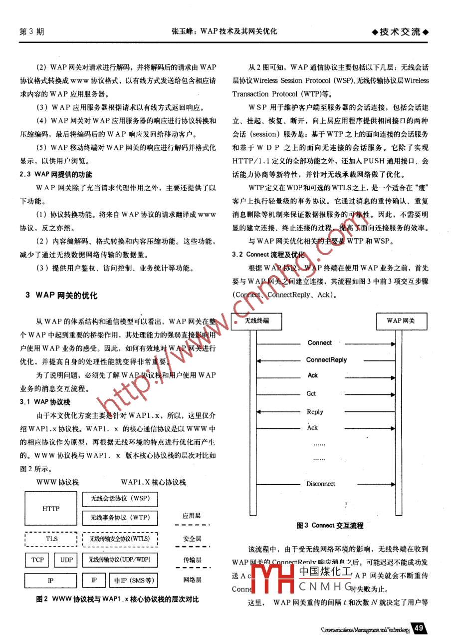 通信管理與技術◆技術交流◆2007年6月第3期WAP技術及其網(wǎng)關優(yōu)化張玉峰1910101(中國移動通信集團黑龍江有限公司,哈爾濱150086)摘要:介紹了WAP的起源和發(fā)展、體系結構和通信模型,以及WAP網(wǎng)關在整個WAP體系結構中的重要作用,結合現(xiàn)網(wǎng)應用,提出了WAP網(wǎng)關的優(yōu)化方案建議。關鍵詞: WAP; WAP網(wǎng)關;協(xié)議棧;網(wǎng)關優(yōu)化中圖分類號: TN929.5文獻標識碼: B文章編號: 1672- -6200(2007)03- 0048-031 WAP的起源和發(fā)展聯(lián)網(wǎng)的迅速發(fā)展。目前,W AP應用正呈現(xiàn)出爆炸性的增長趨勢。Internet所取得的巨大成功,使人們很自然地聯(lián)想到將2 WAP 的體系結構和通信模型Internet的接入從固定終端延伸到移動終端。于是,在1997年6月,移動通信界的四大公司愛立信、摩托羅拉、諾基亞和無線2.1 WAP體系結構星球(Unwired Planet) 組成了無線應用協(xié)議(WAP, WirelessWAP體系結構主要由WAP移動終端、WAP網(wǎng)關和WAPApplication Protocol) 論壇,其目的就是建立- -套適合不同網(wǎng)應用服務器3部分組成。與www類似,WAP也采用客戶機/服絡類型的全球協(xié)議規(guī)范,將Internet的豐富信息及先進的業(yè)務引務器的通信模型,但二者最大的區(qū)別在于客戶機和服務器之間人到移動電話、PDA等無線終端之中。多了一個WAP網(wǎng)關。WAP終端通過WAP網(wǎng)關再與應用服務器WAP論壇一經出現(xiàn),立刻得到世界各國通信運營商和設之間通信,這有點類似于www方式下,局域網(wǎng)內的客戶端通過備制造商的積極響應。1998 年2月,WAP規(guī)范草案出臺,同年代理服務器上網(wǎng)。W AP的通信模型如圖1所示。4月完成規(guī)范1.0版(即WAP1.0版本)。1999年6月,WAP1.1版正式頒布,該版本全面闡述了WAP應用的實現(xiàn)要求。到1999移動終端WAP請求WAP網(wǎng)關服務器應用服務器WAP海迎器AP網(wǎng)XWW請棘.WAP應用年12月,WAP論壇又推出WAP1.2版本,增加了PUSH, UAProfWAP響應www響應以及WTA (無線電話應用)技術細節(jié)等內容。2001年8月,WAP2.0正式發(fā)布。該版本在WAP1.X的基圖1 WAP的通信模型礎上集成了Internet.上最新的標準和技術,并將這些技術和標準應用到無線領域。這些新技術和標準包括: XHTML. TCP/IP.2.2 WAP應用的工作過程HTTP1.1和傳輸安全層(SSL) 等。并在這些新技術的支持下,從W AP的通信模型可以看出,其應用的工作過程大致如新增加了數(shù)據(jù)同步、多媒體消息服務、預配置等新業(yè)務和應用。下中國煤化工.同時加強了無線電話應用、PUSH技術和U AProf等原有的應MHCNMH G(內置的微型瀏覽器)根用。這些新的業(yè)務和應用很快給用戶帶來-種全新的使用感受,的請求并對請求進行壓縮并極大的激發(fā)了人們對無線應用服務的興趣,從而推動移動互編碼,以無線方式發(fā)送編碼后的WAP請求。, 48 I CnmnuiaosMangnenand Teaok第3期張玉峰: WAP技術及其網(wǎng)關優(yōu)化◆技術交流◆(2) W AP網(wǎng)關對請求進行解碼,并將解碼后的請求由WAP從2圖可知,WAP通信協(xié)議主要包括以下幾層:無線會話協(xié)議格式轉換成www協(xié)議格式,以有線方式發(fā)送給包含相應請層協(xié)議Wireless Session Protocol (WSP). 無線傳輸協(xié)議層Wireless求內容的w AP應用服務器。Transaction Protocol (WTP)等。(3) W AP應用服務器根據(jù)請求以有線方式返回響應。WSP用于維護客戶端至服務器的會話連接,包括會話建(4) WAP網(wǎng)關對W AP應用服務器的響應進行協(xié)議轉換和立、桂起、恢復、斷開,向上層應用程序提供相同接口的兩種壓縮編碼,最后將編碼后的W AP響應發(fā)回給移動客戶。會話(session) 服務是:基于WTP之上的面向連接的會話服務(5) WAP移動終端對WAP網(wǎng)關的響應進行解碼并格式化和基于W DP之上的面向無連接的會話服務。它除了實現(xiàn)顯示,以供用戶瀏覽。HTTP/1.1定義的全部功能之外,還加入PUSH通用接口、會2.3 WAP網(wǎng)提供的功能話能力協(xié)商等新特性,并針對無線承載網(wǎng)絡做了優(yōu)化。W AP網(wǎng)關除了充當請求代理作用之外,主要還提供了以WTP定義在WDP和可選的WTLS之上,是-一個適合在“瘦”下功能??蛻羯蠄?zhí)行輕量級的事務協(xié)議。它通過消息的重傳確認、重復(1)協(xié)議轉換功能。將來自W AP協(xié)議的請求翻譯成www消息刪除等機制來保證數(shù)據(jù)報服務的可靠性。因此,不需要明協(xié)議,反之亦然。顯的建立連接、終止連接的過程,提高了面向連接服務的效率。(2)內容編解碼、格式轉換和內容壓縮功能。這些功能.與WAP網(wǎng)關優(yōu)化相關的主要是WTP和WSP.減少了通過無線數(shù)據(jù)網(wǎng)絡傳輸?shù)臄?shù)據(jù)量。3.2 Connect 流程及優(yōu)化(3)提供用戶鑒權、訪向控制、業(yè)務統(tǒng)計等功能。根據(jù)WAP協(xié)議,WAP終端在使用WAP業(yè)務之前,首先要與WAP網(wǎng)關之間建立連接,其流程如圖3中前3項交互步驟3 WAP網(wǎng)關的優(yōu)化(Connect. ConnectReply. Ack)。從W AP的體系結構和通信模型可以看出,WAP網(wǎng)關在整無線終端WAP網(wǎng)關個WAP中起到重要的橋梁作用,其處理能力的強弱直接影響用Connect戶使用W AP業(yè)務的感受。因此,如何有效地對W AP網(wǎng)關進行優(yōu)化,并提高自身的處理性能就變得非常重要。ConnectReply為了說明問題,必須先了解WAP協(xié)議棧和用戶使用WAPAck業(yè)務的消息交互流程。ict3.1 WAP協(xié)議棧Rcply由于本文優(yōu)