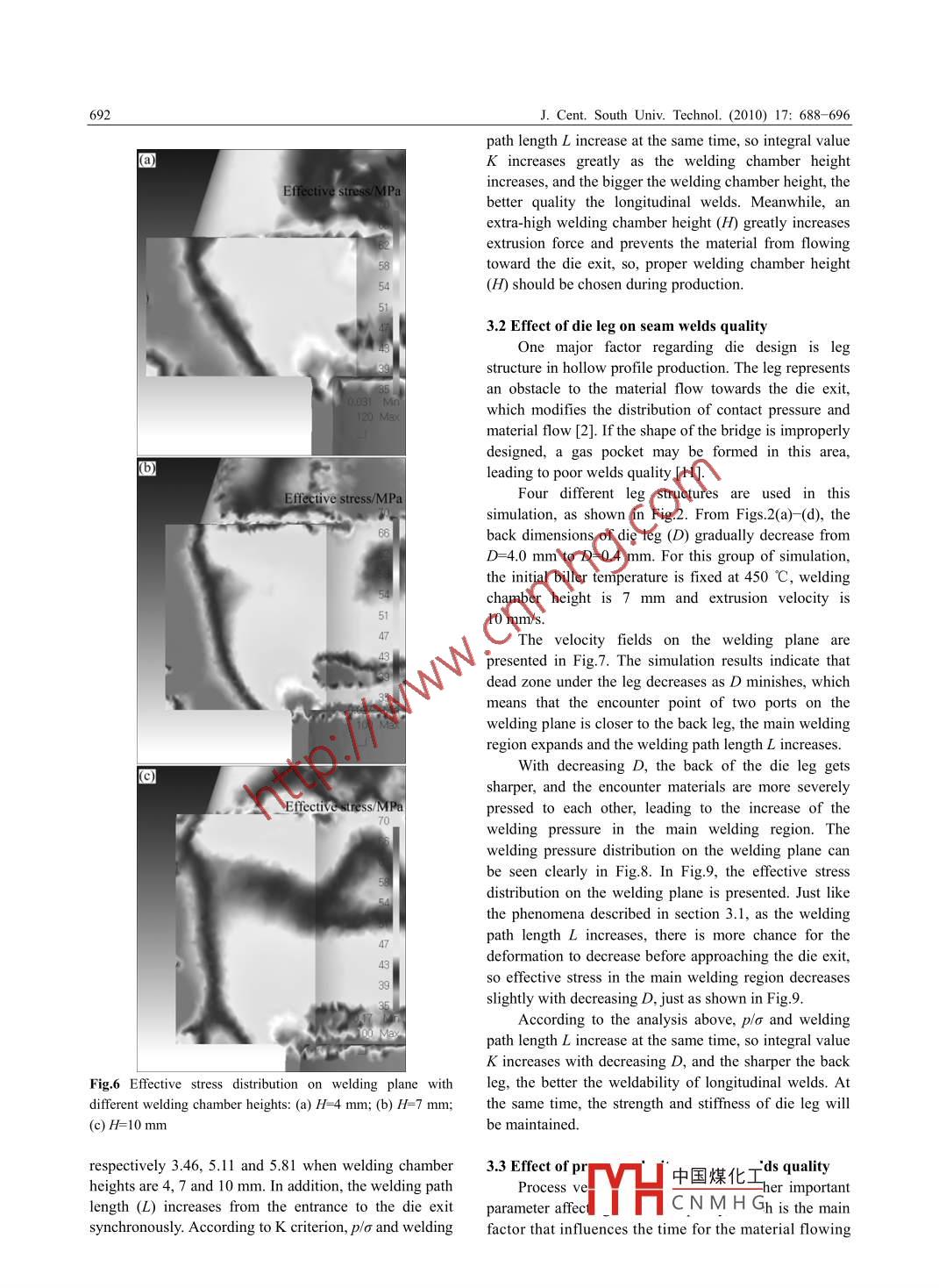 J. Cent. South Univ. Technol. (2010) 17: 688- 696包SpringerDOI: 10. 1007/11771-010-0541-1Effects of process parameters and die geometry on longitudinal welds quality inaluminum porthole die extrusion processLIU Jian(劉健), LIN Gao-yong(林高用), FENG Di(馮迪), Z0U Yan-ming(鄒艷明), SUN Li-ping(孫利平)School of Materials Science and Engineering, Central South University, Changsha 410083, ChinaC Central South University Press and Springer-Verlag Berlin Heidelberg 2010Abstract: By using the rigid-visco-plasticity finite element method, the welding process of aluminum porthole die extrusion to forma tube was simulated based on Deform-3D software. The welding chamber height (H), back dimension of die leg (D), processvelocity and initial billet temperature were used in FE simulations so as to determine the conditions in which better longitudinalwelding quality can be obtained. According to K criterion, the local welding parameters such as welding pressure, effective stress andwelding path length on the welding plane are linked to longitudinal welds quality. Simulation turns out that pressure-to-effectivestress ratio (p!o) and welding path length (L) are the key factors affecting the welding quality. Higher welding chamber best andsharper die leg give better welding quality. When H=10 mm and D=0.4 mm, the longitudinal welds have the best quality. Higherprocess velocity decreases welds quality. The proper velocity is 10 mm/s for this simulation. In a certain range, higher temperature isbeneficial to the longitudinal welds. It is found that both 450 and 465 °C can satisfy the requirements of the longitudinal welds.Key words: aluminum alloy; longitudinal welds; porthole die; die geometry; extrusion process; K criterionafter introducing the time factor. This criterion greatly1 Introductionemphasizes the dead zone in the welding chamber. Basedon this observation, DONATI and TOMESANI [6]In recent years, aluminum alloy hollow profiles areintroduced speed as a correction factor and proposed theincreasingly used in manufacturing processes, mainly forK criterion (pressure -time -flow criterion). By applyinglightweight components in the vehicles for ground, seathese criteria to experiments performed by VALBERGand air transportation. The hollow profile producedet al [7-8] and FE simulation [6], it was found that Kthrough porthole die contains a number of seam weldscriterion can discriminate the welding quality efficiently.along its length, which are called the longitudinal welds.Meanwhile, FANG et al [9] demonstrated that 3D FEMIt is a common view that cracking happens preferentiallysimulation is a viable predictive tool in both dienear the welding lines of the extruded profiles [1]. Thedesigning and process optimization for any extrudedfailure of hollow extruded products mostly occurs alongshapes. LIU et al [10] simulated the longitudinal weldsthe weld lines when the products are subject to severeformation process during porthole die extrusion andinternal pressure or expansion in the practical use [2]. So,evaluated the factors determining the quality of the weldthe welds often represent the weakest points of theseams. LI et al [11] suggested that the ratio of theprofile's section. Therefore, it is of particular importancemaximum normal pressure in the welding chamber to theto increase the welding quality of longitudinal welds.flow stress of the billet material on the welding planeSo far, few studies have been done on longitudinaldetermined the weld quality. DONATI and TOMESANIwelds. Earlier researches about longitudinal welds12] defined the workability area under differentformation process were performed by AKERET [3- 4],processing conditions and used tensile strength andwho considered once the maximum pressure inside theequivalent fracture strain to assess the effectiveness ofwelding chamber exceeds a critical limit, which dependslongitudinal welds.on the physical state of the material at that point, thewelding could be assessed as available. In FE analysis,parameters and die geometries on longitudinal weldsthe criterion can be normalized by rating pressure toquality were analyzed by means of thermo-mechanicaleffective stress at a specific point. PLATA and PIWNIKFE simulation and according to K criterion. The process[5] proposed the Q criterion (pressure- time criterion)parameters an中國煤化工the weldingFoundation item: Project(2007BAE38BO4) supported by the National Science and Technology PillMYHCNMHGReceived date: 2009- 11-25; Accepted date: 2010-03- 12Corresponding author: LIN Gao-yong, PhD, Professor; Tel: +86- -731- 88879341; Fax: +86- 731-88876692; E-mail: mater218@ 163.comJ. Cent. South Univ. Technol. (2010) 17: 688- -696_689chamber height (H), back dimension of die leg (D),Table 1 Conditions in porthole die extrusionprocess velocity and initial billet temperature. TheCondition_Valueprocess conditions and parameters for achieving goodBillet temperature/C420, 450, 465, 480 .longitudinal welds quality were found.Extrusion velocity/(mms ")1,5, 10, 152 FE simulationWelding chamber height/mm4, 7, 10Extrusion ratio222.1 Conditions of FE simulationHeat transfer cofficient/(W-m-2.K)3 000According to the rigid-visco-plasticity FE method,Shear factor0.8the welding process of porthole die extrusion isCoulomb factorsimulated by Deform-3D software. The schematic tooassembly used in the porthole die extrusion is shown inhe dimensions of the porthole die used in thisFig.1. During the extrusion process, materials dividedwork are shown in Fig.3. An AA6061 billet of d32 mmXthrough portholes are gathered within the welding25 mm is preheated and then extruded through thchamber and then welded together, and the weldabilityporthole die to produce tube profile, which is 1.5 mm incan be affected by process parameters and die geometries.thickness. The billet is meshed with tetrahedral elements, .The process variables used in FE analysis are presentedand its heat exchanges with the tools are allowed. Tci