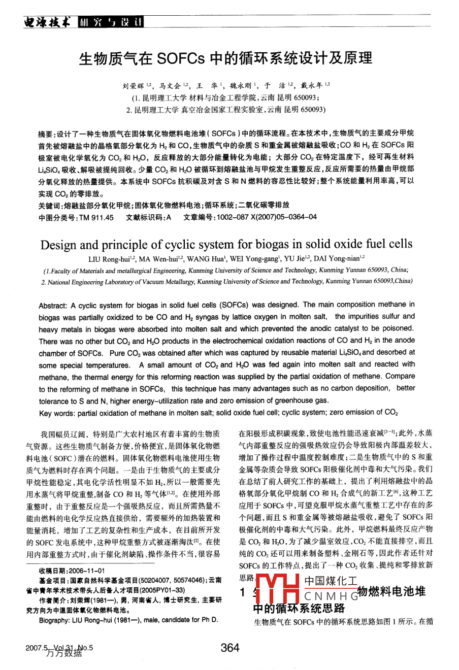 生物質(zhì)氣在 SOFCS中的循環(huán)系統(tǒng)設計及原理劉榮輝口,馬文會口,王華,魏永剛',于潔1,戴永年(1.昆明理工大學材料與冶金工程學院,云南昆明650093;2.昆明理工大學真空冶金國家工程實驗室,云南昆明650093)摘要:設計了一種生物質(zhì)氣在固體氧化物燃料電池堆( SOFCS)中的循環(huán)流程。在本技術(shù)中生物質(zhì)氣的主要成分甲烷首先被熔融鹽中的晶格氧部分氧化為H2和CO生物質(zhì)氣中的雜質(zhì)S和重金屬被熔融鹽吸收;CO和H2在 SOFCS陽極室被電化學氧化為CO2和HO,反應釋放的大部分能量轉(zhuǎn)化為電能;大部分cO2在特定溫度下,經(jīng)可再生材料LisO4吸收、解吸被提純回收。少量CO2和Ho被循環(huán)到熔融鹽池與甲烷發(fā)生重整反應,反應所需要的熱量由甲烷部分氯化釋放的熱量提供。本系統(tǒng)中 SOFCS抗積碳及對含S和N燃料的容忍性比較好;整個系統(tǒng)能量利用率高,可以實現(xiàn)CO2的零排放。關(guān)鍵詞:熔融鹽部分氧化甲烷;固體氧化物燃料電池;循環(huán)系統(tǒng);二氧化碳零排放中圖分類號:TM91145文獻標識碼:A文章編號:1002-087X(2007)050364-Design and principle of cyclic system for biogas in solid oxide fuel cellsLIU Rong-hui, MA Wen-hui 2, WANG Hua, WEI Yong-gang, YU Jie,DaAl Yong-nian(1. Faculty of Materials and metallurgical Engineering, Kunming University of Science and Technology, Kunming Yunnan 650093, China;2. National Engineering Laboratory of vacuum Metallurgy, Kunming University of Science and Technology, Kunming Yunnan 650093, ChinaAbstract: a cyclic system for biogas in solid fuel cells(SOFCs)was designed. The main composition methane inbiogas was partially oxidized to be Co and H2 syngas by lattice oxygen in molten salt, the impurities sulfur andheavy metals in biogas were absorbed into molten salt and which prevented the anodic catalyst to be poisonedThere was no other but CO and H2o products in the electrochemical oxidation reactions of Co and H2 in the anodechamber of SOFCs. Pure CO, was obtained after which was captured by reusable material Li Sio, and desorbed atsome special temperatures. A small amount of Co2 and H2o was fed again into molten salt and reacted withmethane, the thermal energy for this reforming reaction was supplied by the partial oxidation of methane. Compareto the reforming of methane in SOFCs, this technique has many advantages such as no carbon deposition, bettertolerance to S and N, higher energy-utilization rate and zero emission of greenhouse gasKey words: partial oxidation of methane in molten salt; solid oxide fuel cell; cyclic system; zero emission of COz我國幅員遼闊,特別是廣大農(nóng)村地區(qū)有著豐富的生物質(zhì)在陽極形成積碳現(xiàn)象致使電池性能迅速衰減;此外,水蒸氣資源。這些生物質(zhì)氣制備方便,價格便宜,是固體氧化物燃氣內(nèi)部重整反應的強吸熱效應仍會導致陽極內(nèi)部溫差較大料電池(SOFC)潛在的燃料。固體氧化物燃料電池使用生物增加了操作過程中溫度控制難度;二是生物質(zhì)氣中的S和重質(zhì)氣為燃料時存在兩個問題。一是由于生物質(zhì)氣的主要成分金屬等雜質(zhì)會導致 SOFCs陽極催化劑中毒和大氣污染。我們甲烷性能穩(wěn)定,其電化學活性明顯不如H2,所以一般需要先在總結(jié)了前人研究工作的基礎(chǔ)上,提出了利用熔融鹽中的品用水蒸氣將甲烷重整制備CO和H2等氣體。在使用外部格氧部分氧化甲烷制CO和H2合成氣的新工藝,這種工藝重整時,由于重整反應是一個強吸熱反應,而且所需熱量不應用于 SOFCS中,可望克服甲烷水蒸氣重整工藝中存在的多能由燃料的電化學反應熱直接供給,需要額外的加熱裝置和個問題,而且S和重金屬等被熔融鹽吸收,避免了 SOFCS陽能量消耗,增加了工藝的復雜性和生產(chǎn)成本,在目前所開發(fā)極催化劑的中毒和大氣污染。此外,甲烷燃料最終反應產(chǎn)物的SOFC發(fā)電系統(tǒng)中,這種甲烷重整方式被逐漸淘汰口。在使是CO2和HO,為了減少溫室效應,CO2不能直接排空,而且用內(nèi)部重整方式時,由于催化劑缺陷操作條件不當,很容易純的CO2還可以用來制備塑料、金剛石等,因此作者還針對收稿日期:2006-11-01SOFCs的工作特點,提出了一種CO2收集、提純和零排放新基金項目:國家自然科學基金項目(50204007,50574046);云南思路中國煤化工省中膏年學術(shù)技術(shù)帶頭人后備人才項目(2005PY01-33)CNMH物燃料電池堆作者簡介:劉榮輝(1981-),男,河南省人,博士研究生,主要研究方向為中溫固體氧化物燃料電池。中的循環(huán)系統(tǒng)思路Biography: LIU Rong-hui(1981-), male, candidate for Ph D生物質(zhì)氣在 SOFCs中的循環(huán)系統(tǒng)思路如圖1所示。在循2005萬數(shù)據(jù)05364仙究勹設山也淖技本環(huán)流化床或固定床反應器中,放入一定量的熔融鹽(如示為:Na2CO3和KCO3),高價態(tài)的變價金屬氧化物或鈣鈦礦O+CH4→CO+H2(ABO3)型催化材料分散在熔融鹽里或負載在蜂窩狀載體上放置在熔融鹽里,生物質(zhì)氣被送入熔池中,其主要成分甲烷與在反應過程中還有甲烷完全氧化(燃燒)和甲烷的重整晶格氧發(fā)生反應生成CO和H2,然后輸送到 SOFCS的陽極反應窒;在甲烷與熔融鹽作用后,空氣被鼓入熔池中以補充甲烷部MOO)+CH4→M+CO2+2HO分氧化時消耗的晶格氧;空氣在 SOFCs的陰極室被還原成3CH+CO2+2HO→4CO+8H2O2-,O3在氧勢的作用下,通過電解質(zhì)擴散到 SOFCs的陽極把式(1),(2),(5)和(6)相加或(3),(4),(5)和室,然后與CO和H2發(fā)生反應。陽極反應主要產(chǎn)物CO2經(jīng)過(6)相加整個反應過程方