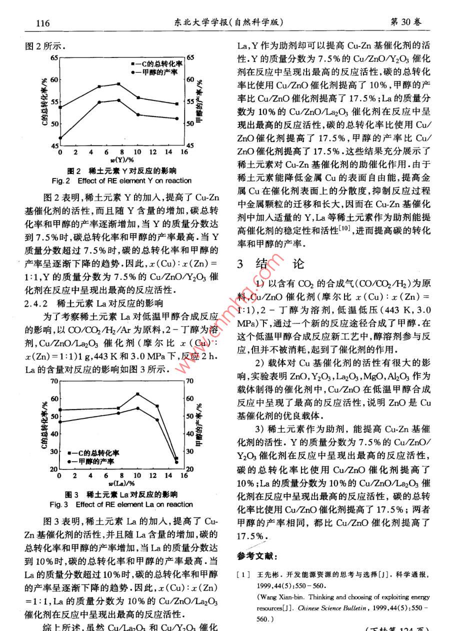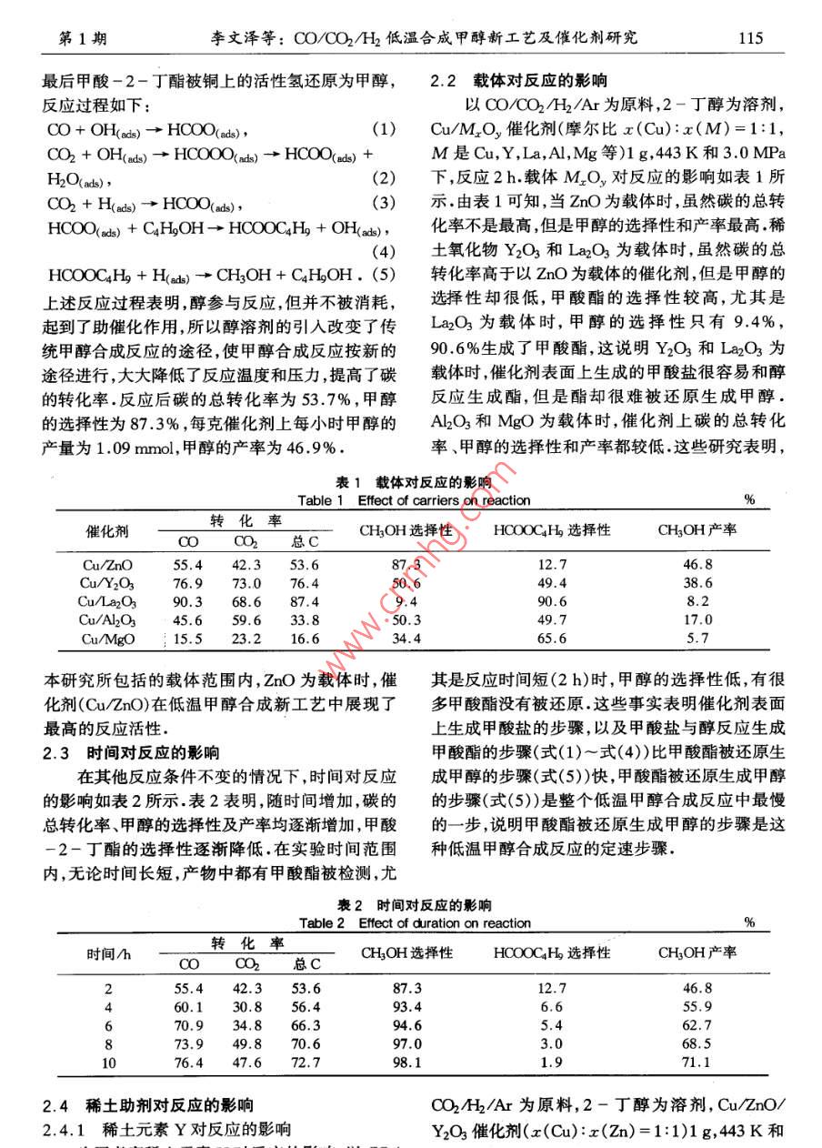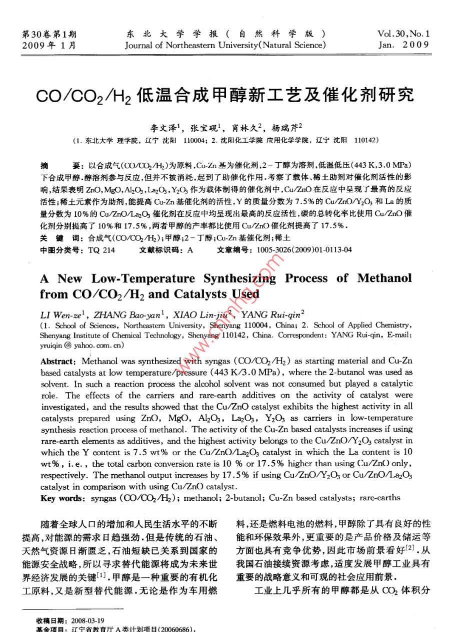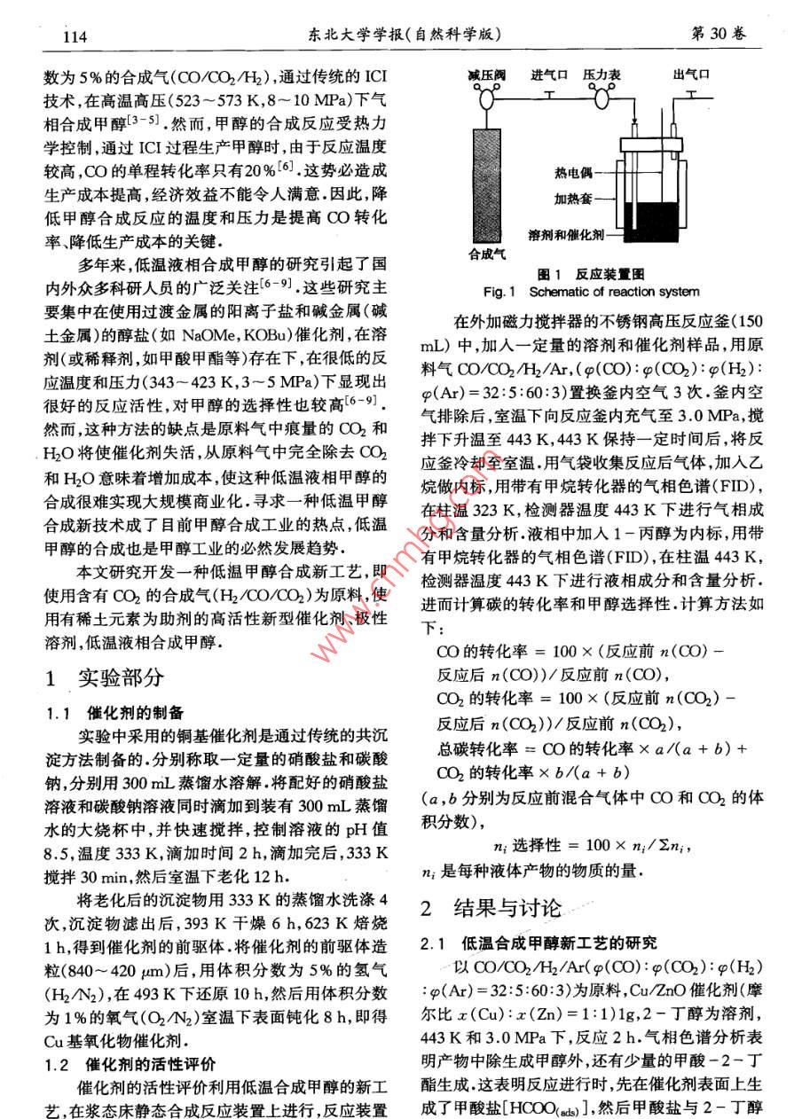第30卷第1期東北大學(xué)學(xué)報(bào)(自然科學(xué)版)Vol 30. No. 12009年1月Journal of Northeastern University(Natural Science)Jan.2009cOCO22低溫合成甲醇新工藝及催化劑研究李文澤1,張寶硯!,肖林久2,楊瑞芹2(1.東北大學(xué)理學(xué)院,遼寧沈陽(yáng)110004;2.沈陽(yáng)化工學(xué)院應(yīng)用化學(xué)學(xué)院,遼寧沈陽(yáng)110142)摘要:以合成氣(OOCO2/)為原料,CuZn基為催化劑,2-丁醇為溶劑低溫低壓(443K,3.0MPa)下合成甲醇醇溶劑參與反應(yīng)但并不被消耗,起到了助催化作用考察了載體、稀土助劑對(duì)催化劑活性的影響,結(jié)果表明ZnO,MgO,A2O3,La2O3,Y2O3作為載體制得的催化劑中,Cu/ZnO在反應(yīng)中呈現(xiàn)了最高的反應(yīng)活性;稀土元素作為助劑能提高CuZn基催化劑的活性,Y的質(zhì)量分?jǐn)?shù)為75%的Cu/ZnOY2O3和La的質(zhì)量分?jǐn)?shù)為10%的Cu/ZnO/a2O3催化劑在反應(yīng)中均呈現(xiàn)出最高的反應(yīng)活性碳的總轉(zhuǎn)化率比使用Cu/ZnO催化劑分別提高了10%和17.5%,兩者甲醇的產(chǎn)率都比使用 Cu/no催化劑提高了17.5%關(guān)鍵詞:合成氣(COOO2/H2);甲醇;2-丁醇;CuZn基催化劑;稀土中圖分類號(hào):TQ214文獻(xiàn)標(biāo)識(shí)碼:A文章編號(hào):1005-3026(2009)01-0113-04A New Low-Temperature Synthesizing Process of Methanolfrom CO/CO,/H, and Catalysts UsedLI Wen-ze', ZHANG Bao-yan, XIAO Lin-jiu2, YANG Rui-gin2(1. School of Sciences, Northeastern University, Shenyang 110004, China; 2. School of Applied ChemistryShenyang Institute of Chemical Technology, Shenyang 110142, China, Correspondent: YANG Rui-qin, E-mailyruigin yahoo com. cn)Abstract: Methanol was synthesized with syngas(CO/CO2/H2)as starting material and Cu-Znbased catalysts at low temperature/pressure (443 K/3.0 MPa), where the 2-butanol was used assolvent. In such a reaction process the alcohol solvent was not consumed but played a catalyticrole. The effects of the carriers and rare-earth additives on the activity of catalyst wereinvestigated, and the results showed that the Cu/Zno catalyst exhibits the highest activity in allcatalysts prepared using ZnO, MgO, AL2O3, La2O3, Y2O3 as carriers in low-temperaturesynthesis reaction process of methanol. The activity of the Cu-Zn based catalysts increases if usingrare-earth elements as additives, and the highest activity belongs to the Cu/ZnO/Y2O3 catalyst inwhich the Y content is 7. 5 wt% or the Cu/ZnO/LayO catalyst in which the La content is 10wt%, i.e., the total carbon conversion rate is 10 %or 17.5% higher than using Cu/ZnO only,respectively. The methanol output increases by 17.5% if using Cu/ZnO/Y2O3 or Cu/ZnO/La2O3catalyst in comparison with using Cu/ZnO catalystKey words: syngas(CO/CO2/H2); methanol; 2-butanol; Cu-Zn based catalysts; rare-earths隨著全球人口的增加和人民生活水平的不斷料,還是燃料電池的燃料,甲醇除了具有良好的性提高,對(duì)能源的需求日趨強(qiáng)勁但是傳統(tǒng)的石油、能和環(huán)保效果外,更重要的是產(chǎn)品價(jià)格及儲(chǔ)運(yùn)等天然氣資源日漸匱乏,石油短缺已關(guān)系到國(guó)家的方面也具有競(jìng)爭(zhēng)優(yōu)勢(shì),因此市場(chǎng)前景看好(21,從能源安全戰(zhàn)略,所以尋求替代能源將成為未來(lái)世我國(guó)石油接續(xù)資源考慮,適度發(fā)展甲醇工業(yè)具有界經(jīng)濟(jì)發(fā)展的關(guān)鍵1.甲醇是一種重要的有機(jī)化重要的戰(zhàn)略意義和可觀的社會(huì)應(yīng)用前景工原料,又是新型替代能源無(wú)論是作為車用燃工業(yè)上幾乎所有的甲醇都是從CO2體積分收稿日期:2008-03-19114東北大學(xué)學(xué)報(bào)(自然科學(xué)版)第30卷數(shù)為5%的合成氣(COOO2H2),通過(guò)傳統(tǒng)的ICI減壓閥進(jìn)氣口壓力表出氣口技術(shù),在高溫高壓(523~573K,8~10MPa)下氣相合成甲醇3-5,然而,甲醇的合成反應(yīng)受熱力學(xué)控制,通過(guò)ICI過(guò)程生產(chǎn)甲醇時(shí),由于反應(yīng)溫度較高,CO的單程轉(zhuǎn)化率只有20%6,這勢(shì)必造成熱電偶生產(chǎn)成本提高,經(jīng)濟(jì)效益不能令人滿意因此,降加熱套低甲醇合成反應(yīng)的溫度和壓力是提高CO轉(zhuǎn)化率、降低生產(chǎn)成本的關(guān)鍵,溶劑和催化劑多年來(lái),低溫液相合成甲醇的研究引起了國(guó)合成氣圖1反應(yīng)裝置圖內(nèi)外眾多科研人員的廣泛關(guān)注6-9,這些研究主Fig 1 Schematic of reaction system要集中在使用過(guò)渡金屬的陽(yáng)離子鹽和堿金屬(堿土金屬)的醇鹽(如 NaOMe,KOBu)催化劑,在溶在外加磁力攪拌器的不銹鋼高壓反應(yīng)釜(150劑(或稀釋劑,如甲酸甲酯等)存在下,在很低的反mL)中,加入一定量的溶劑和催化劑樣品,用原應(yīng)溫度和壓力(343-423K,3-5MPa)下顯現(xiàn)出料氣OO/OO2/H2/Ar,(q(CO):g(CO2):g(H2)很好的反應(yīng)活性,對(duì)甲醇的選擇性也較高6-9g(Ar)=32:5:60:3置換釜內(nèi)空氣3次釜內(nèi)空然而,這種方法的缺點(diǎn)是原料氣中痕量的C2和拌下升溫至43K,43K保持一定時(shí)間后,將反H2O將使催化劑失活,從原料氣中完全除去OO應(yīng)釜冷卻至室溫用氣袋收集反應(yīng)后氣體,加入乙和HO意味著增加成本,使這種低溫液相甲醇的烷做內(nèi)標(biāo),用帶有甲烷轉(zhuǎn)化器的氣相色譜(FID)合成很難實(shí)現(xiàn)大規(guī)模商業(yè)化.尋求一種低溫甲醇在柱溫323K,檢測(cè)器溫度443K下進(jìn)行氣相成合成新技術(shù)成了目前甲醇合成工業(yè)的熱點(diǎn),低溫甲醇的合成也是甲醇工業(yè)的必然發(fā)展趨勢(shì)分和含量分析液相中加入1-丙醇為內(nèi)標(biāo),用帶有甲烷轉(zh