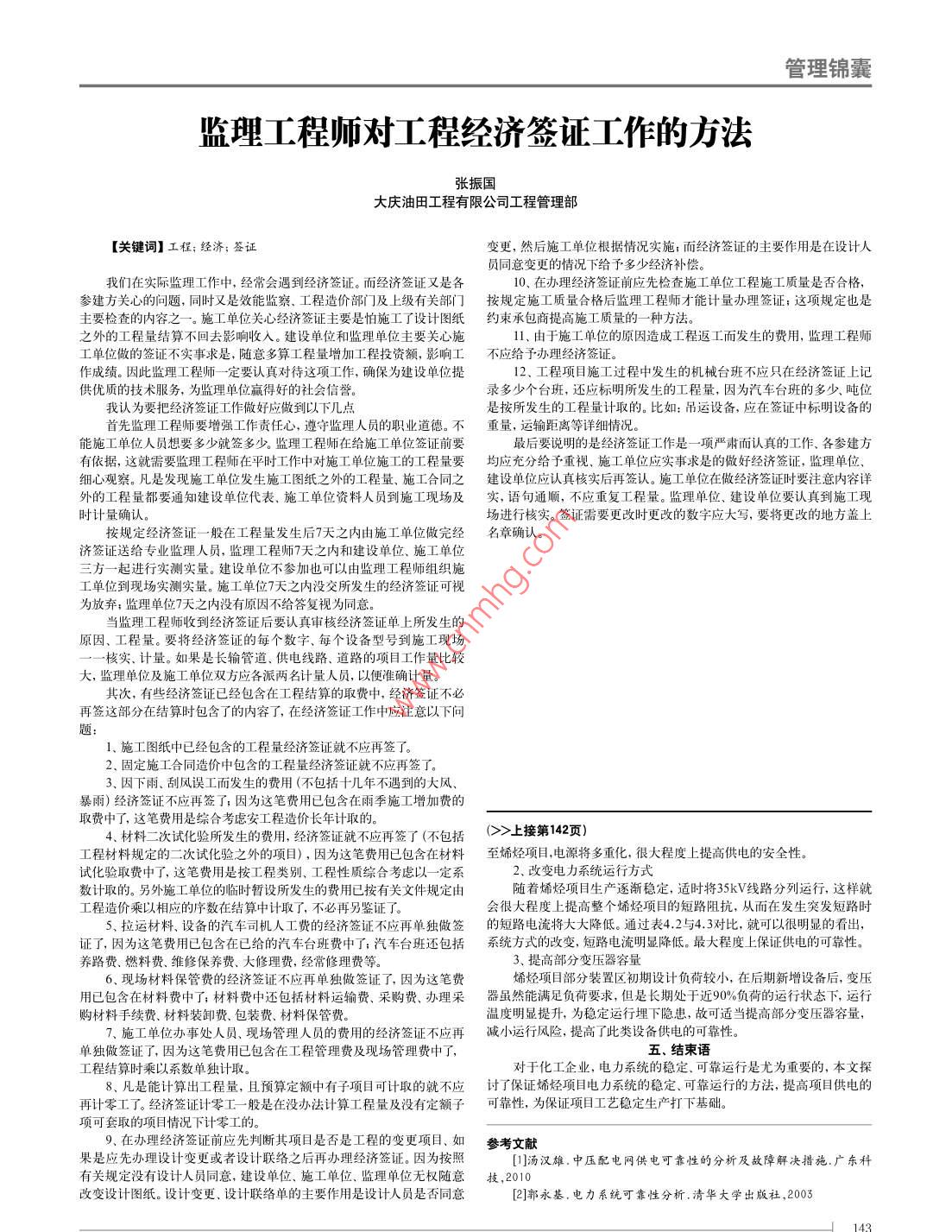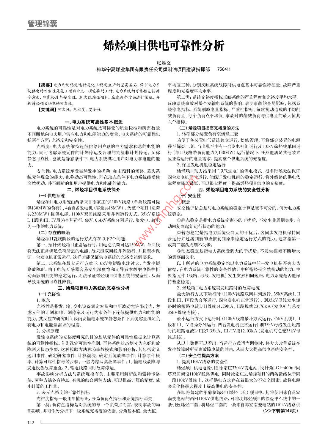 管理錦囊烯烴項(xiàng)目供電可靠性分析張勝文神華寧夏煤:業(yè)集團(tuán)有限責(zé)任公司煤制油項(xiàng)目建設(shè)指揮部750411[摘要]電力系統(tǒng)穩(wěn)定運(yùn)行是化工穩(wěn)定生產(chǎn)的堅(jiān)實(shí)基石,保證電力系平均值 三種,分別反映系統(tǒng)故障時(shí)供電點(diǎn)基本可靠性特征量、故障嚴(yán)重統(tǒng)供電的可靠性是化工項(xiàng)目中又一項(xiàng)重要的工作。電力系統(tǒng)的可靠性包括兩程 度和充裕度平均水平。個(gè)方面,即充裕度與安全性。本文就烯烴項(xiàng)目,在這兩個(gè)方面進(jìn)行闡述,分第二類:系統(tǒng)充裕度指標(biāo)反映系統(tǒng)的嚴(yán)重程度和充裕度平均水平,析烯烴項(xiàng)目供電的可靠性。反映系統(tǒng)事故對(duì)整個(gè)發(fā)輸電系統(tǒng)的影響,表明事故的全局影響。包括系[關(guān)鍵詞]可靠性;充裕度;安全性統(tǒng)停電指標(biāo)、系統(tǒng)削減電量指標(biāo)、嚴(yán)重性指標(biāo)、每次擾動(dòng)造成的平均削減負(fù)荷量、每個(gè)負(fù)荷點(diǎn)平均值、事故時(shí)的削減負(fù)荷與供電量的最大值共-.電力系統(tǒng)可靠性基本概念六個(gè)指標(biāo)。電力系統(tǒng)的可靠性是對(duì)電力系統(tǒng)按可接受的質(zhì)量標(biāo)準(zhǔn)和所需數(shù)量(二)烯烴項(xiàng)目提高充裕度的方法不間斷地向電力用戶供應(yīng)電力和電能能力的度量,電力系統(tǒng)的可靠性包1.轉(zhuǎn)移部分裝置負(fù)荷至烯烴二套括兩個(gè)方面:充裕度和安全性。為便于各裝置電氣系統(tǒng)獨(dú)立運(yùn)行、檢修管理,可將部分裝置的電源充裕度: 電力系統(tǒng)維持連續(xù)供給用戶總的電力需求和總的電能的移 至烯烴二二套, 當(dāng)出現(xiàn)至少有一-臺(tái)發(fā)電機(jī)組運(yùn)行及10kV徐烴線單回運(yùn)能力,同時(shí)考慮系統(tǒng)元件的計(jì)劃停運(yùn)及合理的期望非計(jì)劃停運(yùn)。又稱行 (單回線路帶負(fù)荷能力為130MW)運(yùn)行情況下,任然能滿足其他裝置靜態(tài)可靠性,也就是靜態(tài)條件下,電力系統(tǒng)滿足用戶對(duì)電力和電能的能區(qū)正常運(yùn)行的電量需求,提高整個(gè)供電系統(tǒng)的充裕度。力。2.保證發(fā)電機(jī)組穩(wěn)定運(yùn)行安全性:電力系統(tǒng)承受突然發(fā)生的擾動(dòng),如未預(yù)料的短路、丟失系烯烴項(xiàng)目動(dòng)力站采用“以氣定電”的供電模式,很多時(shí)候無法保證統(tǒng)元件現(xiàn)象的能力,也稱動(dòng)態(tài)可靠性,即在動(dòng)態(tài)條件下電力系統(tǒng)經(jīng)受住四臺(tái)發(fā) 電機(jī)同時(shí)運(yùn)行,能保證發(fā)電機(jī)組的穩(wěn)定運(yùn)行,將外線路的供電依突然擾動(dòng),并不間斷的相用戶提供電力和電能的能力??砍潭冉禐樽畹停梢院艽蟪潭壬咸岣呦N項(xiàng)目供電的充裕度。二、烯烴項(xiàng)目供電系統(tǒng)簡(jiǎn)介四、烯烴項(xiàng)目電力系統(tǒng)的安全性分析(-)供電系統(tǒng)(一) 安全性烯烴項(xiàng)目電:力系統(tǒng)由兩條來自徐家莊的110kV線路(單條線路可提供130MW的負(fù)荷)、4臺(tái)自備發(fā)電機(jī)(容量共18MW) ,為整個(gè)項(xiàng)目(負(fù)荷安全性評(píng)估總是與電力系統(tǒng)的穩(wěn)定計(jì)算是密不可分的,何為電力系共230MW)提供電能,110kV 雙回線路采用并列運(yùn)行方式, 35kV系統(tǒng)統(tǒng)穩(wěn)定:1. II段和II1 IV段為合環(huán)運(yùn)行,6kV. 0.4kV系統(tǒng)分列運(yùn)行,集發(fā)電、輸電①靜態(tài)穩(wěn)定是指電力系統(tǒng)受到小的干擾后,不發(fā)生非周期失步,自為一體的電力系統(tǒng)。動(dòng)回復(fù)到起始運(yùn)行狀態(tài)的能力;(二)存在的缺陷②暫態(tài)穩(wěn)定是指電力系統(tǒng)受到大的干擾后,各同步發(fā)電機(jī)保持同烯烴項(xiàng)目就現(xiàn)階段的運(yùn)行方式存在以下2個(gè)問題:步運(yùn)行并過渡到新的或恢復(fù)到原來穩(wěn)定運(yùn)行方式的能力。通常指第一第一、預(yù)計(jì)烯烴項(xiàng)目正常運(yùn)行時(shí),用電總負(fù)荷可達(dá)150MW,單回線或第二 二震蕩周期不失步;將無法正常滿足負(fù)荷所需的電能,故只能雙回線并列運(yùn)行,并且至少保③動(dòng)態(tài)穩(wěn)定是指電力系統(tǒng)受到大的干擾后,不發(fā)生振幅不斷增大證一臺(tái)發(fā)電機(jī)正常運(yùn)行,這樣才能保證供電系統(tǒng)的充裕度達(dá)到要求。的震蕩而失步。以上所述的電力系統(tǒng)穩(wěn)定均以電力系統(tǒng)中任--發(fā)電機(jī)是否失步為路故障時(shí),由于電流互感器容易發(fā)生深度飽和而導(dǎo)致本級(jí)繼電保護(hù)拒依據(jù),在電力系統(tǒng)可靠性的安全性估計(jì)中所指經(jīng)受突然擾動(dòng)的能力,主動(dòng)而影響系統(tǒng)的穩(wěn)定運(yùn)行,無法保證烯烴項(xiàng)目供電系統(tǒng)的安全性,從而要指元件 (線路、母線、發(fā)電機(jī))發(fā)生突然相間短路,電力系統(tǒng)是否能保導(dǎo)致系統(tǒng)的可靠性降低。持暫態(tài)穩(wěn)定。三.烯烴項(xiàng)目電力系統(tǒng)的充裕性分析2.烯烴項(xiàng)目電力系統(tǒng)突發(fā)短路時(shí)的故障電流(一) 充裕性最大運(yùn)行方式下運(yùn)行時(shí)(110kV線路雙回并列運(yùn)行,35kV系統(tǒng)I、II1.概念段和II、IV段為合環(huán)運(yùn)行,四臺(tái)發(fā)電機(jī)正常運(yùn