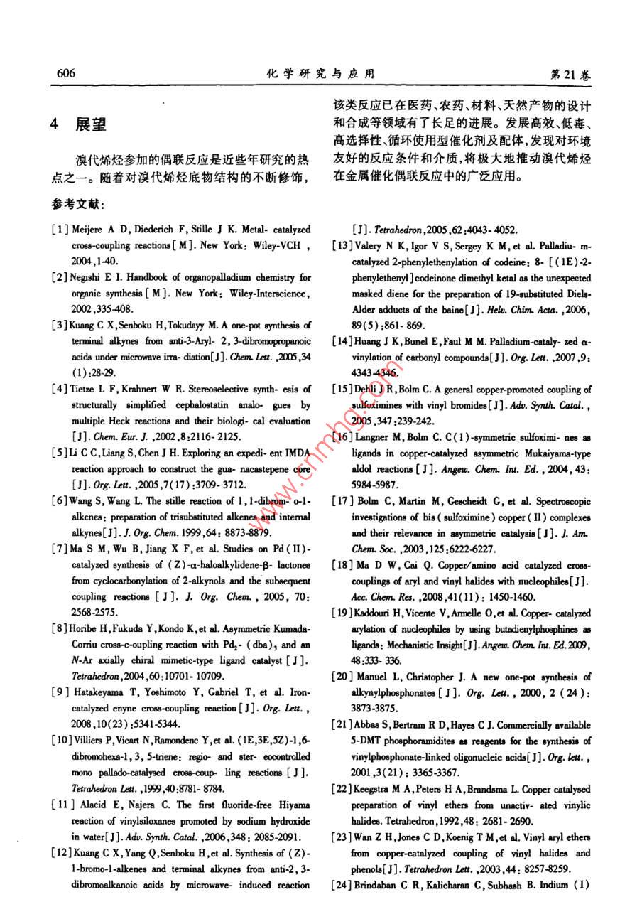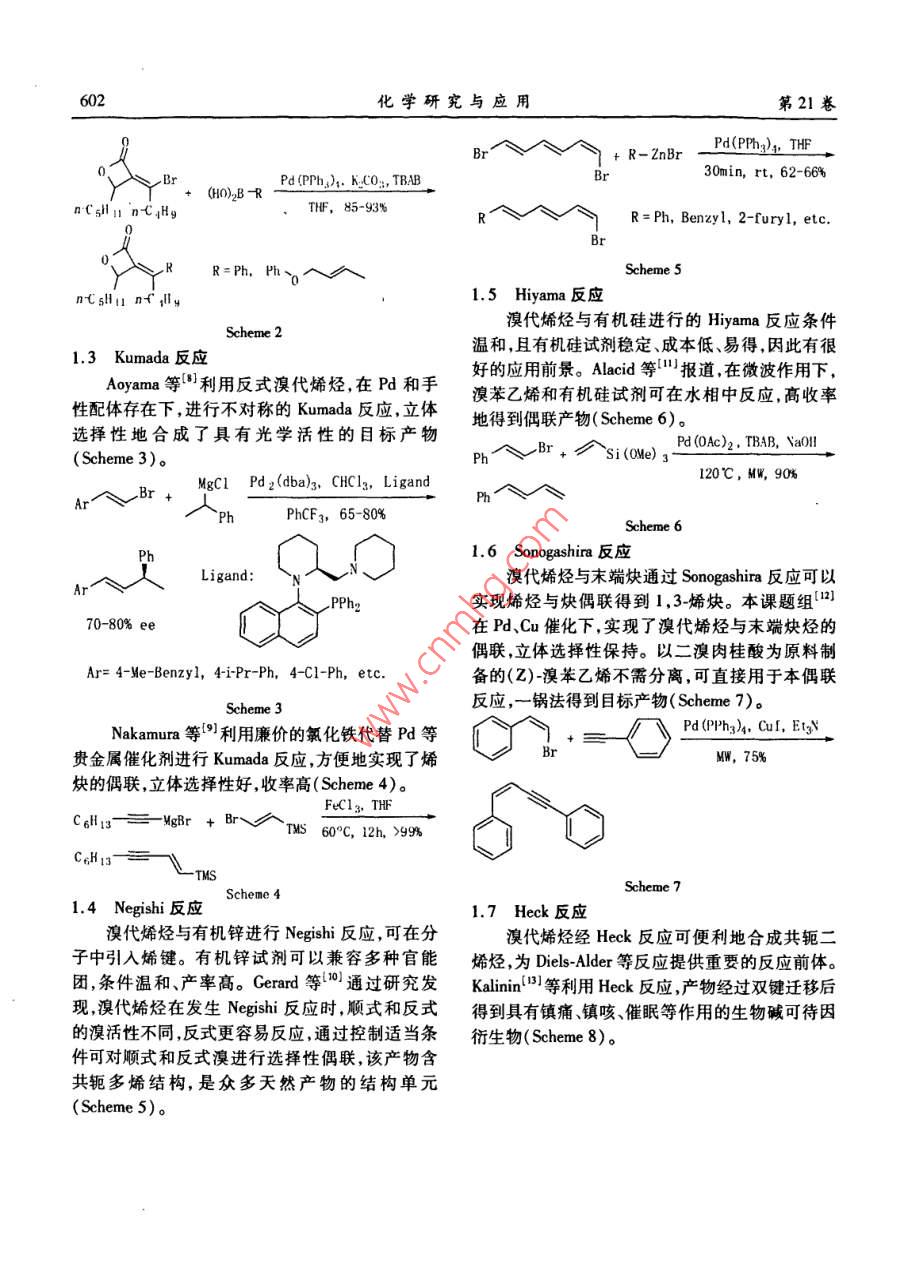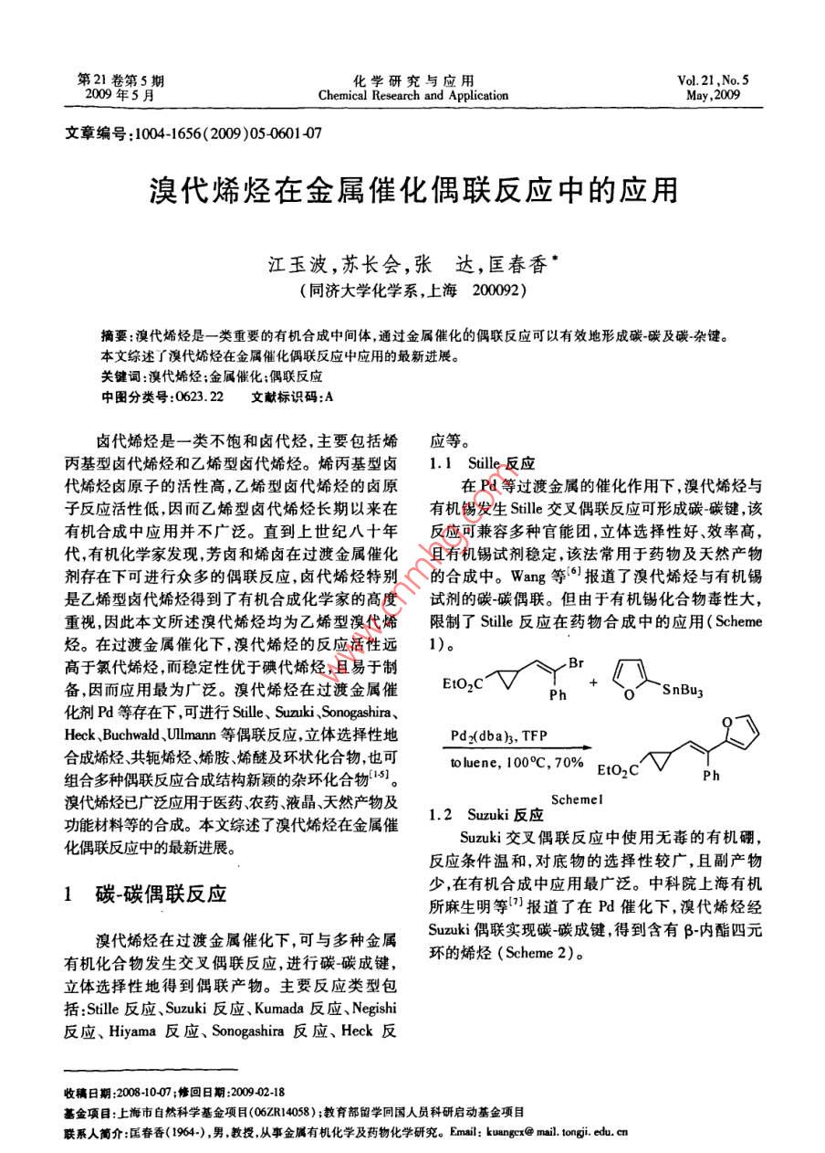 第21卷第5期化學(xué)研究與。應(yīng)用,Vol.21 ,No. 52009年5月Chemical Research and ApplicationMay ,2009文章編號(hào):1004-1656(2009 )05-0601 07溴代烯烴在金屬催化偶聯(lián)反應(yīng)中的應(yīng)用江玉波,蘇長會(huì),張達(dá),匡春香°(同濟(jì)大學(xué)化學(xué)系,上海200092)摘要:溴代烯烴是一類重要的有機(jī)合成中間體,通過金屬催化的偶聯(lián)反應(yīng)可以有效地形成碳-碳及碳-雜鍵。本文綜述了溴代烯烴在金屬催化偶聯(lián)反應(yīng)中應(yīng)用的最新進(jìn)展。關(guān)鍵詞:澳代烯烴;金屬催化;偶聯(lián)反應(yīng)中圖分類號(hào):0623.22文獻(xiàn)標(biāo)識(shí)碼:A鹵代烯烴是一類不飽和鹵代烴,主要包括烯應(yīng)等。.丙基型鹵代烯烴和乙烯型鹵代烯烴。烯丙基型鹵1.1 Stille反應(yīng)代烯烴鹵原子的活性高,乙烯型鹵代烯烴的鹵原在Pd等過渡金屬的催化作用下,溴代烯烴與子反應(yīng)活性低,因而乙烯型鹵代烯烴長期以來在有機(jī)錫發(fā)生Stille交叉偶聯(lián)反應(yīng)可形成碳碳鍵,該有機(jī)合成中應(yīng)用并不廣泛。直到上世紀(jì)八十年反應(yīng)可兼容多種官能團(tuán),立體選擇性好、效率高,代,有機(jī)化學(xué)家發(fā)現(xiàn),芳鹵和烯鹵在過渡金屬催化且有機(jī)錫試劑穩(wěn)定,該法常用于藥物及天然產(chǎn)物劑存在下可進(jìn)行眾多的偶聯(lián)反應(yīng),鹵代烯烴特別的合成中。Wang 等[6]報(bào)道了溴代烯烴與有機(jī)錫是乙烯型鹵代烯烴得到了有機(jī)合成化學(xué)家的高度試劑的碳碳偶聯(lián)。但由于有機(jī)錫化合物毒性大,重視,因此本文所述溴代烯烴均為乙烯型溴代烯限制了Sille反應(yīng)在藥物合成中的應(yīng)用(Scheme烴。在過渡金屬催化下,溴代烯烴的反應(yīng)活性遠(yuǎn)1)。高于氯代烯烴,而穩(wěn)定性優(yōu)于碘代烯烴,且易于制,B備,因而應(yīng)用最為廣泛。溴代烯烴在過渡金屬催PhSnBu3化劑Pd等存在下,可進(jìn)行Stille、Suzuki .Sonogashira、Heck.、Buchwald Ulmann等偶聯(lián)反應(yīng),立體選擇性地Pd2(dba)3, TFP合成烯烴共軛烯烴、烯胺、烯醚及環(huán)狀化合物,也可to luene, 100°C, 70%EtO2C V組合多種偶聯(lián)反應(yīng)合成結(jié)構(gòu)新穎的雜環(huán)化合物15]。溴代烯烴已廣泛應(yīng)用于醫(yī)藥、農(nóng)藥液晶、天然產(chǎn)物及1.2 Suzuki 反應(yīng)Schemel功能材料等的合成。本文綜述了溴代烯烴在金屬催Suzuki交叉偶聯(lián)反應(yīng)中使用無毒的有機(jī)硼,化偶聯(lián)反應(yīng)中的最新進(jìn)展。反應(yīng)條件溫和,對(duì)底物的選擇性較廣,且副產(chǎn)物少,在有機(jī)合成中應(yīng)用最廣泛。中科院上海有機(jī)1碳-碳偶聯(lián)反應(yīng)所麻生明等門]報(bào)道了在Pd催化下,溴代烯烴經(jīng):溴代烯烴在過渡金屬催化下,可與多種金屬Suzuki偶聯(lián)實(shí)現(xiàn)碳-碳成鍵,得到含有β-內(nèi)酯四元有機(jī)化合物發(fā)生交叉偶聯(lián)反應(yīng),進(jìn)行碳碳成鍵, .環(huán)的烯烴(Scheme 2)。立體選擇性地得到偶聯(lián)產(chǎn)物。主要反應(yīng)類型包括:tille反應(yīng)、Suzuki反應(yīng)、Kumada反應(yīng)、Negishi反應(yīng)、Hiyama反應(yīng)、Sonogashira反應(yīng)、Heck反收稿日期2008-10-07 ;修回日期:200902-18基金項(xiàng)目:上海市自然科學(xué)基金項(xiàng)目(06ZR14058) ;教育部留學(xué)回國人員科研啟動(dòng)基金項(xiàng)目聯(lián)系人筒介:匡春香( 1964-) ,男,教授,從事金屬有機(jī)化學(xué)及藥物化學(xué)研究。Email: kuangcx@ mail. tongi. edu. cn602化學(xué)研究與應(yīng)用第21卷+ R- ZnBrPd(PPh3)4, THF(HO)2B-RPd PPb,) K(CO., TBABB30min, rt, 62-66%nCsH ntgHgTHF,85-93%R=Ph, Benzyl, 2-fury1, etc.BrR=Ph,Phin 人人Scheme 5ntsHu nf lly1.5 Hiyama反應(yīng)溴代烯烴與有機(jī)硅進(jìn)行的Hiyama反應(yīng)條件Scheme 2溫和,且有機(jī)硅試劑穩(wěn)定、成本低、易得,因此有很1.3 Kumada 反應(yīng)Aoyama等[利用反式溴代烯烴,在Pd和手好的應(yīng)用前景。Alacid 等"報(bào)道,在微波作用下,性配體存在下,進(jìn)行不對(duì)稱的Kumada反應(yīng),立體溴苯乙烯和有機(jī)硅試劑可在水相中反應(yīng),高收率選擇性地合成了具有光學(xué)活性的目標(biāo)產(chǎn)物地得到偶聯(lián)產(chǎn)物(Scheme 6)。(Scheme 3)。Ph'Msi(Me) s-Pd (0Ac)2, TBAB, V\aOl120C, MW, 90%Pd 2(dba), CHClg, Li gandAr-P4PhPhCF3, 65-80%Scheme 61.6 Sonogashira 反應(yīng)Ligand: .溴代烯烴與末端炔通過Sonogashira反應(yīng)可以PPh2實(shí)現(xiàn)烯烴與炔偶聯(lián)得到1,3-烯炔。本課題組[12]70-80% ee在Pd、Cu催化下,實(shí)現(xiàn)了溴代烯烴與末端炔烴的偶聯(lián),立體選擇性保持。以二溴肉桂酸為原料制Ar= 4-Me-Benzyl, 4-i-Pr-Ph, 4-C1-Ph, etc.備的(Z)-溴苯乙烯不需分離,可直接用于本偶聯(lián)Scheme 3反應(yīng),一鍋法得到目標(biāo)產(chǎn)物(Scheme 7)。Pd(PPh3)4, Cul, EtgNNakamura等[9]利用廉價(jià)的氯化鐵代替Pd等rk》ww, 75%貴金屬催化劑進(jìn)行Kumada反應(yīng),方便地實(shí)現(xiàn)了烯炔的偶聯(lián),立體選擇性好,收率高(Scheme 4)。FeCls, THClHls= -WgBr + BrVr nxs60°C, 12h, >9%CsHis三\-TMSScheme 71.4 Negishi 反應(yīng)Scheme 41.7 Heck反應(yīng)溴代烯烴與有機(jī)鋅進(jìn)行Negishi反應(yīng),可在分溴代烯烴經(jīng)Heck反應(yīng)可便利地合成共軛二子中引入烯鍵。有機(jī)鋅試劑可以兼容多種官能烯烴,為Diels-Alder等反應(yīng)提供重要的反應(yīng)前體。團(tuán),條件溫和、產(chǎn)率