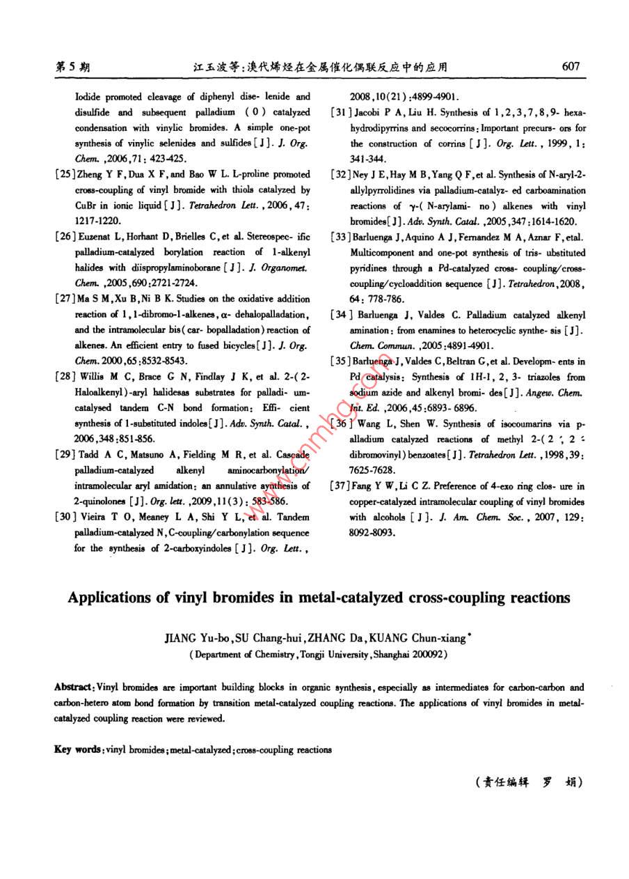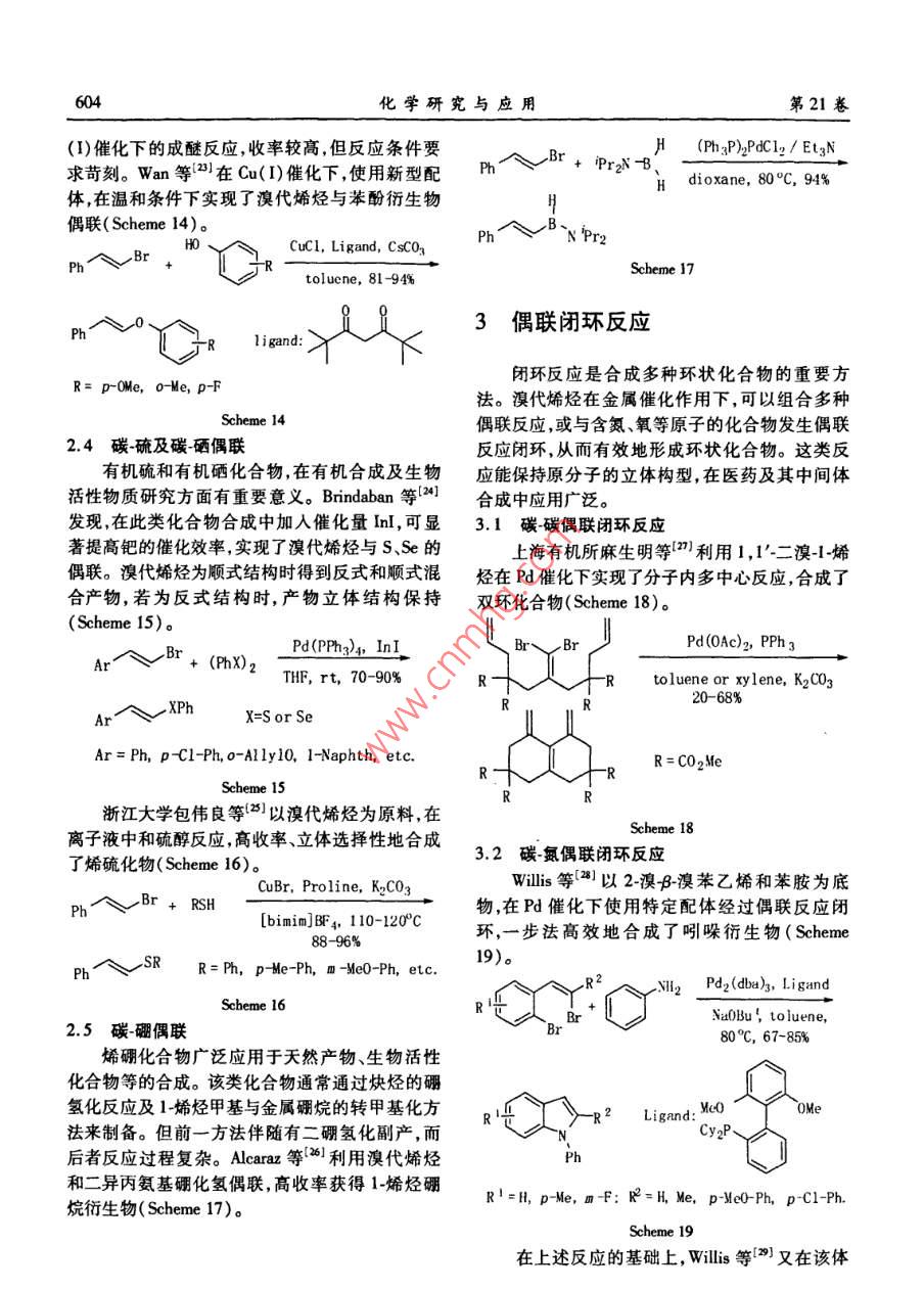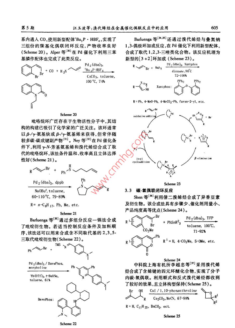 第21卷第5期化學(xué)研究與。應(yīng)用,Vol.21 ,No. 52009年5月Chemical Research and ApplicationMay ,2009文章編號(hào):1004-1656(2009 )05-0601 07溴代烯烴在金屬催化偶聯(lián)反應(yīng)中的應(yīng)用江玉波,蘇長會(huì),張達(dá),匡春香°(同濟(jì)大學(xué)化學(xué)系,上海200092)摘要:溴代烯烴是一類重要的有機(jī)合成中間體,通過金屬催化的偶聯(lián)反應(yīng)可以有效地形成碳-碳及碳-雜鍵。本文綜述了溴代烯烴在金屬催化偶聯(lián)反應(yīng)中應(yīng)用的最新進(jìn)展。關(guān)鍵詞:澳代烯烴;金屬催化;偶聯(lián)反應(yīng)中圖分類號(hào):0623.22文獻(xiàn)標(biāo)識(shí)碼:A鹵代烯烴是一類不飽和鹵代烴,主要包括烯應(yīng)等。.丙基型鹵代烯烴和乙烯型鹵代烯烴。烯丙基型鹵1.1 Stille反應(yīng)代烯烴鹵原子的活性高,乙烯型鹵代烯烴的鹵原在Pd等過渡金屬的催化作用下,溴代烯烴與子反應(yīng)活性低,因而乙烯型鹵代烯烴長期以來在有機(jī)錫發(fā)生Stille交叉偶聯(lián)反應(yīng)可形成碳碳鍵,該有機(jī)合成中應(yīng)用并不廣泛。直到上世紀(jì)八十年反應(yīng)可兼容多種官能團(tuán),立體選擇性好、效率高,代,有機(jī)化學(xué)家發(fā)現(xiàn),芳鹵和烯鹵在過渡金屬催化且有機(jī)錫試劑穩(wěn)定,該法常用于藥物及天然產(chǎn)物劑存在下可進(jìn)行眾多的偶聯(lián)反應(yīng),鹵代烯烴特別的合成中。Wang 等[6]報(bào)道了溴代烯烴與有機(jī)錫是乙烯型鹵代烯烴得到了有機(jī)合成化學(xué)家的高度試劑的碳碳偶聯(lián)。但由于有機(jī)錫化合物毒性大,重視,因此本文所述溴代烯烴均為乙烯型溴代烯限制了Sille反應(yīng)在藥物合成中的應(yīng)用(Scheme烴。在過渡金屬催化下,溴代烯烴的反應(yīng)活性遠(yuǎn)1)。高于氯代烯烴,而穩(wěn)定性優(yōu)于碘代烯烴,且易于制,B備,因而應(yīng)用最為廣泛。溴代烯烴在過渡金屬催PhSnBu3化劑Pd等存在下,可進(jìn)行Stille、Suzuki .Sonogashira、Heck.、Buchwald Ulmann等偶聯(lián)反應(yīng),立體選擇性地Pd2(dba)3, TFP合成烯烴共軛烯烴、烯胺、烯醚及環(huán)狀化合物,也可to luene, 100°C, 70%EtO2C V組合多種偶聯(lián)反應(yīng)合成結(jié)構(gòu)新穎的雜環(huán)化合物15]。溴代烯烴已廣泛應(yīng)用于醫(yī)藥、農(nóng)藥液晶、天然產(chǎn)物及1.2 Suzuki 反應(yīng)Schemel功能材料等的合成。本文綜述了溴代烯烴在金屬催Suzuki交叉偶聯(lián)反應(yīng)中使用無毒的有機(jī)硼,化偶聯(lián)反應(yīng)中的最新進(jìn)展。反應(yīng)條件溫和,對(duì)底物的選擇性較廣,且副產(chǎn)物少,在有機(jī)合成中應(yīng)用最廣泛。中科院上海有機(jī)1碳-碳偶聯(lián)反應(yīng)所麻生明等門]報(bào)道了在Pd催化下,溴代烯烴經(jīng):溴代烯烴在過渡金屬催化下,可與多種金屬Suzuki偶聯(lián)實(shí)現(xiàn)碳-碳成鍵,得到含有β-內(nèi)酯四元有機(jī)化合物發(fā)生交叉偶聯(lián)反應(yīng),進(jìn)行碳碳成鍵, .環(huán)的烯烴(Scheme 2)。立體選擇性地得到偶聯(lián)產(chǎn)物。主要反應(yīng)類型包括:tille反應(yīng)、Suzuki反應(yīng)、Kumada反應(yīng)、Negishi反應(yīng)、Hiyama反應(yīng)、Sonogashira反應(yīng)、Heck反收稿日期2008-10-07 ;修回日期:200902-18基金項(xiàng)目:上海市自然科學(xué)基金項(xiàng)目(06ZR14058) ;教育部留學(xué)回國人員科研啟動(dòng)基金項(xiàng)目聯(lián)系人筒介:匡春香( 1964-) ,男,教授,從事金屬有機(jī)化學(xué)及藥物化學(xué)研究。Email: kuangcx@ mail. tongi. edu. cn602化學(xué)研究與應(yīng)用第21卷+ R- ZnBrPd(PPh3)4, THF(HO)2B-RPd PPb,) K(CO., TBABB30min, rt, 62-66%nCsH ntgHgTHF,85-93%R=Ph, Benzyl, 2-fury1, etc.BrR=Ph,Phin 人人Scheme 5ntsHu nf lly1.5 Hiyama反應(yīng)溴代烯烴與有機(jī)硅進(jìn)行的Hiyama反應(yīng)條件Scheme 2溫和,且有機(jī)硅試劑穩(wěn)定、成本低、易得,因此有很1.3 Kumada 反應(yīng)Aoyama等[利用反式溴代烯烴,在Pd和手好的應(yīng)用前景。Alacid 等"報(bào)道,在微波作用下,性配體存在下,進(jìn)行不對(duì)稱的Kumada反應(yīng),立體溴苯乙烯和有機(jī)硅試劑可在水相中反應(yīng),高收率選擇性地合成了具有光學(xué)活性的目標(biāo)產(chǎn)物地得到偶聯(lián)產(chǎn)物(Scheme 6)。(Scheme 3)。Ph'Msi(Me) s-Pd (0Ac)2, TBAB, V\aOl120C, MW, 90%Pd 2(dba), CHClg, Li gandAr-P4PhPhCF3, 65-80%Scheme 61.6 Sonogashira 反應(yīng)Ligand: .溴代烯烴與末端炔通過Sonogashira反應(yīng)可以PPh2實(shí)現(xiàn)烯烴與炔偶聯(lián)得到1,3-烯炔。本課題組[12]70-80% ee在Pd、Cu催化下,實(shí)現(xiàn)了溴代烯烴與末端炔烴的偶聯(lián),立體選擇性保持。以二溴肉桂酸為原料制Ar= 4-Me-Benzyl, 4-i-Pr-Ph, 4-C1-Ph, etc.備的(Z)-溴苯乙烯不需分離,可直接用于本偶聯(lián)Scheme 3反應(yīng),一鍋法得到目標(biāo)產(chǎn)物(Scheme 7)。Pd(PPh3)4, Cul, EtgNNakamura等[9]利用廉價(jià)的氯化鐵代替Pd等rk》ww, 75%貴金屬催化劑進(jìn)行Kumada反應(yīng),方便地實(shí)現(xiàn)了烯炔的偶聯(lián),立體選擇性好,收率高(Scheme 4)。FeCls, THClHls= -WgBr + BrVr nxs60°C, 12h, >9%CsHis三\-TMSScheme 71.4 Negishi 反應(yīng)Scheme 41.7 Heck反應(yīng)溴代烯烴與有機(jī)鋅進(jìn)行Negishi反應(yīng),可在分溴代烯烴經(jīng)Heck反應(yīng)可便利地合成共軛二子中引入烯鍵。有機(jī)鋅試劑可以兼容多種官能烯烴,為Diels-Alder等反應(yīng)提供重要的反應(yīng)前體。團(tuán),條件溫和、產(chǎn)率