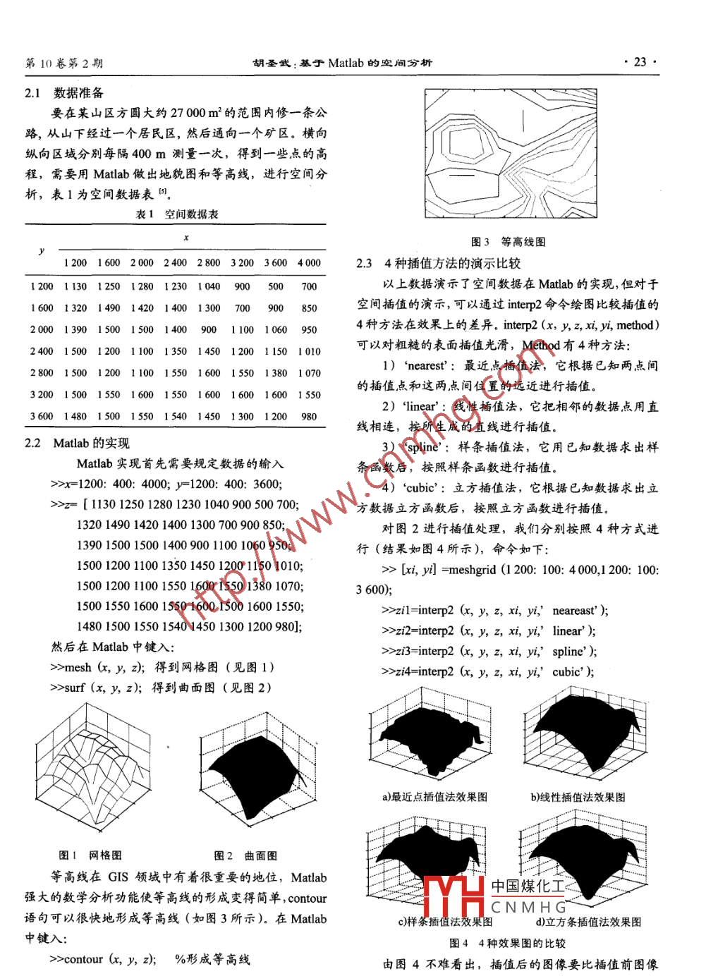 2012年4月地理空間信息Apr, 2012第10卷第2期GEOSPATIAL INFORMATIONVol. 10,No.2基于Matlab的空間分析胡圣武(河南理工大學(xué)測(cè)繪學(xué)院,河南焦作454000)摘要:空間分析被認(rèn)為是地理信息系統(tǒng)區(qū)別于一般信息系統(tǒng)、CAD或電子地圖系統(tǒng)的主要功能特征,也是評(píng)價(jià)一個(gè)地理信息系統(tǒng)的主要指標(biāo)。從介紹Matlab強(qiáng)大的數(shù)值計(jì)算功能和數(shù)據(jù)可視化功能著手,分析了Matlab在空間分析方面的技術(shù)應(yīng)用,重點(diǎn)研究了Matlab 在空間數(shù)據(jù)分析中插值法的應(yīng)用以及空間數(shù)據(jù)的三維表達(dá)。關(guān)鍵詞: Matlab; 空間分析;插值分析;三維表達(dá)中圖分類(lèi)號(hào): P208文獻(xiàn)標(biāo)志碼: B文章編號(hào): 1672-4623 (2012) 02-0022-03空間分析是GIS的核心和重要功能之一, GIs具1.1 Matlab 的特點(diǎn)有強(qiáng)大的空間分析功能,是區(qū)別計(jì)算機(jī)制圖系統(tǒng)和數(shù)Matlab的特點(diǎn)比較多,其主要特點(diǎn)為D!:①友好據(jù)庫(kù)管理系統(tǒng)的顯著特征之一n。空間分析使GIS不的工作平臺(tái)和編程環(huán)境;②簡(jiǎn)單易用的程序語(yǔ)言;③僅體現(xiàn)在地圖制圖上,用戶還可以通過(guò)與系統(tǒng)交互而強(qiáng)大的科學(xué)計(jì)算機(jī)數(shù)據(jù)處理能力;④出色的圖形處理將地理數(shù)據(jù)經(jīng)過(guò)分析轉(zhuǎn)換為對(duì)自己有用的信息。同時(shí),功能;⑤應(yīng)用廣泛的模塊集合工具箱;⑥實(shí)用的程序利用空間分析技術(shù),對(duì)原始數(shù)據(jù)模型進(jìn)行觀察和實(shí)驗(yàn),接口和發(fā)布平臺(tái);⑦應(yīng)用軟件開(kāi)發(fā)(包括用戶界面)。用戶可以獲得新的經(jīng)驗(yàn)和知識(shí),并以此為空間行為的1.2 Matlab 用于空間分析的優(yōu)點(diǎn)決策依據(jù)??臻g分析對(duì)空間信息的提取和傳輸,已使1)強(qiáng)大的空間模型成圖能力。Matlab能夠?qū)⒂?jì)算GIS成為區(qū)別于一般信息系統(tǒng)的主要功能特征,也是的結(jié)果以二維、三維乃至四維的圖形表現(xiàn)出來(lái),并且評(píng)價(jià)GIS功能強(qiáng)弱的重要指標(biāo)之一??蔀橛脩籼峁╈`可以通過(guò)對(duì)圖形線性、立面、色彩、渲染、光線、視活解決各類(lèi)專(zhuān)門(mén)問(wèn)題的有效工具。隨著空間分析技術(shù)角等特性的處理,把計(jì)算結(jié)果表現(xiàn)得淋漓盡致。的不斷發(fā)展,GIS也將從一-般的空間事務(wù)處理向空間決2)強(qiáng)大的圖像處理能力。圖像處理工具包是由一策支持方向邁進(jìn)”。系列支持圖像處理操作的函數(shù)組成的,所支持的圖像處理操作有:幾何操作、區(qū)域操作和塊操作,線性濾1 Matlab 理論波和濾波器設(shè)計(jì),變換(DCT變換),圖像分析和增Matlab是由美國(guó)Mathworks公司發(fā)布的主要面對(duì)強(qiáng),二值圖像操作等??茖W(xué)計(jì)算、可視化以及交互式程序設(shè)計(jì)的高科技計(jì)算Matlab不但提供非常方便的繪圖功能和強(qiáng)大的圖環(huán)境。它將數(shù)值分析、矩陣計(jì)算、科學(xué)數(shù)據(jù)可視化以形圖像處理能力,而且提供了增強(qiáng)的交互處理能力。顏及非線性動(dòng)態(tài)系統(tǒng)的建模和仿真等諸多強(qiáng)大功能集成色映射、線形、標(biāo)記、顏色、圖例、坐標(biāo)軸、多窗口.在一個(gè)易于使用的視窗環(huán)境中,為科學(xué)研究、工程設(shè)制圖根據(jù)用戶要求都可以定制;三維圖形可以縮放、旋計(jì)以及必須進(jìn)行有效數(shù)值計(jì)算的眾多科學(xué)領(lǐng)域提供了轉(zhuǎn)和改變視角4.一種全面的解決方案,并在很大程度上擺脫了傳統(tǒng)非3)豐富的庫(kù)函數(shù)。工具箱"tolbox” 是Matlab 擴(kuò)交互式程序設(shè)計(jì)語(yǔ)言的編輯模式,代表了當(dāng)今國(guó)際科展自身功能的開(kāi)放式的開(kāi)發(fā)模式。map和image是Matlab學(xué)計(jì)算軟件的先進(jìn)水平。提供的2個(gè)與GIS密切相關(guān)的工具箱。Matlab的基本數(shù)據(jù)單位是矩陣,它的指令表達(dá)式2基于Matlab的空間插值分析與數(shù)學(xué)、工程中常用的形式十分相似,故用Matlab來(lái)解算問(wèn)題要比用C、FORTRAN等語(yǔ)言完成相同的事情本文重點(diǎn)研究了二維插值空間分析方法,在插值簡(jiǎn)捷得多,并且Matlab也吸收了像Maple等軟件的優(yōu)廣]中國(guó)煤花士以某種方法描述數(shù)據(jù)點(diǎn),使Matlab成為-個(gè)強(qiáng)大的數(shù)學(xué)軟件.點(diǎn)之間TMHCNMH了4種插值方法,在分析成西雙不后,叮以丈對(duì)地用這幾種插值方法。收稿日期: 2011-08-22項(xiàng)目來(lái)源:國(guó)家白然科學(xué)基金資助項(xiàng)目(40474003)。第10卷第2期胡圣武:基于Matlab的空間分析2.1數(shù)據(jù)準(zhǔn)備要在某山區(qū)方圓大約27 000m2的范圍內(nèi)修一條公路,從山下經(jīng)過(guò)一個(gè)居民區(qū),然后通向一個(gè)礦區(qū)。橫向縱向區(qū)城分別每隔400 m測(cè)量- -次,得到一些點(diǎn)的高程,需要用Matlab做出地貌圖和等高線,進(jìn)行空間分析,表1為空間數(shù)據(jù)表51.表1空間數(shù)據(jù)表圖3等高線圖1200 1600 2000 2400 2800 3200 3600 4 0002.34種插值方法的演示比較1200 1130 1250 1280 1230 1040 90500700以上數(shù)據(jù)演示了空間數(shù)據(jù)在Matlab的實(shí)現(xiàn),但對(duì)于1600 1320 1