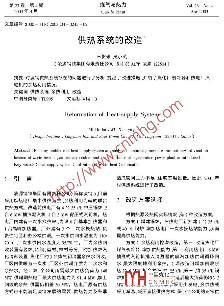 第23卷第4期煤氣與熱力Vol. 23 No 42003年4月Gas heatApr 200文章編號(hào):000-4416(20034-045-02供熱系統(tǒng)的改造米賀來(lái)吳小英凌源鋼鐵集團(tuán)有限責(zé)仼公司設(shè)計(jì)院遼寧凌源12504)摘要對(duì)凌鋼供熱系統(tǒng)存在的問(wèn)題進(jìn)行了分析提岀了改進(jìn)措施介紹了焦化廠初冷器和熱電廠汽輪機(jī)的余熱利用情況。關(guān)鍵詞拱熱系統(tǒng)涂熱利用改造中圖分類號(hào):TU995文獻(xiàn)標(biāo)識(shí)碼:BReformation of Heat-supply SystemMI He-lai, wU Xiao-yingDesign Institute, Lingyuan iron and Steel Group Co., Ltd. Lingyuan 122504, ChinaAbstract Existing problems of heat-supply system are analysed improving measures are put forward and utilization of waste heat of gas primary coolers and steam turbines of cogereration power plant is introducedKey words: heat-supply system i utilization of waste heat i reformation1引言蒸汽管網(wǎng)壓力不足住宅室溫過(guò)低。因此2001年對(duì)供熱系統(tǒng)進(jìn)行了改造。凌源鋼鐵集團(tuán)有限責(zé)任公司簡(jiǎn)稱淩鋼),目前采用以熱電廠集中供熱為主涂熱利用為輔的聯(lián)合2改造方案選擇供熱方式。改造前熱電廠有4臺(tái)35t/h中壓鍋爐2臺(tái)6MW抽汽凝汽機(jī),臺(tái)3MW背壓式汽輪機(jī)。熱根據(jù)熱源及熱網(wǎng)實(shí)際情況有2種改造方案。電廠內(nèi)建有一次水換熱站內(nèi)設(shè)6臺(tái)基本加熱器和方案1增建鍋爐。在熱電廠新擴(kuò)建1臺(tái)35t/h1臺(tái)高峰加熱器。廠外建有3個(gè)二次水換熱站負(fù)或40t/h鍋爐增加熱電廠一次水換熱站能力從而責(zé)住宅區(qū)和辦公樓供暖。一次水供回水溫度為110′提高供熱能力70℃二次水供回水溫度為95/70℃。廠內(nèi)余熱回方案2凃熱利用挖潛改造。第一,改造焦化廠收裝置有豎爐、煉鋼、型材、棒材等分廠的加熱爐汽煤氣初冷器增加供熱能力第二利用熱電廠6MW化冷卻裝置焦化廠的3臺(tái)煤氣初冷器余熱水回收。抽凝式汽輪機(jī)排入冷凝器的廢汽加熱供暖循環(huán)回廠區(qū)內(nèi)供暖為一次水廠區(qū)外供暖介質(zhì)為二次水和水最大限度地利用余熱。2項(xiàng)改造可增加回收余余熱水。經(jīng)計(jì)算全公司所需最大供熱負(fù)荷為148熱L中國(guó)煤化置nsth第三將35th鍋Mw供暖期熱電廠最大供熱能力為91.4MW加上爐擴(kuò)造后最大負(fù)荷仍缺3.2回收的余熱供需仍相差30MW。熱電廠原有供熱MWCNMH用少發(fā)電、多供熱或方式已不能滿足凌鋼發(fā)展的需要供熱能力及冬季采用減溫、減壓直接供熱方式保證全公司的正常供收稿日作者簡(jiǎn)介:米賀來(lái)(1∞0-)男遼寧凌源人工程師學(xué)士從事暖通工程設(shè)計(jì)、施工和運(yùn)行管理工作。246煤氣與熱力2003年熱再擴(kuò)容1臺(tái)35th鍋爐即可滿足需要。設(shè)自動(dòng)排氣閥以便自動(dòng)排除系統(tǒng)內(nèi)的空氣和及時(shí)在綜合考慮工程投資、運(yùn)行費(fèi)用、系統(tǒng)的安全性檢測(cè)初冷器泄漏情況防止發(fā)生事故。在焦化廠供和靈活性的基礎(chǔ)上根據(jù)凌鋼供熱系統(tǒng)的實(shí)際情況,暖泵房?jī)?nèi)增設(shè)兩臺(tái)補(bǔ)水泵和兩個(gè)電磁泄水閥門(mén)根選擇了利用余熱改造的方案。據(jù)管網(wǎng)壓力的大小對(duì)供暖余熱水系統(tǒng)自動(dòng)補(bǔ)水或泄水從而保證供熱系統(tǒng)和初冷器的正常生產(chǎn)運(yùn)行。3工程改造措施3.2對(duì)熱電廠的改造熱電廠供熱系統(tǒng)原為3MW的背壓式汽輪機(jī)在3.1焦化廠煤氣初冷器改造供暖期運(yùn)行利用汽輪機(jī)的排汽進(jìn)行供熱在非供暖焦化廠焦?fàn)t配套3臺(tái)橫管初冷器,每臺(tái)換熱面期停機(jī)萬(wàn)MW的抽汽凝汽機(jī)常年運(yùn)行額定進(jìn)汽量積為154m2總面積為462m。供暖期高溫段水64th壓力3.5MPa溫度435℃額定抽汽量45用于車間供暖中溫段、低溫段煤氣冷卻水采用冷卻th壓力1.0MPa排汽壓力0.003MPa冷凝器循塔冷卻非供暖期高、中溫段水用冷卻塔降溫低溫環(huán)冷卻水用冷卻塔降溫。段水采用制冷機(jī)冷卻。改造措施如下熱電廠2臺(tái)6MW抽凝式汽輪機(jī)的冷凝器循環(huán)煤氣余熱充分利用原來(lái)煤氣從77℃降至55冷卻水在供暖期采用冷卻塔降溫這部分熱量計(jì)16℃時(shí)熱量為6.Mw。增加初冷器高溫段換熱面積,MW折合抽汽為19.75th排入大氣l個(gè)供暖期損使煤氣與水更充分換熱來(lái)最大限度地利用煤氣余失約429萬(wàn)元。為此進(jìn)行下述改造。熱。新增加1臺(tái)1600m2初冷器當(dāng)做低溫段。改造1)在供暖期充分利用2臺(tái)汽輪機(jī)排出的廢后初冷器冷卻水系統(tǒng)的工藝過(guò)程為源有3臺(tái)初冷汽加熱供暖循環(huán)水(一次水迴水流程為洪暖回器并聯(lián)和新增加的初冷器作為煤氣程的低溫段)水先回汽輪機(jī)的冷凝器由60~70℃加熱到82~85聯(lián)運(yùn)行冬季高溫段冷卻水作為余熱水用于供暖煤℃然后進(jìn)入基本加熱器和高峰加熱器加熱到10氣進(jìn)出口溫度為83/55℃余熱水供回水溫度為67℃后送入用戶。為了保證系統(tǒng)的正常運(yùn)行增加150℃流量522m3/h)低溫段冷卻水采用循環(huán)水上個(gè)補(bǔ)水箱、2個(gè)電磁泄水閥門(mén)和2臺(tái)自動(dòng)補(bǔ)水泵根冷卻塔降溫(煤氣進(jìn)出口溫度為5935℃)夏季高據(jù)管網(wǎng)壓力對(duì)系統(tǒng)自動(dòng)補(bǔ)水或泄水溫段冷卻水用冷卻塔降溫低溫段冷卻水
