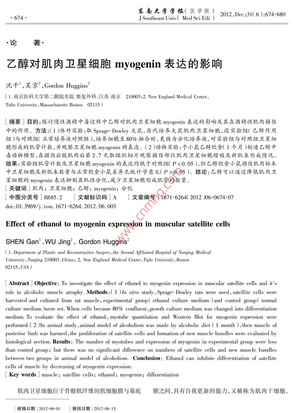 東南大學(xué)學(xué)報(bào)(醫(yī)學(xué)版)674J Southeast Univ( Med sci edi) 2012, Dec; 31(6): 674-680論著乙醇對(duì)肌肉衛(wèi)星細(xì)胞 myogenIn表達(dá)的影響沈干,吳京2, Gordon huggins(1.南京醫(yī)科大學(xué)第二附院東院整復(fù)外科,江蘇南京210003:2. New England medical centerTufts University, Massachusetts Boston 02115)摘要]目的:探討慢性酒精中毒過(guò)程中乙醇對(duì)肌肉衛(wèi)星細(xì)胞 myogen表達(dá)的影響及其在酒精性肌肉損傷中的作用。方法:(1)體外實(shí)驗(yàn):取 Sprag- Dowley大鼠,原代培養(yǎng)大鼠肌肉衛(wèi)星細(xì)胞,設(shè)實(shí)驗(yàn)鉏(乙醇作用組)與對(duì)照組(正常培養(yǎng)液對(duì)照組),培養(yǎng)細(xì)胞至80%融合時(shí),更換為分化培養(yǎng)液,對(duì)實(shí)驗(yàn)組與對(duì)照組衛(wèi)星細(xì)胞形成的肌管計(jì)數(shù),并觀察衛(wèi)星細(xì)胞 MyogeniN的表達(dá)。(2)動(dòng)物實(shí)驗(yàn):予小鼠廴醇飲食(個(gè)月)制造乙醇中毒動(dòng)物模型,在損傷后肢肌肉后第27天取組織切片觀察損傷部位肌肉衛(wèi)星細(xì)胞増殖及新肌柬形成情況。結(jié)果:實(shí)驗(yàn)組肌管計(jì)數(shù)及衛(wèi)星細(xì)胞 myogenIn的表達(dá)均低于對(duì)照組(P<0.05),但乙醇飲食小鼠損傷肌肉標(biāo)本中衛(wèi)星細(xì)胞及新肌東數(shù)量與正常飲食小鼠差異無(wú)統(tǒng)計(jì)學(xué)意義(P>0.05)。結(jié)論:乙醇可以通過(guò)降低肌肉衛(wèi)星細(xì)胞的 myogenin表達(dá)抑制其肌性分化,減少衛(wèi)星細(xì)胞形成肌管的數(shù)量關(guān)鍵詞]肌肉;衛(wèi)星細(xì)胞;乙醇; myogenIn;分化中圖分類(lèi)號(hào)]R685.2文獻(xiàn)標(biāo)識(shí)碼]A[文章編號(hào)]1671-6264(2012)06-0674-07doi:10.3969/j.issn.1671-6264.2012.06.003Effect of ethanol to myogenin expression in muscular satellite cellSHEN Gan', WU Jing, Gordon Huggins(1. Department of Plastic and Reconstructive Surgery, the Second Affiliated Hospital of Nanjing MedicalUniversity, Nanjing 210003, China 2. New England Medical Center, Tufts University, Boston02115,USA)L Abstract] Objective: To investigate the effect of ethanol to myogenin expression in muscular satellite cells and it'srole in alcoholic muscle atrophy. Methods: 1 )In vitro study, Sprage-Dowley rats were used, satellite cells wereharvested and cultured from rat muscle, experimental group( ethanol culture medium )and control group( normalculture medium )were set. When cells became 80% confluent, growth culture medium was changed into differentiationmedium. To evaluate the effect of ethanol, myotube quantitation and Western Blot for myogenin expression wereperformed.( 2 )In animal study, animal model of alcoholism was made by alcoholic diet( 1 month ) then muscle ofposterior limb was harmed, the proliferation of satellite cells and formation of new muscle bundles were evaluated byhistological section. Results: The number of myotubes and expression of myogenin in experimental group were lessthan control group; but there was no significant difference on numbers of satellite cells and new muscle bundlesbetween two groups in animal model of alcoholism. Conclusion: Ethanol can inhibite differentiation of satellitecreasing of myogI Key words muscle; satellite cells; ethanol; myogenin; differentiation肌肉衛(wèi)星細(xì)胞位于骨骼肌纖維的肌細(xì)胞膜與基底膜之間,具有自我更新的能力,又被稱(chēng)為肌肉干細(xì)胞「收稿日期]2012-06-01修回日期]2012-06-15沈干,等.乙醇對(duì)肌肉衛(wèi)星細(xì)胞 myogenIn表達(dá)的影響675在肌肉形成以及肌肉損傷修復(fù)中扮演重要作用。慢性中貼壁培養(yǎng),每2日換液Ⅰ次,待細(xì)胞接近80%融合酒精中毒可引起肌肉萎縮,甚至引起酒精性心臟病。時(shí)進(jìn)行實(shí)驗(yàn)。本硏究中作者對(duì)慢性酒精中毒過(guò)程中乙醇是否通過(guò)損1.2.3衛(wèi)星細(xì)胞向肌肉誘導(dǎo)分化將衛(wèi)星細(xì)胞培養(yǎng)害衛(wèi)星細(xì)胞而引起酒精性肌肉萎縮、降低衛(wèi)星細(xì)胞修液置換為誘導(dǎo)分化液(DMEM+2%馬血清),實(shí)驗(yàn)組分復(fù)損傷肌肉的能力作一探討?;囵B(yǎng)液中另加0.01%~1%的乙醇,分化培養(yǎng)1周1資料和方法觀察兩組衛(wèi)星細(xì)胞形成肌管( myotube)的數(shù)量。由非本實(shí)驗(yàn)參與人員隨機(jī)選擇不同培養(yǎng)時(shí)間培養(yǎng)皿中至少1.1實(shí)驗(yàn)動(dòng)物及分組3個(gè)光鏡下視野(×10),計(jì)算肌管的數(shù)量,并進(jìn)行統(tǒng)計(jì)日齡2~3 d sprag- Dowley(SD)大鼠及FVB成年學(xué)處理。小鼠來(lái)自查爾斯河實(shí)驗(yàn)室(美國(guó),波士頓)。(1)體外1.2.4衛(wèi)星細(xì)胞形成肌管的檢測(cè)鑒定細(xì)胞及肌管實(shí)驗(yàn)分組:獲取大鼠肌肉衛(wèi)星細(xì)胞后實(shí)驗(yàn)分實(shí)驗(yàn)組以多聚甲醛在-20℃下固定1min,然后由PBS漂洗2乙醇作用組)及對(duì)照組(正常培養(yǎng)液對(duì)照組)。衛(wèi)星次;以10%馬血清封阻1h,然后加入一抗 myogenIn及細(xì)胞生長(zhǎng)培養(yǎng)2d后更換為誘導(dǎo)分化液(DMEM+2%肌肉重鏈蛋白MHC(1:200小鼠單克隆抗體, Sigma公馬血清)誘導(dǎo)分化1周。實(shí)驗(yàn)組生長(zhǎng)培養(yǎng)液及分化液司產(chǎn)品)作用半小時(shí)后,以PBS漂洗2次,加入二抗中加入1%的乙醇,共作用9d。對(duì)照組衛(wèi)星細(xì)胞培養(yǎng)(抗小鼠二抗連接免疫熒光C3, Sigma公司產(chǎn)品),作不加乙醇。(2)動(dòng)物實(shí)驗(yàn)分組:FVB成年雄性小鼠,用半小時(shí)后,以PBS漂洗2次。細(xì)胞核以DAPI染色。體重20~30g,隨機(