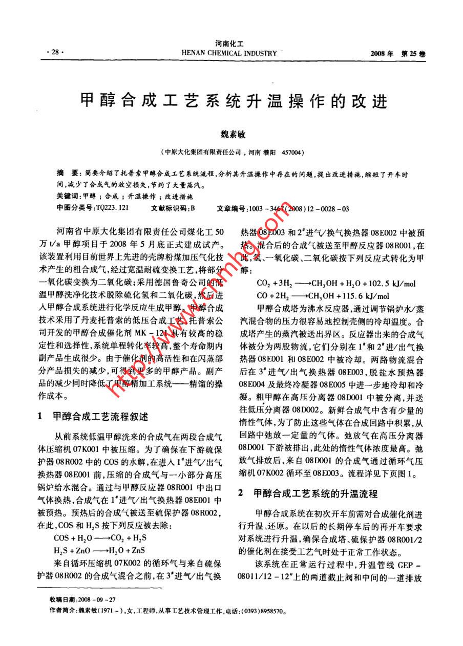 甲醇合成工藝系統(tǒng)升溫操作的改進(jìn)