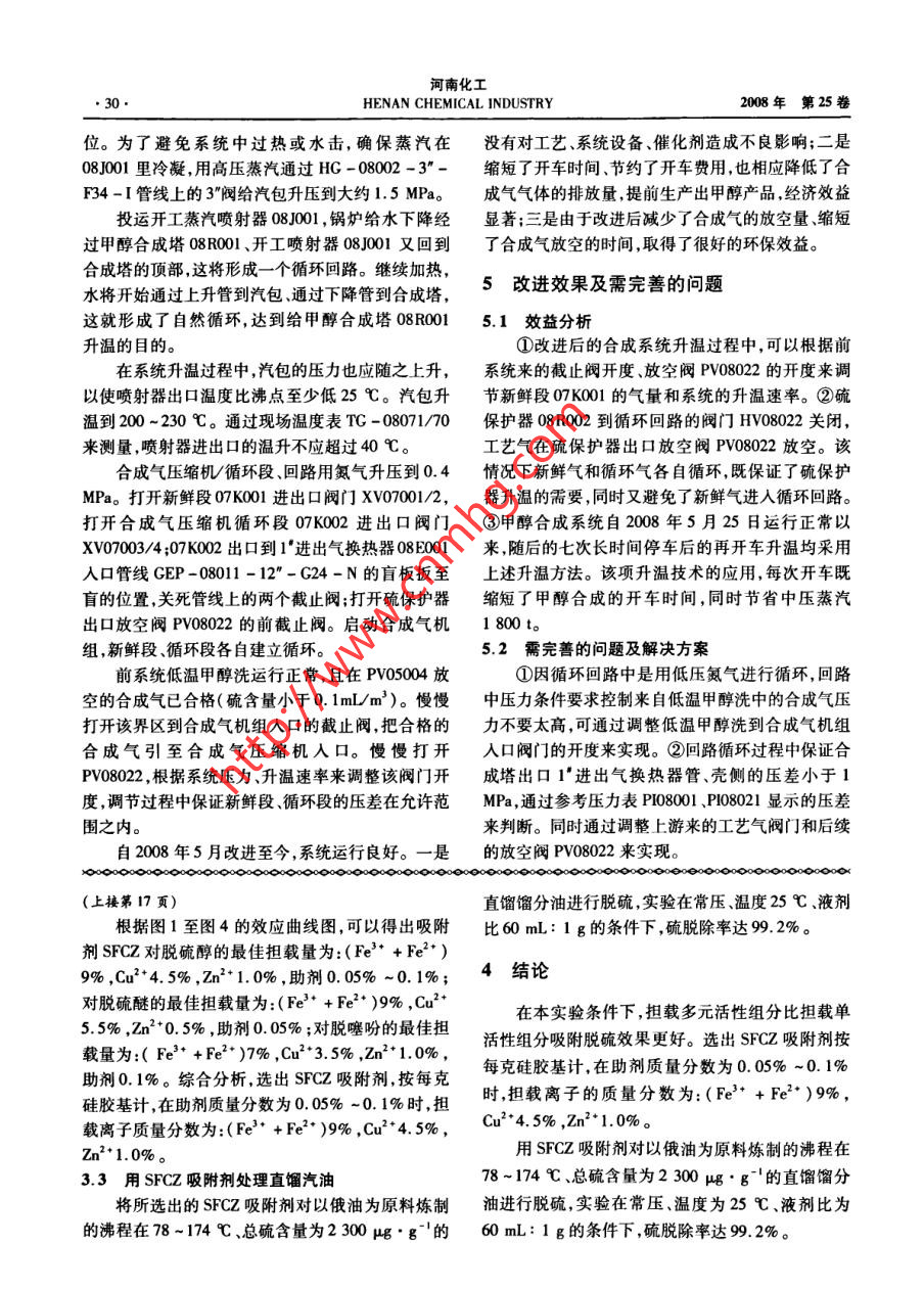 第12期魏素敏:甲醇合成工藝系統(tǒng)升溫操作的改進(jìn)08E00307K02F08J001Jm08R001車08R00207K0010804Q08E00508E00108D001注:虛線為改造前的升溫線圈1改造后的工藝流程示意圖閥與合成氣機(jī)組07K001高壓缸出口隔開(kāi),以避免到1"進(jìn)出氣換熱器08E001管側(cè),這樣來(lái)自合成氣合成氣進(jìn)入回路。在開(kāi)車需對(duì)回路進(jìn)行升溫時(shí),啟.機(jī)組循環(huán)段07K002、經(jīng)08E001殼程到硫保護(hù)器動(dòng)合成氣壓縮機(jī),高壓缸出口閥XV07002關(guān)閉,打08R002的氣體會(huì)被加熱,達(dá)到給08R002升溫的目開(kāi)GEP-08011/12-12"上的兩道截止閥、關(guān)閉兩閥的。中間的排放閥,1'進(jìn)出口換熱器08E00、硫保護(hù)器3存在問(wèn)題分析08R002串人回路。通過(guò)合成氣機(jī)組循環(huán)段07K002建立循環(huán),達(dá)到給合成系統(tǒng)升溫的目的。升溫操作開(kāi)車前對(duì)包括合成塔08R001、硫保護(hù)器如下:08R002在內(nèi)的合成系統(tǒng)進(jìn)行升溫時(shí),通過(guò)合成氣壓①啟動(dòng)合成氣機(jī)組,關(guān)閉新鮮段07K001到合縮機(jī)的循環(huán)段07K002與合成回路建立循環(huán)來(lái)進(jìn)成回路的出口閥XV07002,打開(kāi)合成氣壓縮機(jī)循環(huán)行。從07K002出來(lái)的循環(huán)氣分為兩路:一路經(jīng)3*段07K002進(jìn)出口閥門XV07003/4。07K002出口到進(jìn)出氣換熱器08E003、甲醇合成塔出口2'進(jìn)出氣換1'進(jìn)出氣換熱器08E001人口管線GEP - 08011 -熱器08E002,然后進(jìn)入合成塔,該管線尺寸為18",12”-G24-N的盲板扳至通的位置,打開(kāi)管線上的且管路中無(wú)閥門節(jié)流,流程順暢,阻力較小;另一路兩個(gè)截止閥。通過(guò)循環(huán)段07K002建立循環(huán),氮?dú)庋h(huán)氣經(jīng)過(guò)升溫管線GEP -08011/12-12",經(jīng)1"進(jìn)循環(huán)量至少達(dá)到15 000 Nm'/h(合成氣壓縮機(jī)/循出氣換熱器08E001、脫硫槽08R002 ,然后進(jìn)入合成環(huán)段、回路用氮?dú)馍龎旱?.4 MPa)。②檢查汽包回路,達(dá)到對(duì)硫保護(hù)器08R002升溫的目的。第二08D003是否充鍋爐給水到最低液位。為了避免系回路中,08R002床層相對(duì)換熱器來(lái)說(shuō)阻力較大,而統(tǒng)中過(guò)熱或水擊,確保蒸汽在08J001里冷凝,用高且該設(shè)備前后有兩個(gè)截止閥、一個(gè)止逆閥、-個(gè)調(diào)節(jié)壓蒸汽通過(guò)HC - 08002-3"-F34-I管線上的3"閥,理論上該流程中的管線、設(shè)備阻力較大。實(shí)際運(yùn)閥給汽包升壓到大約1.5 MPa。③投運(yùn)開(kāi)工蒸汽噴行時(shí),循環(huán)氣絕大部分從第一回路經(jīng)過(guò),第二回路中射器08J001, 鍋爐給水下降經(jīng)過(guò)甲醇合成塔基本沒(méi)有氣體通過(guò),達(dá)不到給脫硫槽08R002升溫08R001開(kāi)工噴射器08J001又回到合成塔的頂部,的目的。形成一個(gè)循環(huán)回路。繼續(xù)加熱,水將開(kāi)始通過(guò)上升要使溫度升到設(shè)計(jì)要求的180~210C,需要的管到汽包、通過(guò)下降管到合成塔,形成了自然循環(huán), .時(shí)間是近60 h。利用原設(shè)計(jì)的流程進(jìn)行升溫,開(kāi)車達(dá)到給甲醇合成塔08R001升溫的目的。④在系統(tǒng)時(shí)間較長(zhǎng)。另外,合成氣機(jī)組運(yùn)轉(zhuǎn)所用中壓蒸汽耗升溫的過(guò)程中,汽包的壓力也應(yīng)隨之上漲,以使噴射量為30~35th,能源浪費(fèi)極大。器出口溫度總是比沸點(diǎn)至少低25 C。汽包升溫到4升溫操作的改進(jìn)200 ~230 C。通過(guò)現(xiàn)場(chǎng)溫度表TG -08071/70來(lái)測(cè)量,噴射器進(jìn)出口的溫升不應(yīng)超過(guò)40 C。⑤隨著合主要從以下幾方面進(jìn)行升溫操作的改進(jìn):成塔溫度的升高,從合成塔出來(lái)的循環(huán)氣把熱量帶檢查汽包08D003是否充鍋爐給水到最低液河南化工●30.HENAN CHEMICAL INDUSTRY2008年第25 卷位。為了避免系統(tǒng)中過(guò)熱或水擊,確保蒸汽在沒(méi)有對(duì)工藝、系統(tǒng)設(shè)備、催化劑造成不良影響;二是08J001里冷凝,用高壓蒸汽通過(guò)HC -08002 -3"-縮短了開(kāi)車時(shí)間.節(jié)約了開(kāi)車費(fèi)用,也相應(yīng)降低了合F34-I管線上的3”閥給汽包升壓到大約1.5MPa。成氣氣體的排放量,提前生產(chǎn)出甲醇產(chǎn)品,經(jīng)濟(jì)效益投運(yùn)開(kāi)工蒸汽噴射器08J001,鍋爐給水下降經(jīng)顯著;三是由于改進(jìn)后減少了合成氣的放空量、縮短過(guò)甲醇合成塔08R001、開(kāi)工噴射器08J001又回到了合成氣放空的時(shí)間,取得了很好的環(huán)保效益。合成塔的頂部,這將形成-一個(gè)循環(huán)回路。繼續(xù)加熱,5改進(jìn)效果及需完善的問(wèn)題水將開(kāi)始通過(guò)上升管到汽包、通過(guò)下降管到合成塔,這就形成了自然循環(huán),達(dá)到給甲醇合成塔08R0015.1效益分析升溫的目的。①改進(jìn)后的合成系統(tǒng)升溫過(guò)程中,可以根據(jù)前在系統(tǒng)升溫過(guò)程中,汽包的壓力也應(yīng)隨之上升,系統(tǒng)來(lái)的截 止閥開(kāi)度、放空閥PV08022的開(kāi)度來(lái)調(diào)以使噴射器出口溫度比沸點(diǎn)至少低25 C。汽包升節(jié) 新鮮段07K001的氣量和系統(tǒng)的升溫速率。②硫溫到200 ~230 C。通過(guò)現(xiàn)場(chǎng)溫度表TC -08071/70保護(hù)器08R0O2到循環(huán)回路的閥門HV08022關(guān)閉,來(lái)測(cè)量,噴射器進(jìn)出口的溫升不應(yīng)超過(guò)40C。工藝氣在硫保護(hù)