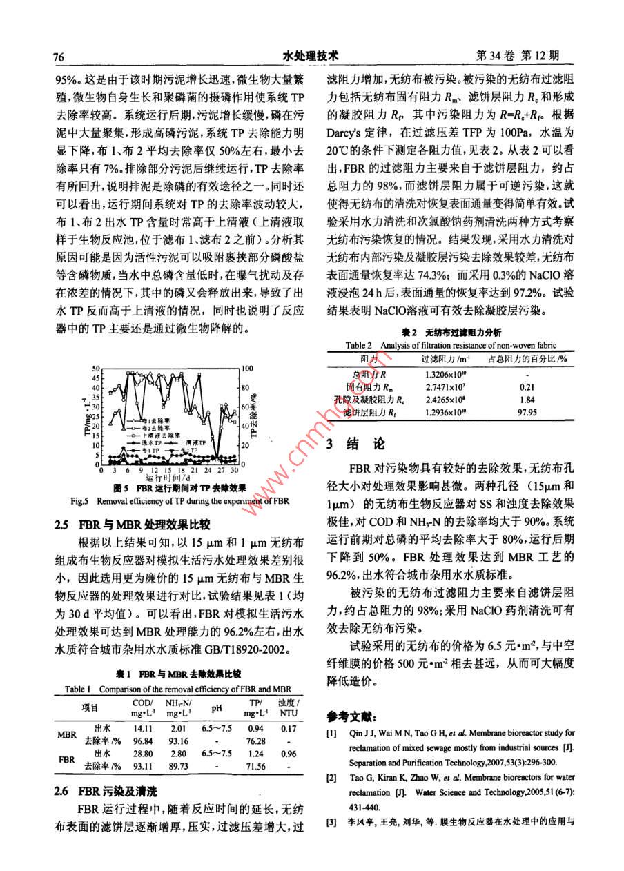 第34卷第12期水處理技術(shù)Vol.34 No.12742008年12月TECHNOLOGY OF WATER TREATMENTDe.2008FBR工藝處理生活污水試驗(yàn)研究程恒衛(wèi),張景成,張彥平,王燕妮2(1.中核能源科技有限公司,北京100084; 2.哈 爾濱工業(yè)大學(xué)市政環(huán)境工程學(xué)院,黑龍江哈爾濱150090;3.河北工業(yè)大學(xué)土木工程學(xué)院,天津300401)摘要;采用價(jià)格低廉的無(wú)紡布代替膜生物反應(yīng)器中的膜組件組成新型無(wú)紡布生物反應(yīng)器(Fabric bioreactor,FBR),研究了兩種孔徑的無(wú)紡布(15μum和1μm)生物反應(yīng)器對(duì)模擬生活污水的處理效果,并對(duì)FBR工藝的污染情況進(jìn)行了分析。試驗(yàn)結(jié)果表明,兩種孔徑的無(wú)紡布的處理效果差別甚微; FBR工藝對(duì)濁度、SS.COD和NH-N的平均去除效果很好。出水符合城市雜用水水質(zhì)標(biāo)準(zhǔn)。平行試驗(yàn)結(jié)果表明,FBR工藝對(duì)生活污水的處理效果達(dá)到MBR工藝的96.2%.采用NaCl0溶液可有效清洗被污染的無(wú)紡布,表面通量的恢復(fù)率達(dá)到97.2%。關(guān)鋤詞:布生物反應(yīng)器;膜生物反應(yīng)器;污水處理中圖分類號(hào):X703.1文獻(xiàn)標(biāo)識(shí)碼:A文章編號(hào): 100002008)2070-04膜生物反應(yīng)器(MBR)作為-種高效水處理 I工0.8 m,有效容積為50 L。采用工業(yè)用無(wú)紡濾布,材質(zhì)藝,具有出水水質(zhì)好、占地面積少等優(yōu)點(diǎn),在污水處為滌綸,過(guò)濾孔徑選用1μm和15μm兩種;中空纖理及回用方面有著廣闊的應(yīng)用前景146。 目前限制維膜組件為天津膜天膜工程技術(shù)有限公司生產(chǎn)的MBR廣泛應(yīng)用的主要原因是MBR系統(tǒng)中膜組件MF膜,膜孔徑為0.2μm,膜面積為1m2。原水由水造價(jià)過(guò)高7,強(qiáng)度較低,使用壽命較短,運(yùn)行能耗高間。箱進(jìn)入好氧生物反應(yīng)器,反應(yīng)器內(nèi)的液位由浮球閥針對(duì)MBR的以上缺點(diǎn),國(guó)內(nèi)外研究者采用廉價(jià)的控制,浮球閥的位置可調(diào)整,以便設(shè)定不同的停留時(shí)微網(wǎng)材料作為膜基材,研究了動(dòng)態(tài)膜生物反應(yīng)器的間。污水在反應(yīng)器內(nèi)經(jīng)微生物降解后,-部分出水通工藝特性和運(yùn)行效果,取得了諸多研究成果|410。本過(guò)無(wú)紡布重力流出,然后經(jīng)蠕動(dòng)泵排至出水箱;同試驗(yàn)采用價(jià)格低廉的無(wú)紡布代替膜生物反應(yīng)器中的時(shí),另一部分出水在蠕動(dòng)泵負(fù)壓抽吸作用下通過(guò)膜膜組件,通過(guò)活性污泥過(guò)濾過(guò)程中形成的生物動(dòng)態(tài)盧膜實(shí)現(xiàn)近似于微濾膜的過(guò)濾效果,組成新型的無(wú)紡布生物反應(yīng)器(Fabric bioreactor, FBR),該技術(shù)具:g然有造價(jià)低運(yùn)行費(fèi)用低、膜污染易于控制等優(yōu)點(diǎn)。試8四土驗(yàn)研究了FBR工藝在重力自流條件下對(duì)模擬生活污水的處理效果,并對(duì)FBR在運(yùn)行過(guò)程中的污染情17況進(jìn)行了分析。1材料與方法1一原水箱:2-生物反應(yīng)池:3- -中察纖維膜組件:4-濾布1;1.1 試驗(yàn)裝t5- -濾布2:6空氣壓縮機(jī):7-氣體流量計(jì):8-浮球閥:9 -真試驗(yàn)采用的反應(yīng)器裝置如圖1所示。為了便于空表;10-蠕動(dòng)索:11- 時(shí)間控制器: 12-一液體流量計(jì):13-溫挖和MBR對(duì)比,整個(gè)系統(tǒng)由好氧生物反應(yīng)器和無(wú)紡裝置:14-矚氣器;IS- -導(dǎo)流隔板:16-穿孔騙板:17一出水箱圈1試驗(yàn)裝置布/膜組件組成。生物反應(yīng)器長(zhǎng)0.5m,寬0.2m,高Fig.1 Schematic of the FBR and MBR experimental system收稿日期:2008-03-11作者簡(jiǎn)介:程恒衛(wèi)(1977-) ,男,碩七, T程師,研究方向?yàn)槟ぜ夹g(shù)及水污染治理聯(lián)系電話: 13810862985; E-mail: chwhit@163.com.程恒衛(wèi)等,F(xiàn)BR工藝處理生活污水試驗(yàn)研究75組件排入出水箱中。試驗(yàn)過(guò)程中采用空氣壓縮機(jī)提水平均COD分別為28.8 mg*L"和26.6mgL'.這是供連續(xù)曝氣,曝氣量通過(guò)閥門、氣體流量計(jì)控制調(diào)因?yàn)樵谶\(yùn)行過(guò)程中,微生物在無(wú)紡布表面聚集,生成節(jié)。反應(yīng)器內(nèi)水溫通過(guò)溫度控制裝置保持在18C+了具有有效攔截作用的動(dòng)態(tài)生物膜:同時(shí)無(wú)紡布內(nèi)1C。膜出水流量通過(guò)液體流量計(jì)直接讀出。真空表部的立體網(wǎng)狀結(jié)構(gòu)及大量的空隙又為微生物的生長(zhǎng)可顯示膜過(guò)濾壓差的變化。提供了良好的棲息點(diǎn),使得無(wú)紡布本身具有物理和1.2 試驗(yàn)用水生物雙重?cái)r截作用,從而彌補(bǔ)了布一-孔徑大的不足。采用人工配水模擬生活污水,基本水質(zhì)為系統(tǒng)運(yùn)行期間發(fā)生污泥膨脹,但系統(tǒng)出水水質(zhì)并未COD 300 ~460 mg"L',NH;-N 18~30 mg'L',TP受到明顯影響,這說(shuō)明污泥膨脹對(duì)FBR處理效果影2.2~4.5 mg*L',pH 6.5~7.5,溫度18C。響很小。13分析項(xiàng)目與方法濁度: WG2-200濁度儀:COD:5B-6型COD速60000500測(cè)儀;NHjN:納氏試劑比色法;TP:鉬銻抗分光光度法:SS:重量法(ALC-110.4梅特勒-托利多電子天平、PHG-9070A電熱恒溫鼓風(fēng)干燥箱)。2結(jié)果與討論1002.1濁度和 ss的去除? 運(yùn)行時(shí)間/d2”2427.30圖2為運(yùn)行期間系統(tǒng)出水濁度變化曲線。由圖圈3 FBR 運(yùn)行期間對(duì)COD去除效果2可見(jiàn),運(yùn)行初期濁度小于4 NTU,隨著運(yùn)行時(shí)間的Fig.3 Re