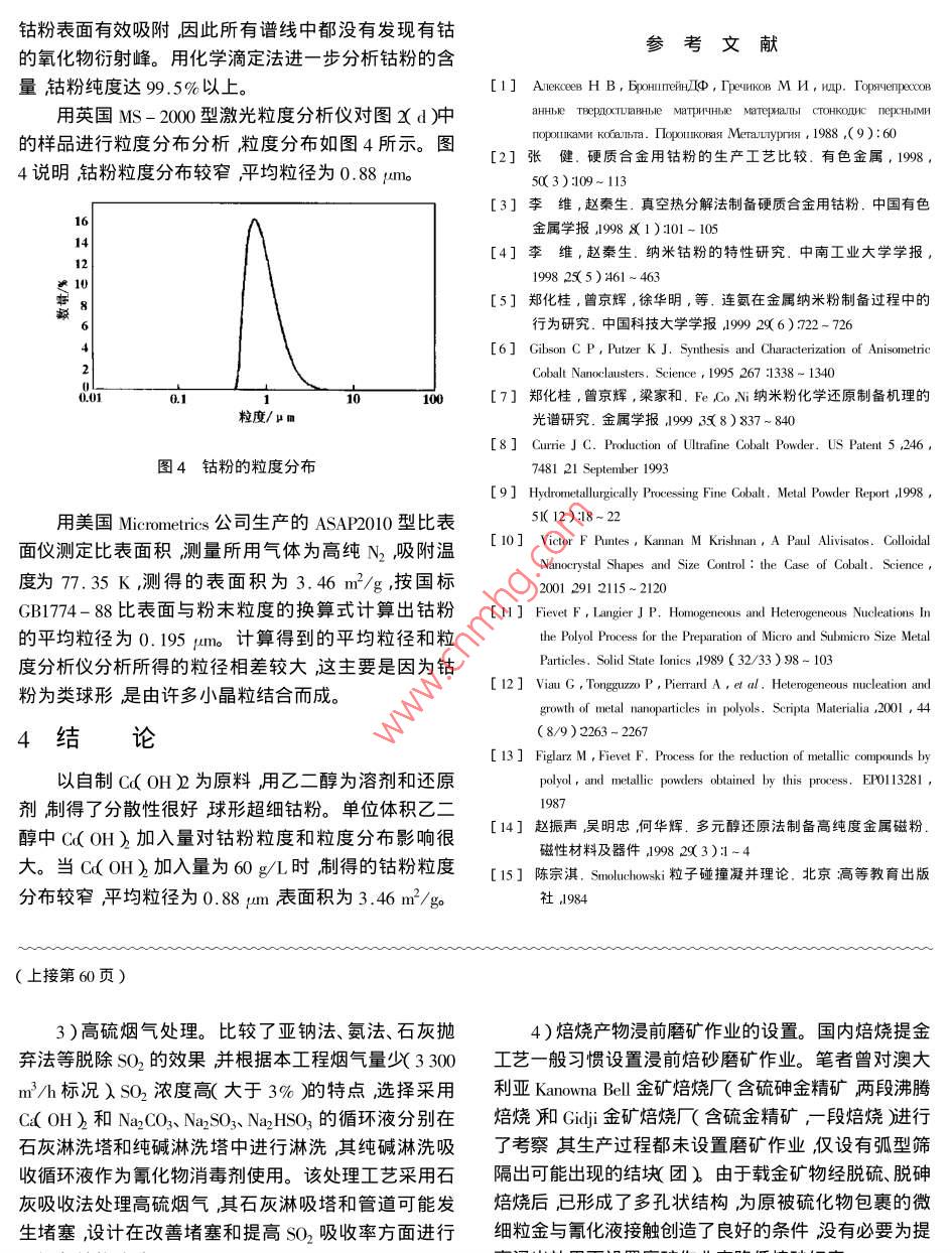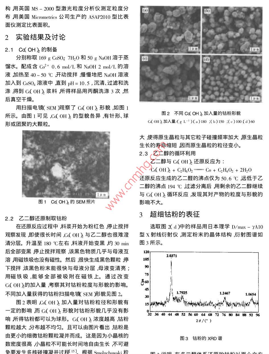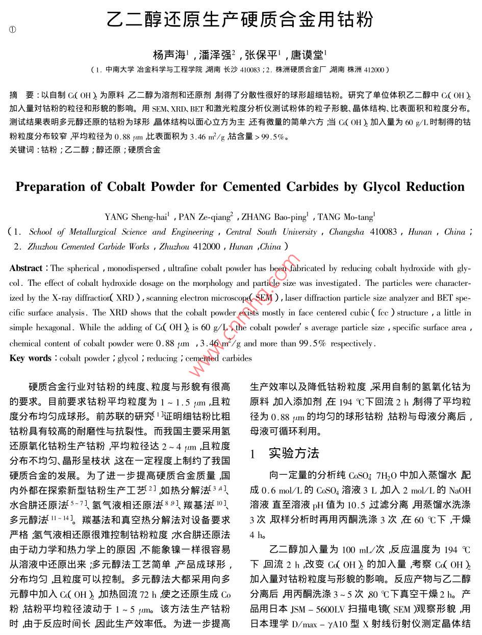 乙二醇還原生產(chǎn)硬質(zhì)合金用鈷粉楊聲海,潘澤強(qiáng)2,張保平1,唐謨堂1.中南大學(xué)冾金科學(xué)與工程學(xué)院湖南長(zhǎng)沙410083;2,株洲硬質(zhì)合金廠湖南株洲412000摘要∶以自制α&OH)為原料乙二醇為溶劑和還原劑制得了分散性很好的球形超細(xì)鈷粉。研究了單位體積乙二醇中G(OH加入量對(duì)鈷粉的粒徑和形貌的影響。用 SEM XRD、BET和激光粒度分析儀測(cè)試粉體的粒子形貌、晶體結(jié)構(gòu)、比表面積和粒度分布。測(cè)試結(jié)果表明多元醇還原的鈷粉為球形晶體結(jié)構(gòu)以面心立方為主還有微量的簡(jiǎn)單六方當(dāng)(OH)加入量為60gL時(shí)制得的鈷粉粒度分布較窄嚴(yán)均粒徑為0.88{m比表面積為3.46m2/g鈷含量>99.5%關(guān)鍵詞:鈷粉;乙二醇;醇還原;硬質(zhì)合金Preparation of Cobalt Powder for Cemented Carbides by Glycol ReductionYANG Sheng-hai, PAN Ze-giang, ZHANG Bao-ping, TANG Mo-tang'(1. School of Metallurgical Science and Engineering Central South University, Changsha 410083, Hunan, ChinaZhuzhou Cemented Carbide Works, Zhuzhou 412000, Hunan ChinaAbstract: The spherical monodispersed ultrafine cobalt powder has been fabricated by reducing cobalt hydroxide with gly-col. The effect of cobalt hydroxide dosage on the morphology and particle size was investigated. The particles were character-ized by the X-ray diffraction( XRD ) scanning electron microscope SEM), laser diffraction particle size analyzer and BET spcific surface analysis. The XRD shows that the cobalt powder exists mostly in face centered cubic( fec)structure a little insimple hexagonal. While the adding of Cd OH is 60 g/L, the cobalt powder s average particle size specific surface areachemical content of cobalt powder were 0. 88 um 3 46 m/g and more than 99.5%0 respectivelyKey words: cobalt powder i glycol reducing cemented carbides硬質(zhì)合金行業(yè)對(duì)鈷粉的純度、粒度與形貌有很高生產(chǎn)效率以及降低鈷粉粒度采用自制的氫氧化鈷為的要求。目前要求鈷粉平均粒度為1-1.5m且粒原料加入添加劑在194℃下回流2h制得了平均粒度分布均勻成球形。前蘇聯(lián)的硏究證明細(xì)鈷粉比粗徑為0.88{m的均勻的球形鈷粉鈷粉與母液分離后,鈷粉具有較高的耐磨性與抗裂性。而我國主要采用氬母液可循環(huán)利用。還原氧化鈷粉生產(chǎn)鈷粉平均粒徑達(dá)2~4{m且粒度分布不均勻、晶形呈枝狀這在一定程度上制約了我國實(shí)驗(yàn)方法硬質(zhì)合金的發(fā)展。為了進(jìn)一步提高硬質(zhì)合金質(zhì)量國向一定量的分析純CoSO7H2O中加入蒸餾水配內(nèi)外都在探索新型鈷粉生產(chǎn)工藝2如熱分解法34、成0.6mo/L的CosO4溶液3L加入2mol/L的NaOH水合肼還原法5門氫氣液相還原法83羰基法⑩溶液直至溶液pH值為10.5過濾分離用蒸餾水洗滌多元醇法-μ4。羰基法和真空熱分解法對(duì)設(shè)備要求3次取樣分析時(shí)再用丙酮洗滌3次在60℃下干燥嚴(yán)格氳氣液相還原很難控制鈷粉粒度水合肼還原法4h。由于動(dòng)力學(xué)和熱力學(xué)上的原因不能象鎳一樣很容易乙二醇加入量為100mL次反應(yīng)溫度為194℃從溶液中還原岀來迻多元醇法工藝簡(jiǎn)單產(chǎn)品成球形,下回流2h改變?chǔ)罯H)的加入量考察αOH)分布均勻且粒度可以控制。多元醇法大都采用向多加入量對(duì)鈷粉粒度與形貌的影響。反應(yīng)產(chǎn)物與乙二醇元醇中加入α&OH)加熱回流η2h使之還原生成Co分離后用丙酮洗滌3~5次80℃下真空干燥2h。產(chǎn)粉鈷粉平均粒徑波動(dòng)于1~5μm。該方法生產(chǎn)鈷粉品用日本JsM-5600LV掃描電鏡SEM規(guī)觀察形貌用時(shí)由于反應(yīng)時(shí)間長(zhǎng)因此生產(chǎn)效率低。為進(jìn)一步提高日本理學(xué)D/max-yA0型X射線衍射儀測(cè)定晶體結(jié)構(gòu)用英國MS-2000型激光粒度分析儀測(cè)定粒度分布用美國 Micrometrics公司生產(chǎn)的ASAP2010型比表面儀測(cè)定比表面積2實(shí)驗(yàn)結(jié)果及討論2.1caOH2的制備分別稱取169gC0;7HO和50 g NaoH溶于蒸c餾水。配成含C2+0.6mol/L和NaOH2mol/L的溶液加熱至40~50℃開動(dòng)攪拌慢慢地把NaOH溶液加入到CSO4溶液中直到pH=10.5,沉清、過濾和洗滌得到C(OH)漿料所得樣品用丙酮洗滌3次然后真空干燥。用掃描電鏡(SEM規(guī)觀察了COH)形貌如圖1所示。由圖1可見,C(OH的型貌各異有針形、球圖2不同caOH)加入量的鈷粉形貌形或團(tuán)聚的大顆粒。C(OH)加入量(gL-1)(a)180;(b)150;(c)l00(d)60大使得原生晶粒與其它粒子碰撞頻率加大原生晶粒生長(zhǎng)的壽命縮短因而原生晶粒的粒徑變小。2.3乙二醇的循環(huán)利用乙二醇與C(OH)還原反應(yīng)為Cd OH)+C2H6O2C2H4O2+ 2H2O還原反應(yīng)生成的乙二醛的沸點(diǎn)僅為50.6℃遠(yuǎn)低于乙二醇的沸點(diǎn)194℃過濾分離后用剩余的乙二醇繼續(xù)與COH)循環(huán)反應(yīng)發(fā)現(xiàn)其對(duì)產(chǎn)物的粒度與形貌的圖1cdOH)的SEM照片影響不大。2.2乙二醇還原制取鈷粉3超細(xì)鈷粉的表征在還原反應(yīng)過程中料漿開始為粉紅色停止攪拌選取圖xd)中的樣品用日本理學(xué)D/max-YA10觀察發(fā)現(xiàn)即使很長(zhǎng)時(shí)間OH)與乙二醇也很難澄型ⅹ射線衍射儀測(cè)定粉末的晶體結(jié)構(gòu)衍射圖譜如清分層。升溫至180℃左右料液開始變黑約30min圖3所示。后全部變黑停止攪拌觀察該黑色物質(zhì)幾乎與母液互2.0371溶用磁鐵吸也沒有磁性。然后很快生成黑色顆粒獰10下攪拌該黑色粉末能很快與母液分層母液變清亮用磁鐵吸,