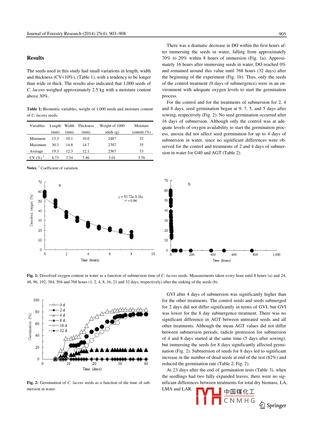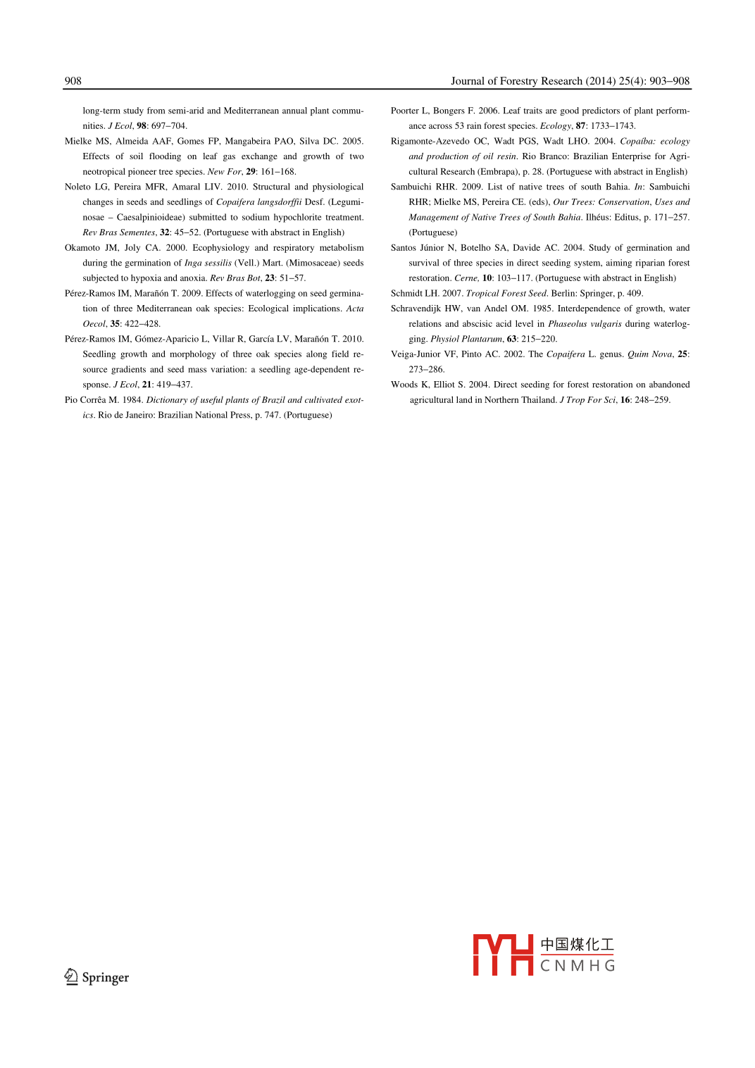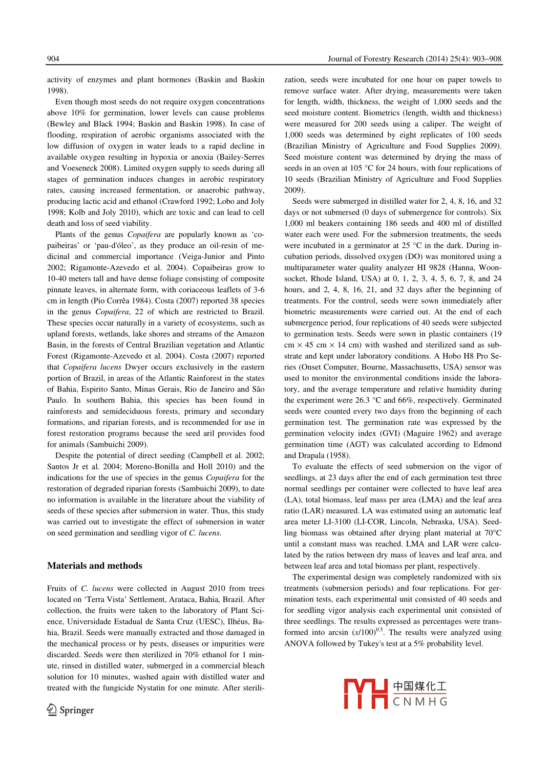 Journal of Forestry Research (2014) 25(4): 903- 908DOI 10.1007/s1 1676-014-0537-zORIGINAL PAPEREffects of submergence in water on seed germination and vigor of theCopaifera lucens (Fabaceae) seedlingsDaniela Baldez Vidal●Isis Leite Andrade●Eusinia Louzada Pereira AndradeMarcelo Schramm MielkeReceived: 2013-03-01;Acepted: 2013-12-03◎Northeast Forestry University and Springer-Verlag Berlin Heidelberg 2014Abstract: We analyzed the tolerance of Copaifera lucens seeds to sub-mersion in water to assess the use of this species for direct seeding inriparian forest restoration programs. Seeds were submerged in water forIntroduction2, 4, 8, 16 and 32 days or not submerged (control = 0 days of submer-gence). For the control and at the end of each period of submersion,Riparian forests occur along waterways and function as regula-germination and seedling vigor tests were carried out. For germination tors of water flow, sediment and nutrients between the uppertests, seeds were sown in plastic pots containing sand and kept in labora-parts of the watershed and the aquatic ecosystems (Kozlowskitory conditions. The percentage of seed germination, the germination rate2002). Because riparian forests are located near watercourses,and the average germination time were analyzed. For seedlings, totalthese ecosystems are highly unstable forest formations and sus-biomass, leaf area, leaf mass per area and leaf area ratio were analyzed.ceptible to periodic flooding (Budke et al. 2008). Although pro-Submersion time drastically affected the dissolved oxygen content andtected by law, most of the riparian forests of the Brazilian Atlan-seed germination. Between 4 and 8 days of submersion there was a de-tic Rainforest are degraded and require the results of scientificcrease from 83.8% to 15.6% in the germination percentage. No seedstudies to provide basic information applicable to forest restora-germination occurred after 16 days of submersion. Although there was ation programs (Mielke et al. 2005; Lavinsky et al. 2007).significant decrease in the percentage of seed germination between 4 andKnowledge of the environmental requirements for tree species8 days of submersion, seedling vigor was not affected. Seeds of thisto be used for restoration of degraded riparian forests can assistin developing strategies that enhance the establishment of seed-lucens is a promising species for direct seeding in riparian forest restora-lings, reduce costs and increase the success of restoration. Con-tion projects.sidering expense, convenience, and ease of planting, direct seed-ing is a promising technique that has been tested for restorationKeywords: Copaiba, Brazilian Atlantie Forest, forest restoration, germi-of forest ecosystems (Engel and Parotta 2001; Camargo et al.nation, vigor2002; Woods and Elliot 2004; Doust et al. 2008; Bonilla-Morenoand Holl 2010; Cole et al. 201 1), including riparian forests (San-tos Jr et al. 2004; Ferreira et al. 2009). Studies of the viability ofseeds of forest species subjected to submersion in water can beuseful for the planning and success of projects to recover de-graded riparian forests.The online version is available at http:// www .springerlink.comSeed germination is one of the main factors affecting theDepartment of Agricultural and Environmental Sciences, State Universityfor production of seedlings in forest nurseries (Schmidt 2007). .of Santa Cruz, BR 415, km 16, lheus 45662 -300, Bahia. Brazil.The effectiveness of seed germination is closely related to seedrequirements such as water availability, gas composition, andIsis Leite Andrade●Marcelo Schramm Mielke )Department of Biological Sciences, State University of Santa Cruz, BRiting factor for the germination of non-dormant seeds, and affects415, km 16. Iheus 45662300, Bahia, Brazil.the rate, speed and uniformity of the process. Adequate supply ofEmail: msmielke@ uesc.brwater to the seed is associated with the mohilization of reservesCorresponding editor: Zhu Hongand release of中國煤化工: stimulates thefYHCNMHG包Springer904Journal of Forestry Research (2014) 25(4): 903- -908activity of enzymes and plant hormones (Baskin and Baskin998).remove surface water. After drying, measurements were takenEven though most seeds do not require oxygen concentrationsfor length, width, thickness, the weight of 1,000 seeds and theabove 10% for germination, lower levels can cause problemsseed moisture content. Biometrics (length, width and thickness)(Bewley and Black 1994; Baskin and Baskin 1998). In case offlooding, respiration of aerobic organisms associated with the1,000 seeds was determined by eight replicates of 100 seedslow diffusion of oxygen in water leads to a rapid decline in(Brazilian Ministry of Agriculture and Food Supplies 2009).available oxygen resulting in hypoxia or anoxia (Bailey-SerresSeed moisture content was determined by drying the mass ofand Voeseneck 2008). Limited oxygen supply to seeds during allseeds in an oven at 105 °C for 24 hours, with four replications ofstages of germination induces changes in aerobic respiratory10 seeds (Brazilian Ministry of Agriculture and Food Suppliesrates, causing increased fermentation, or anaerobic pathway,2009).producing lactic acid and ethanol (Crawford 1992; Lobo and JolySeeds were submerged in distilled water for 2, 4, 8, 16, and 32days or not submersed (0 days of submergence for controls). Sixdeath and loss of seed viability.1,000 ml beakers containing 186 seeds and 400 ml of distilledlPlants of the genus Copaifera are popularly known as‘co-water each were used. For the submersion treatments, the seedspaibeiras' or 'pau-d"'leo', as they produce an oil-resin of me-were incubated in a germinator at 25。C in the dark. During in-dicinal and commercial importance (Veiga-Junior and Pintocubation periods, dissolved oxygen (DO) was monitored using a2002; Rigamonte-Azevedo et al. 2004). Copaibeiras grow to multiparameter water quality analyzer HI 9828 (Hanna, Woon-10-40 meters tall and have d