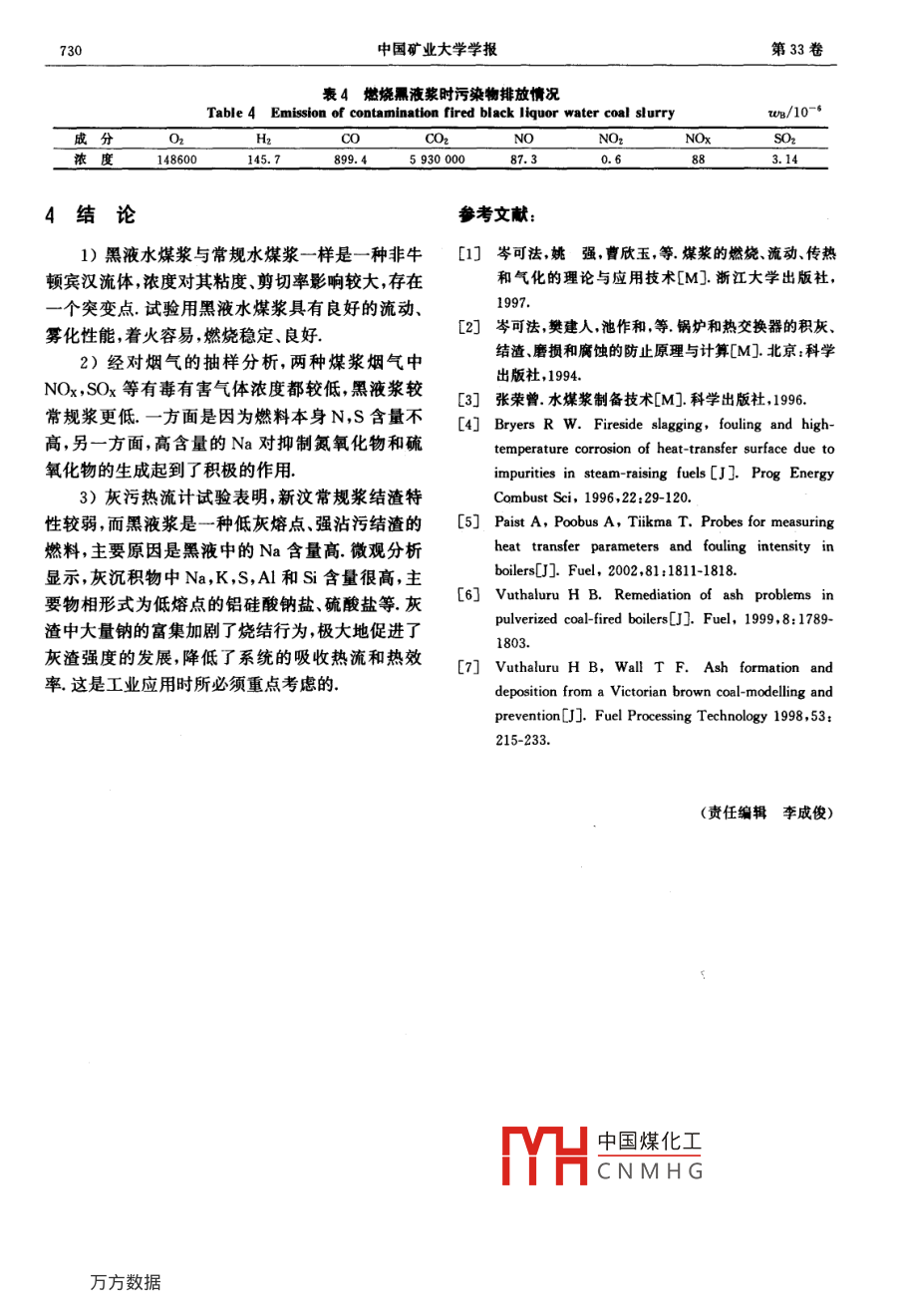 第33卷第6期中國礦業(yè)大學(xué)學(xué)報2004年11月Journal of China University of Mining & TechnologyNov.2004文章編號:1000-1964(2004)06-0726-05黑液水煤漿在0.25MW爐內(nèi)的燃燒和結(jié)渣特性王鳳寅3,曹欣玉2,周志軍2,楊家存3,李偉,陳振3,蘭澤全2(1.中國礦業(yè)大學(xué)化學(xué)與環(huán)境工程學(xué)院北京100083;2.浙江大學(xué)熱能工程系,浙江杭州3100273新汶礦業(yè)集團,山東新泰271219)摘要:為了考察黑液水煤漿工業(yè)應(yīng)用的可行性,在0.25MW試驗爐上對新汶良莊礦常規(guī)和黑液兩種水煤漿作熱態(tài)對比試驗以研究煤漿的流動、霧化、著火、燃燒、沾污結(jié)渣及污染物排放特性.借助自制灰污熱流計分析了兩種煤漿的沾污結(jié)渣趨勢.結(jié)果表明,相對常規(guī)漿而言,黑液漿具有良好的流動、霧化性能,著火容易,燃燒穩(wěn)定,還具有低污染排放,低灰熔點、強結(jié)渣的特點.故黑水煤漿在電站鍋爐和工業(yè)鍋爐中應(yīng)用是可行的關(guān)鍵詞:黑液水煤漿;霧化性能;沾污結(jié)渣特性;工業(yè)應(yīng)用中圖分類號:TQ529文獻標(biāo)識碼:ABurning and Clinkering Properties of black LiquorCoal Water Slurry in 0. 25MW FurnaceWANG Feng-ying, CAO Xin-yu, ZHOU Zhi-jun, YANG Jia-cun,LI Wei, ChEn Zhen, Lan Ze-quan'(1. School of Chemical and Environmental Engineering, CUMT, Beijing 100083, China;2. Department of Thermal Engineering, Zhejiang University, Hangzhou, Zhejiang 310027, China3. Xinwen Mining Bureau, Xintai, Shandong 271219, China)Abstract: Thermal state comparative test between the normal coal water slurry (CwS)and blackliquor CwS from Xinwen was performed in 0. 25 Mw furnace for the purpose of investigating theindustrial application feasibility of black liquor CwS. Performances of flow, atomization, kindlingburning, fouling, slagging, and pollutant emission were researched. The fouling and slaggingtendency for two CwSs were analyzed by using a self-made heat flux meter. The results show thatthe black liquor CWS is a fuel with good flowability and atomization, easy firing, stable burninglow pollutant emission, low ash fusion point, and strong slagging tendency, in contrast with thenormal CWS. So it is feasible for the black liquor CwS to be used in industrial boilers.Key words: black liquor CWS; atomization; fouling and slagging characteristics; industrialapplication水煤漿作為一種潔凈煤技術(shù)先后被列人國家國,以煤為主的能源結(jié)構(gòu)使其優(yōu)勢在大小工業(yè)鍋爐“六·五,七·五,八·五,和九·五”計劃,現(xiàn)已進及電中國煤化工發(fā)揮及應(yīng)用,特別入工業(yè)化應(yīng)用階段.水煤漿以其特有的高效低污染是在CNMHG燃油爐紛紛改燃水性能在世界范圍內(nèi)得到了廣泛的應(yīng)用,尤其是在我煤漿.造紙黑液是由堿法制漿蒸煮產(chǎn)生的廢液,非收稿日期:2003-10-10作者簡介:王鳳寅(1962-),男,山東省聊城市人,博士研究生,從事選煤方面的研究第6期王風(fēng)寅等:黑液水煤漿在0.25MW試驗爐內(nèi)的燃燒和結(jié)渣特性研究727常難以處理,尤以草漿處理難度最大,是危害水資用?目前還很少有研究本實驗研究正是基于此目源的一大污染源因此,如何處置、利用造紙黑液一的而進行的直是一個重大的課題造紙黑液中含有鈉等堿性物質(zhì)而水煤漿的添加劑正是以鈉基為主口,因此,若1兩種煤漿的燃料特性能在黑液中加入煤粉制成黑液水煤漿,與常規(guī)水煤本次對比試驗的對象為新汶礦業(yè)集團良莊煤漿一樣進行燃燒.這樣既解決了黑液對環(huán)境的污礦常規(guī)和黑液水煤漿(以下分別簡稱為常規(guī)漿和黑染,又可替代水煤漿的添加劑,真正做到“物盡其液漿).黑液漿濃度為60.45%,而常規(guī)漿濃度為用、變廢為寶”,對我國草漿業(yè)產(chǎn)生重大影響,具有65,86%表1,2所示分別為兩種煤漿的元素分析、廣闊的應(yīng)用前景工業(yè)分析、發(fā)熱量及灰成分和灰熔點與常規(guī)漿相我國的煤炭、麥、稻草資源豐富,黑液水煤漿是比,黑液漿發(fā)熱量、揮發(fā)份以及S,N含量都較低,適合我國國情的又一項“潔凈煤技術(shù)”然而,黑液而其灰中Na,K含量非常高,分別為21.59%和水煤漿不同于傳統(tǒng)意義上的水煤漿(常規(guī)水煤漿),5.51%,是常規(guī)漿的8.18倍和6.97倍,這主要來其最大特點是堿含量很高,工業(yè)應(yīng)用時極易造成燃自煤漿制備時的造紙黑液,由此導(dǎo)致其軟化溫度燒設(shè)備的沾污結(jié)渣,嚴重影響鍋爐的安全、經(jīng)濟運低,僅1121℃,比常規(guī)水煤漿灰低232C,十分容行.黑液水煤漿作為一種既不同常規(guī)水煤漿又不同易帶來燃燒設(shè)備的沾污結(jié)渣.這極有可能成為妨礙于黑液的新型燃料,其流動霧化、著火燃燒污染黑液漿工業(yè)應(yīng)用的主要因素物排放及沾污結(jié)渣情況到底如何?能否投入工業(yè)應(yīng)表1新汶良莊礦常規(guī)和黑液水煤漿的工業(yè)分析元素分析及發(fā)熱量Table 1 Ultimate and proximate analyses of two water coal slurries from XinwenwB/%樣g常規(guī)漿34.144.6922.568.6152.183.410.980.943.6619083.93黑液漿44.926.4819.9128.682.543.5814940.49表2新汶常規(guī)和黑液水煤漿的灰成份及灰熔融特征溫度Table 2 Ash composition and fusion temperature of Xinwen two cwswB/%SiO2 Al2O3 Fe2O3 Cao Mgo NazO K2O TiO2DTHT常規(guī)漿灰38.9144.807.233.181.162.640.791.301254135313791429黑液漿灰34.1528.735.222.680.8121.595.511.2810951121120812102試驗進行微觀結(jié)構(gòu)(XRD,SEM和電子探針)分析,從而研究初始沉積層的化學(xué)成分、物相組成等